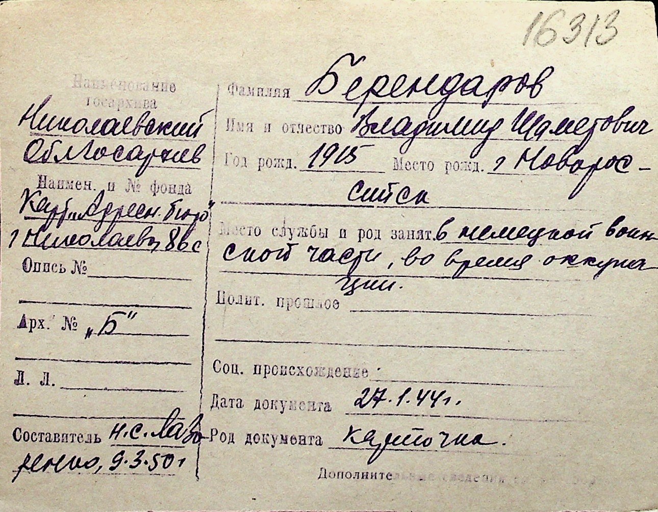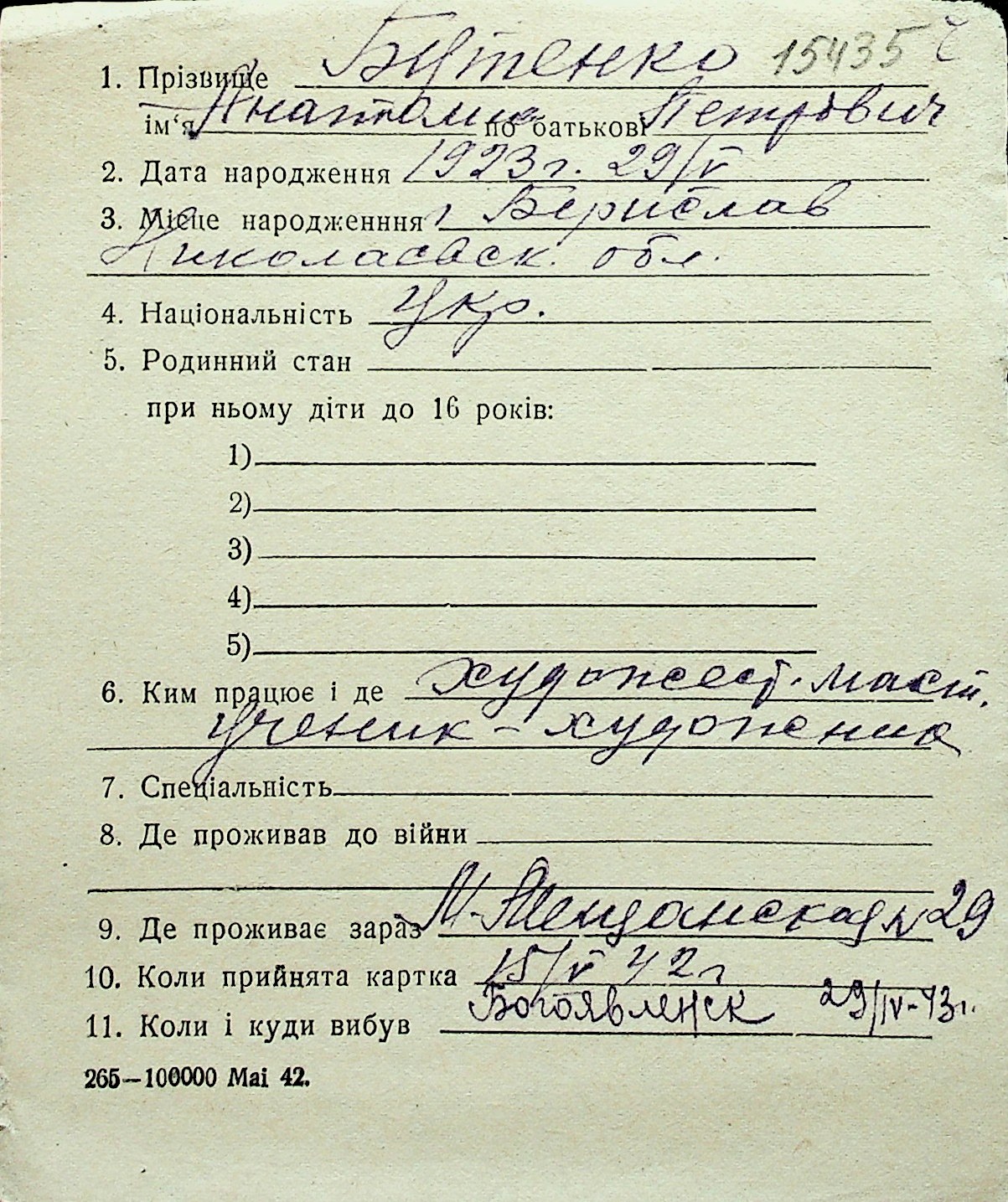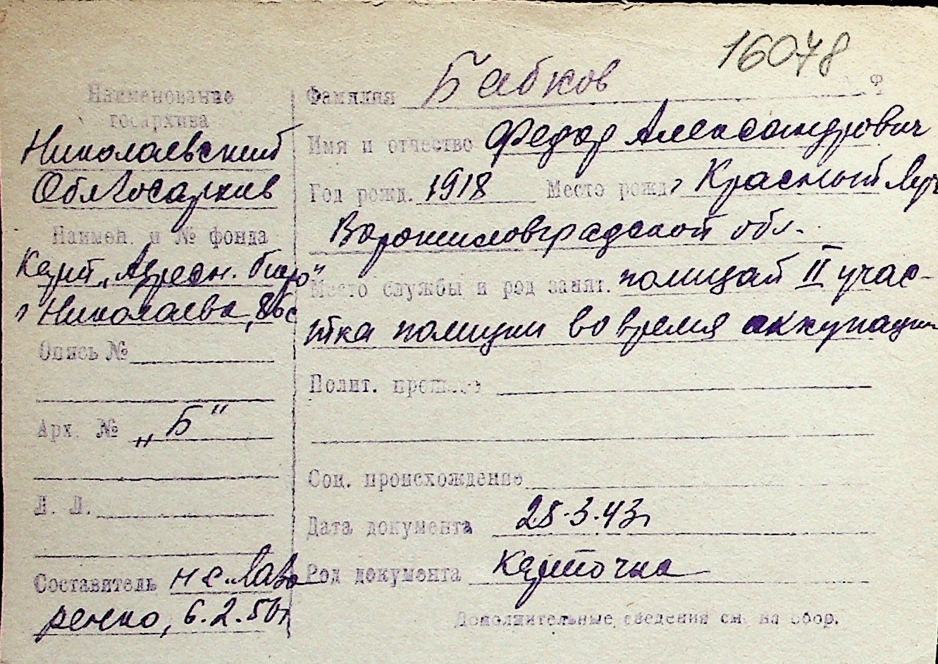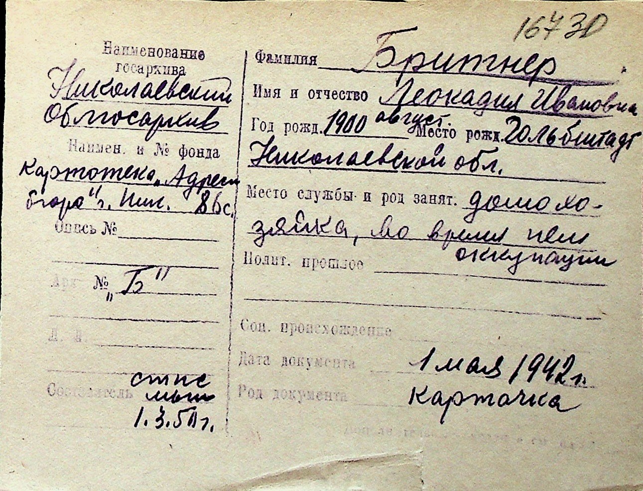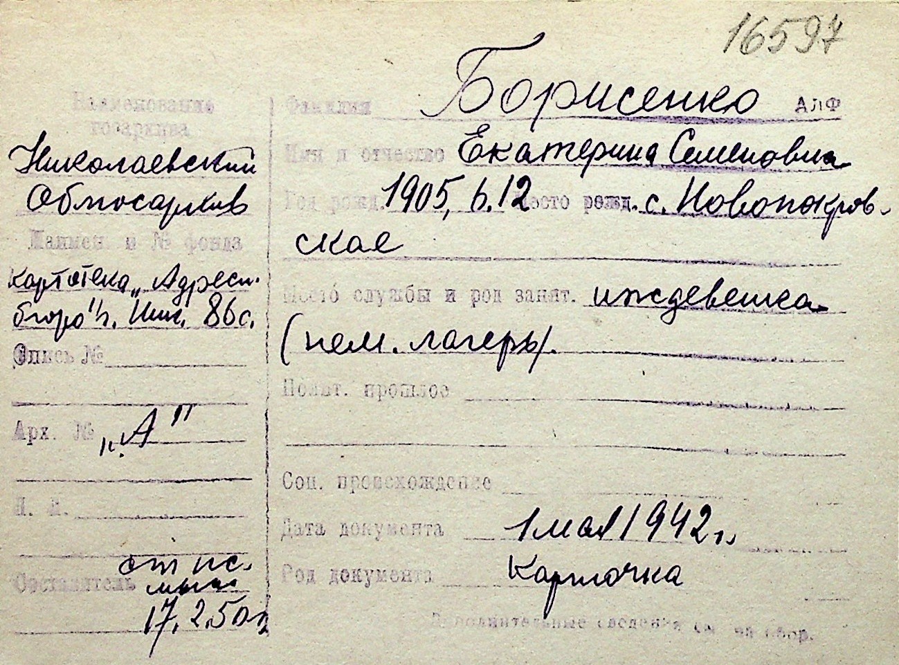 ◦ ◦ Перелік карток на осіб, які мешкали у м. Миколаїв у період окупації 1941–1944 років