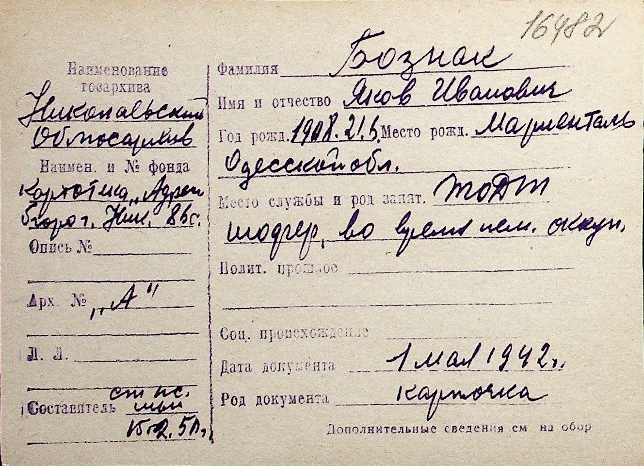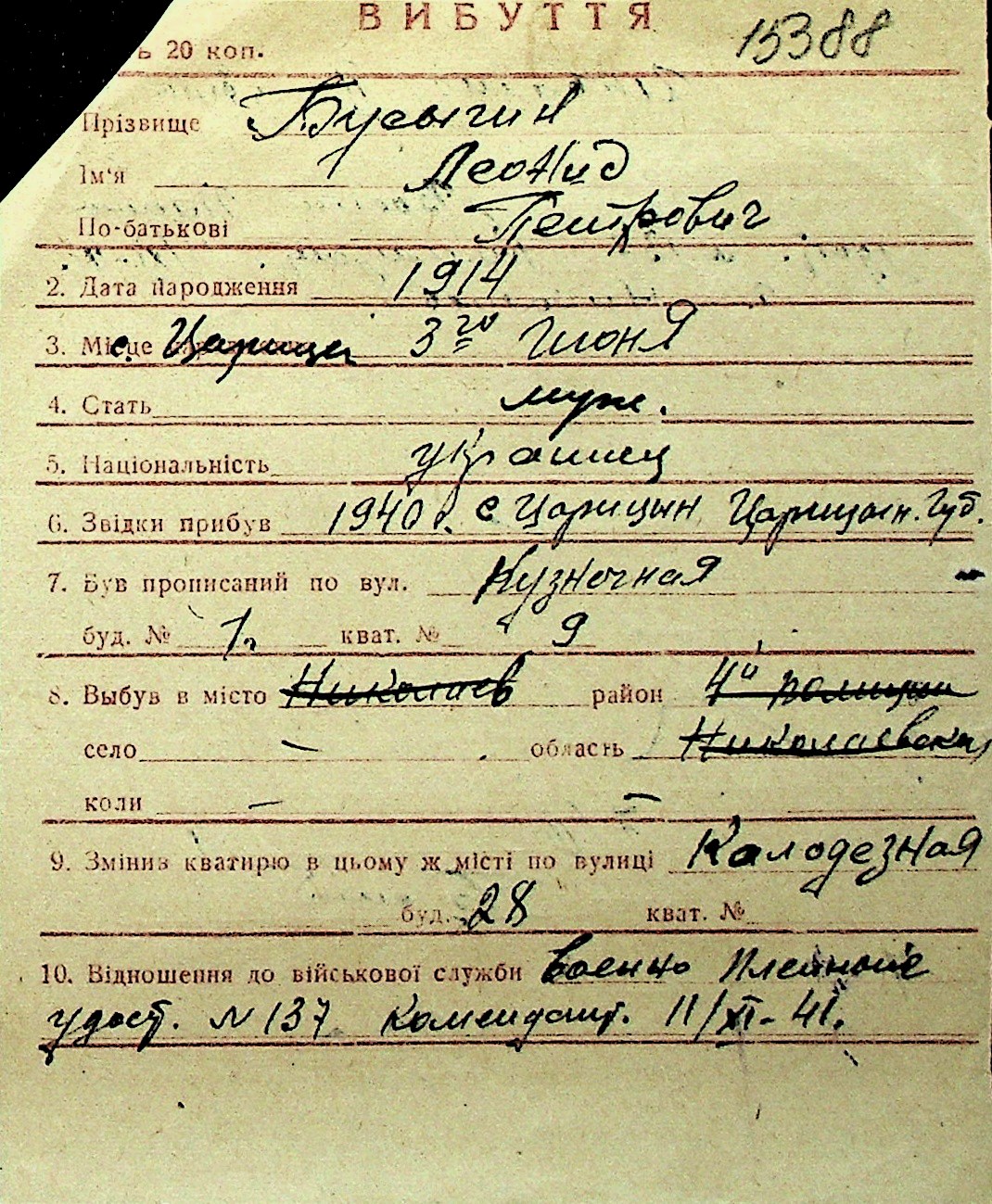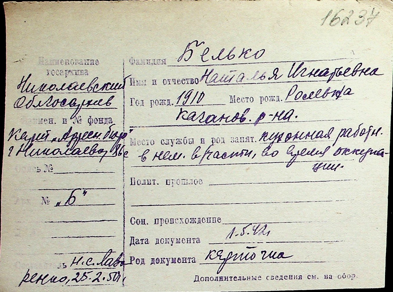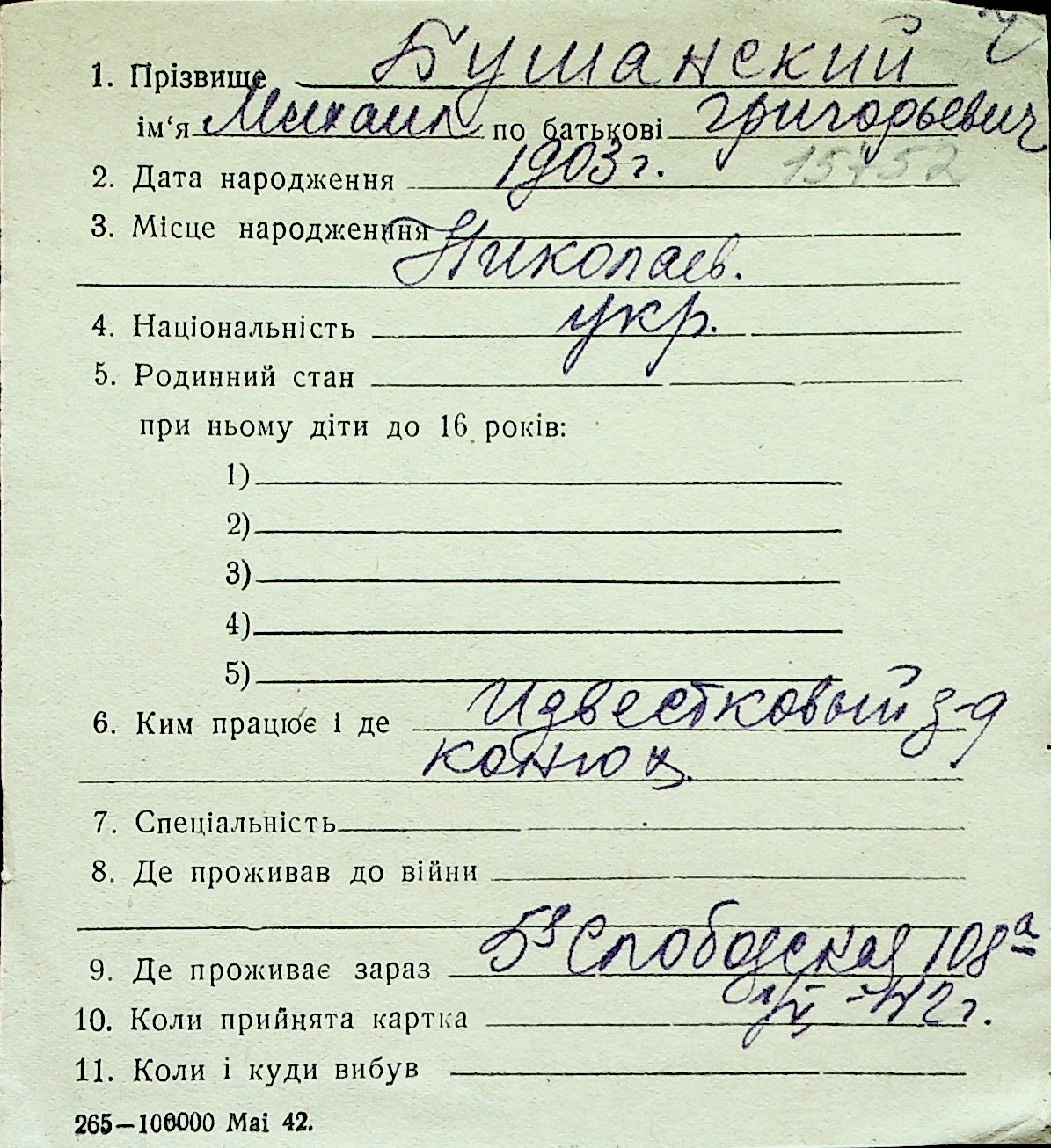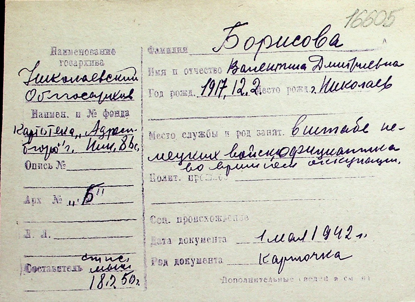 ◦ ◦ Перелік карток на осіб, які мешкали у м. Миколаїв у період окупації 1941–1944 років