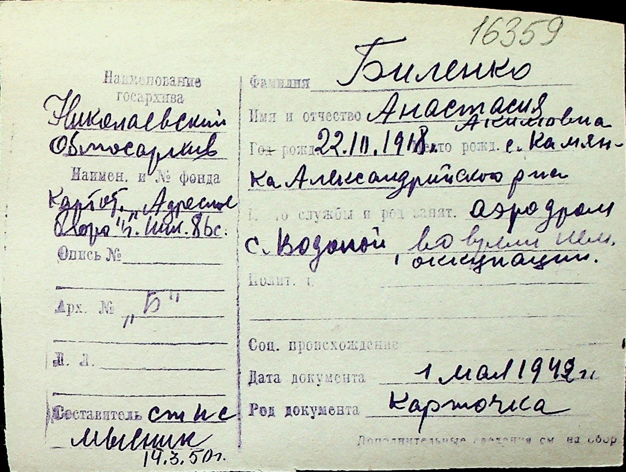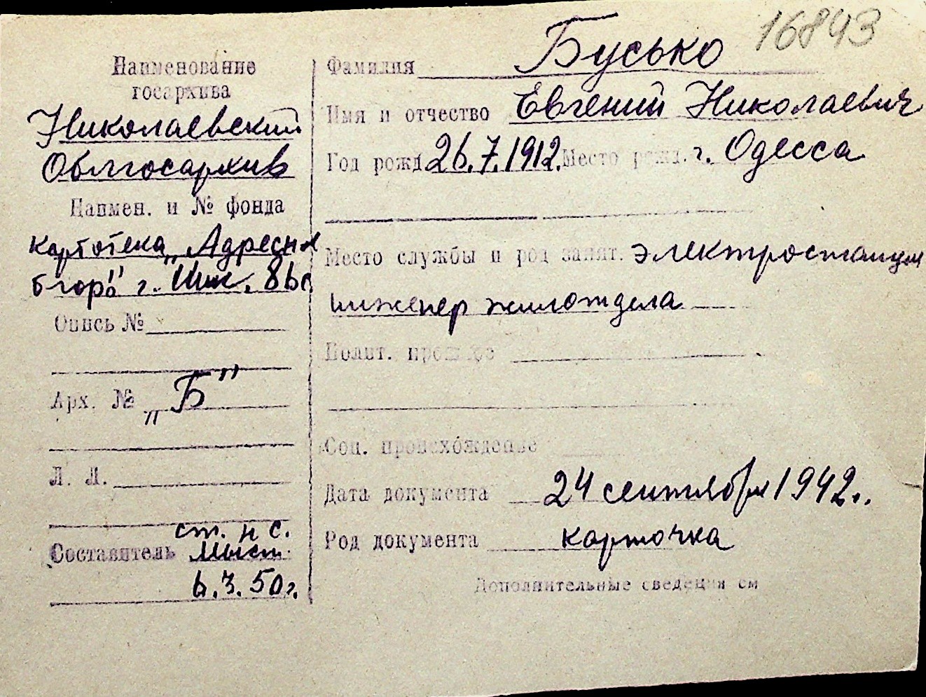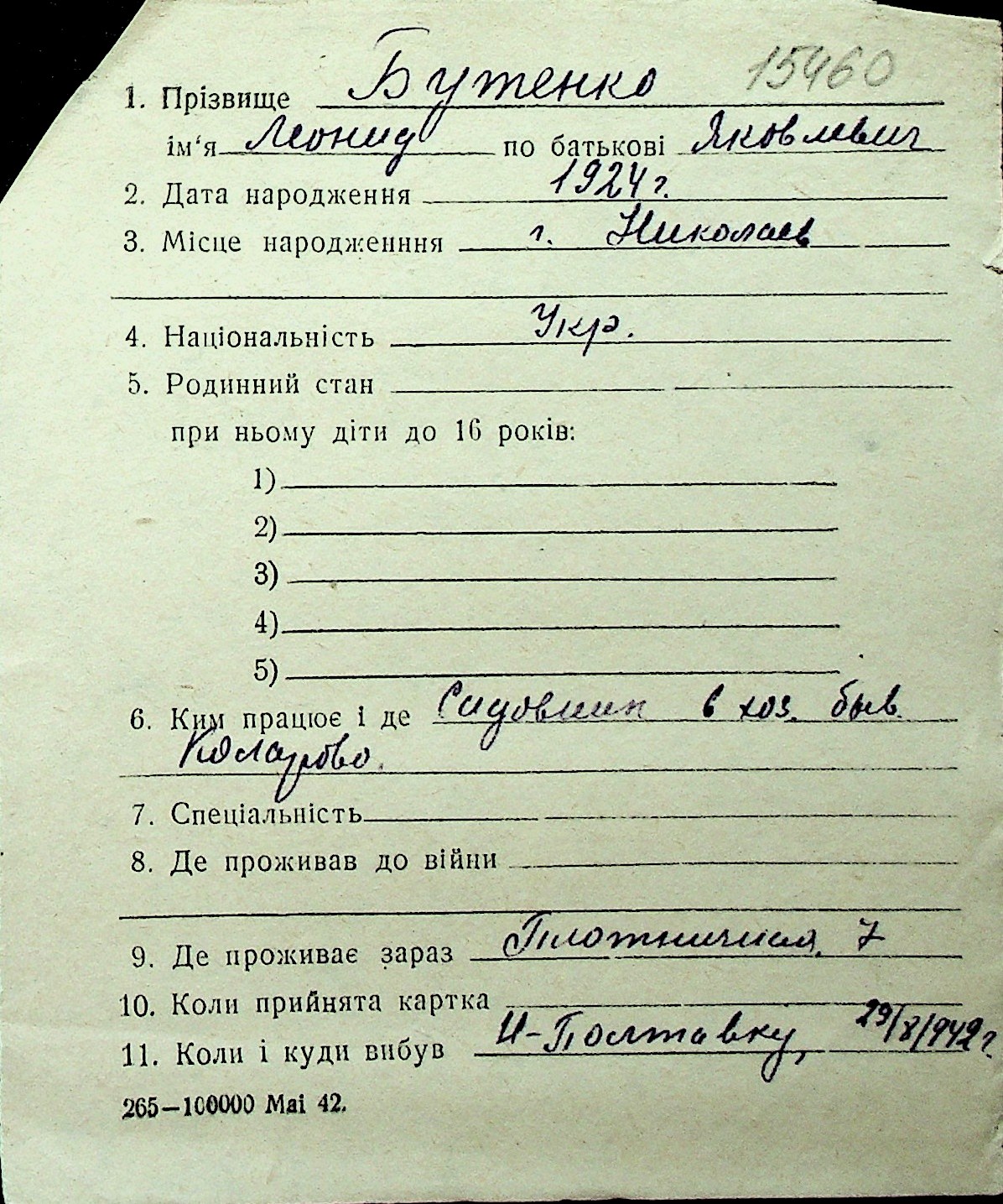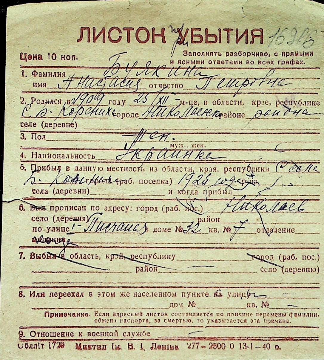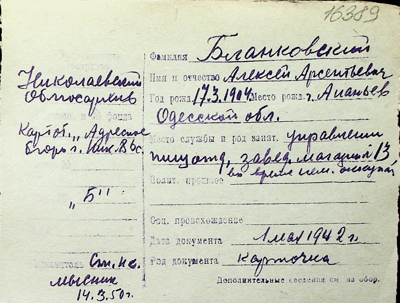 ◦ ◦ Перелік карток на осіб, які мешкали у м. Миколаїв у період окупації 1941–1944 років