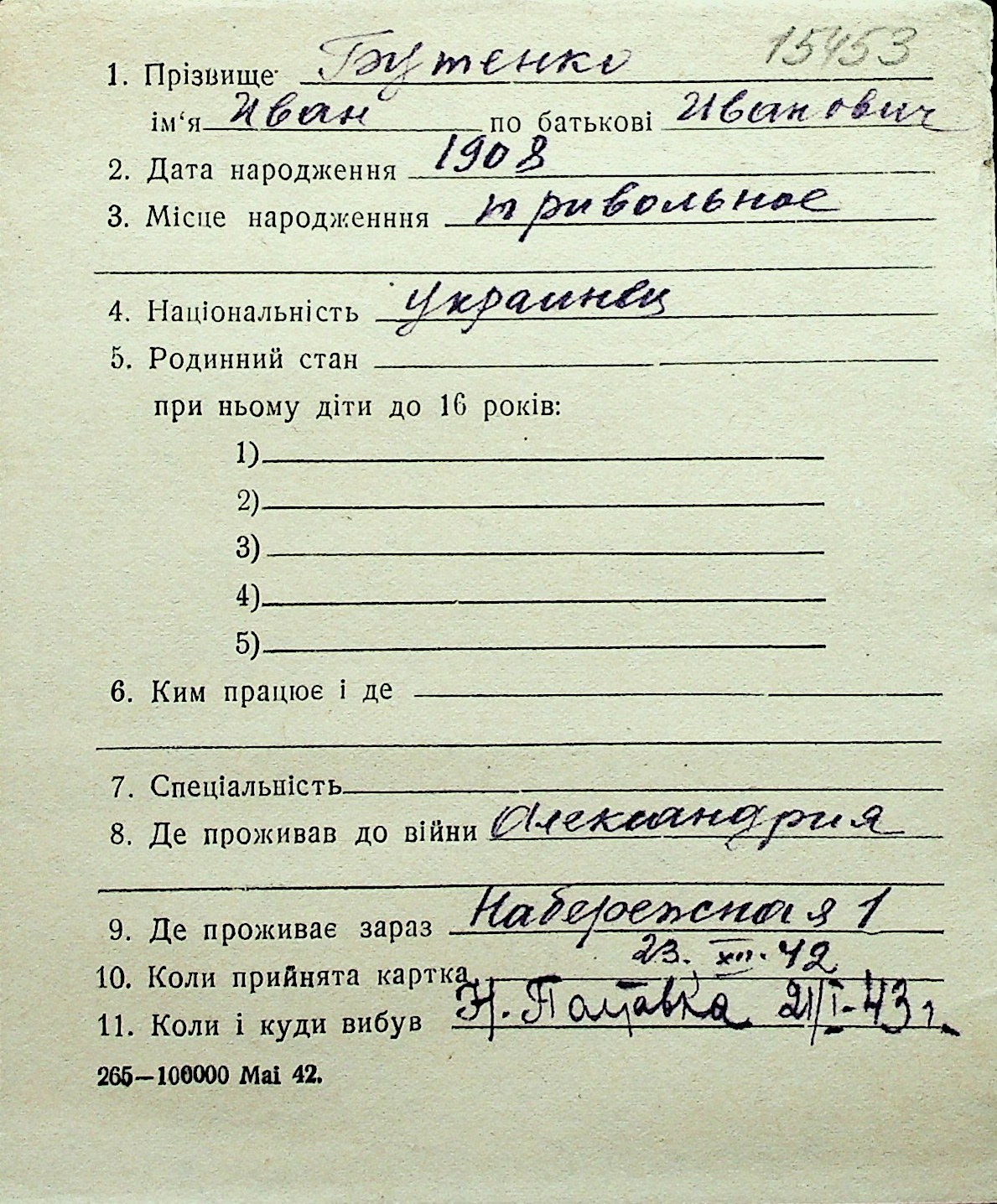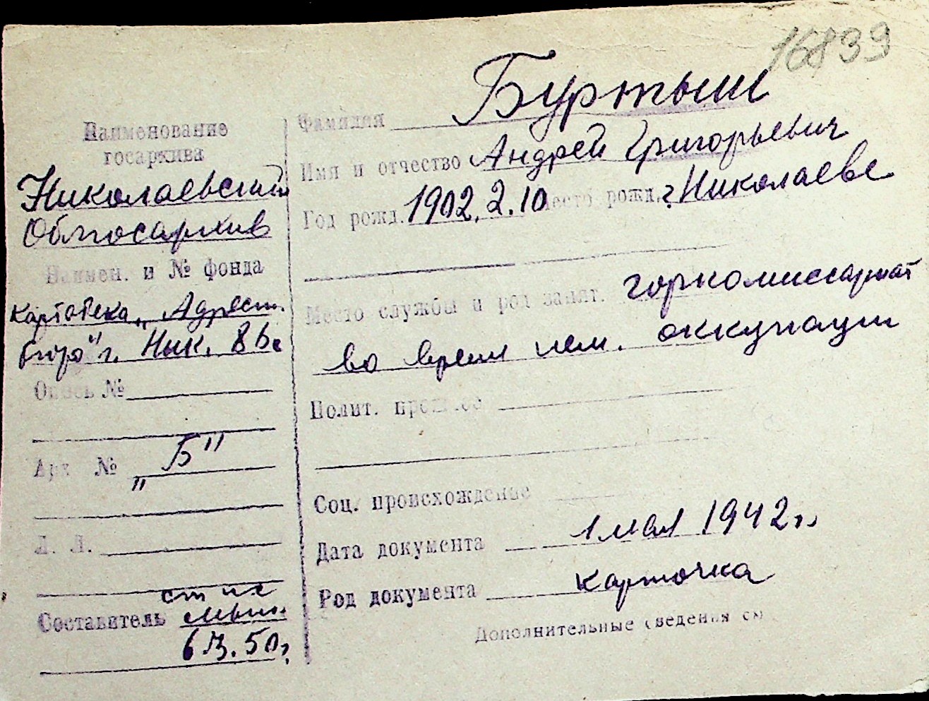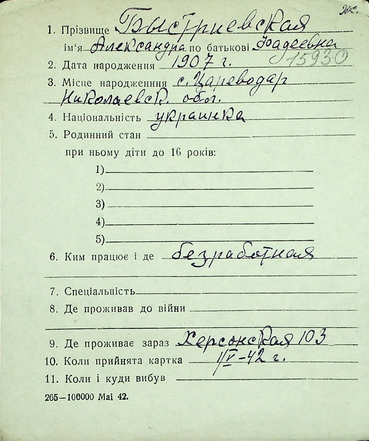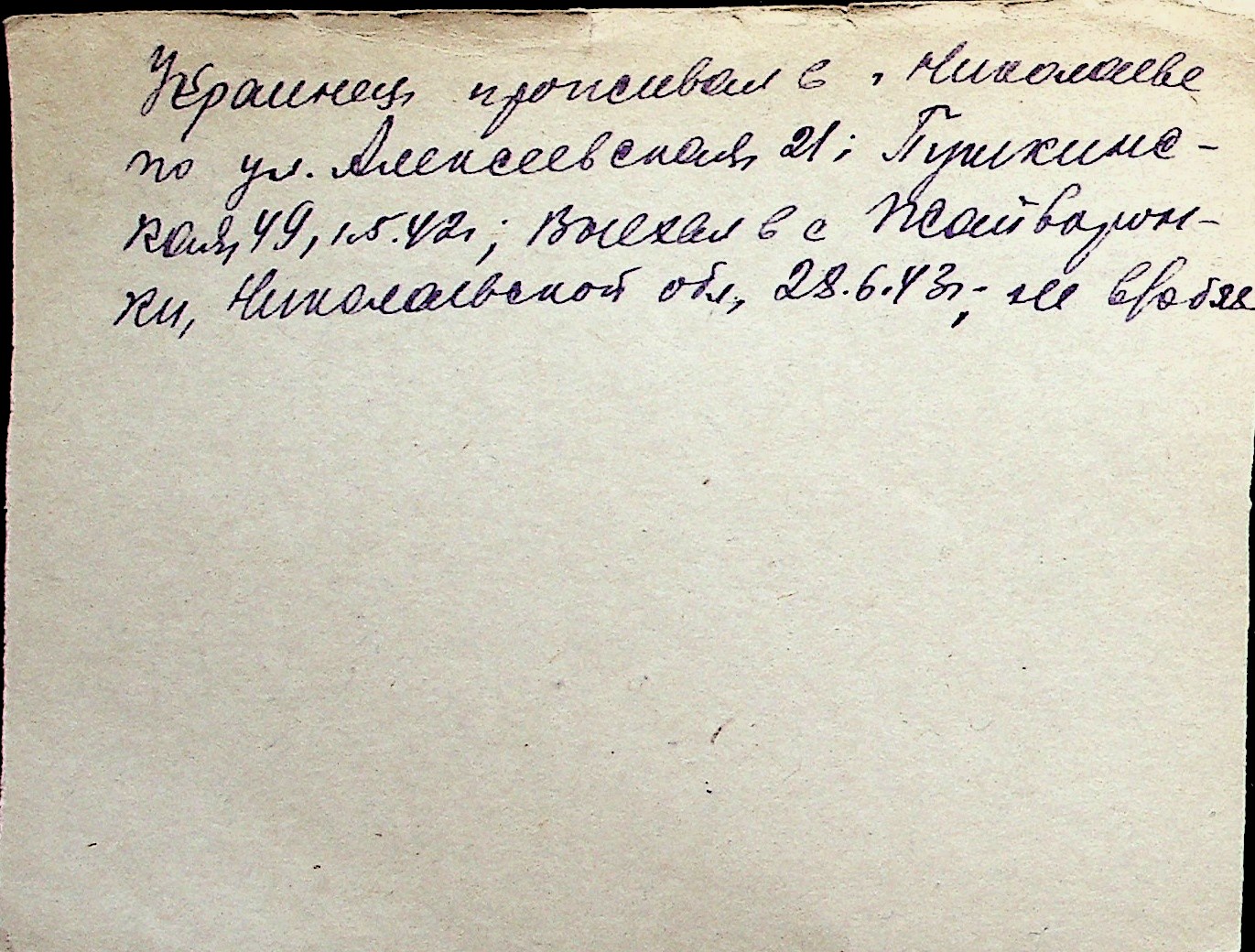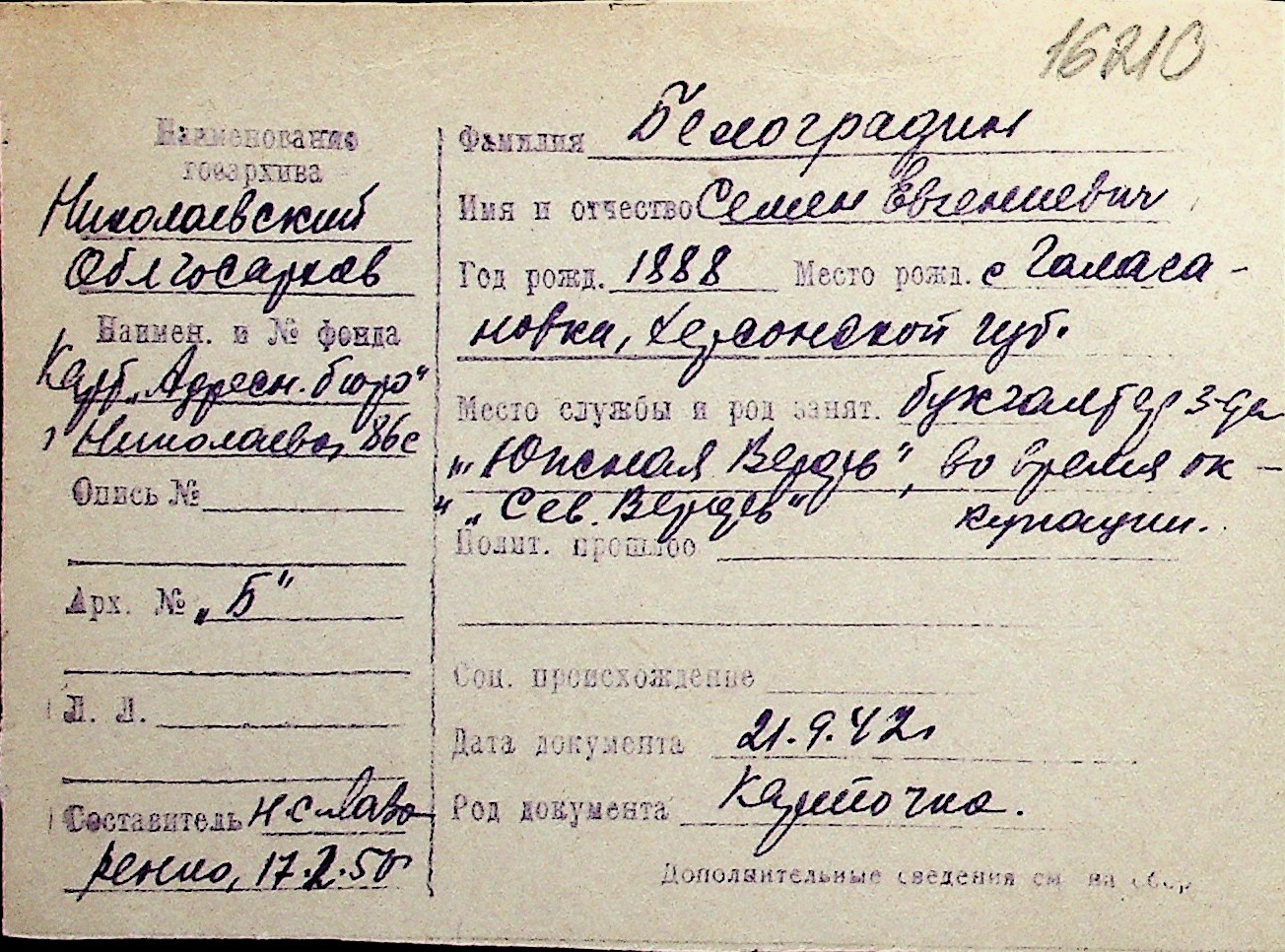 ◦ ◦ Перелік карток на осіб, які мешкали у м. Миколаїв у період окупації 1941–1944 років