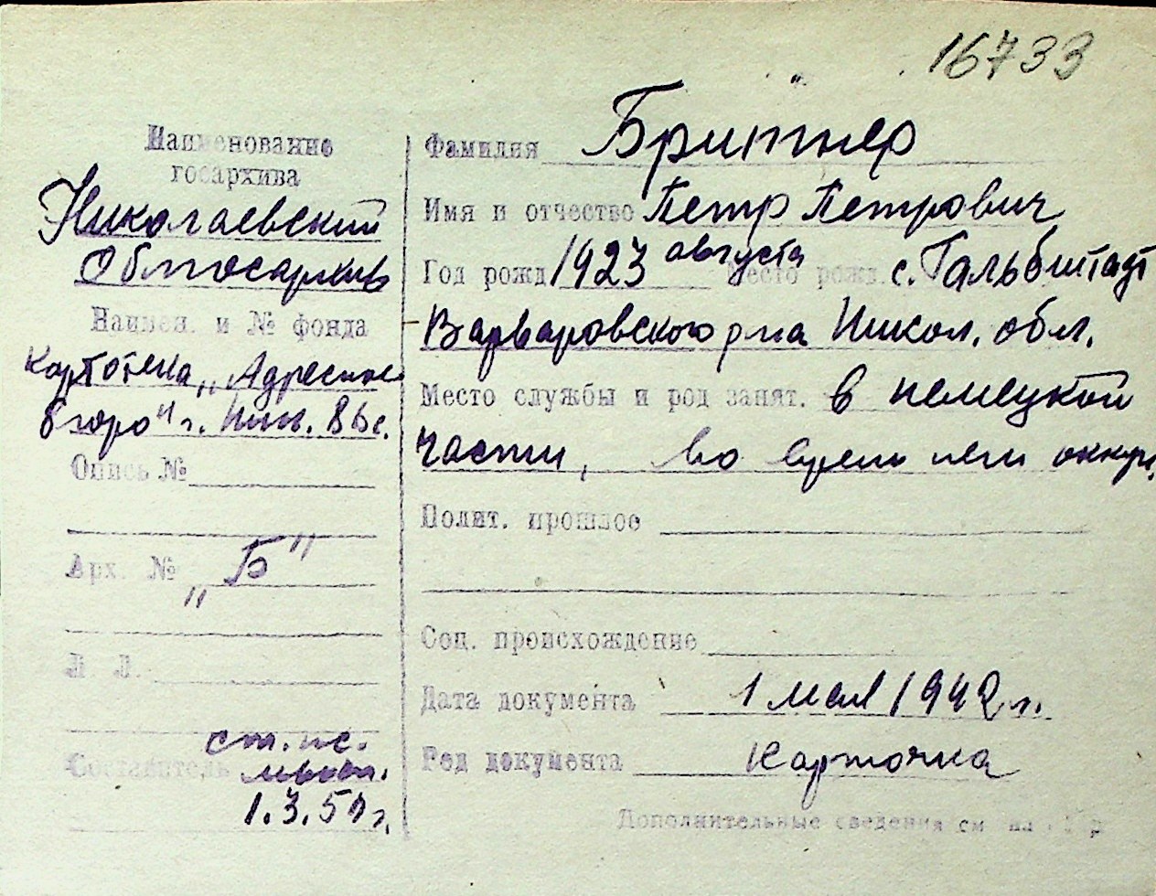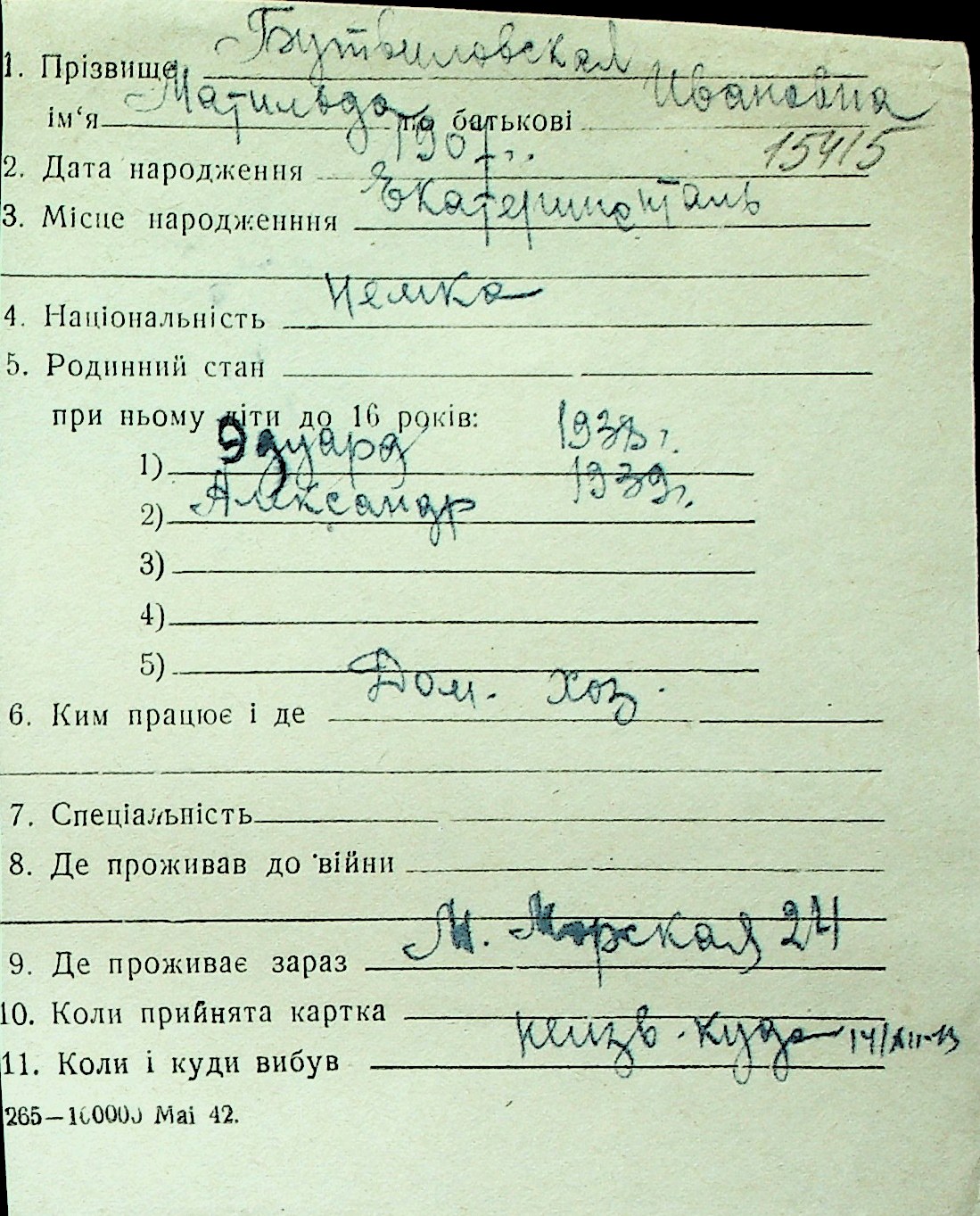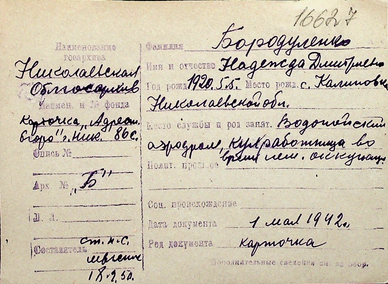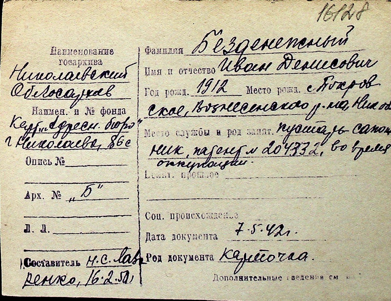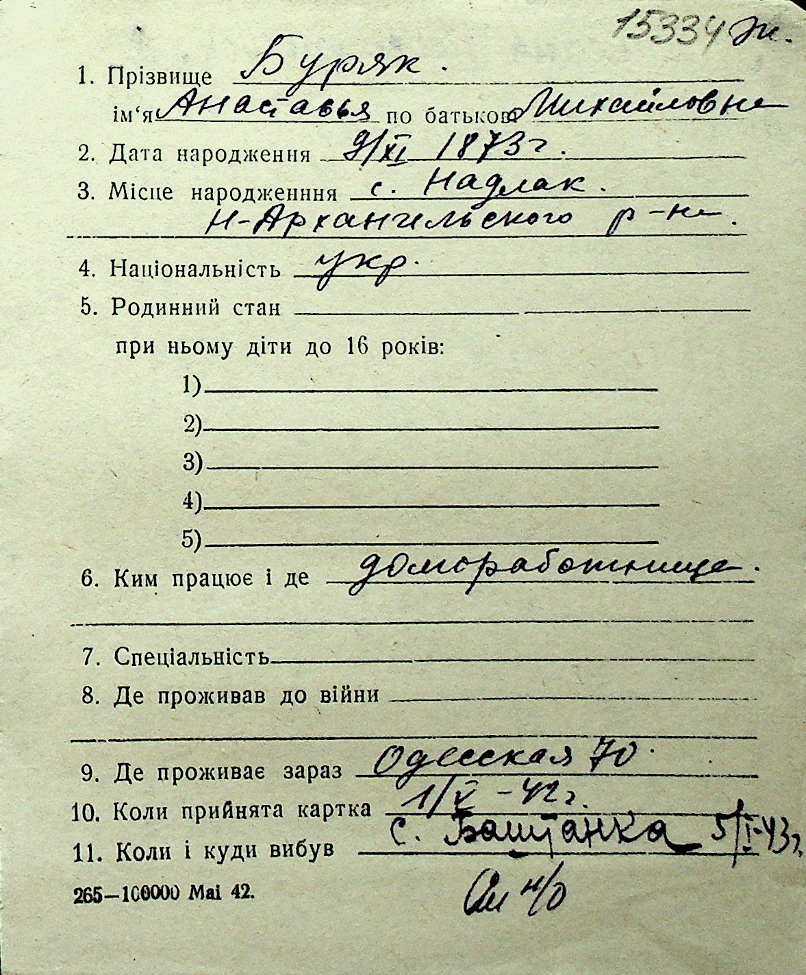 ◦ ◦ Перелік карток на осіб, які мешкали у м. Миколаїв у період окупації 1941–1944 років