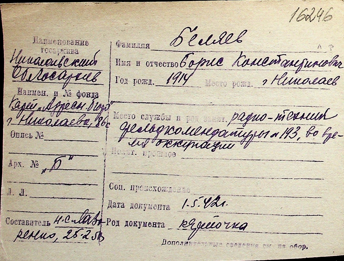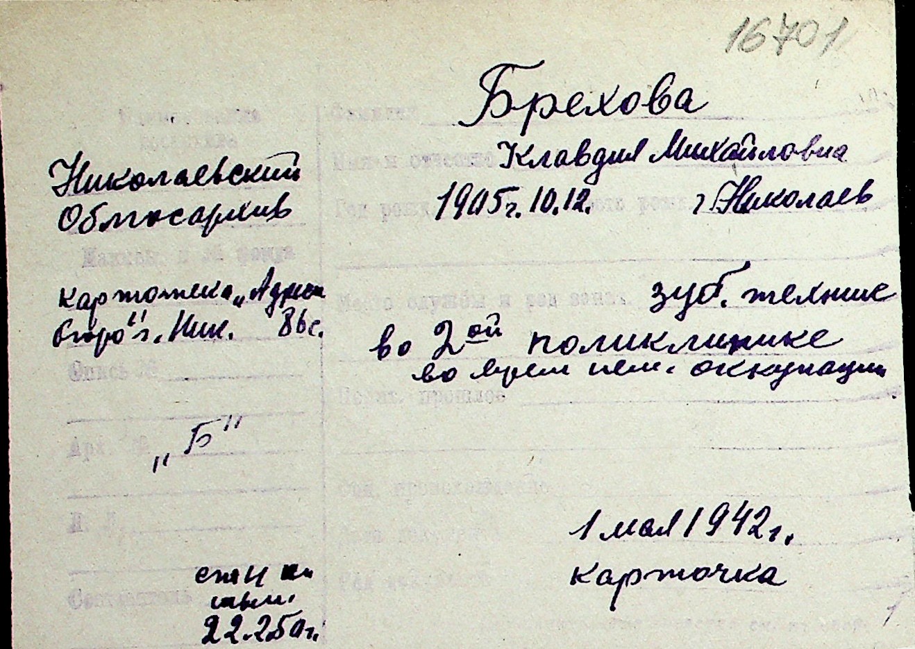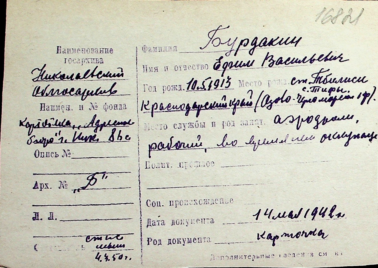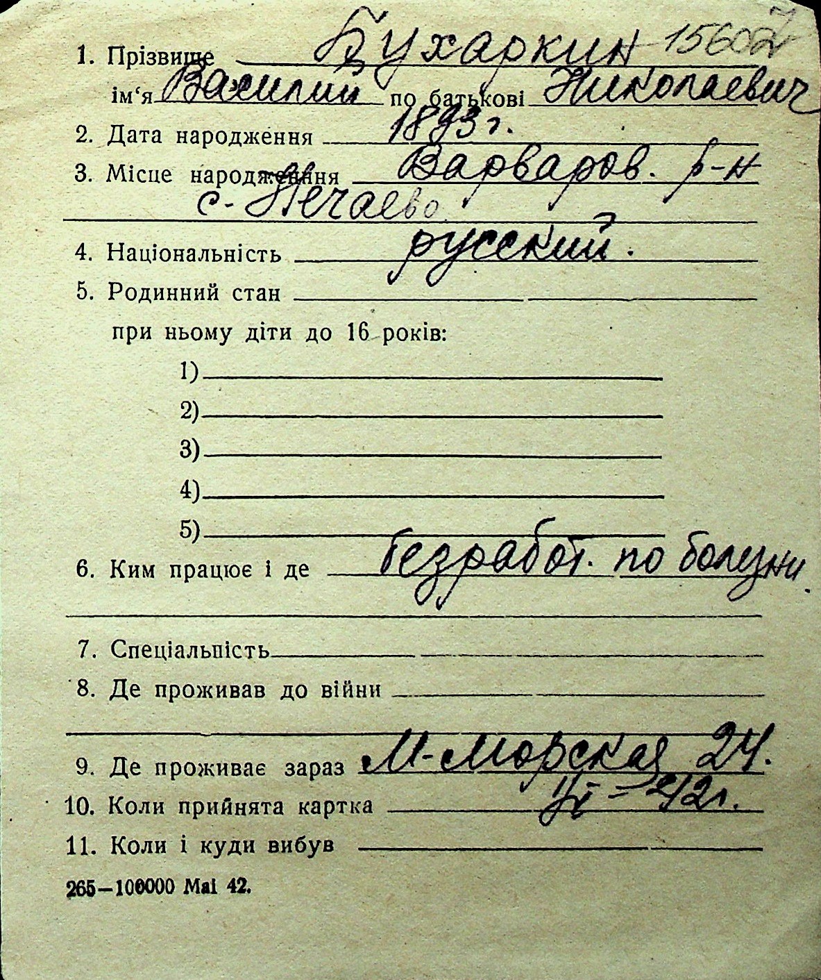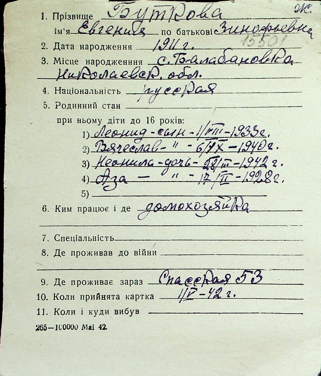 ◦ ◦ Перелік карток на осіб, які мешкали у м. Миколаїв у період окупації 1941–1944 років