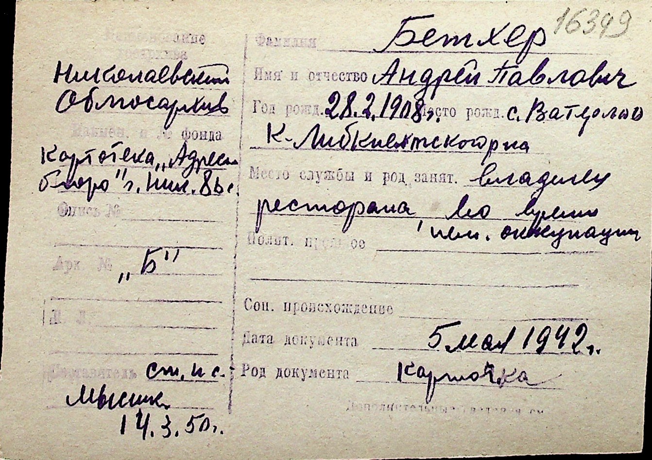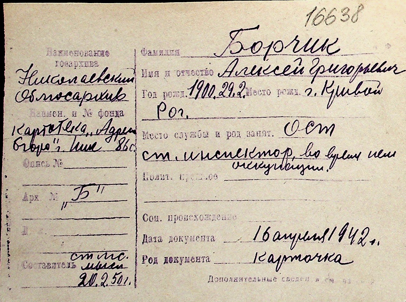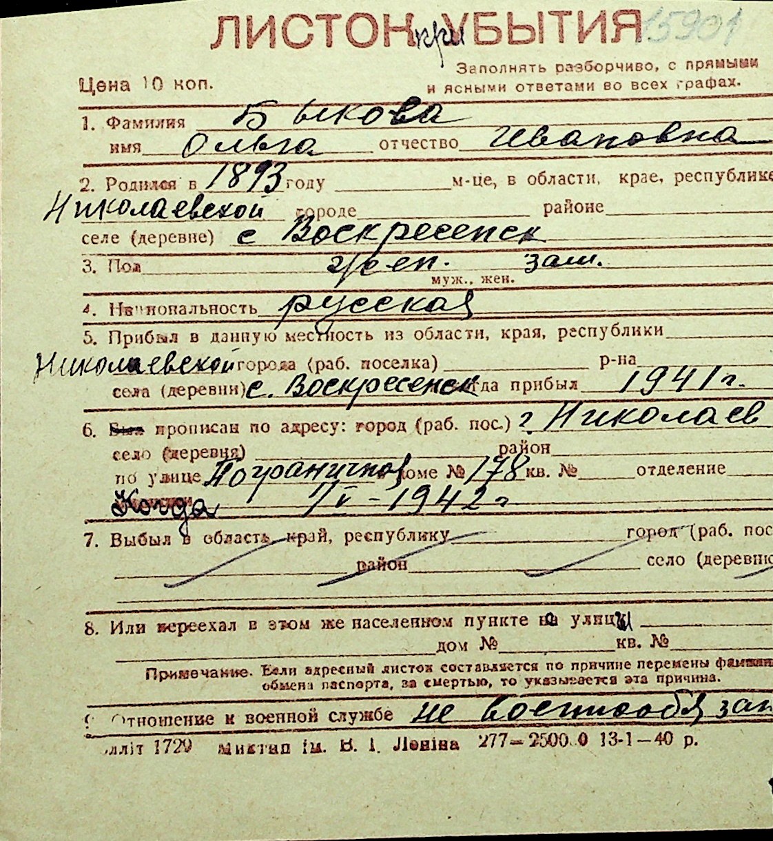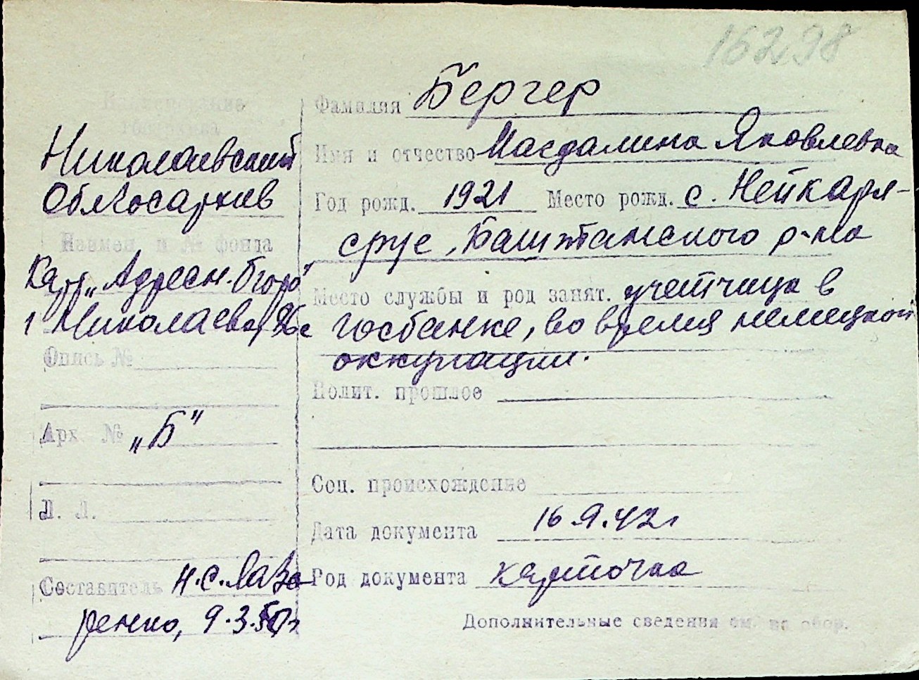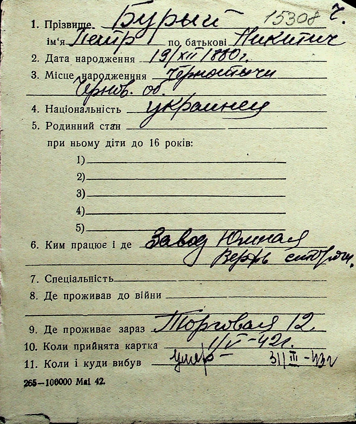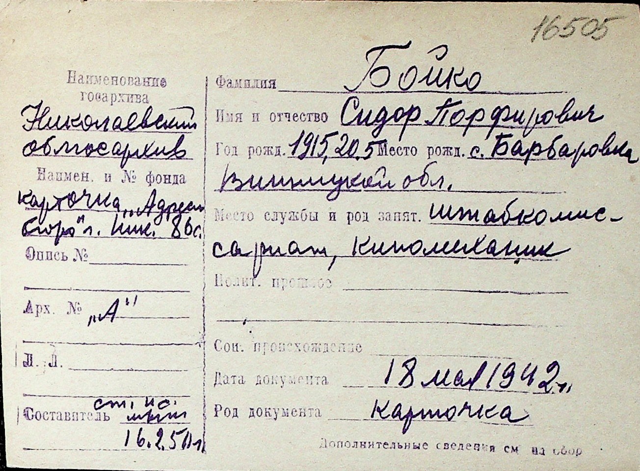 ◦ ◦ Перелік карток на осіб, які мешкали у м. Миколаїв у період окупації 1941–1944 років