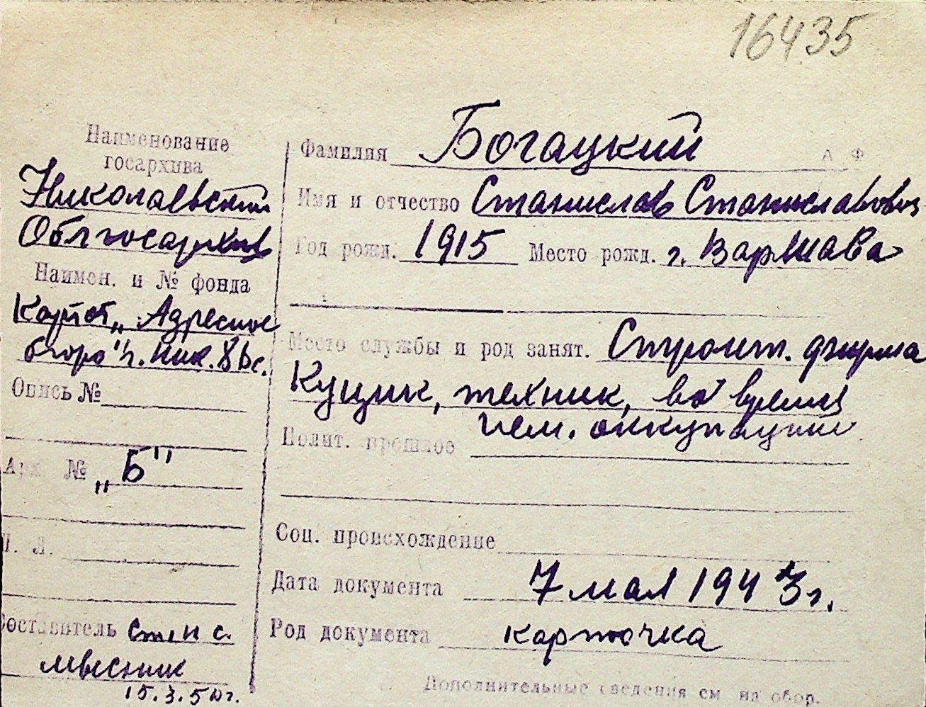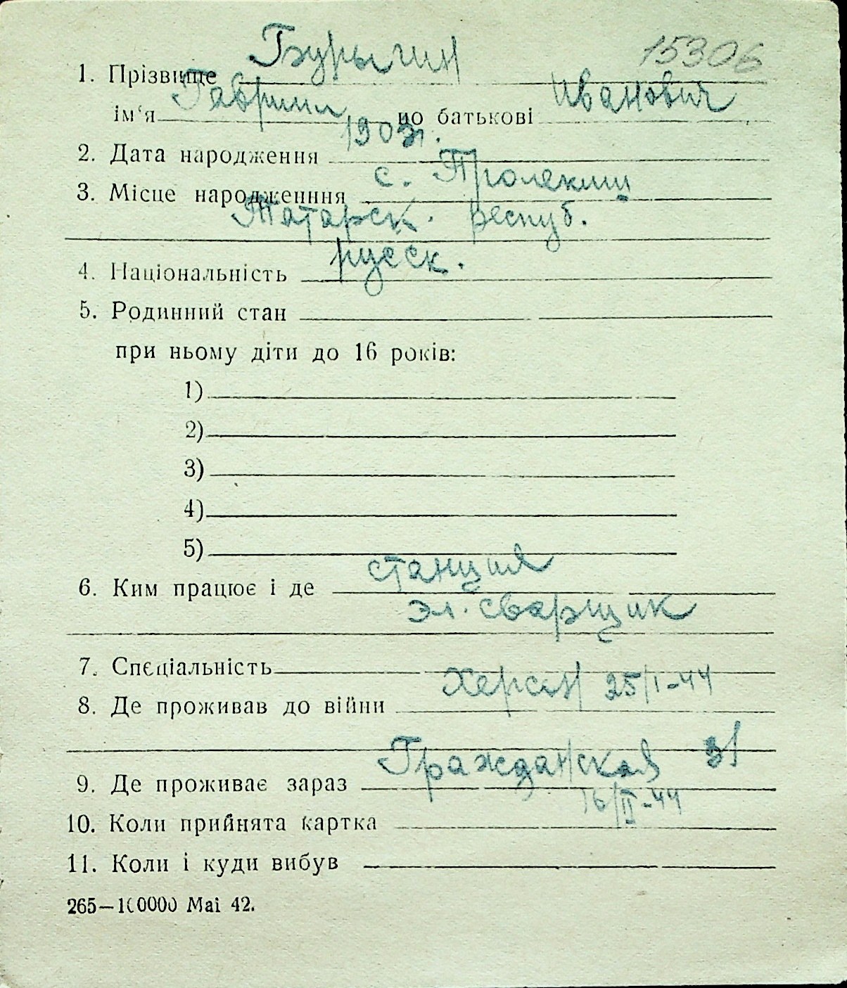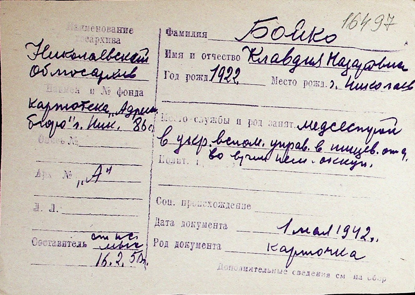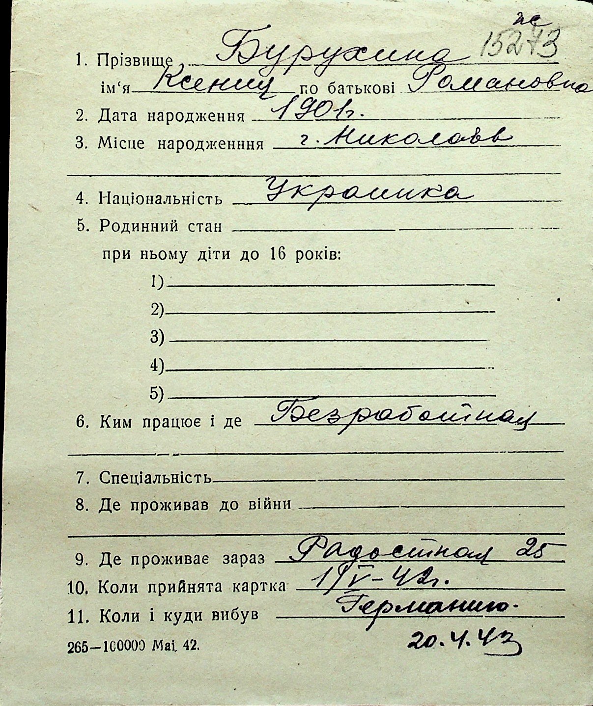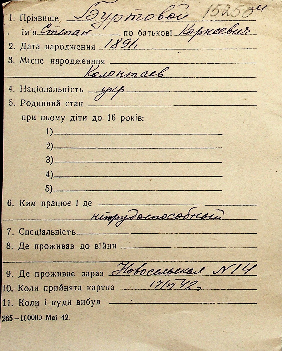 ◦ ◦ Перелік карток на осіб, які мешкали у м. Миколаїв у період окупації 1941–1944 років