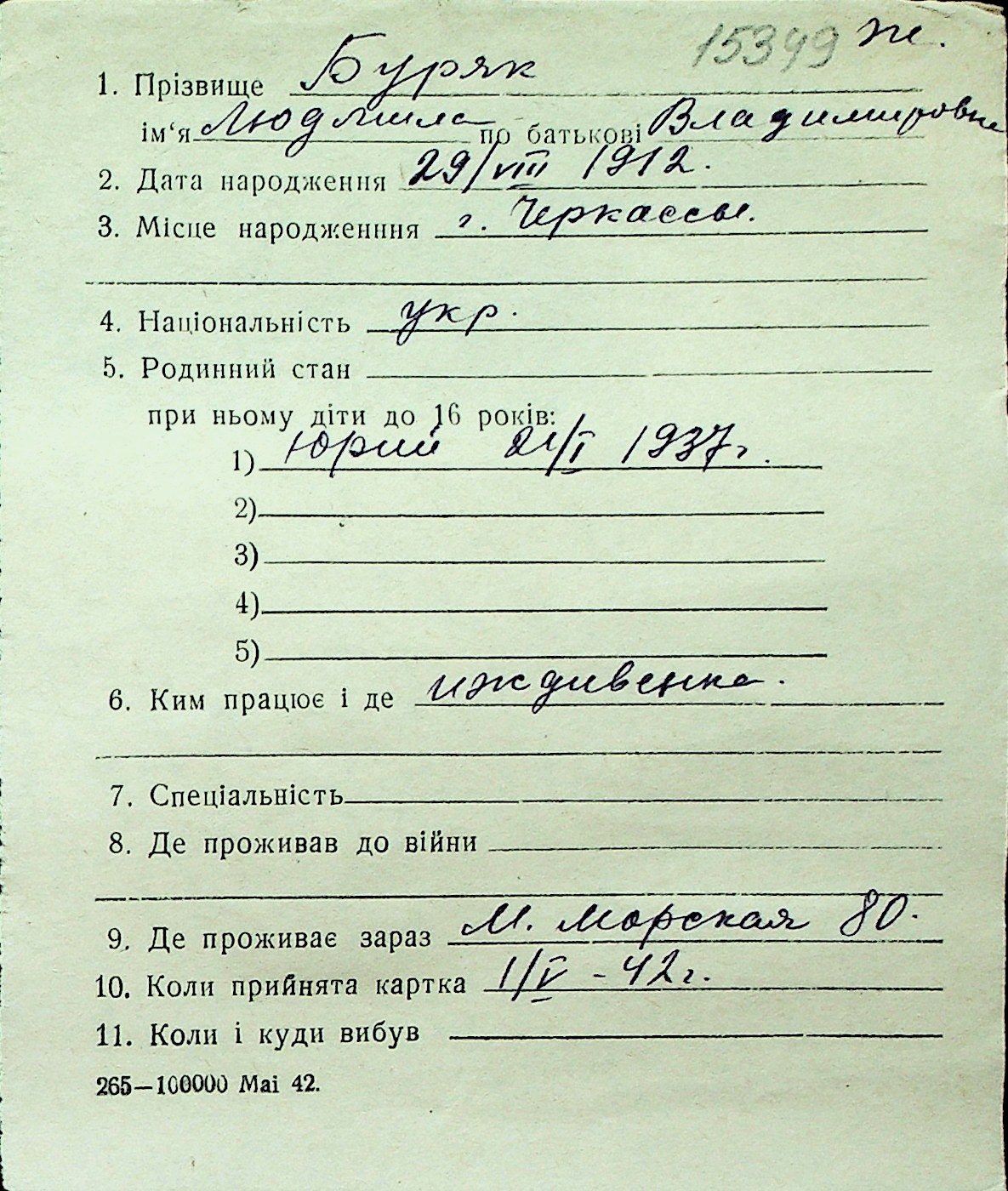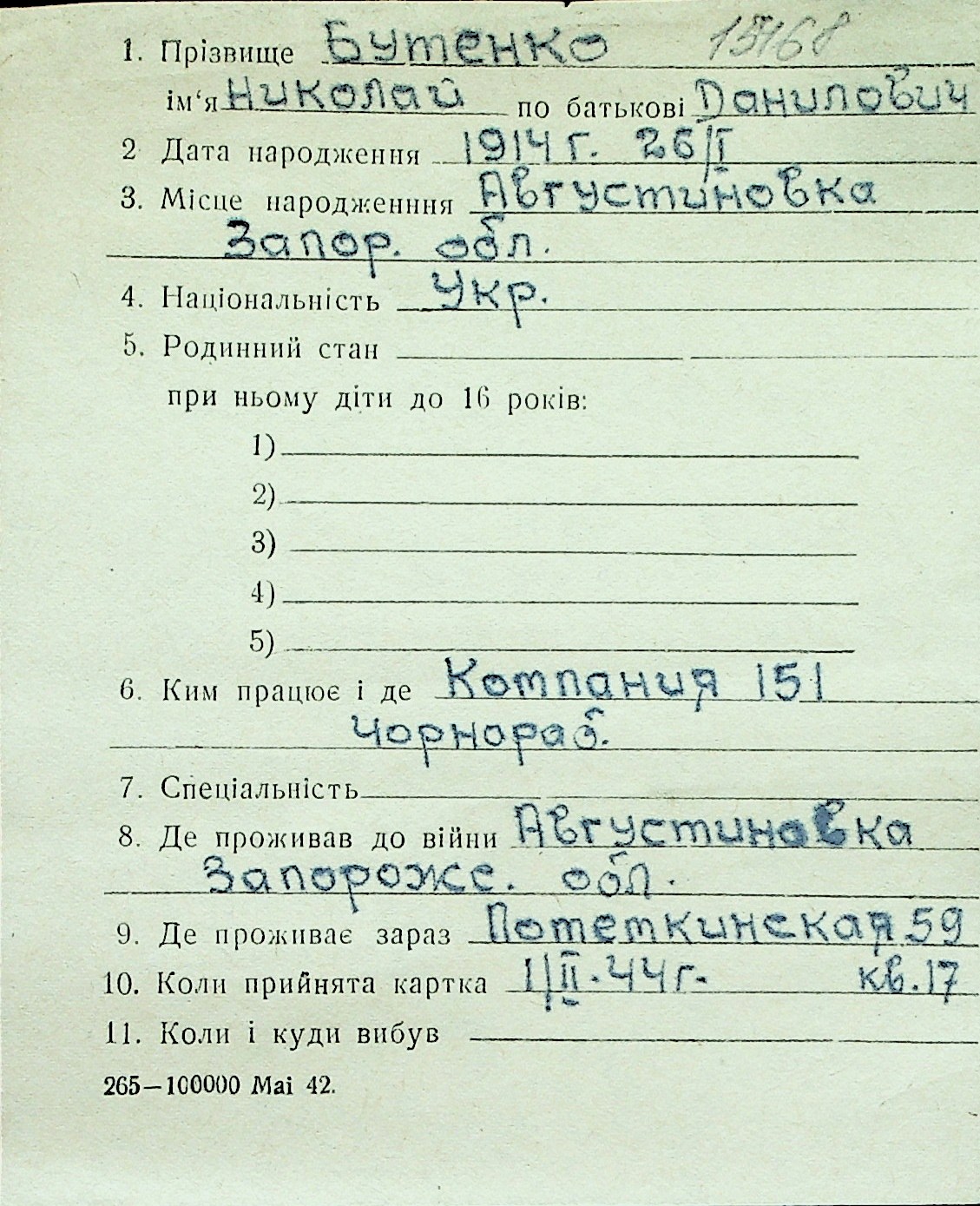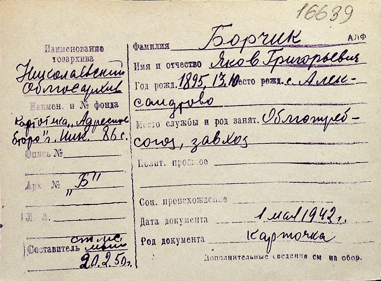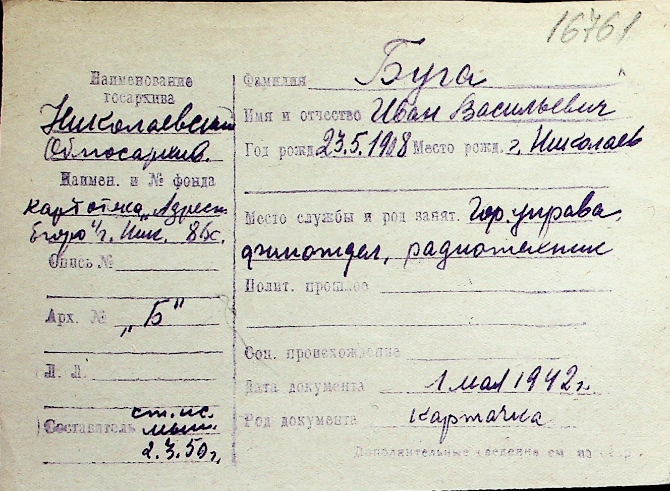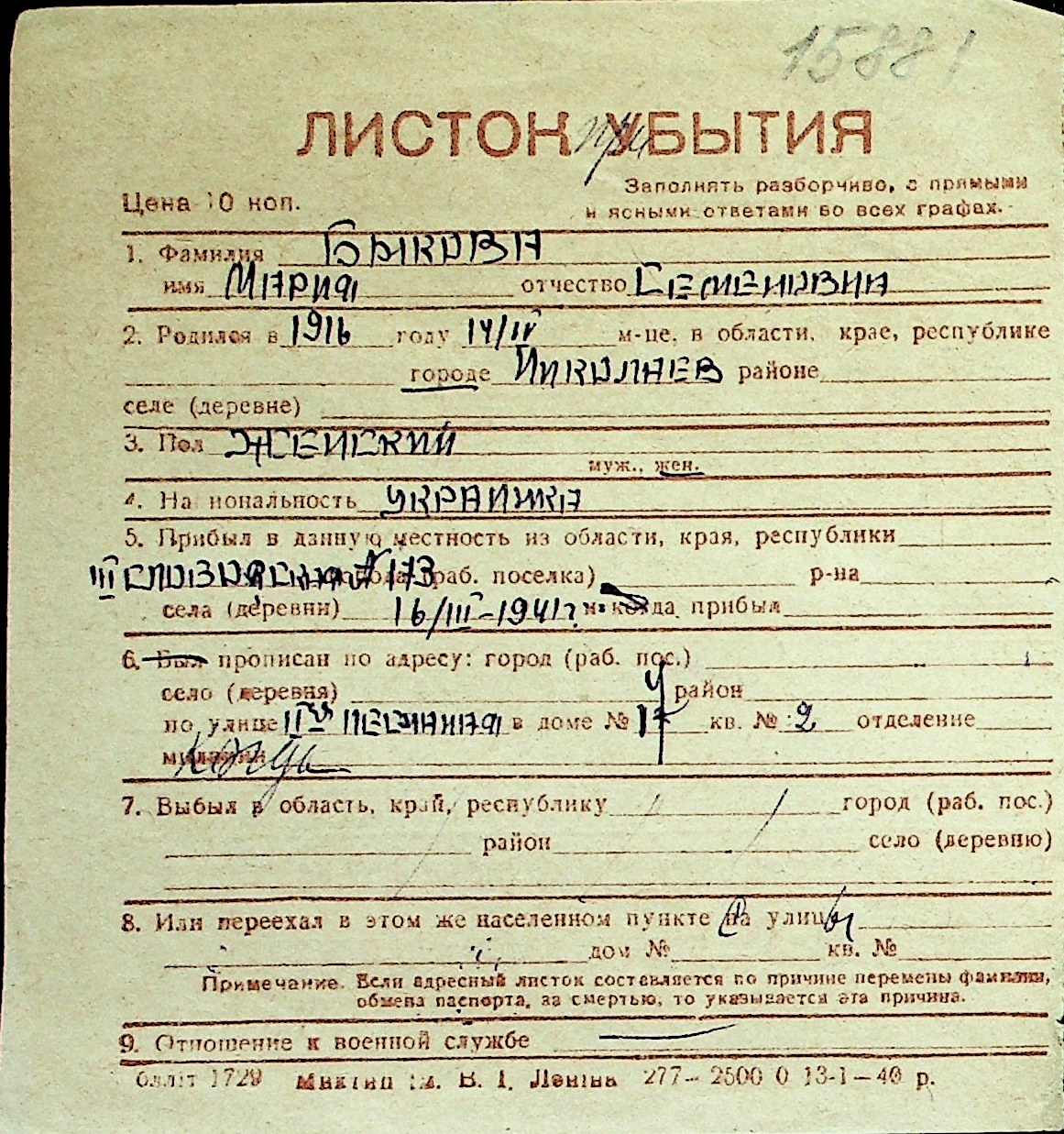 ◦ ◦ Перелік карток на осіб, які мешкали у м. Миколаїв у період окупації 1941–1944 років