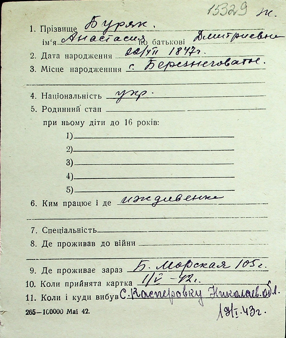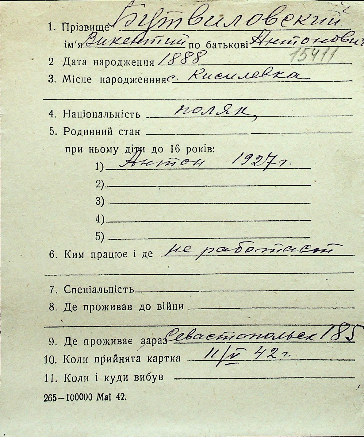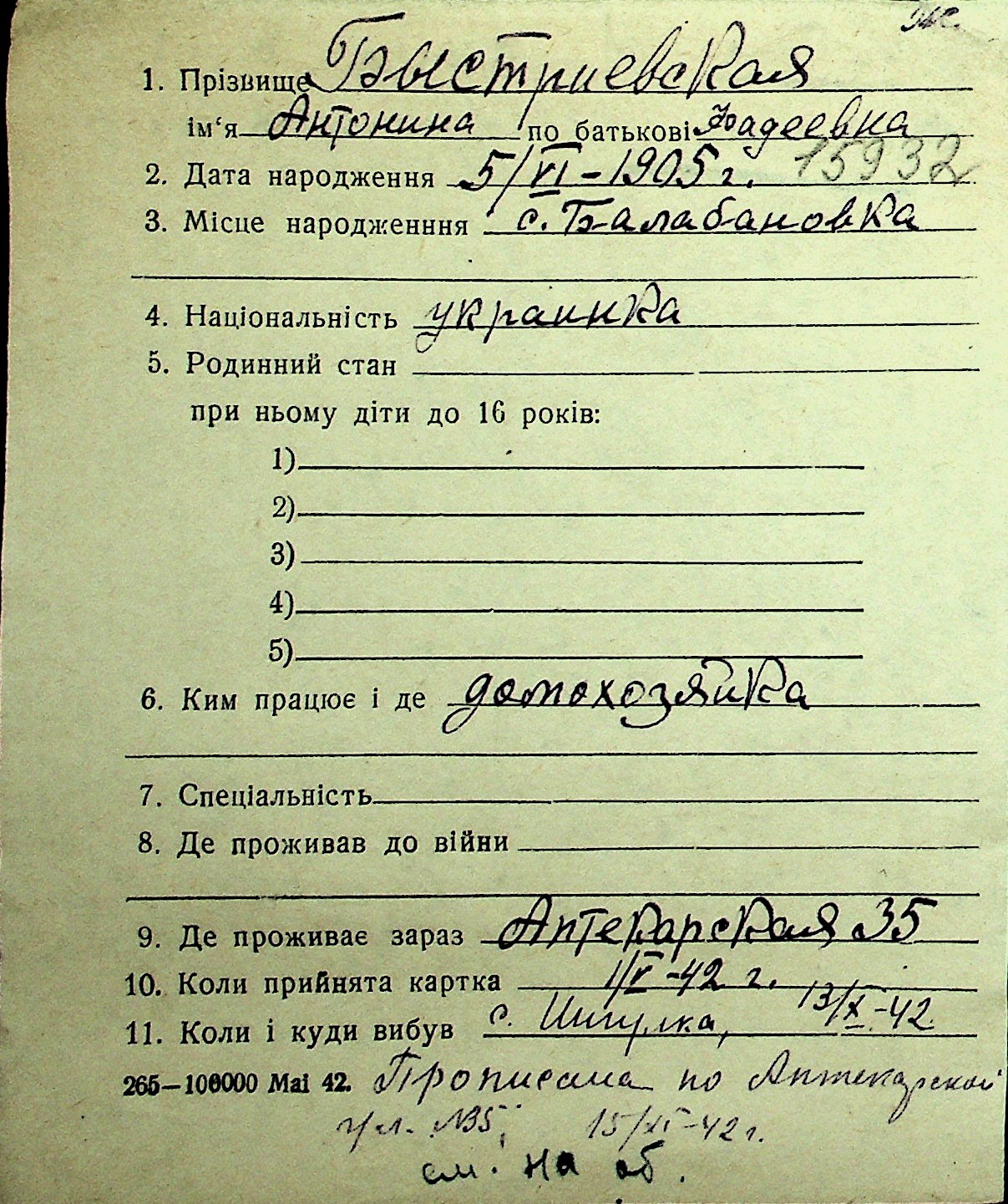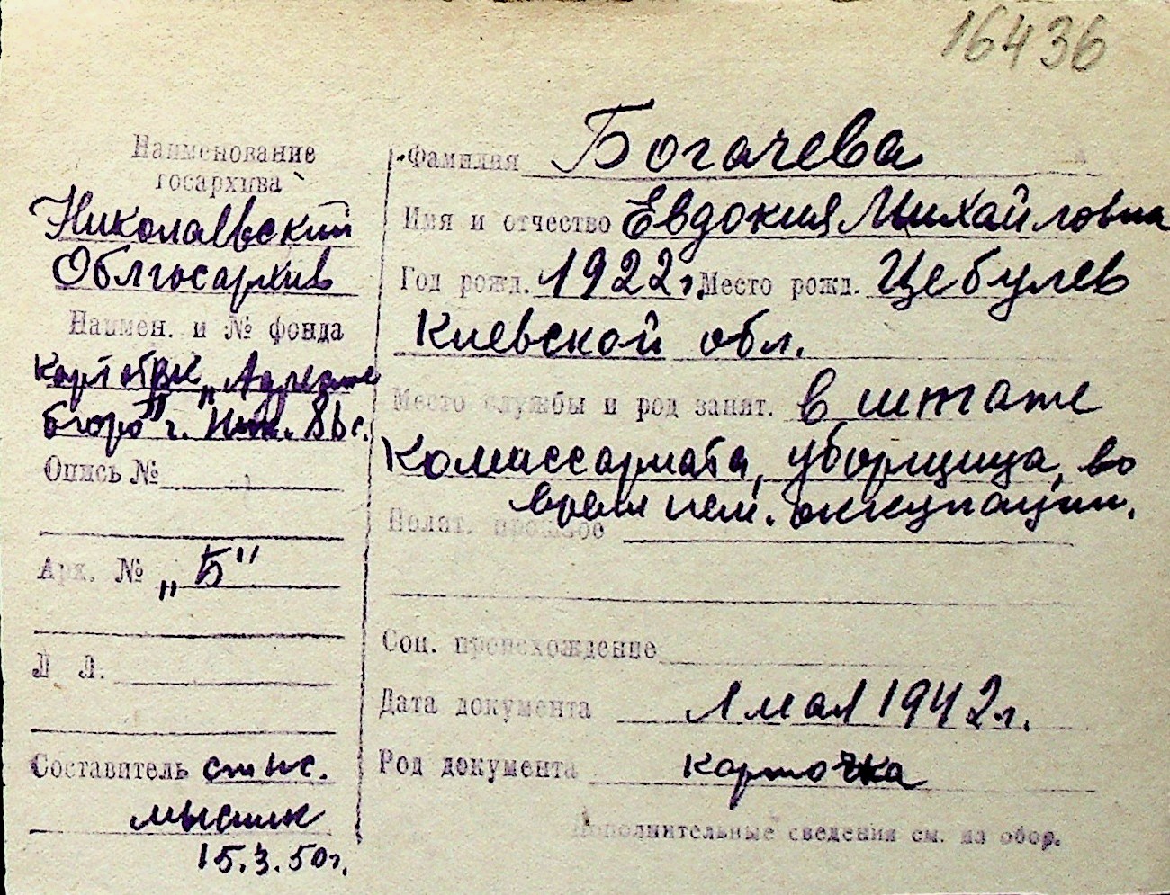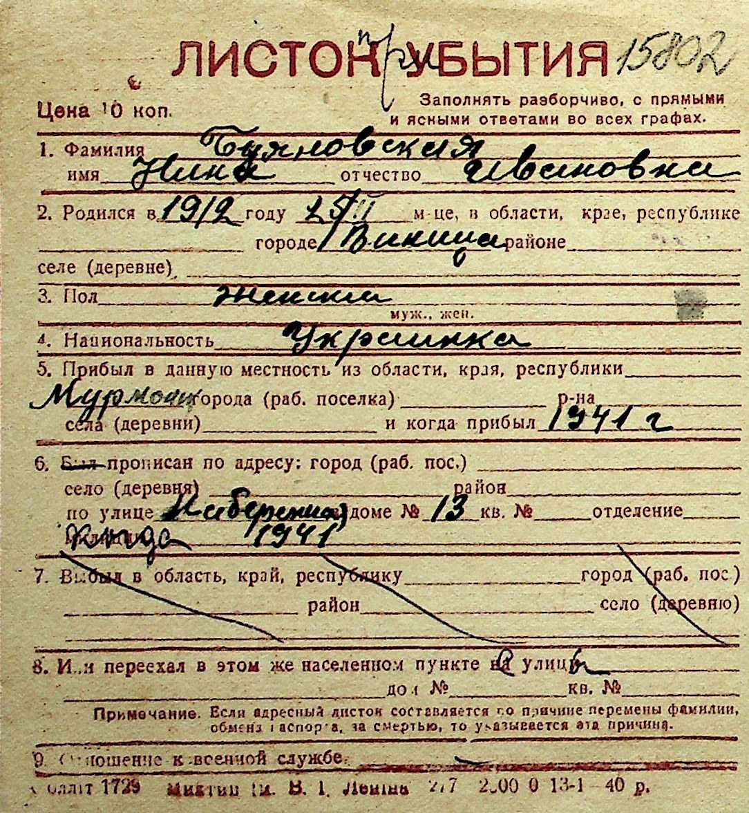 ◦ ◦ Перелік карток на осіб, які мешкали у м. Миколаїв у період окупації 1941–1944 років