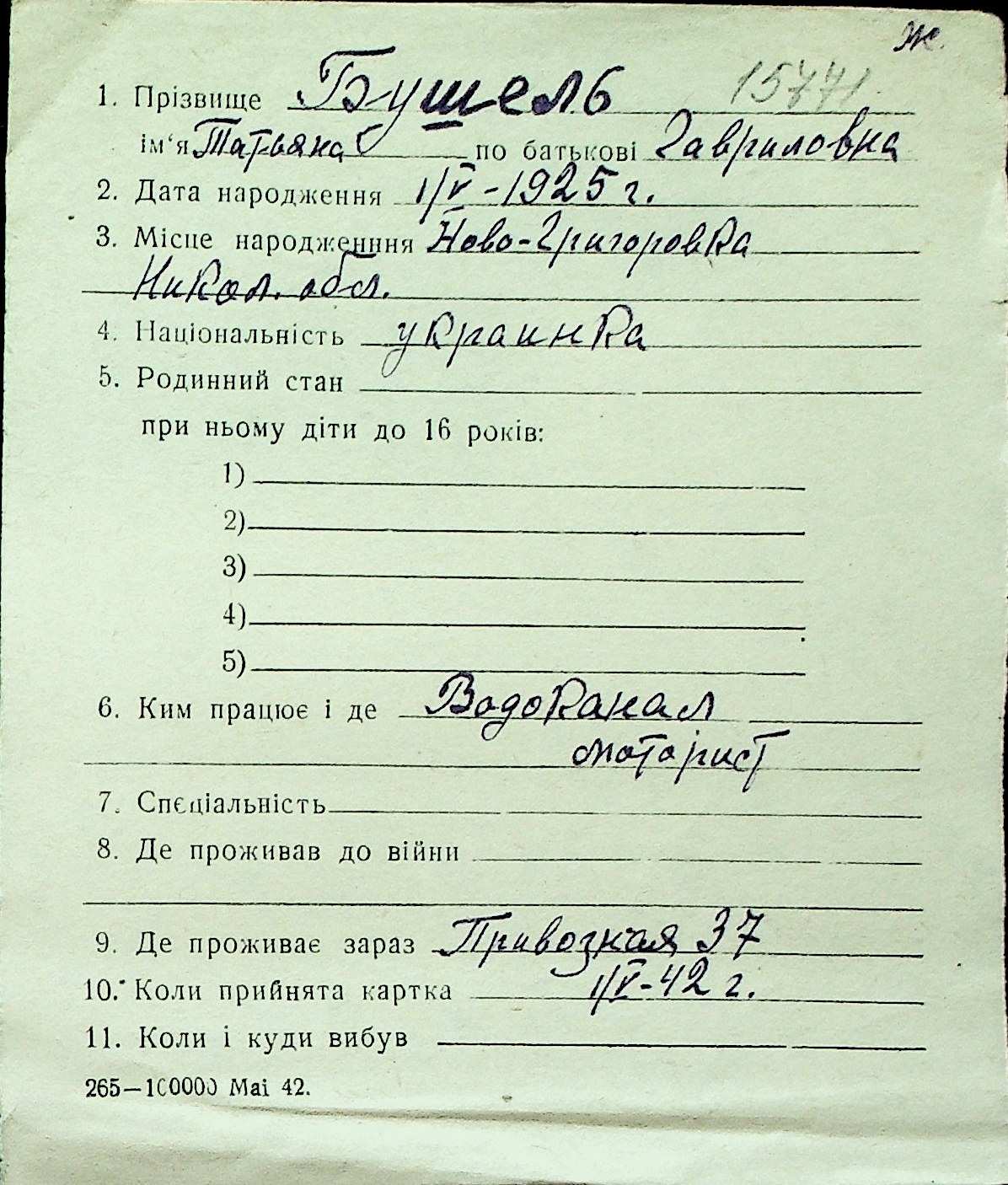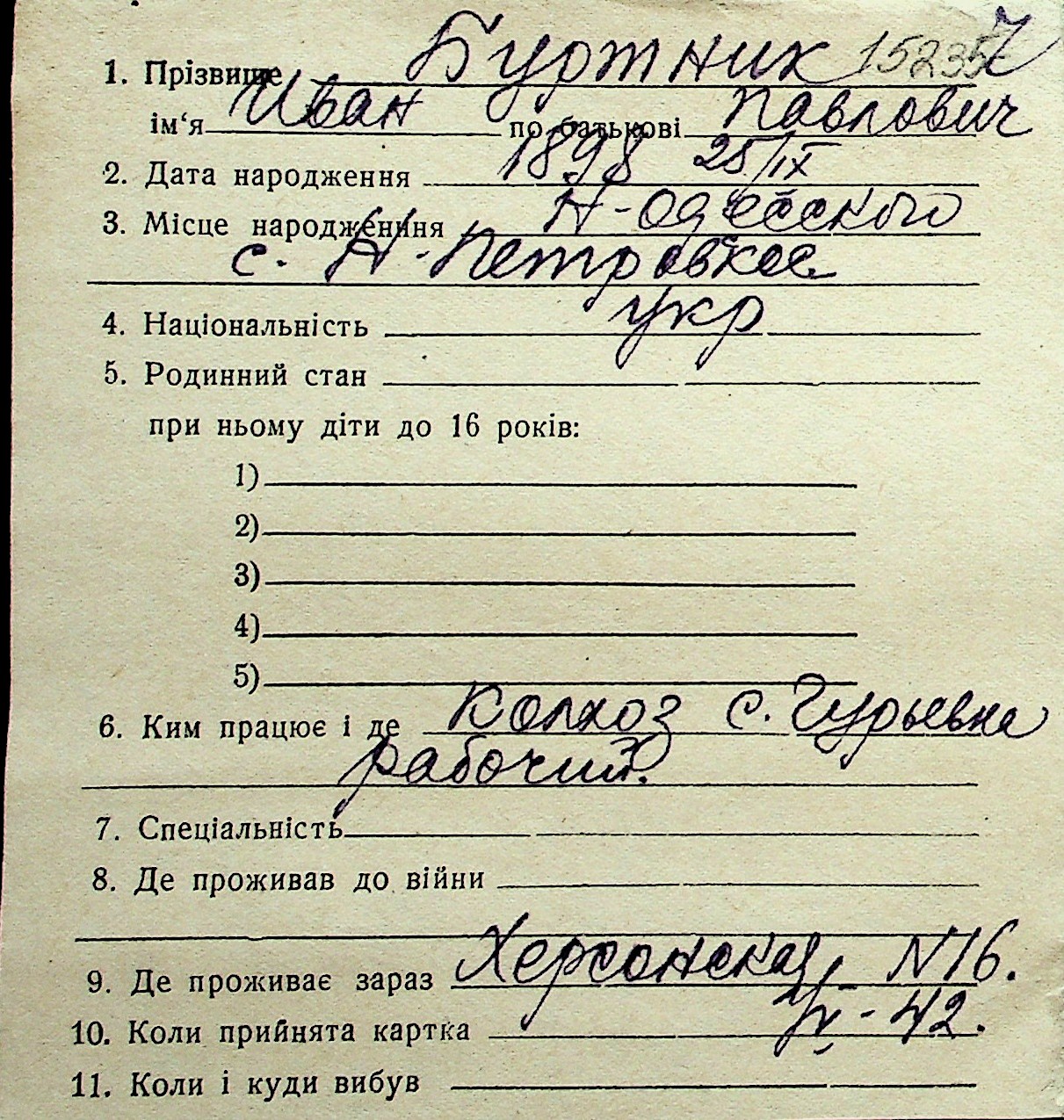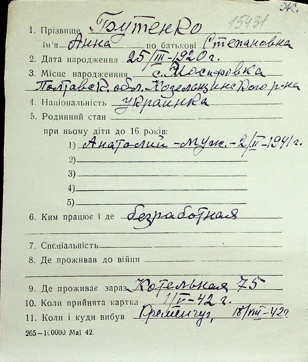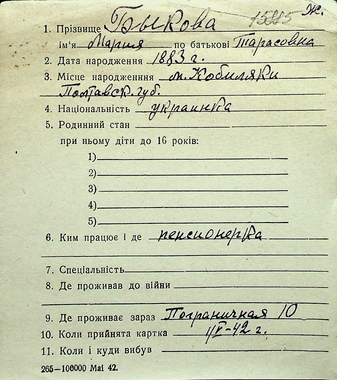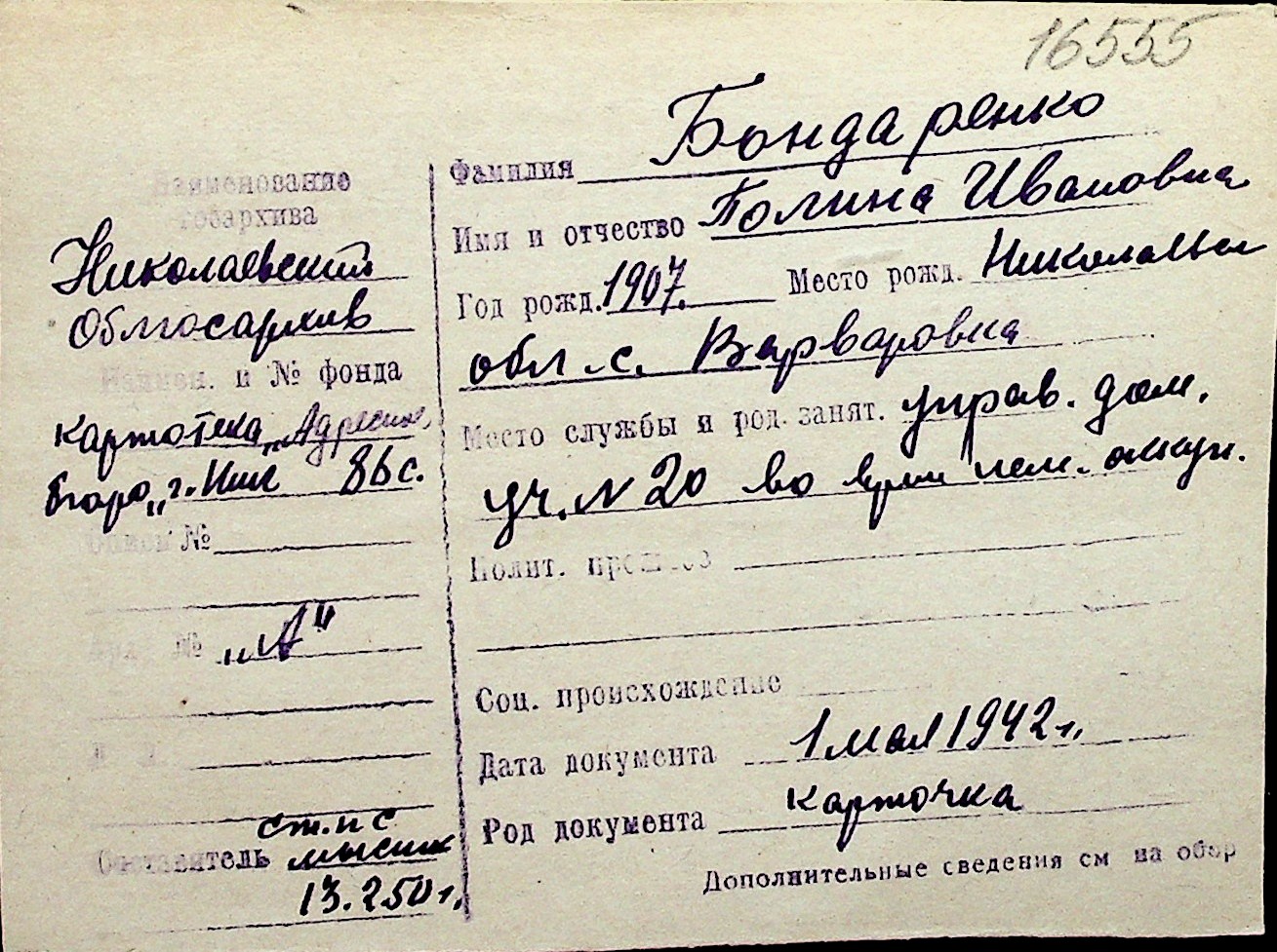 ◦ ◦ Перелік карток на осіб, які мешкали у м. Миколаїв у період окупації 1941–1944 років