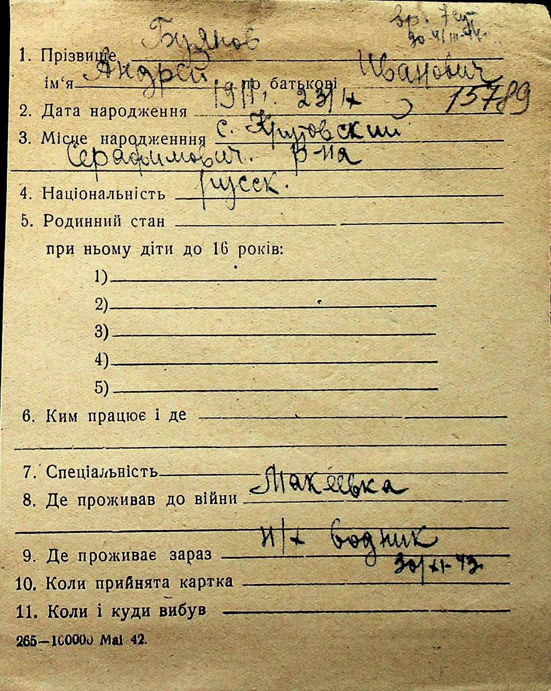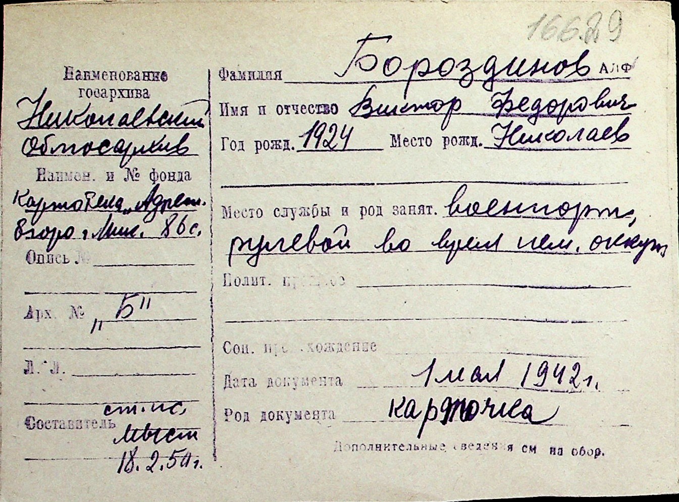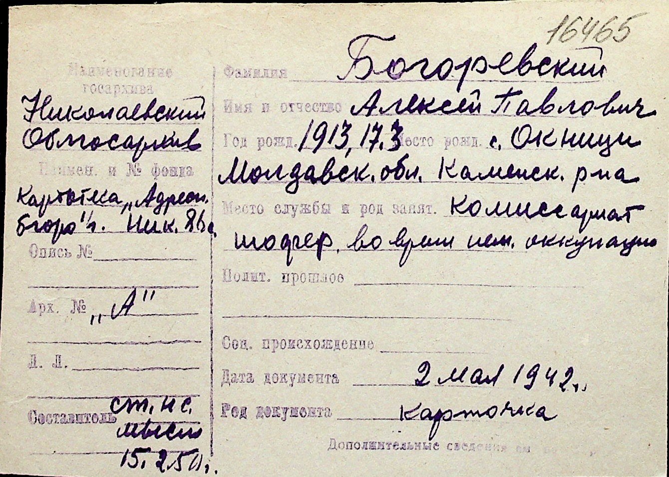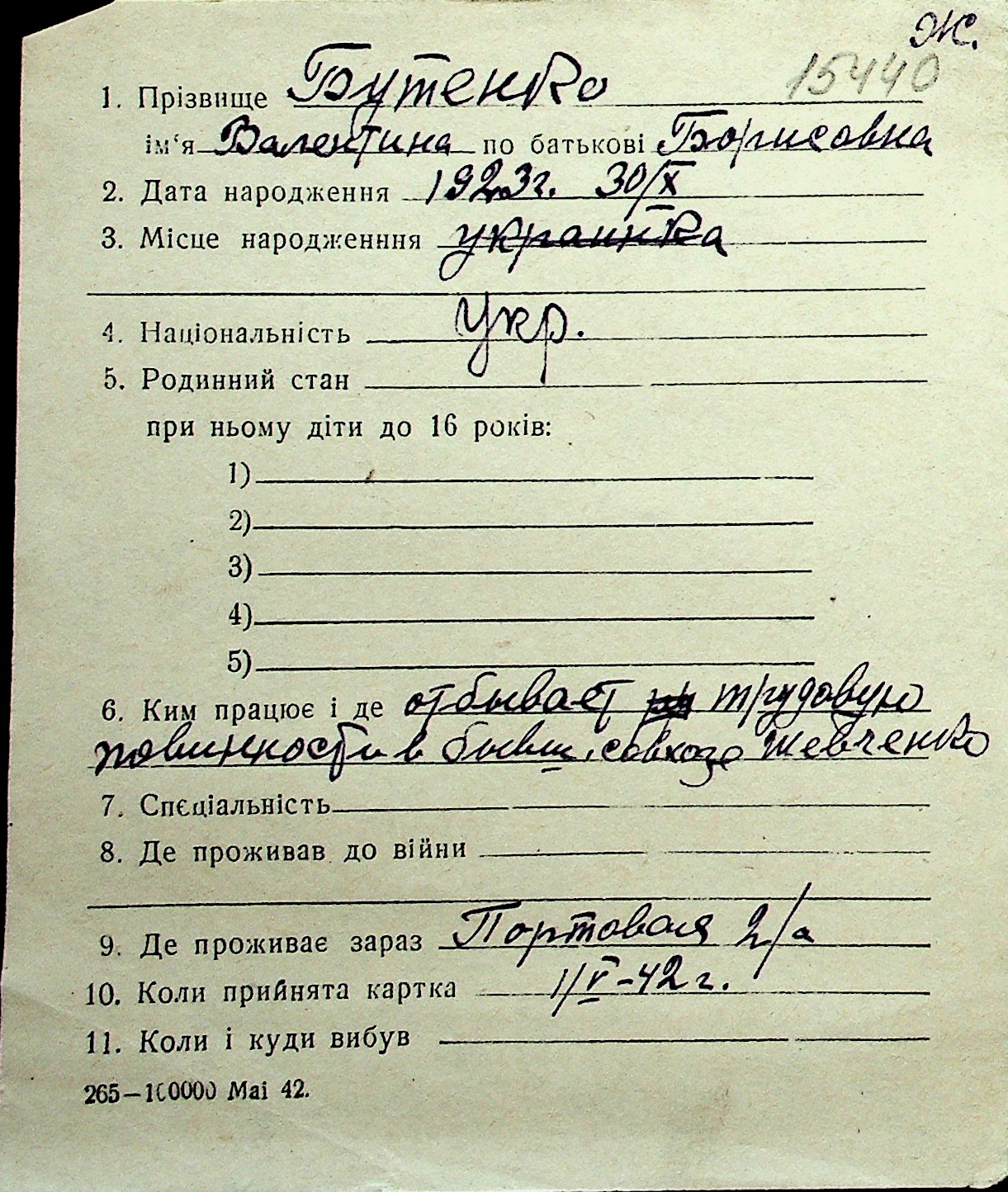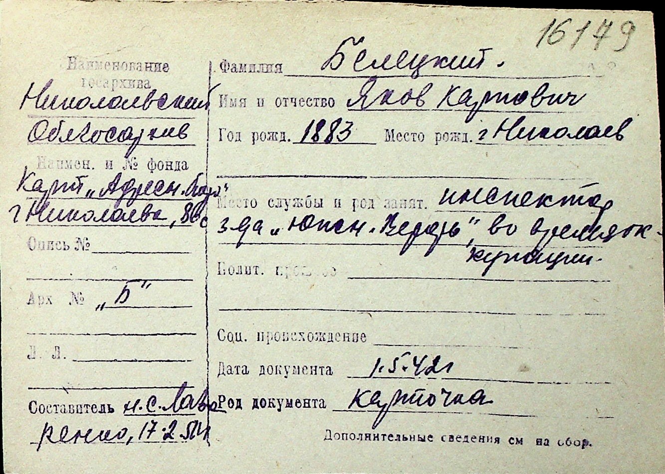 ◦ ◦ Перелік карток на осіб, які мешкали у м. Миколаїв у період окупації 1941–1944 років