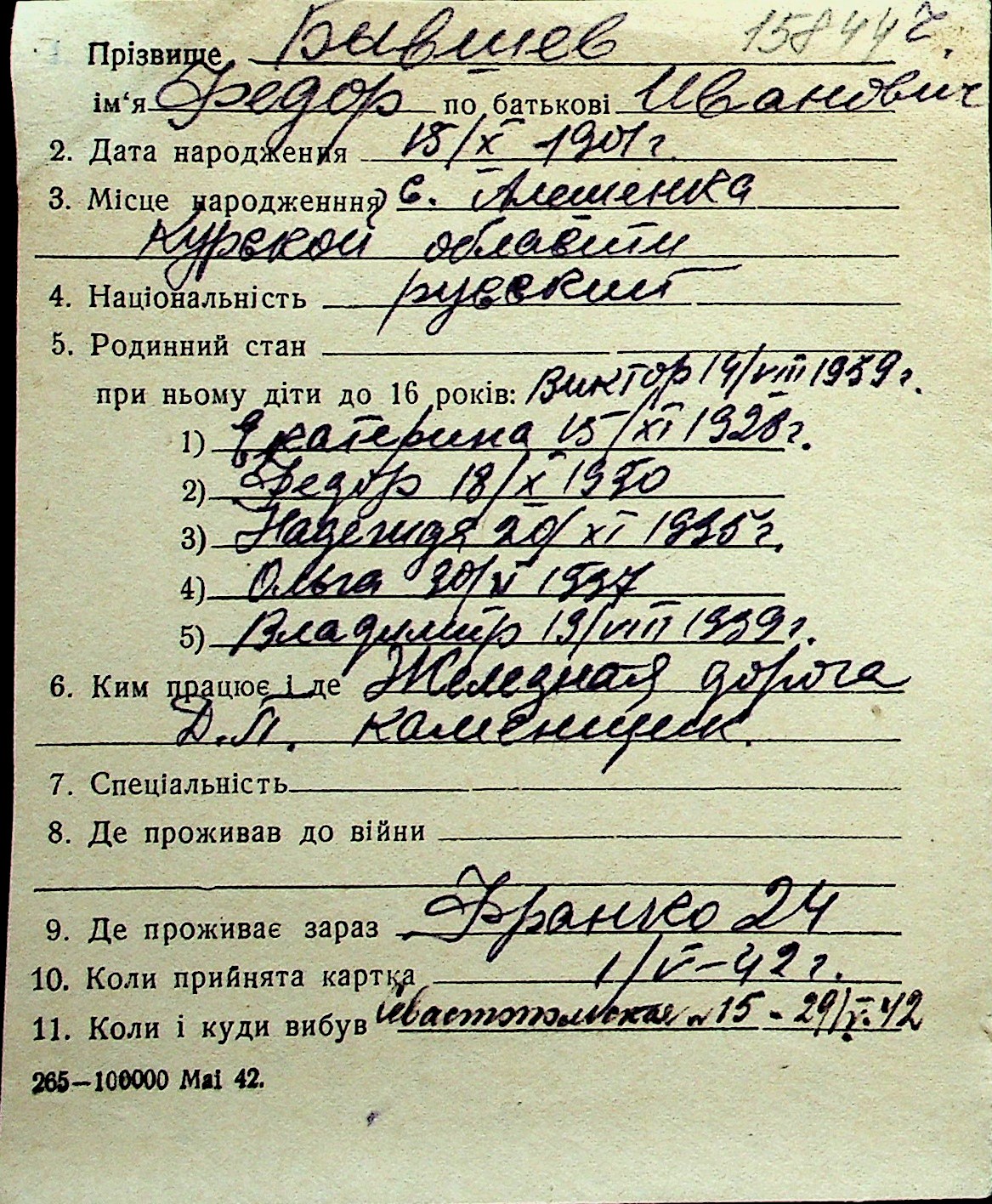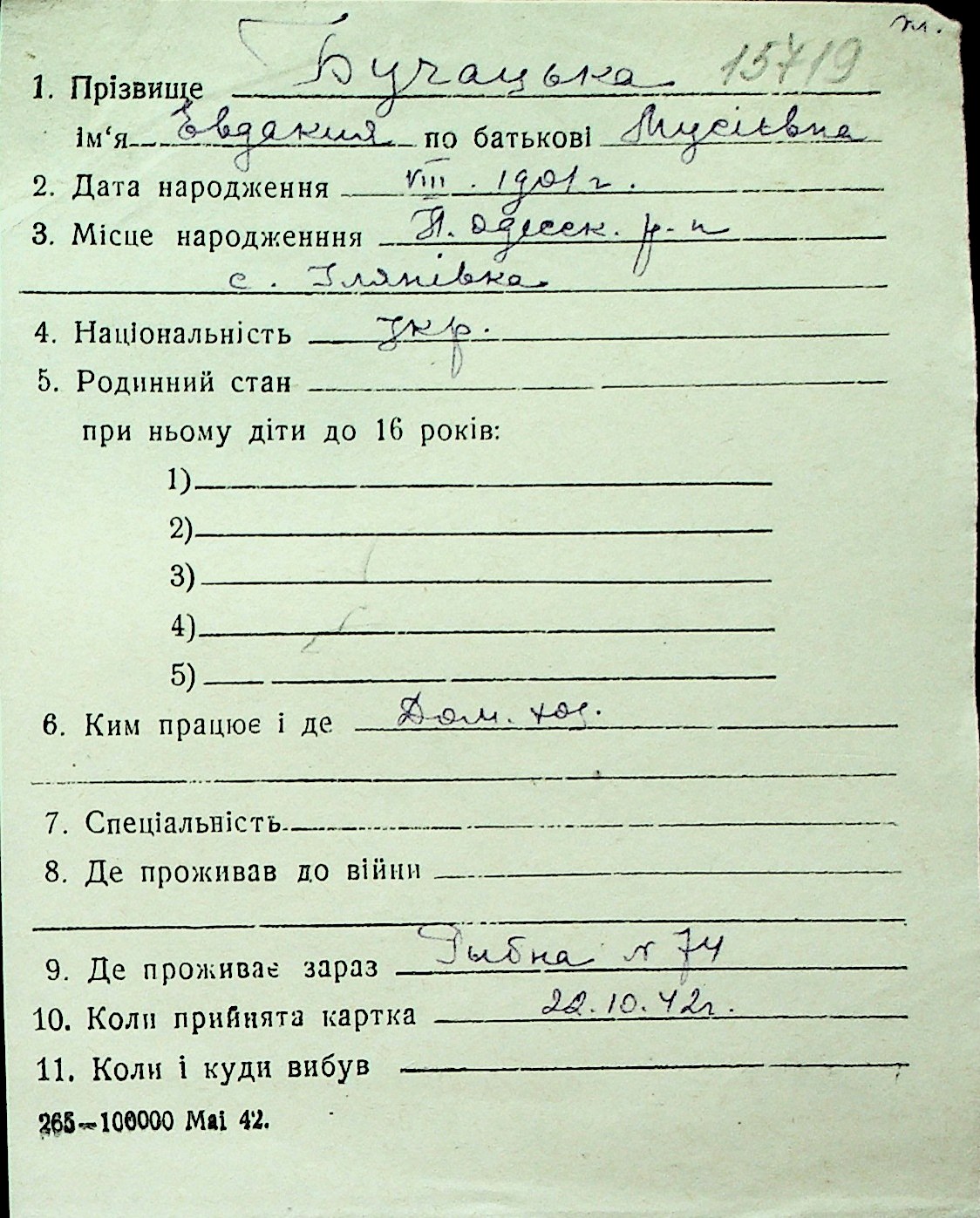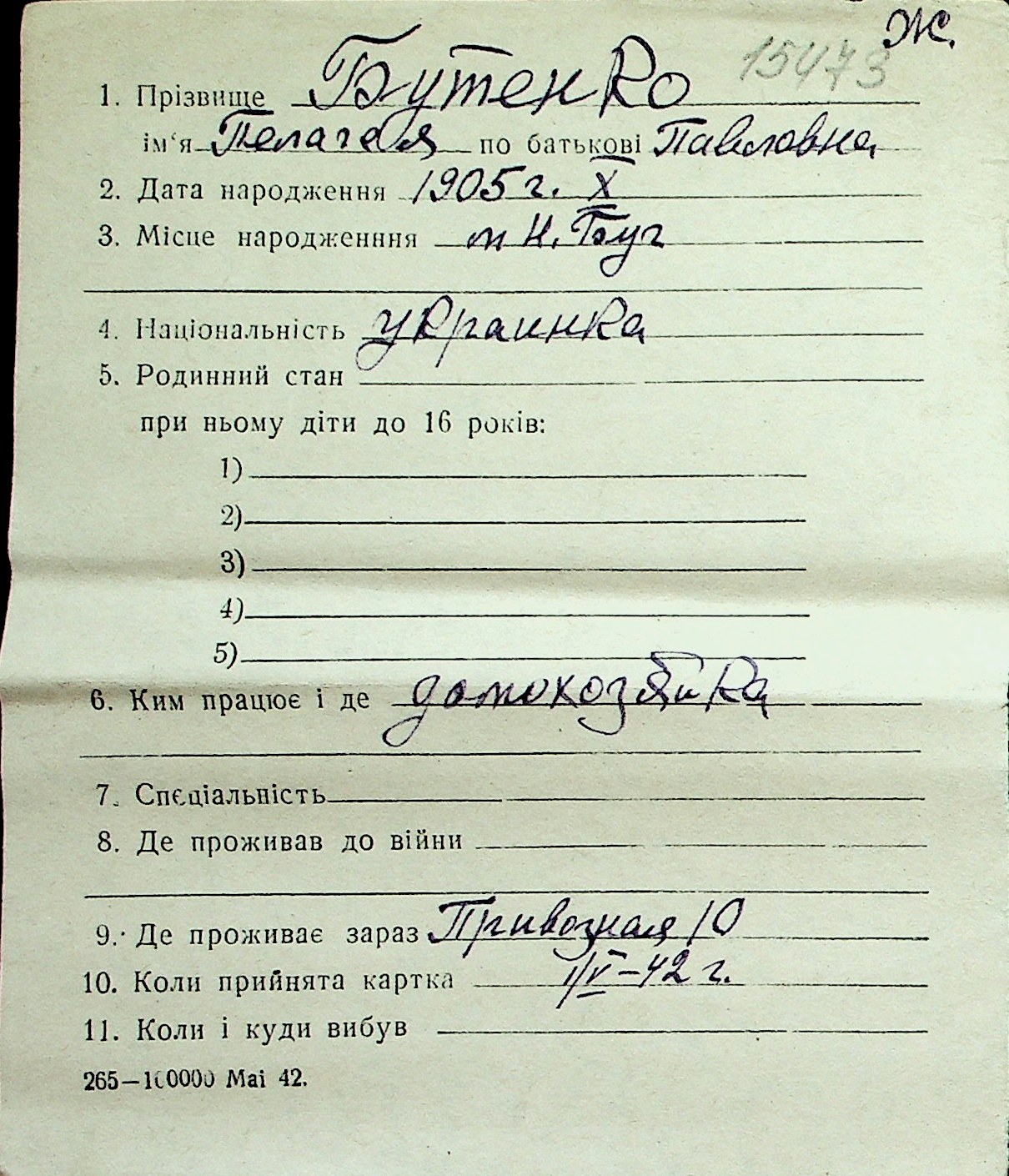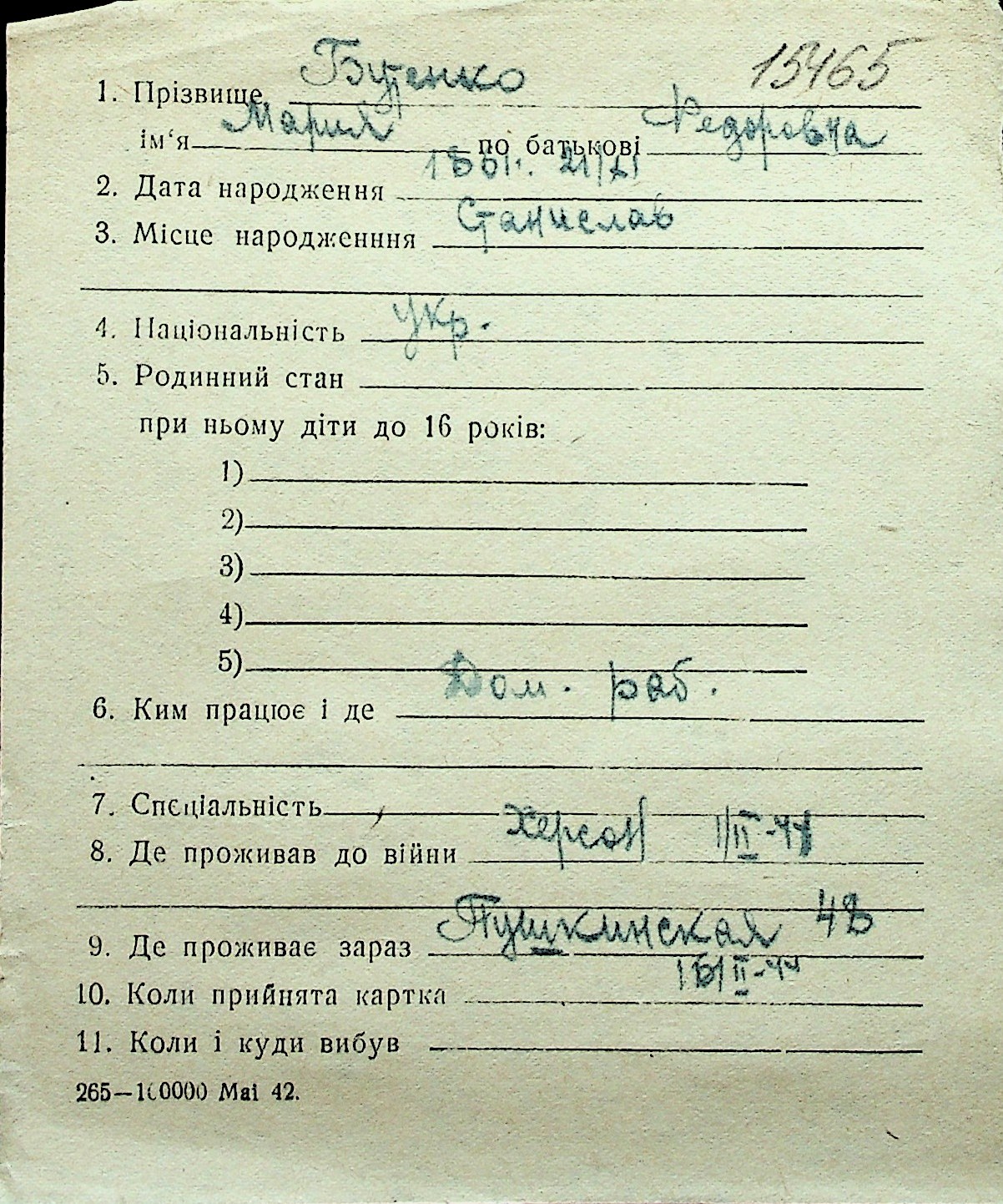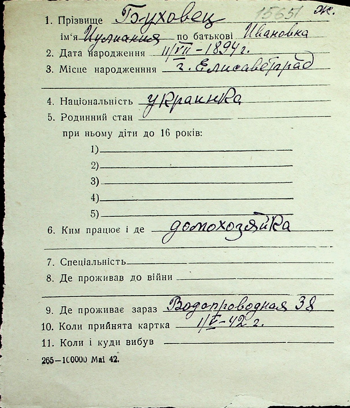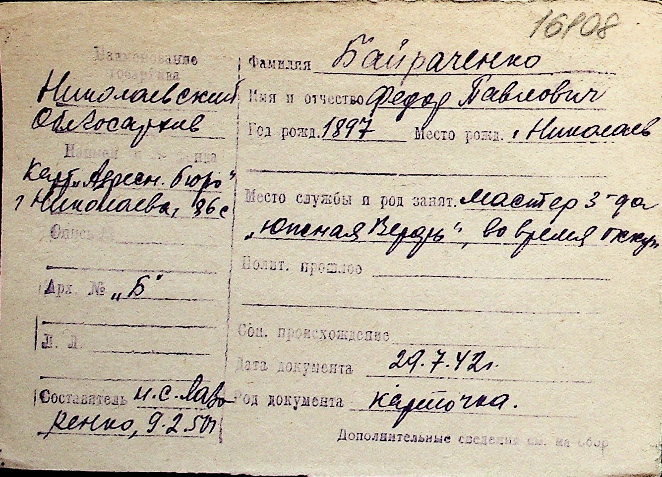 ◦ ◦ Перелік карток на осіб, які мешкали у м. Миколаїв у період окупації 1941–1944 років