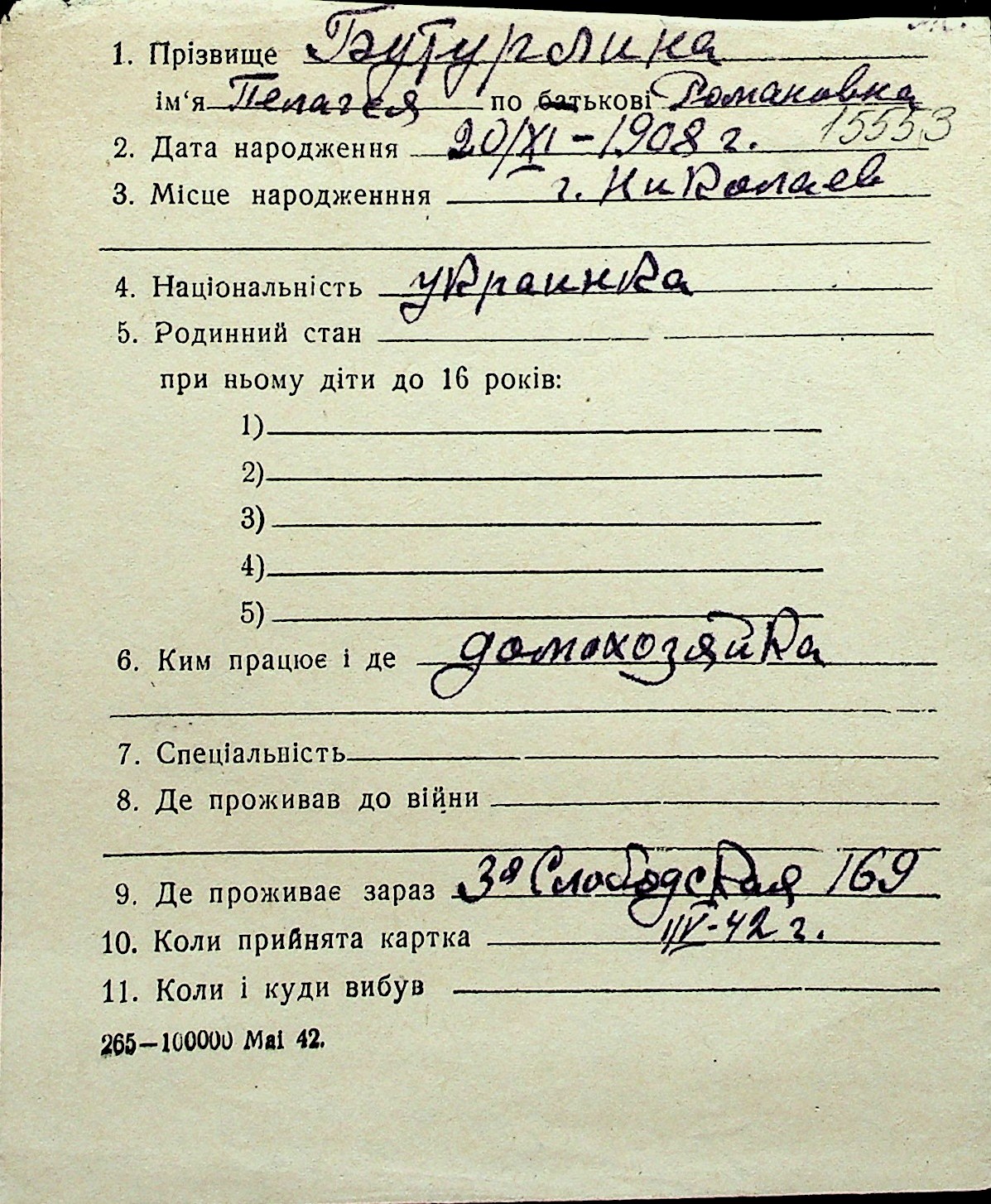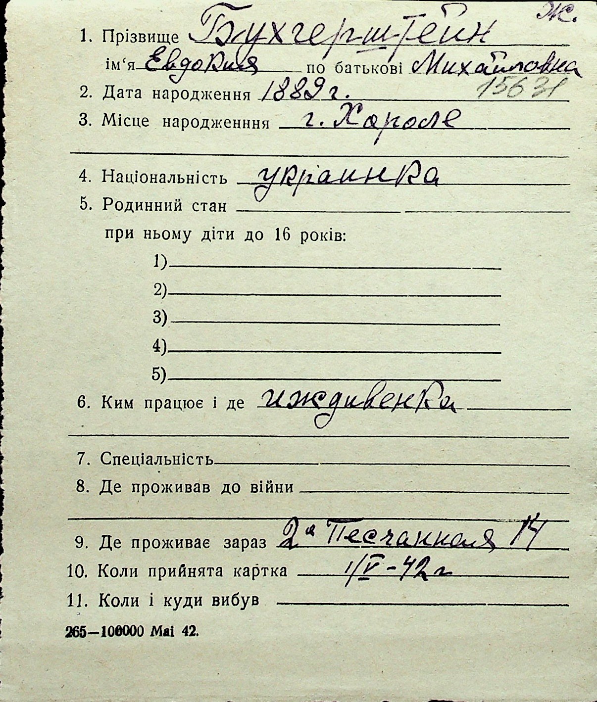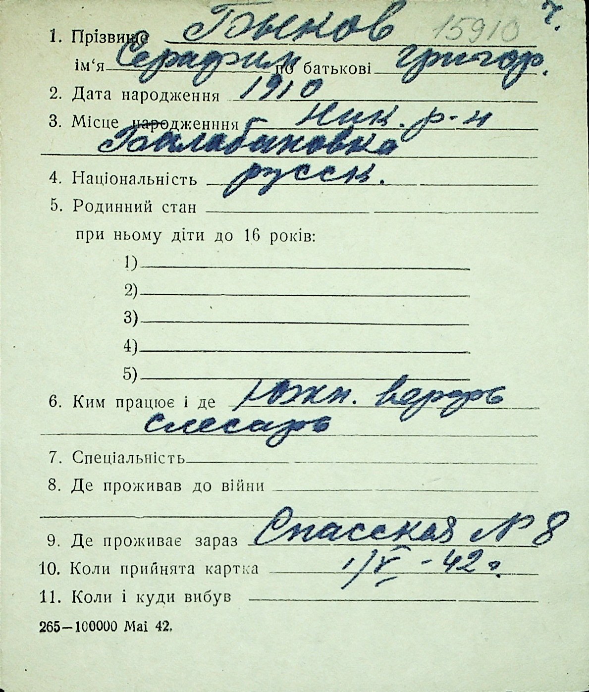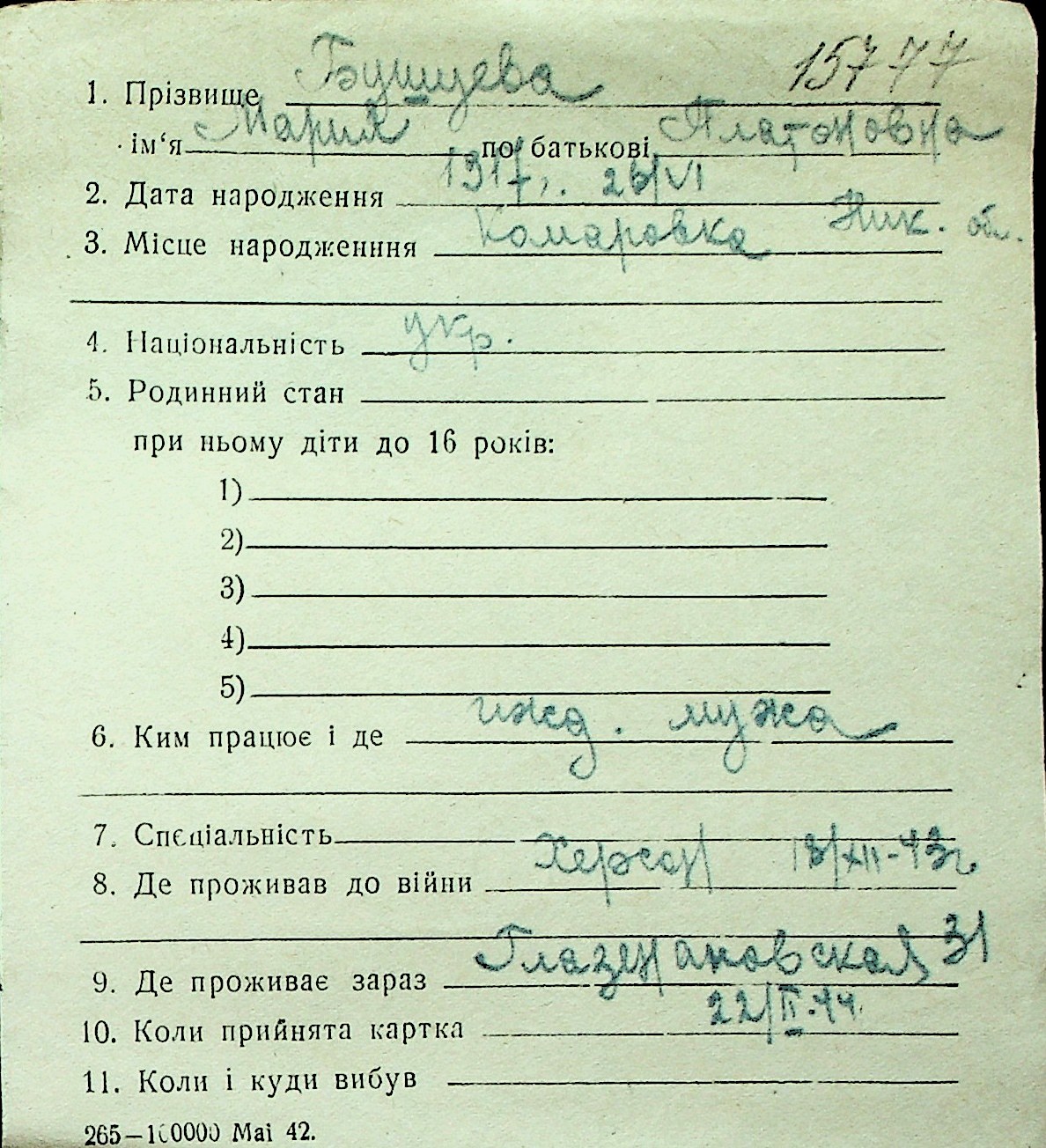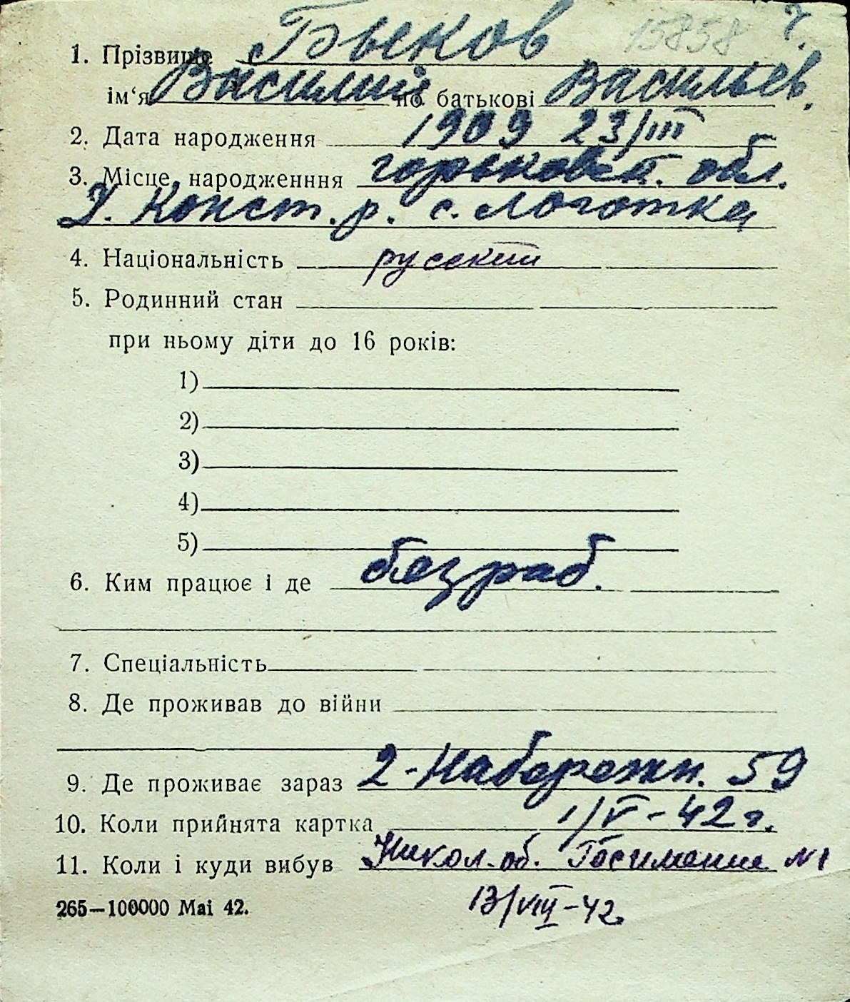 ◦ ◦ Перелік карток на осіб, які мешкали у м. Миколаїв у період окупації 1941–1944 років