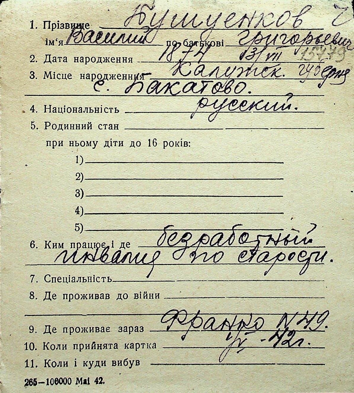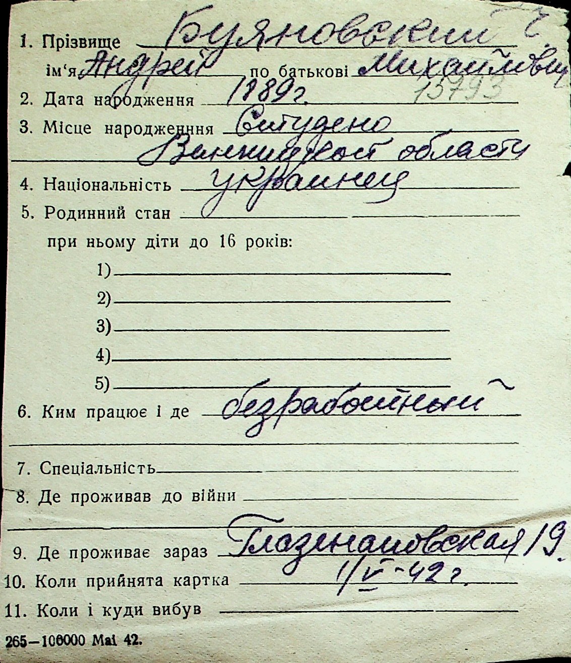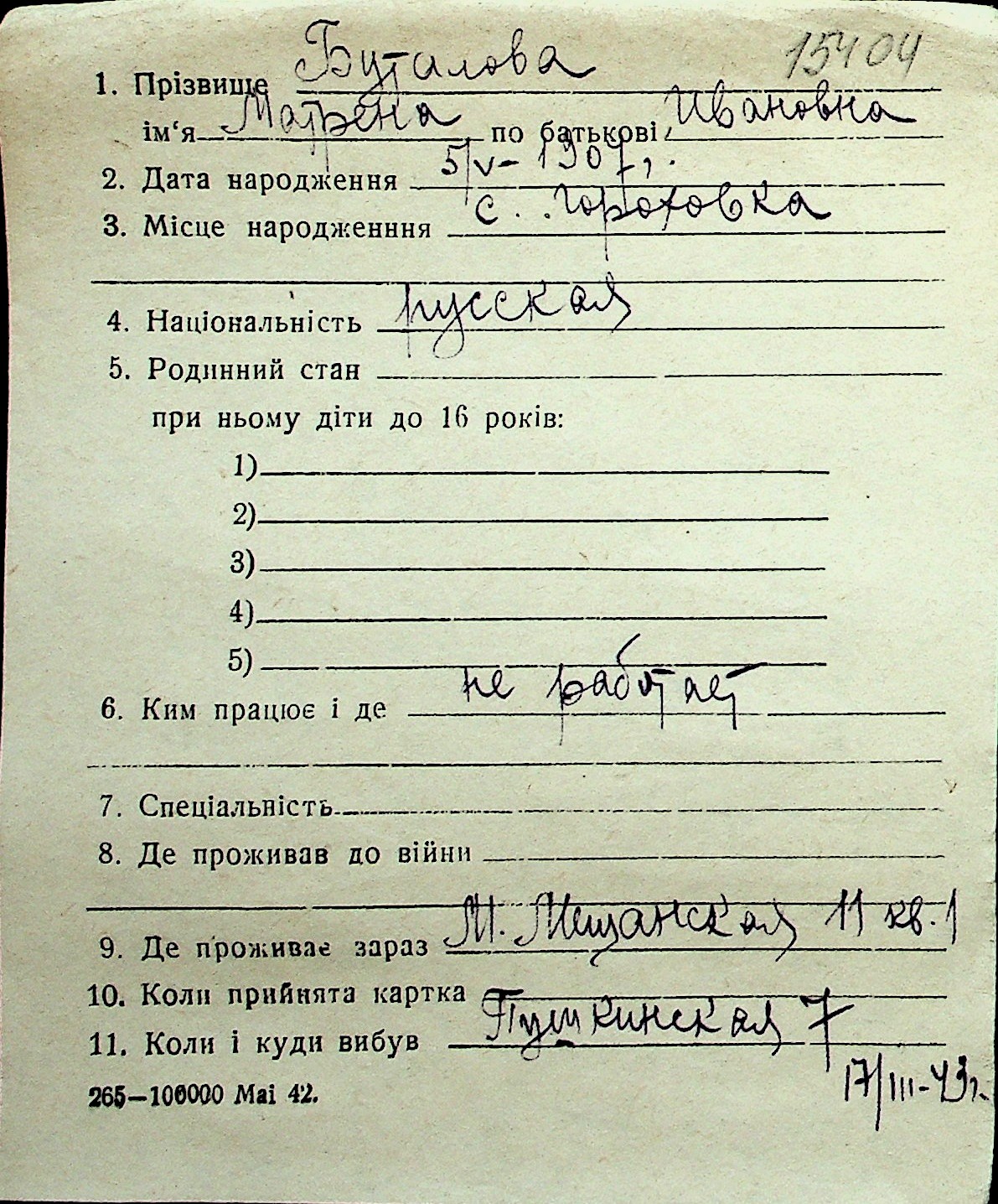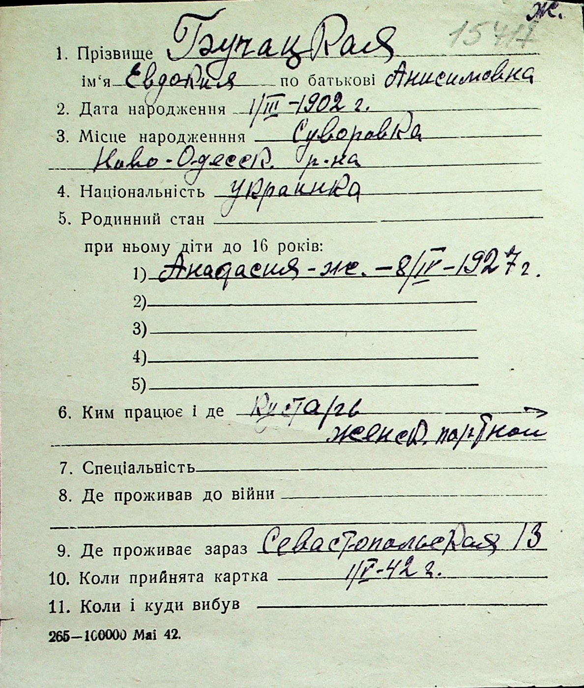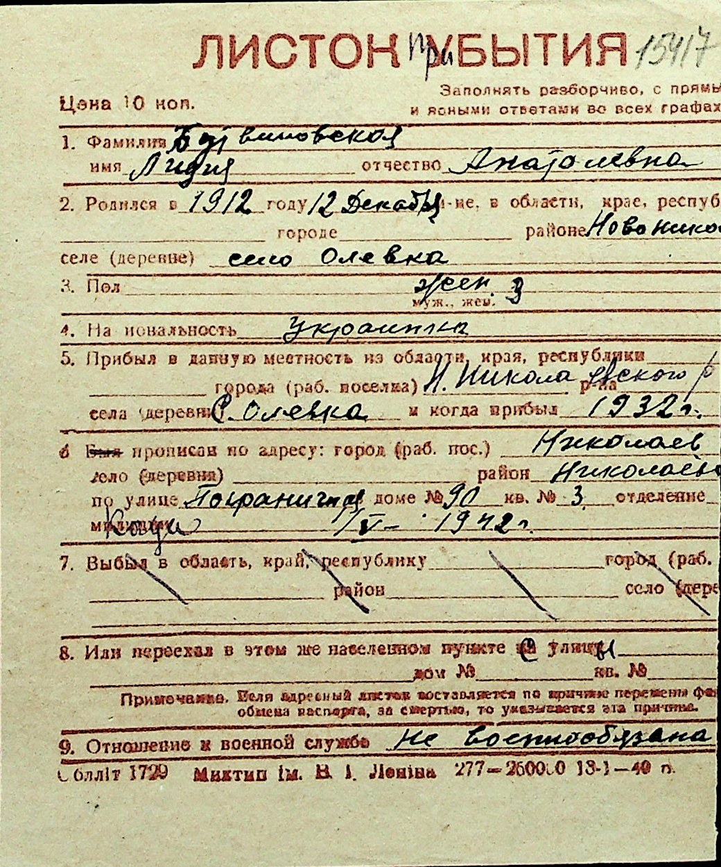 ◦ ◦ Перелік карток на осіб, які мешкали у м. Миколаїв у період окупації 1941–1944 років