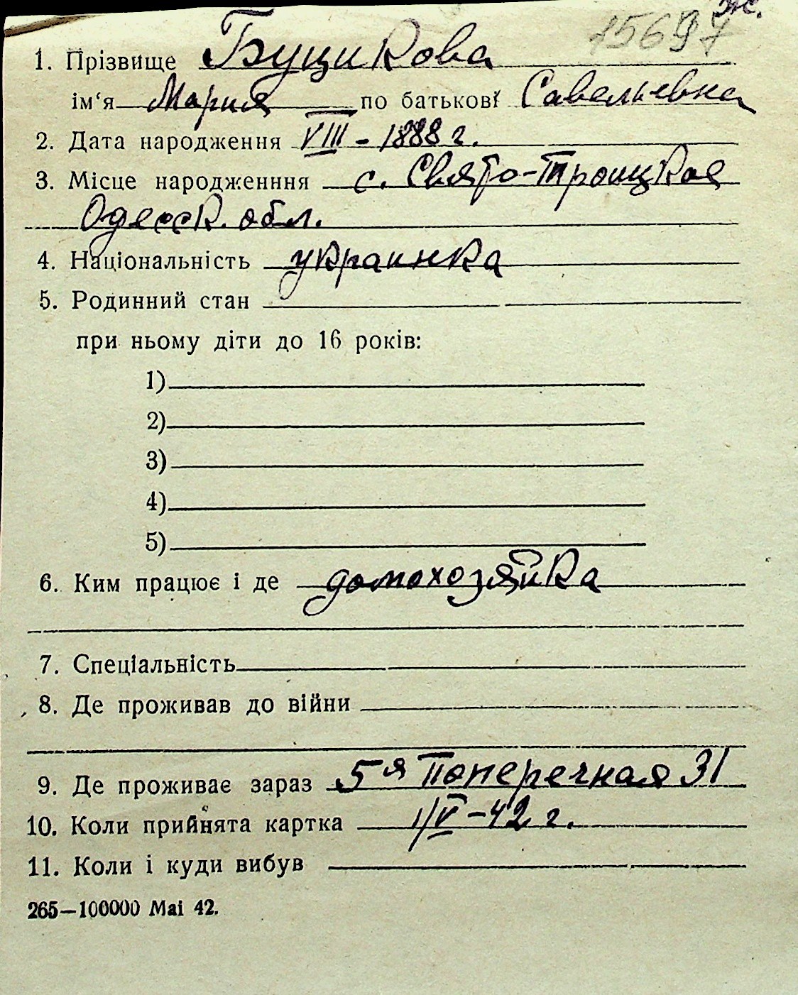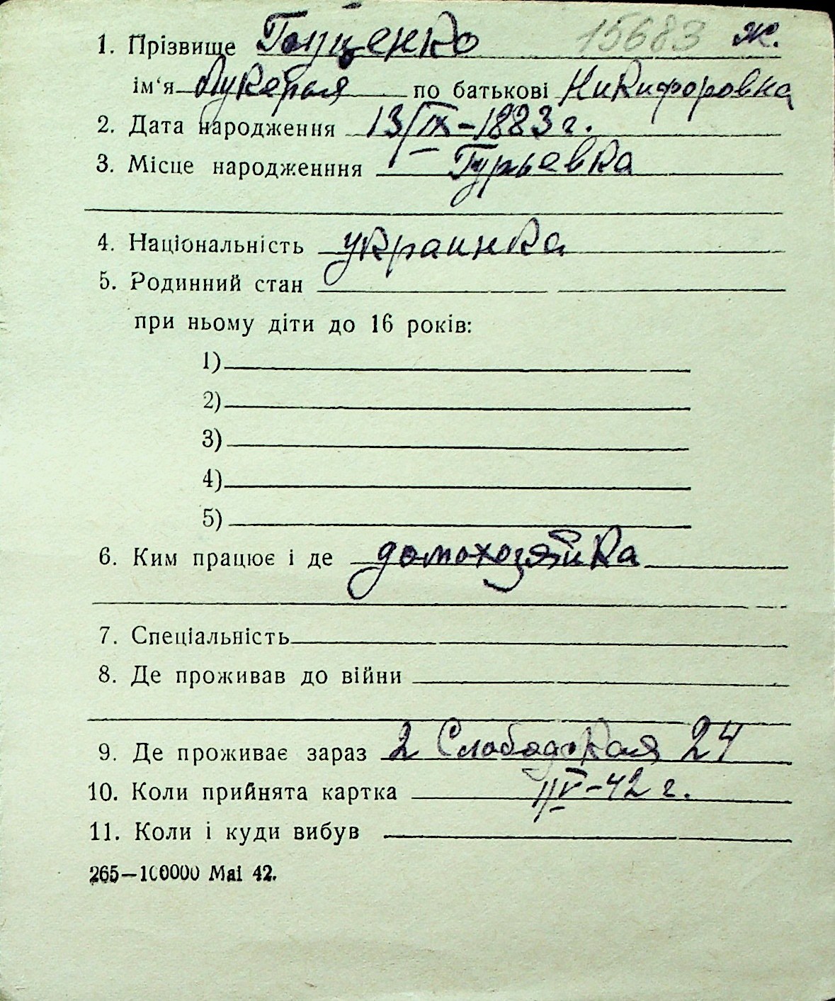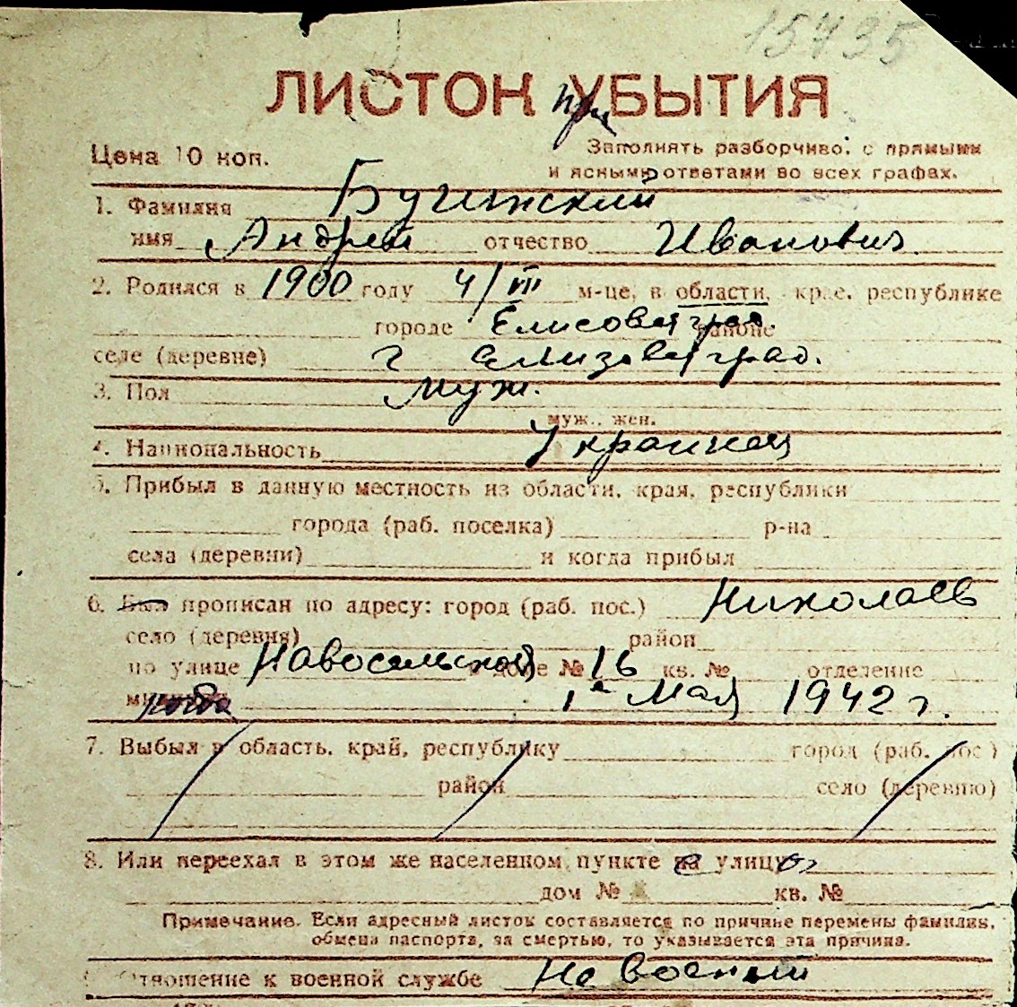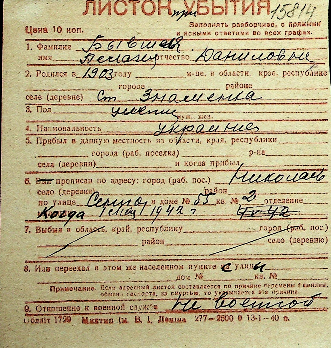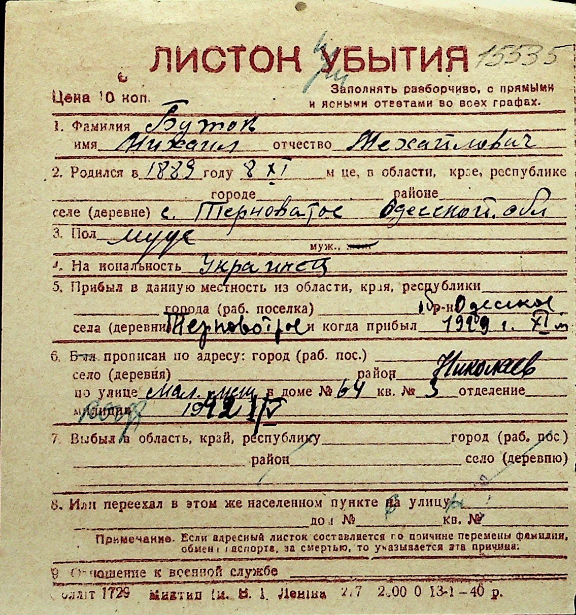 ◦ ◦ Перелік карток на осіб, які мешкали у м. Миколаїв у період окупації 1941–1944 років