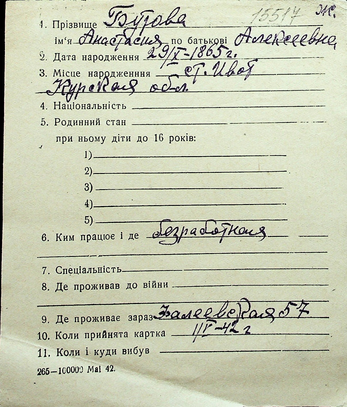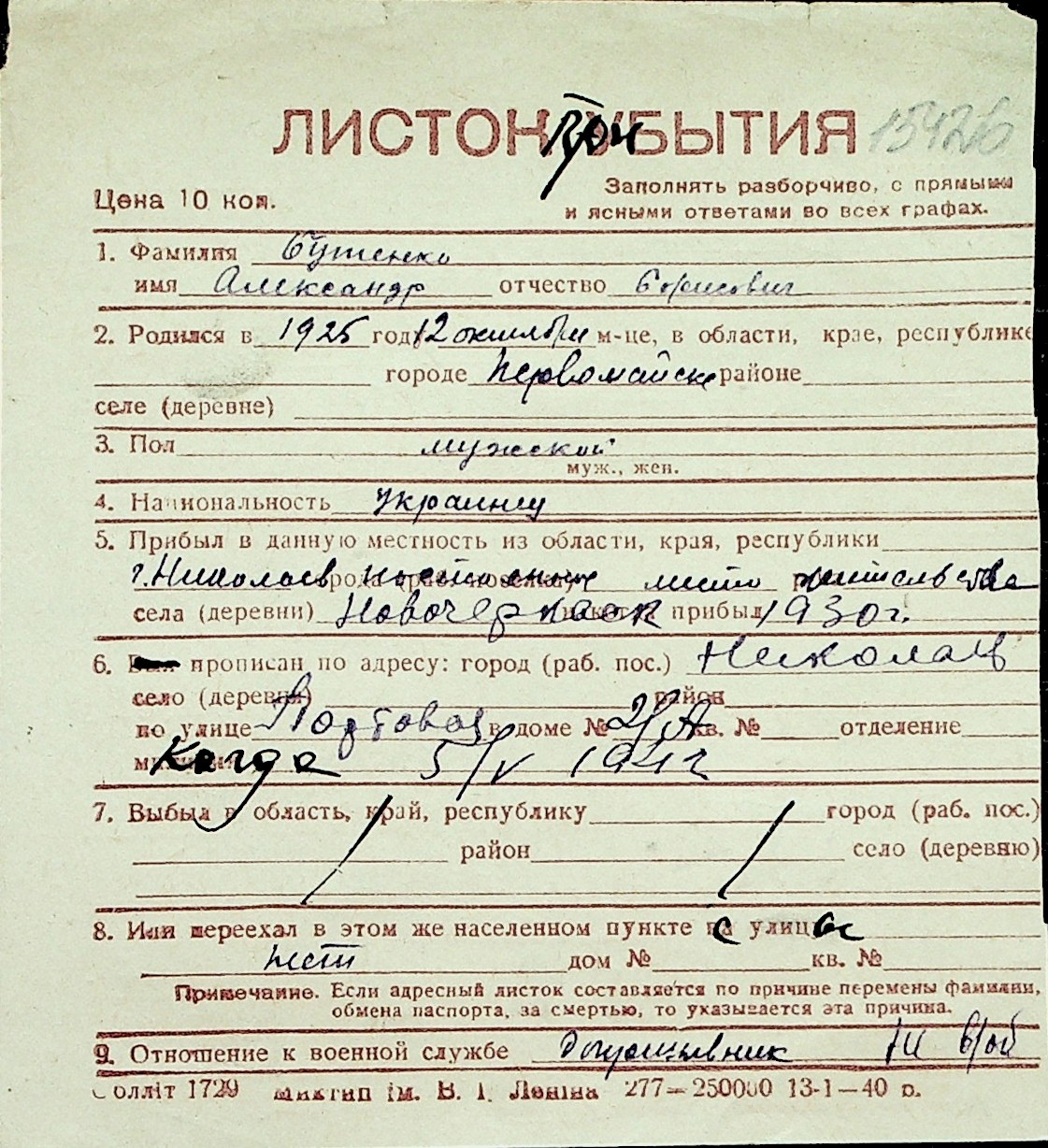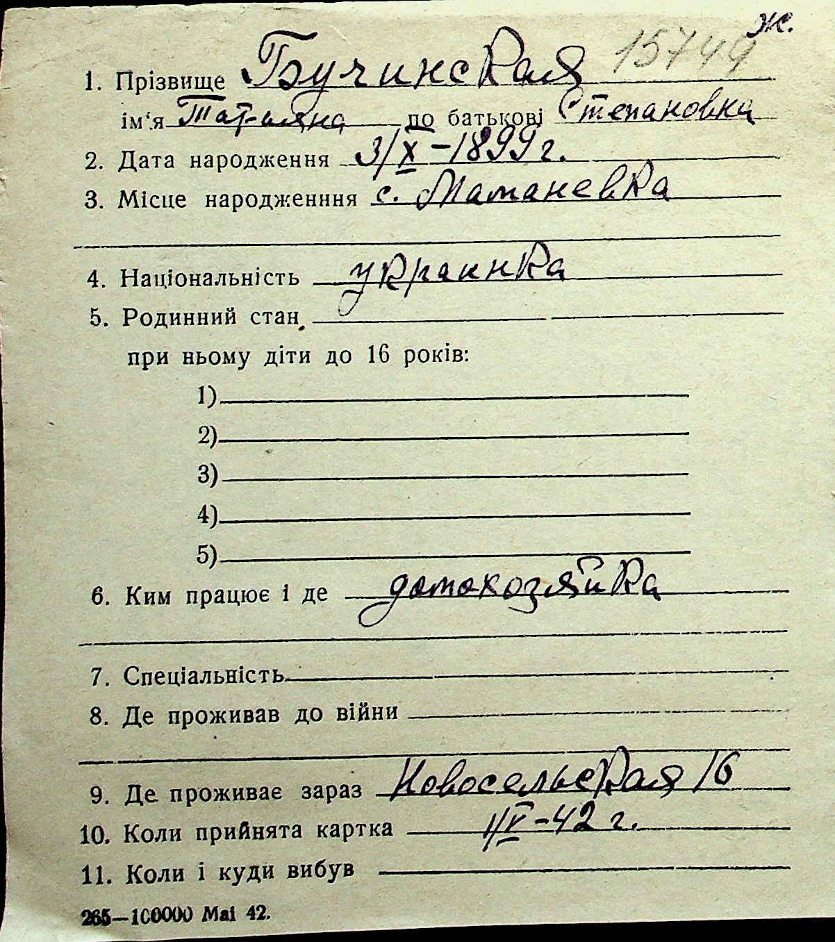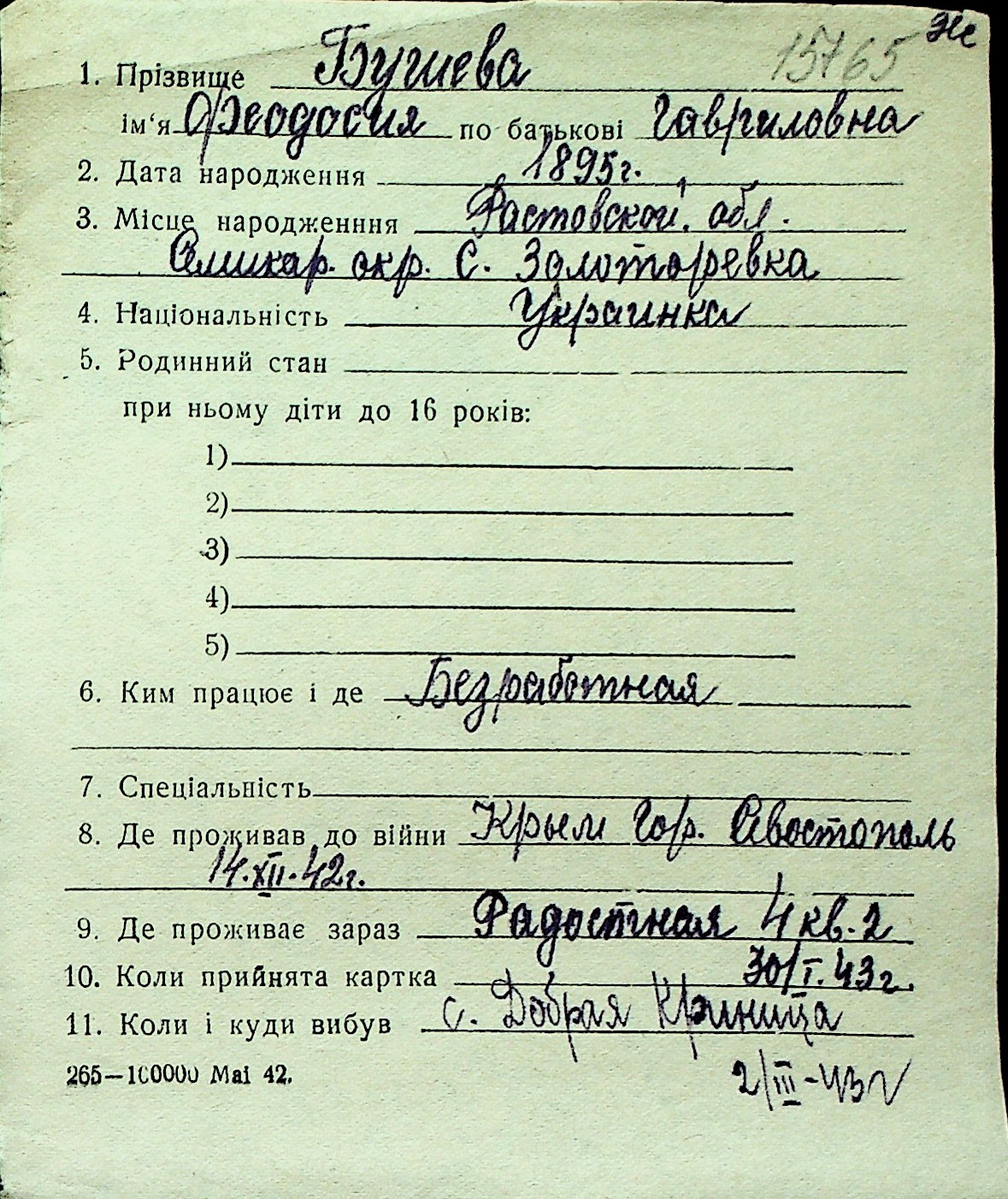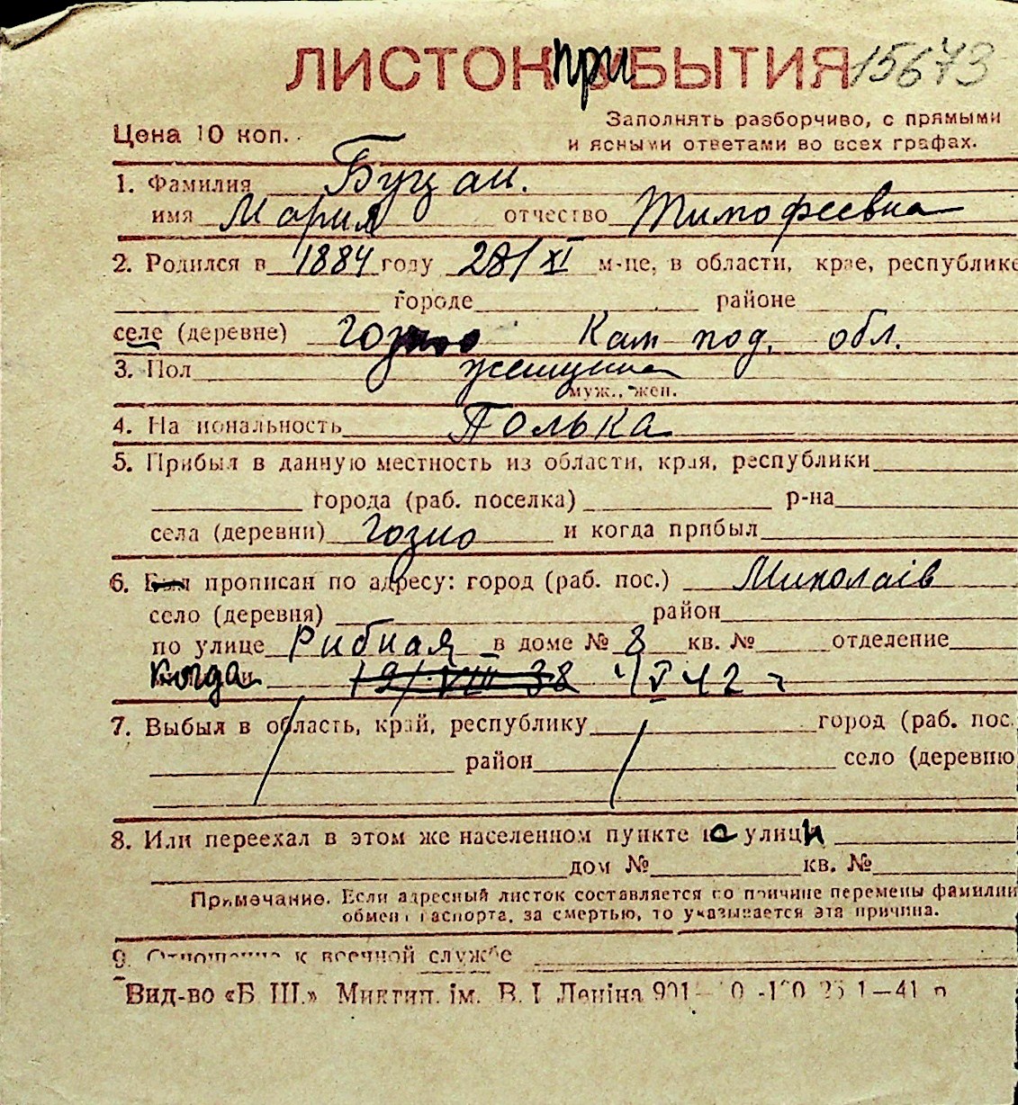 ◦ ◦ Перелік карток на осіб, які мешкали у м. Миколаїв у період окупації 1941–1944 років
