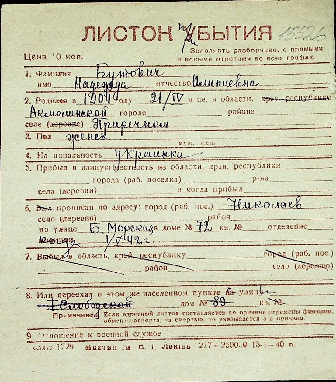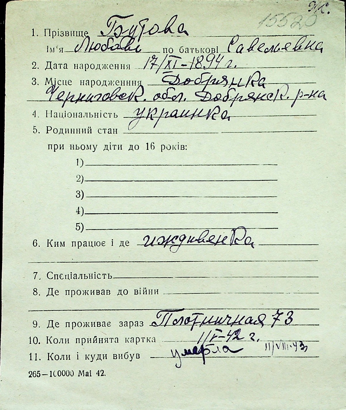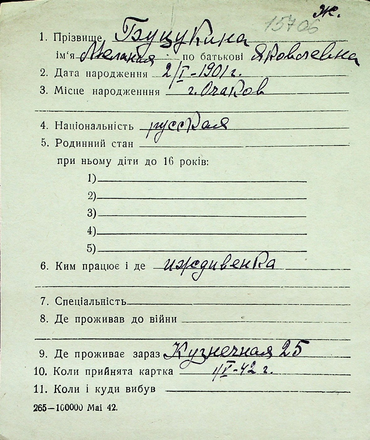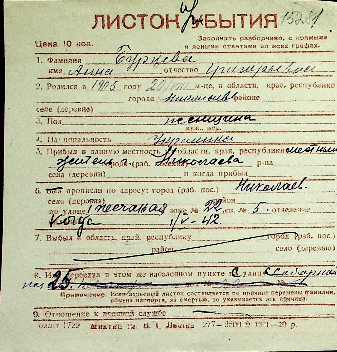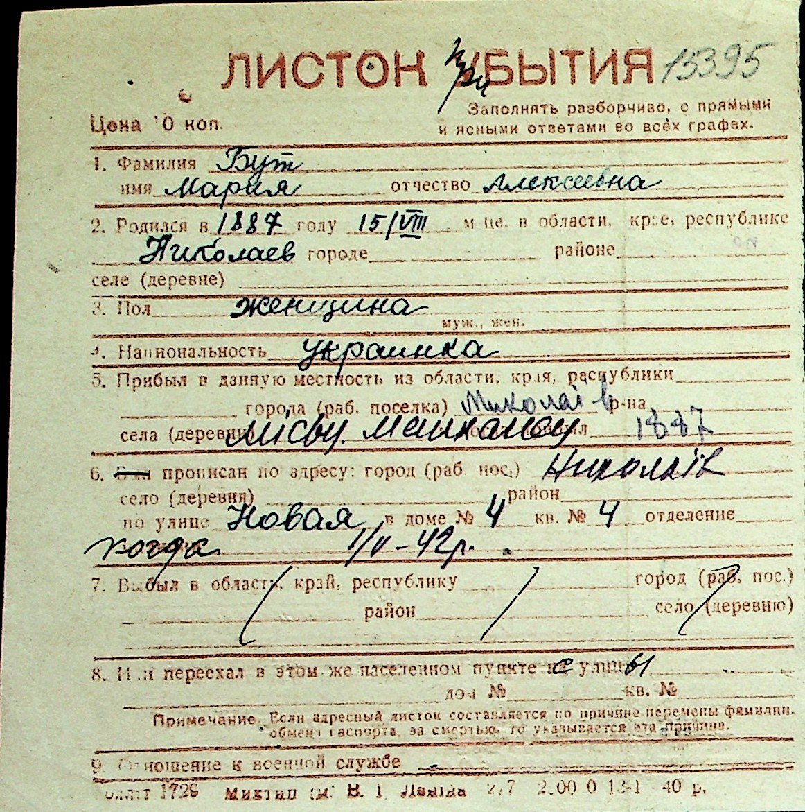 ◦ ◦ Перелік карток на осіб, які мешкали у м. Миколаїв у період окупації 1941–1944 років
