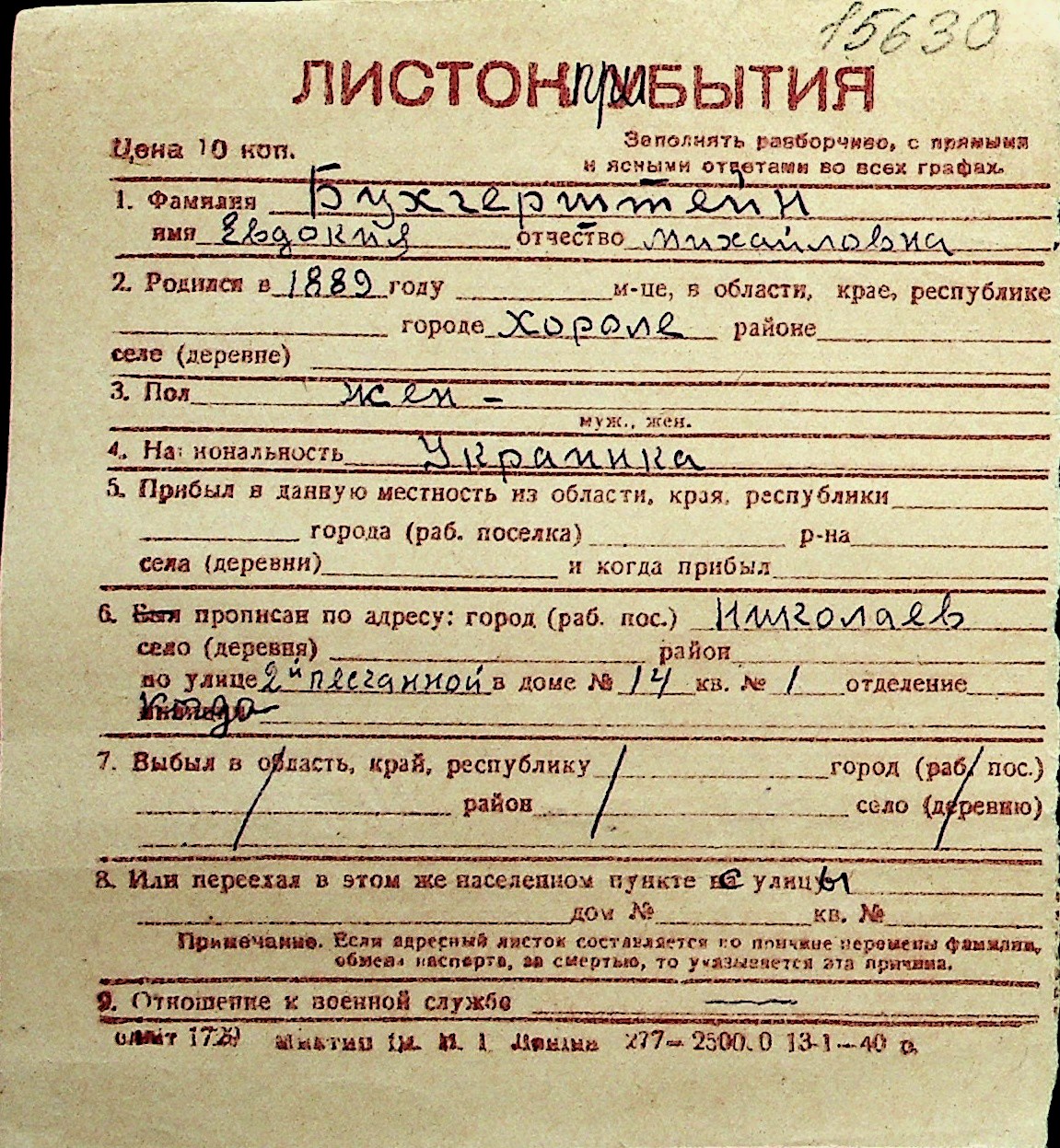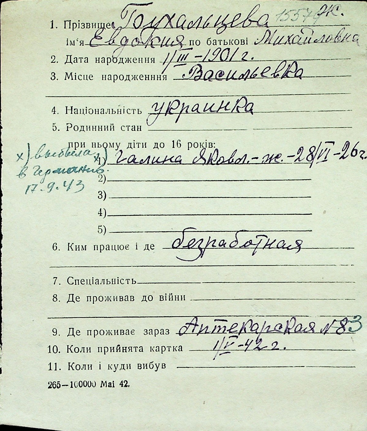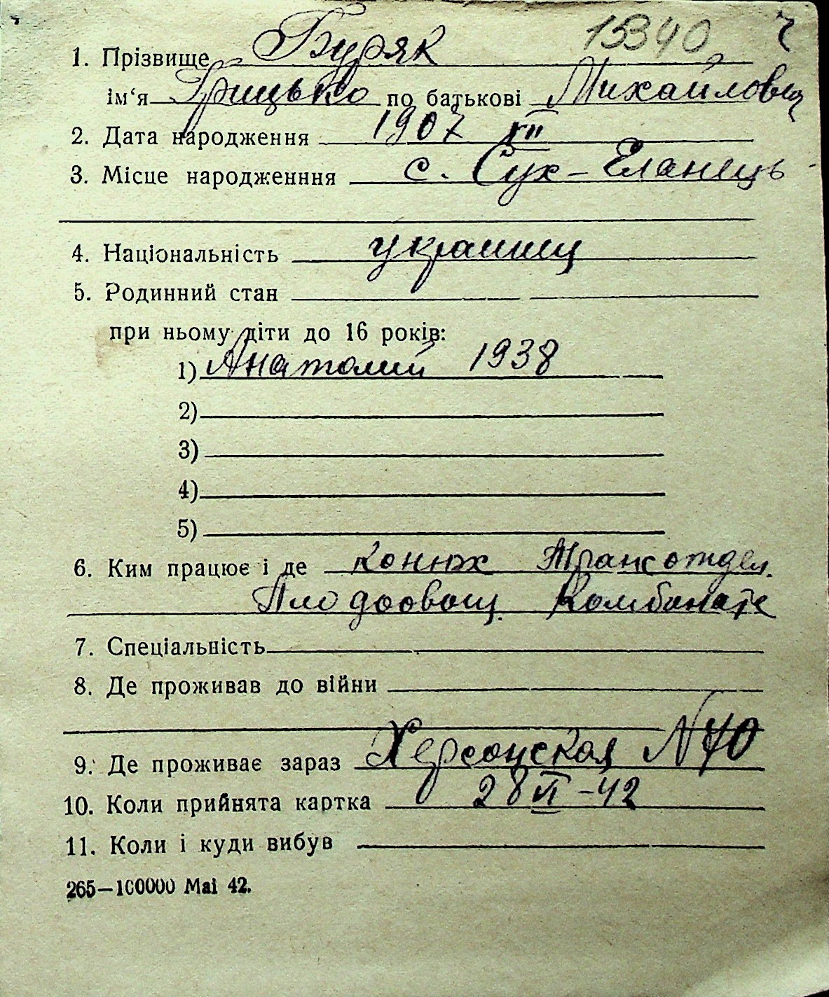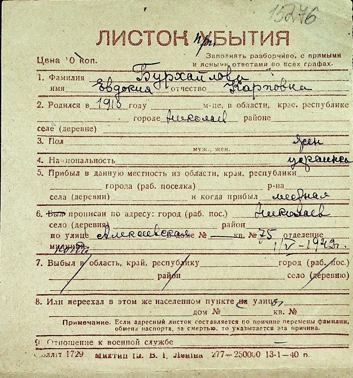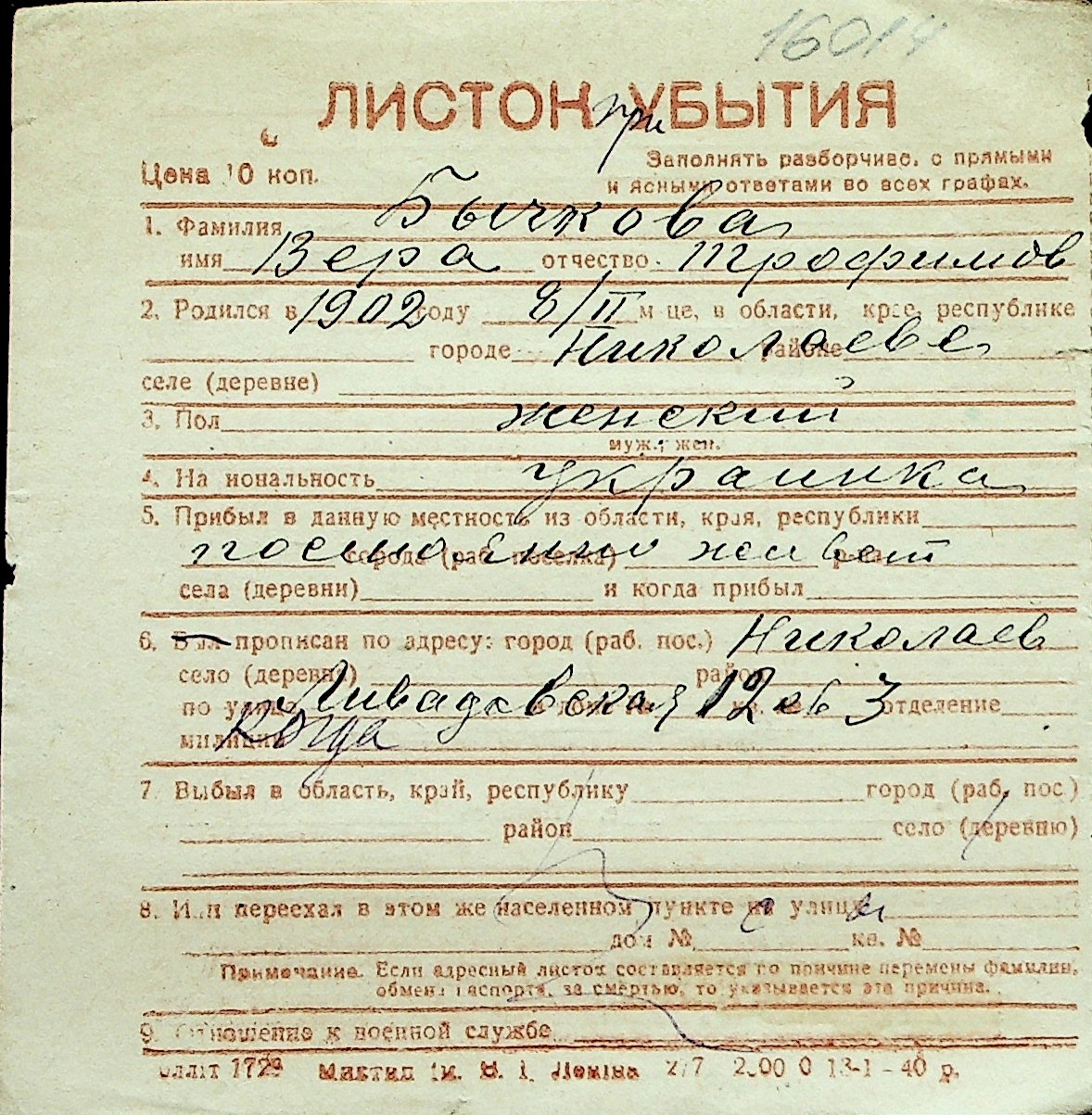 ◦ ◦ Перелік карток на осіб, які мешкали у м. Миколаїв у період окупації 1941–1944 років