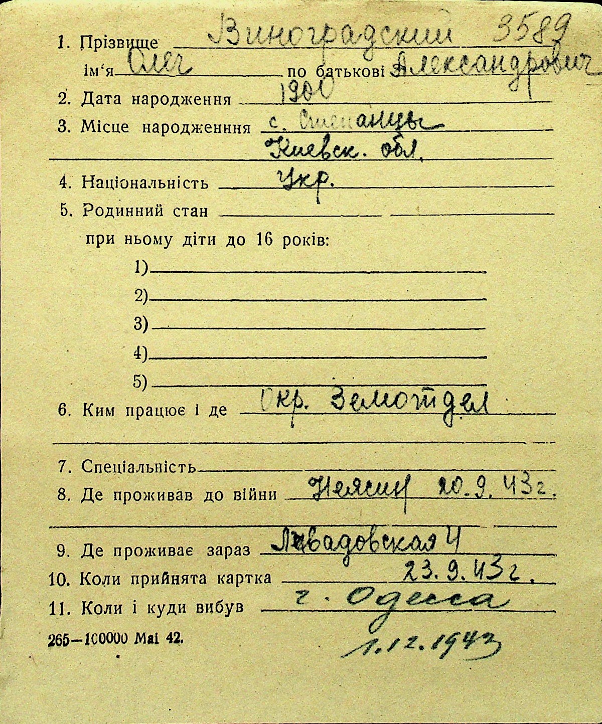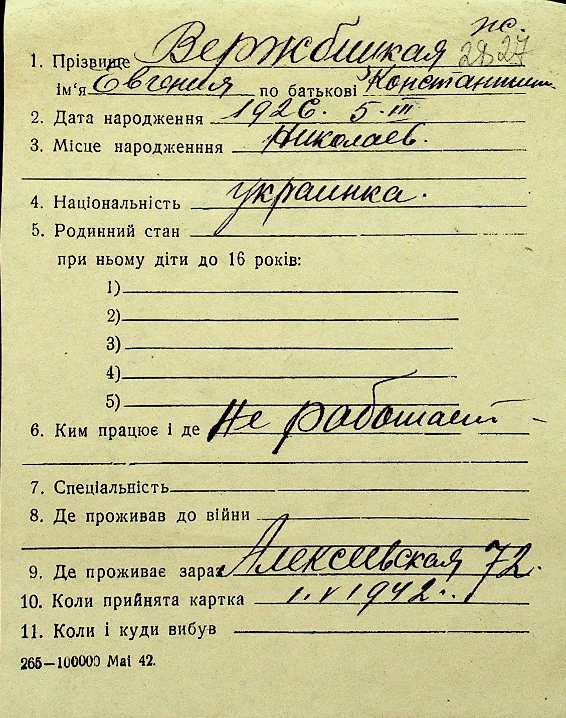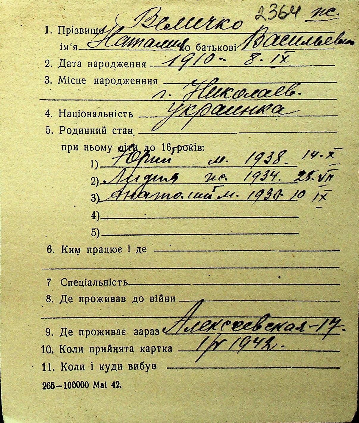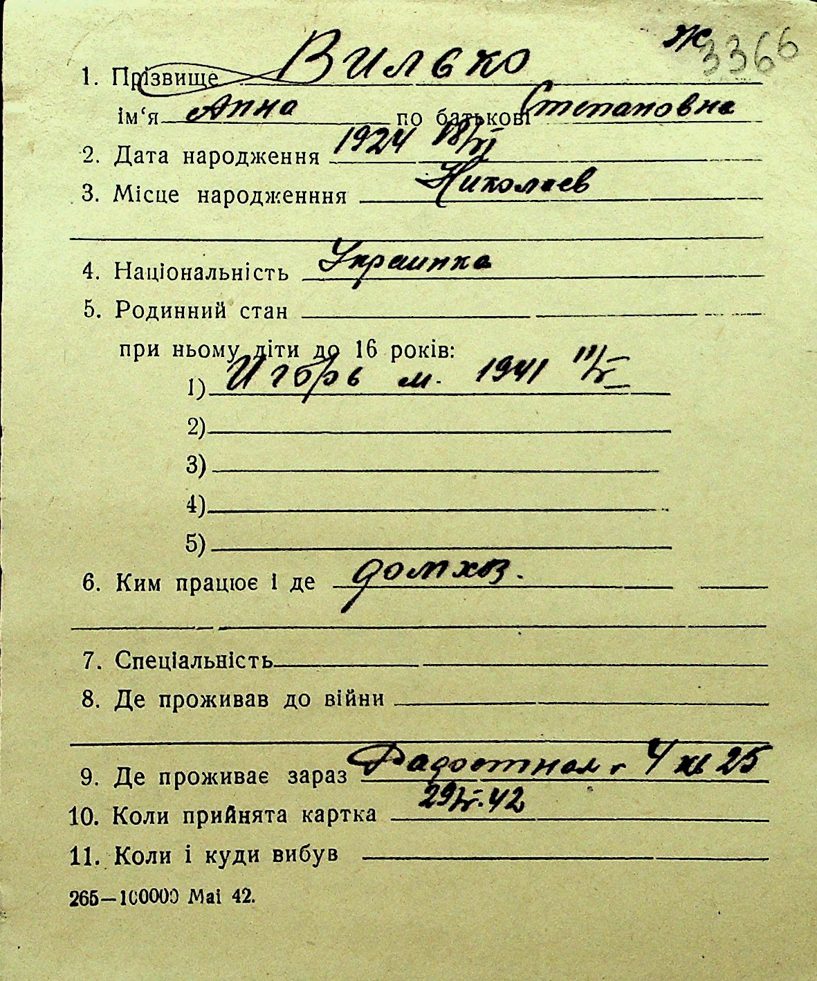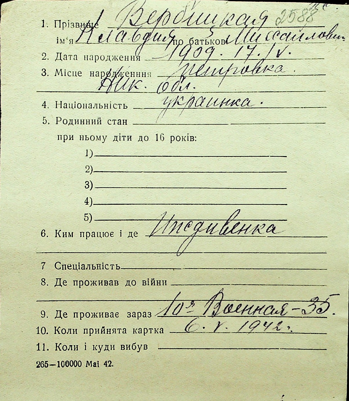 • • Перелік карток до фонду № Н-1016