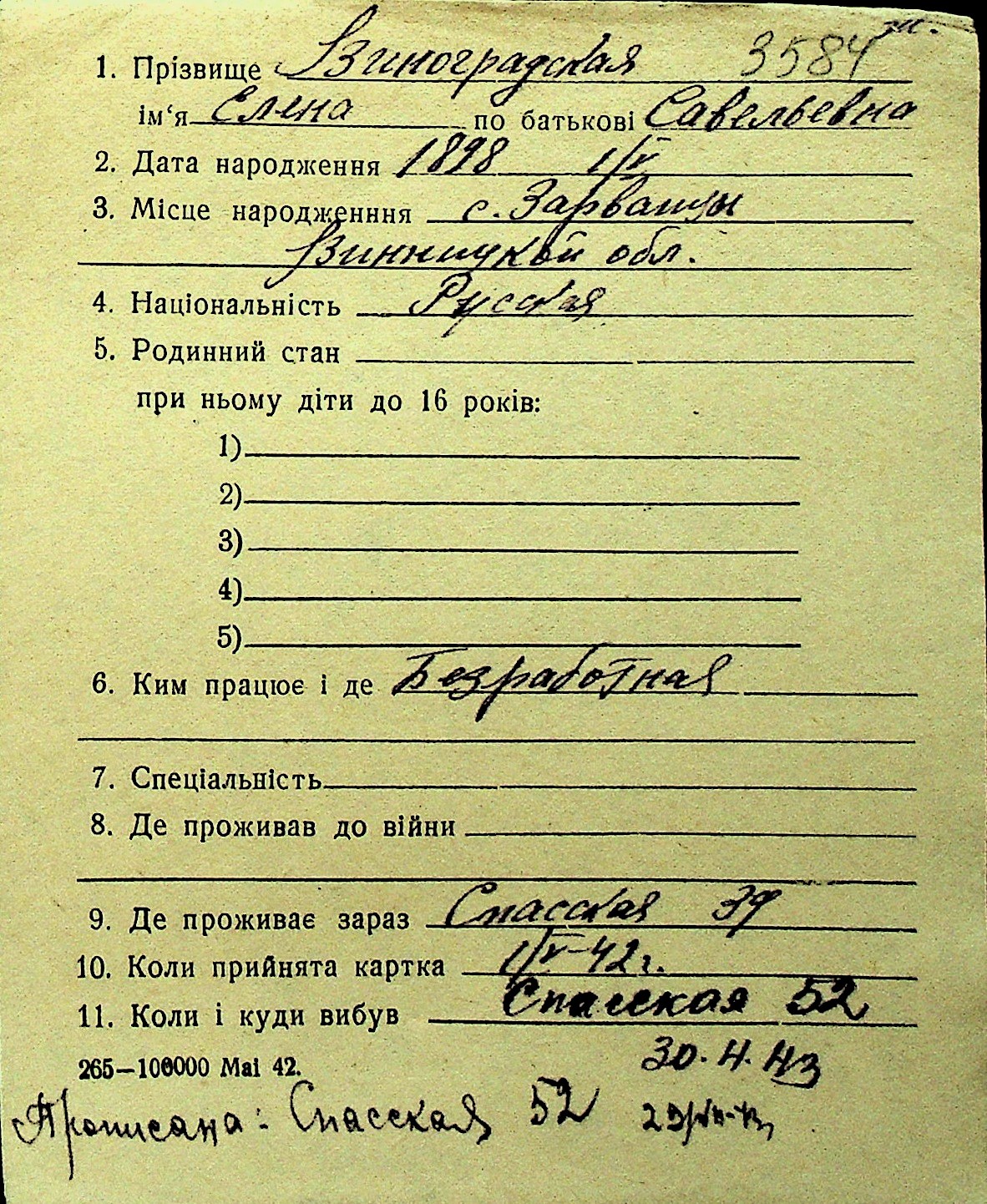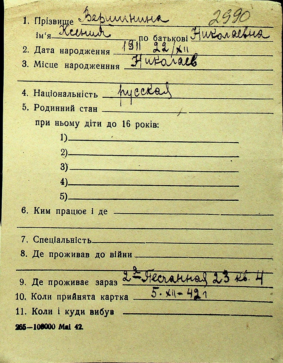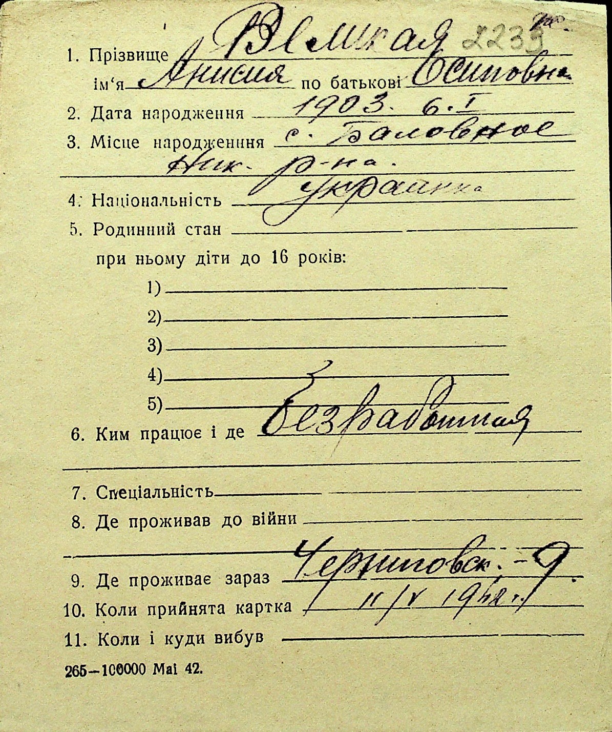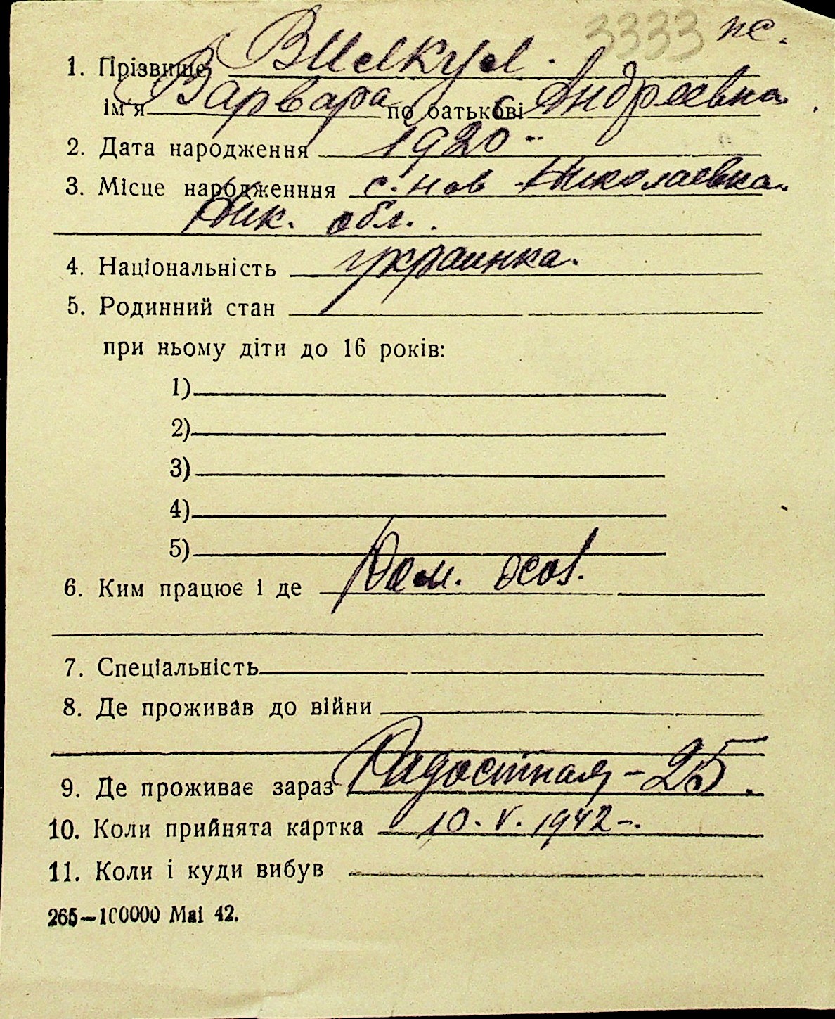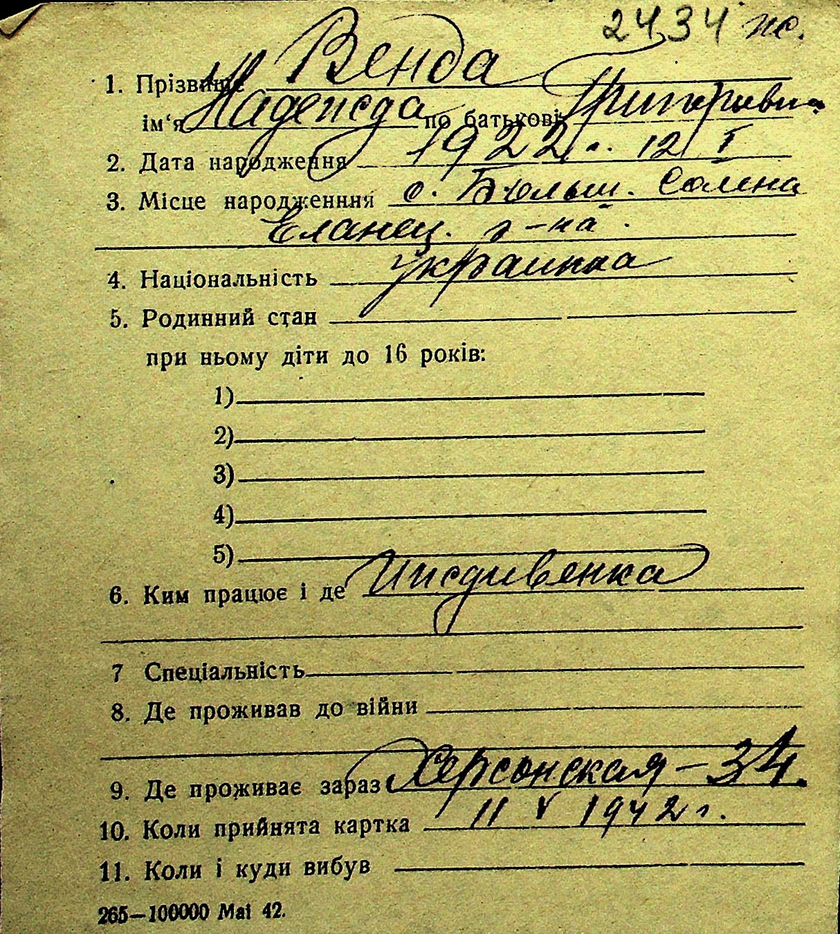 • • Перелік карток до фонду № Н-1016