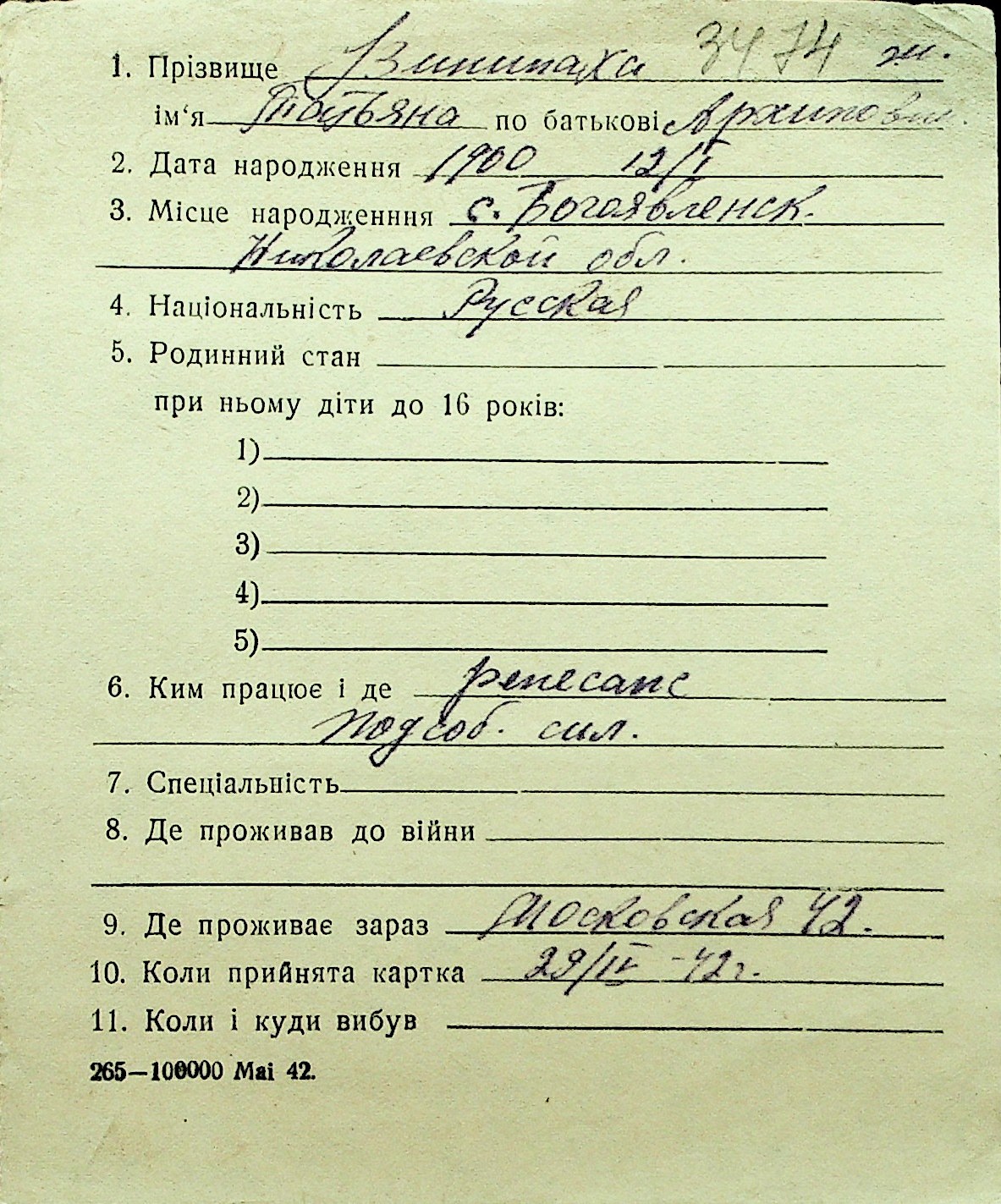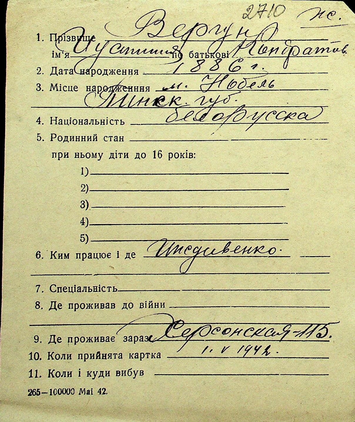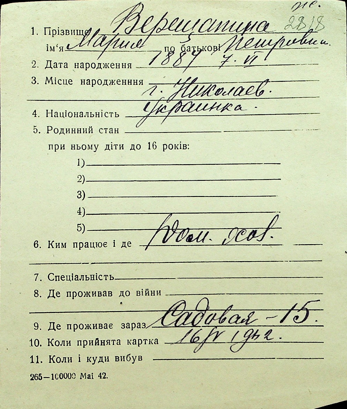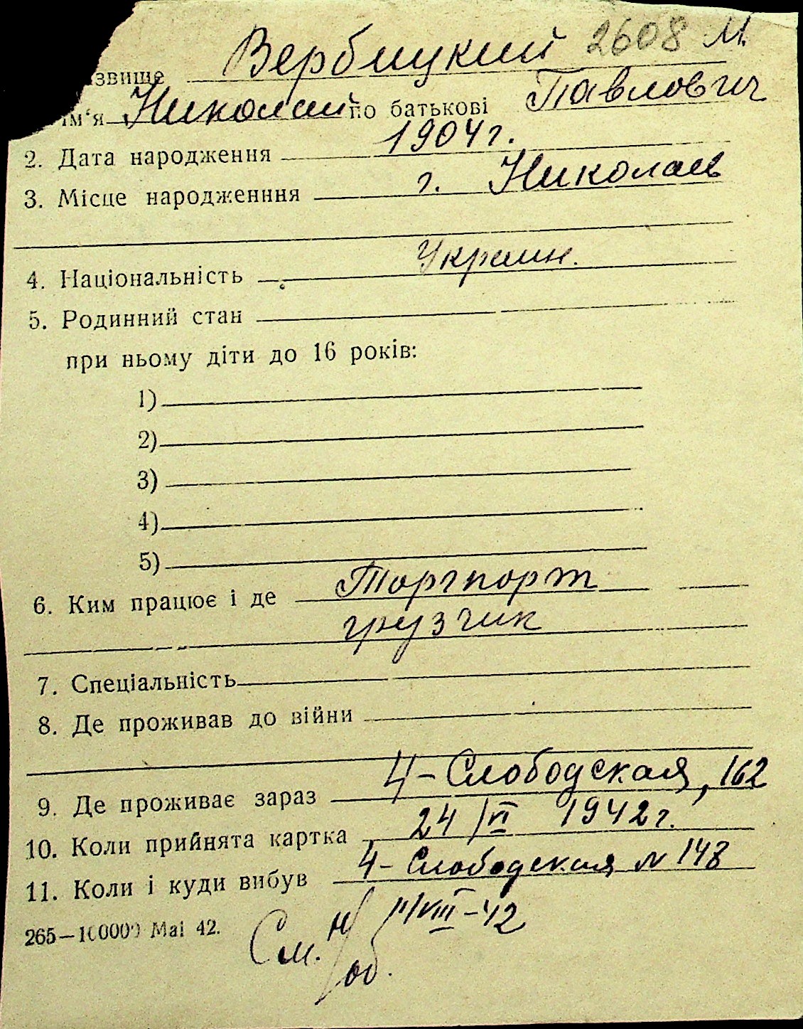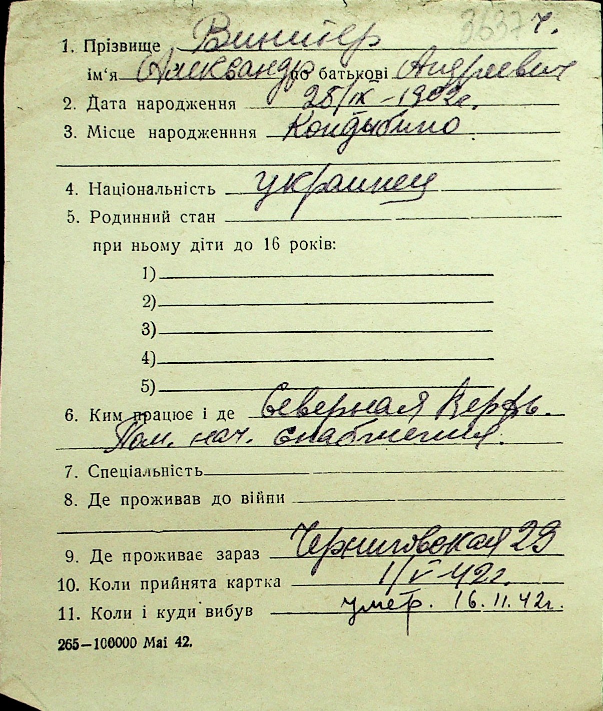 • • Перелік карток до фонду № Н-1016