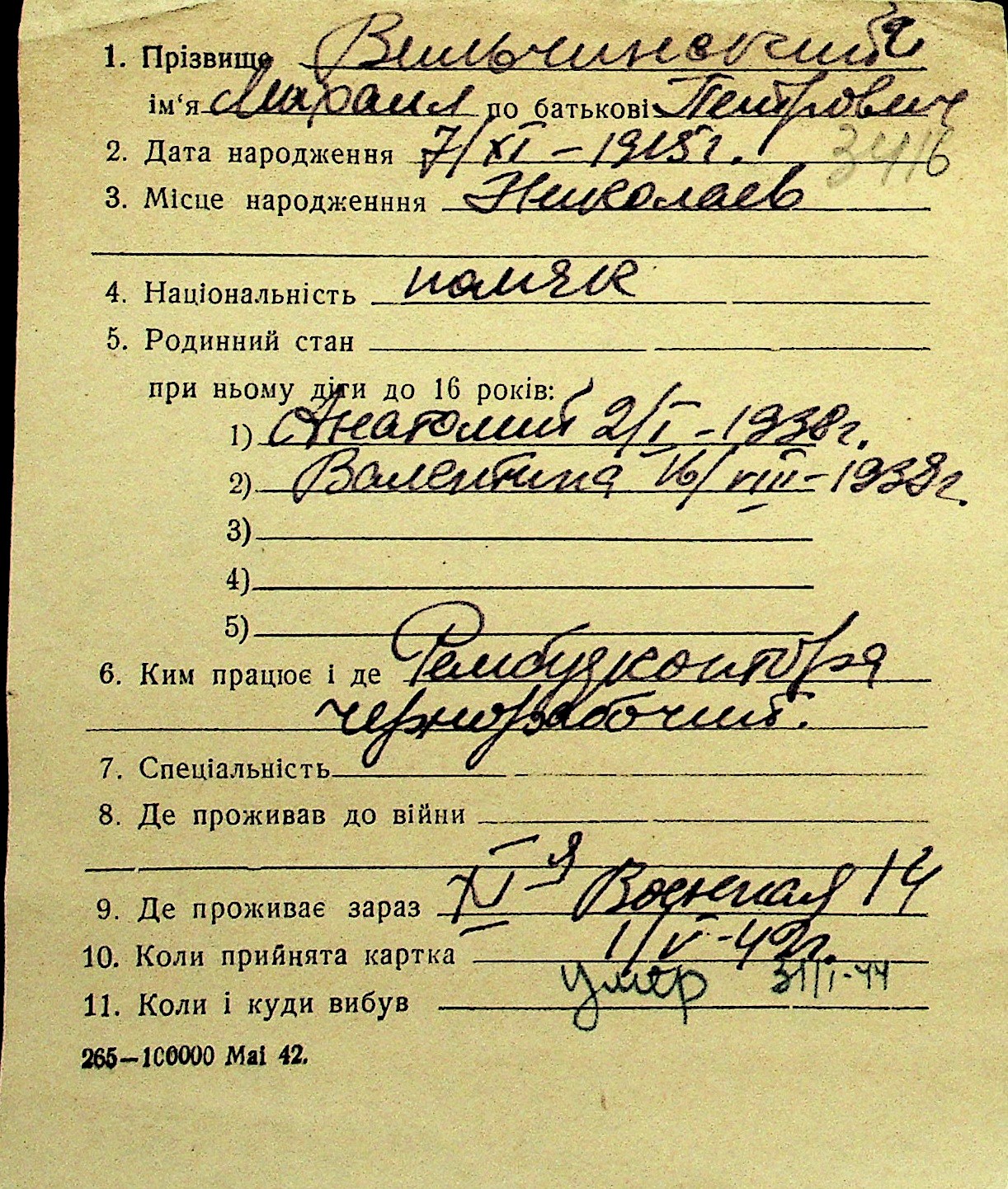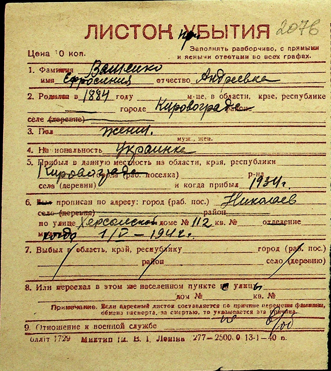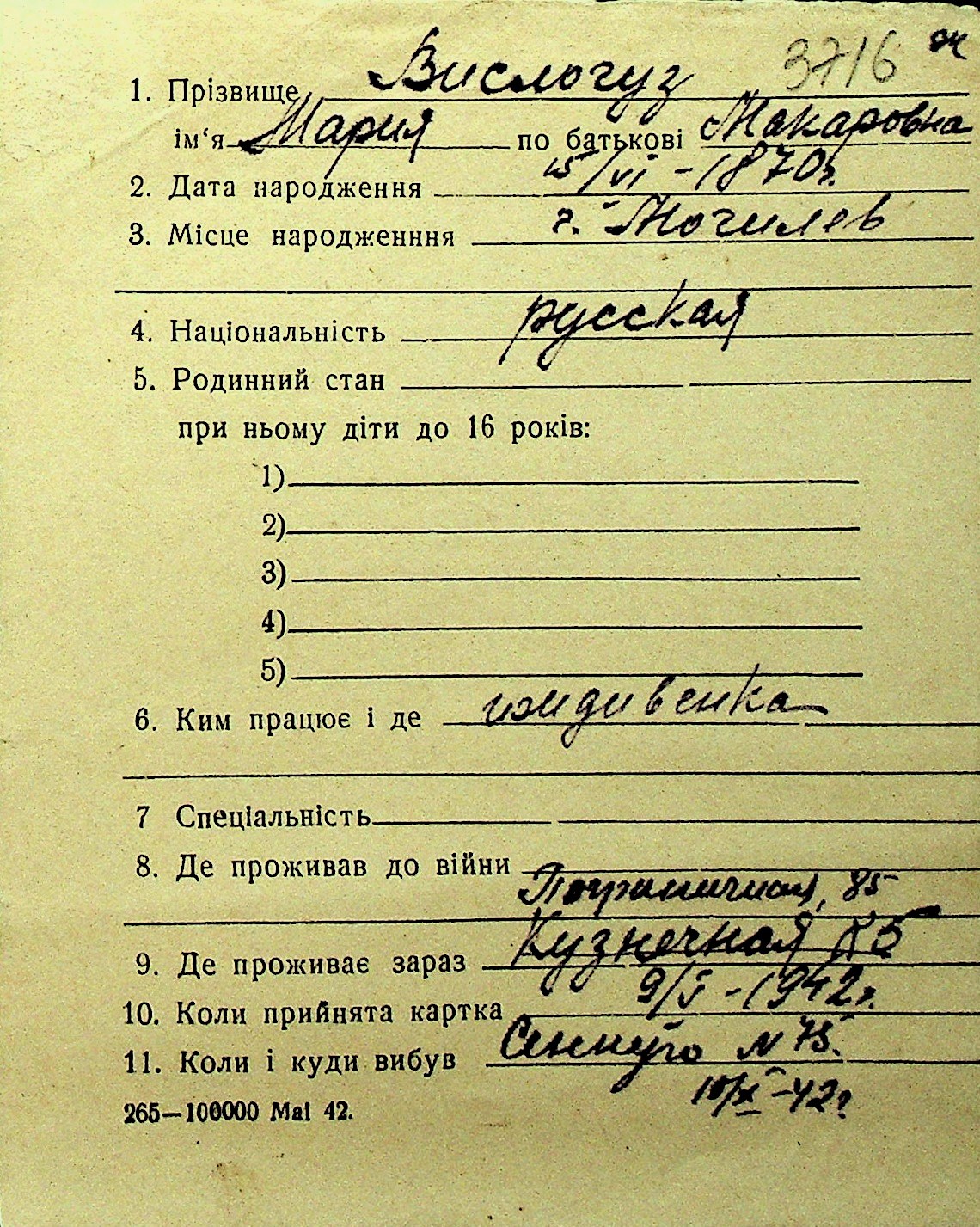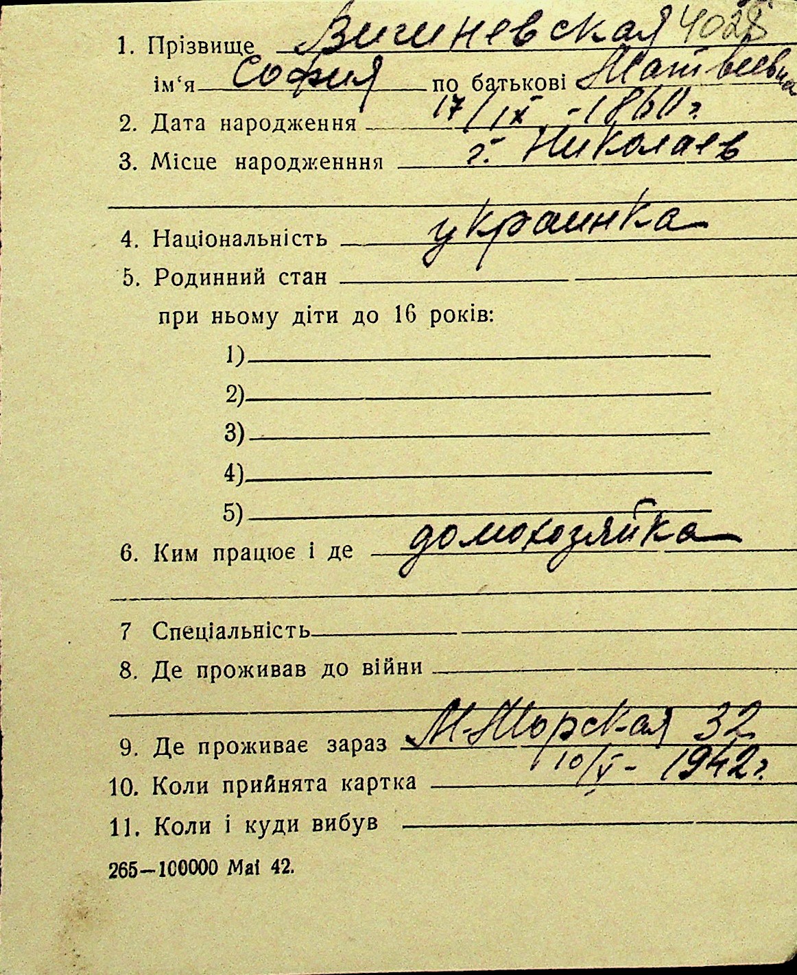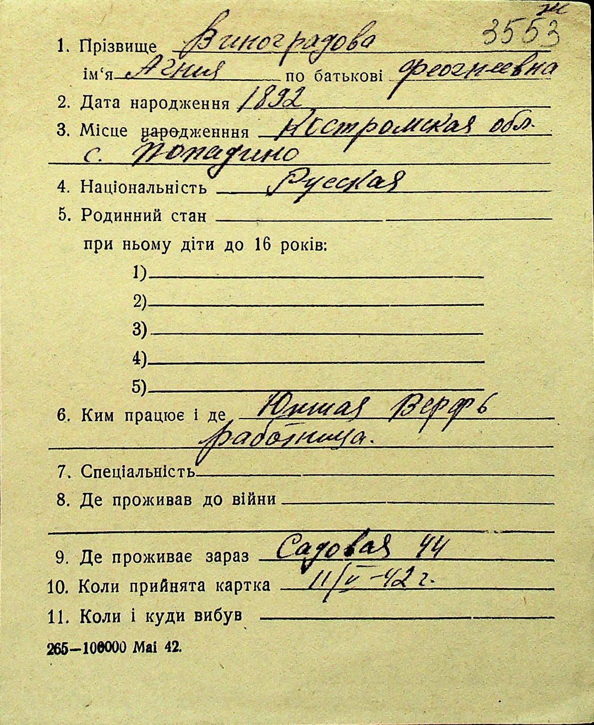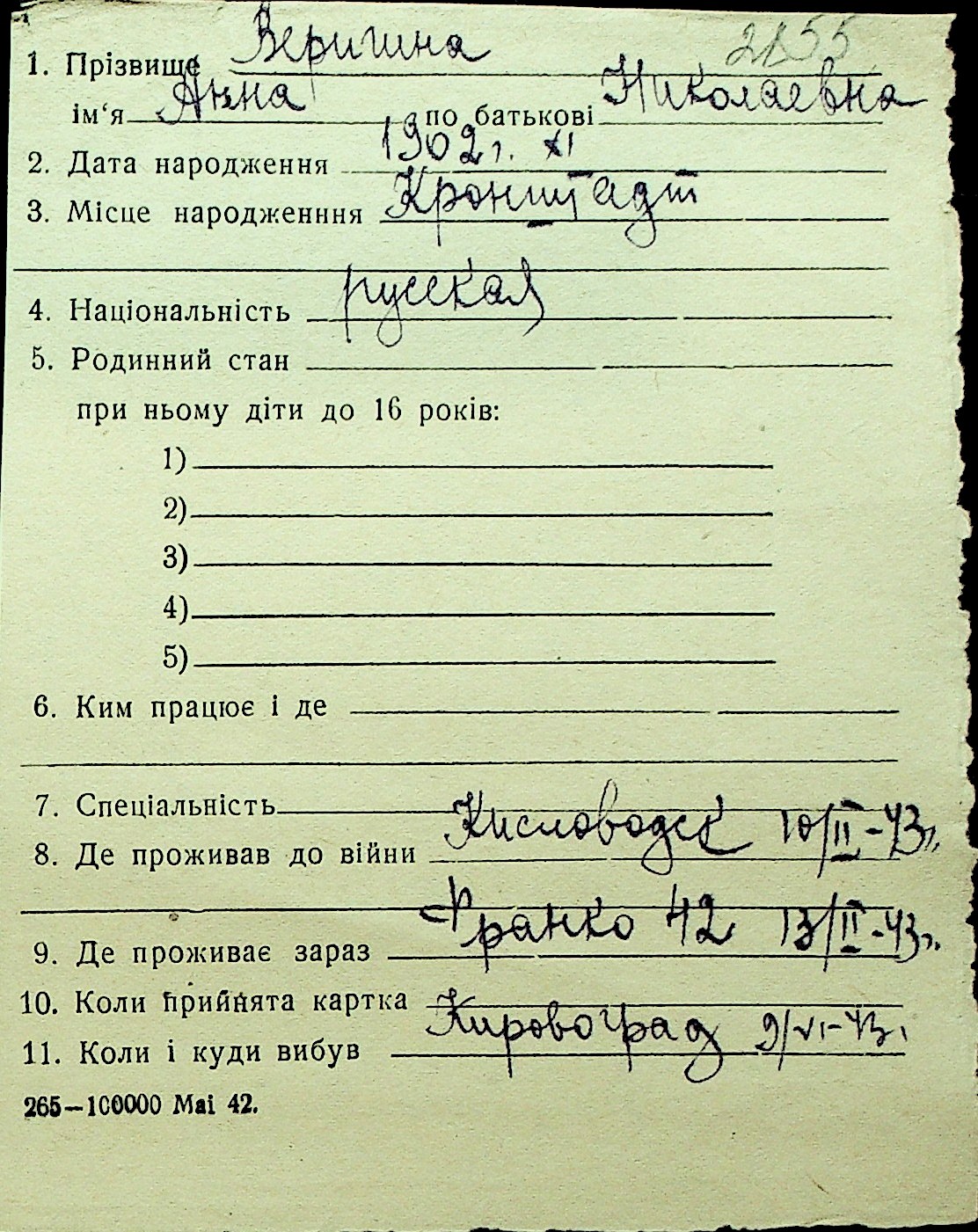 • • Перелік карток до фонду № Н-1016