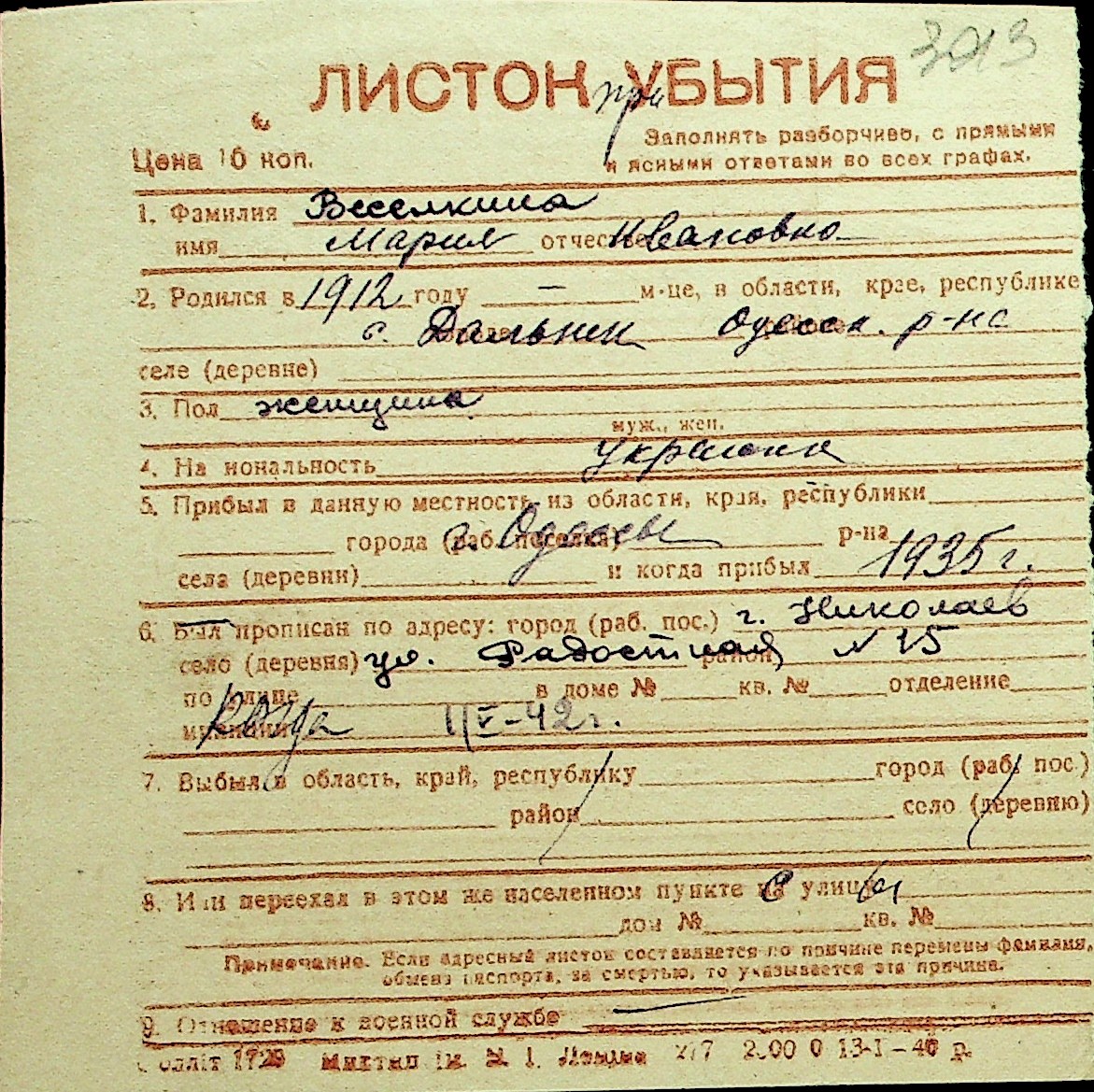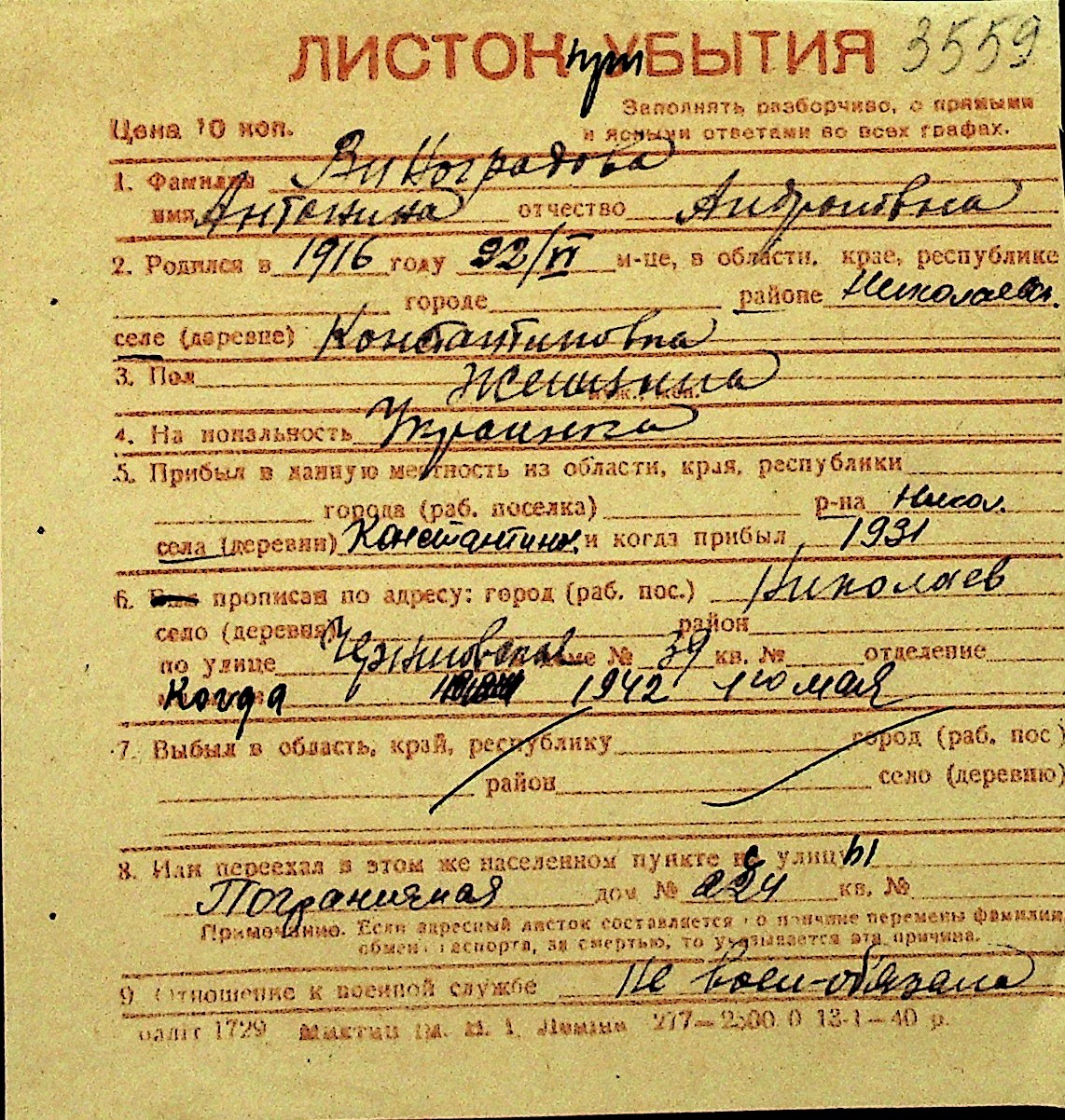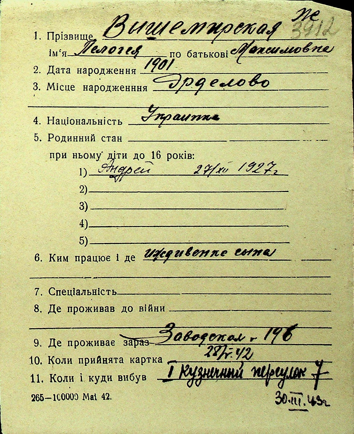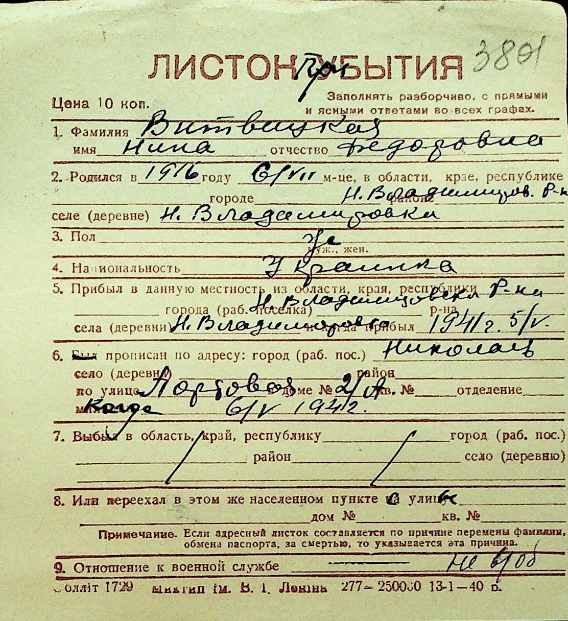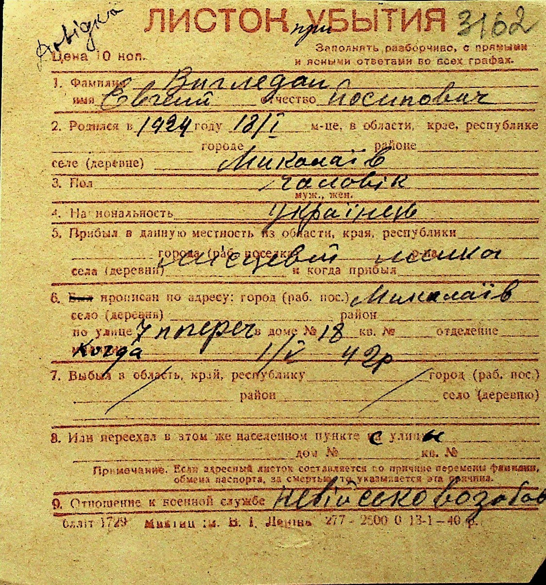 • • Перелік карток до фонду № Н-1016