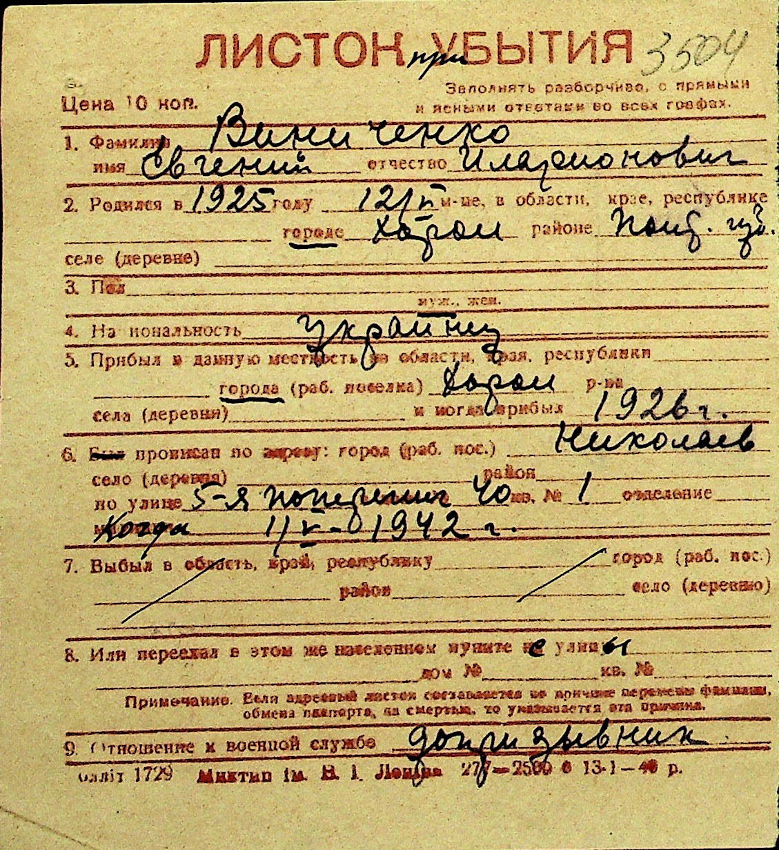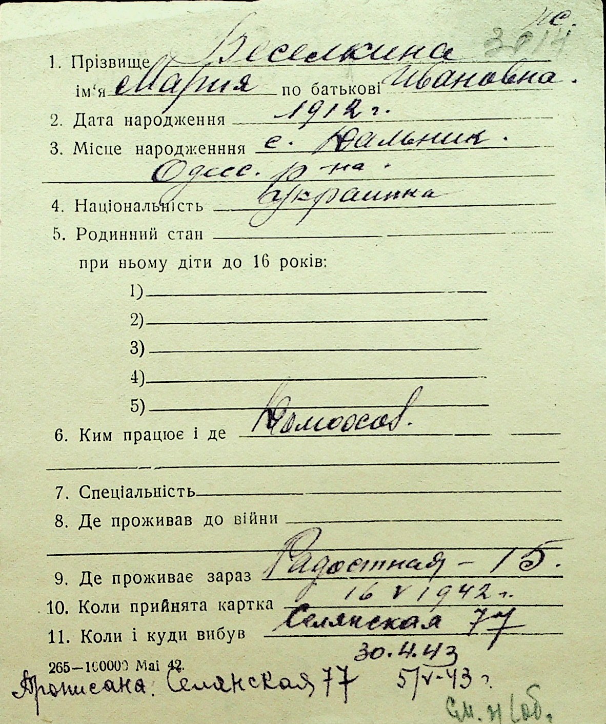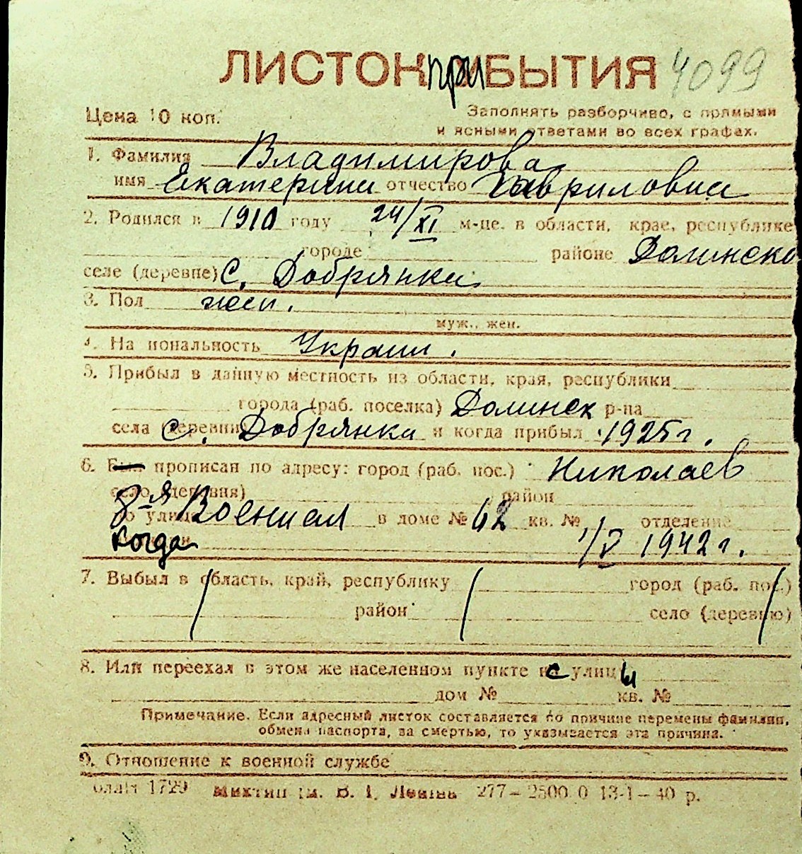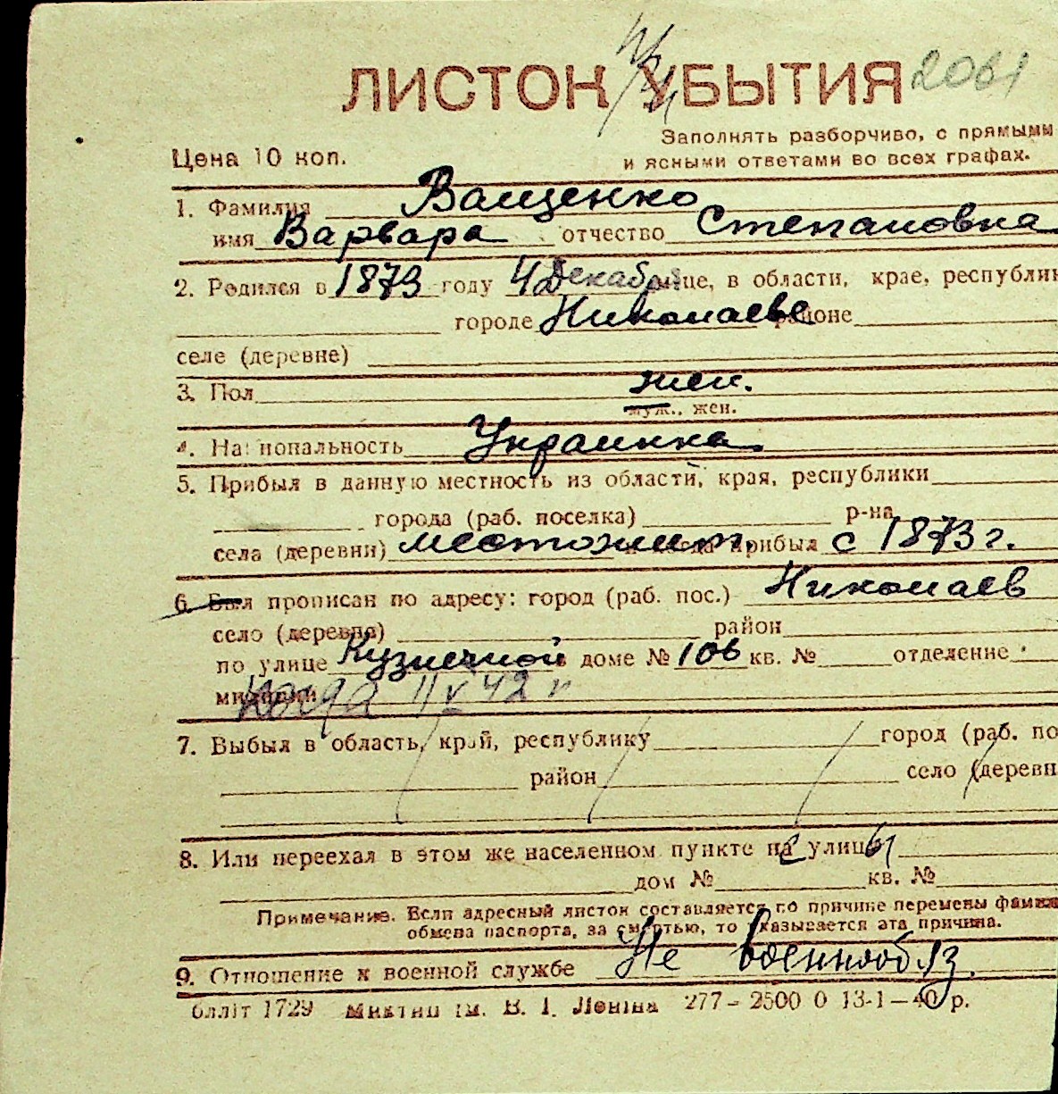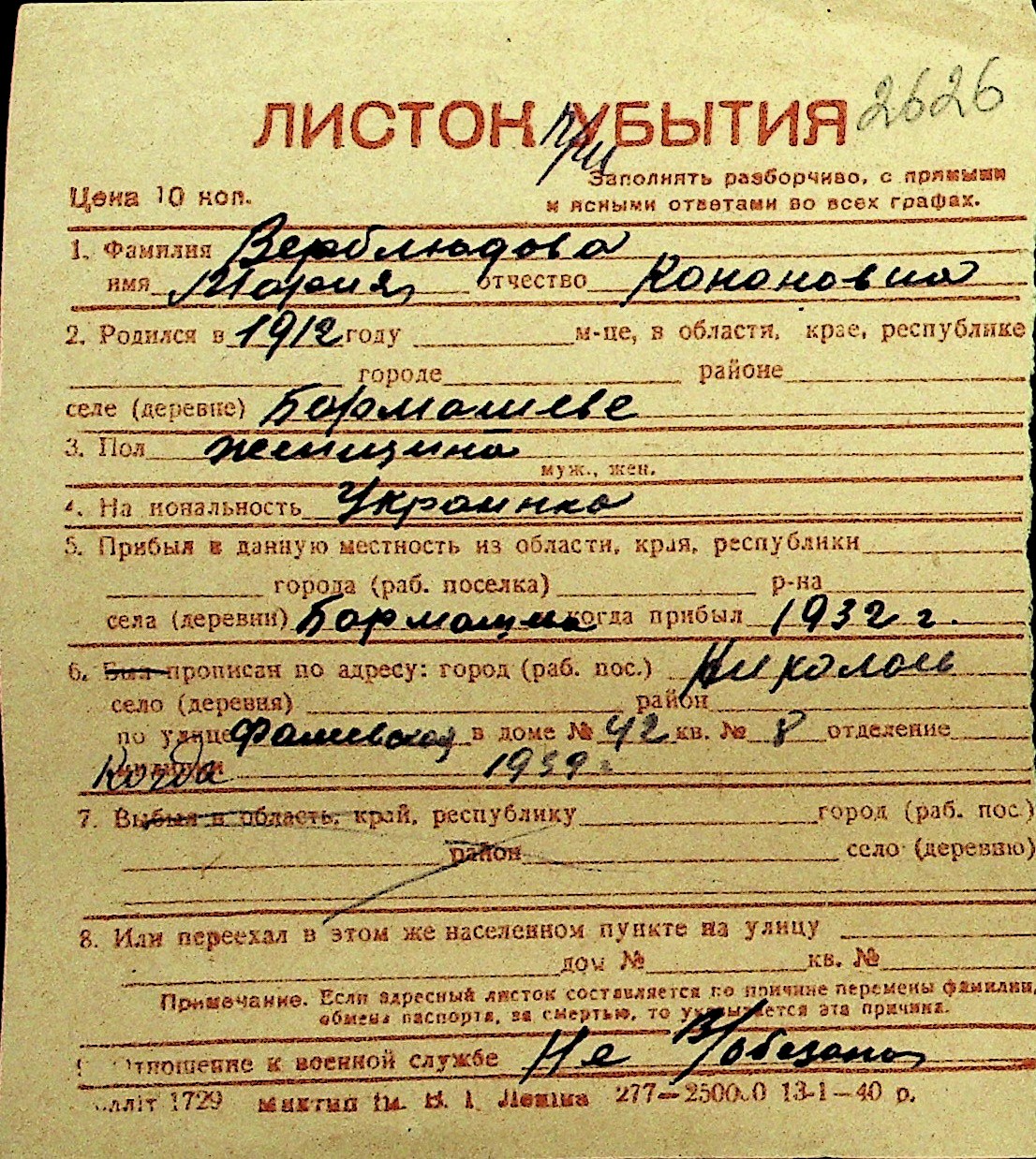 • • Перелік карток до фонду № Н-1016