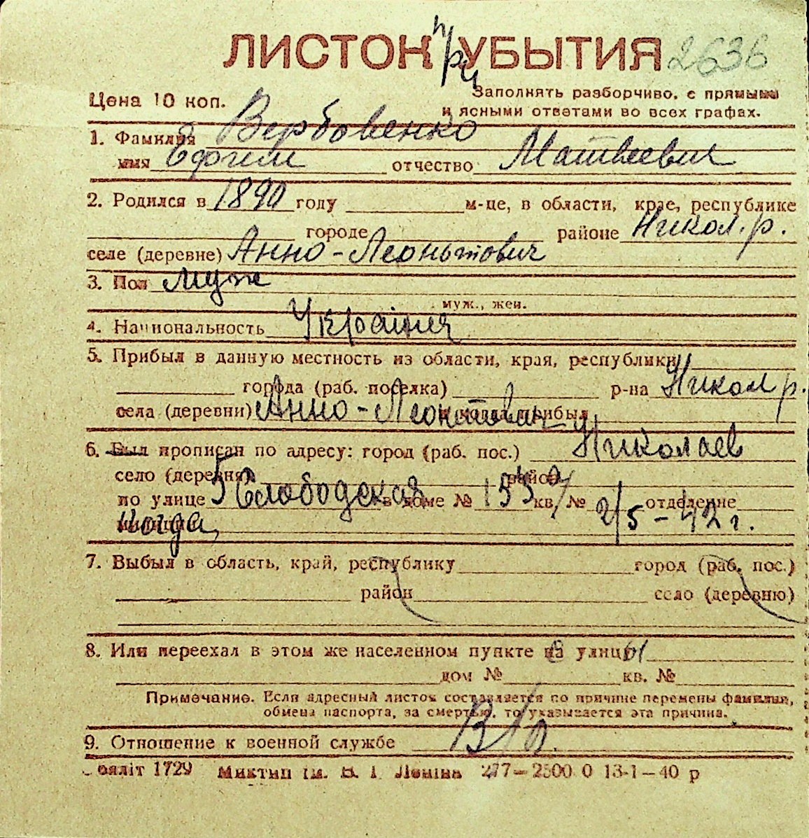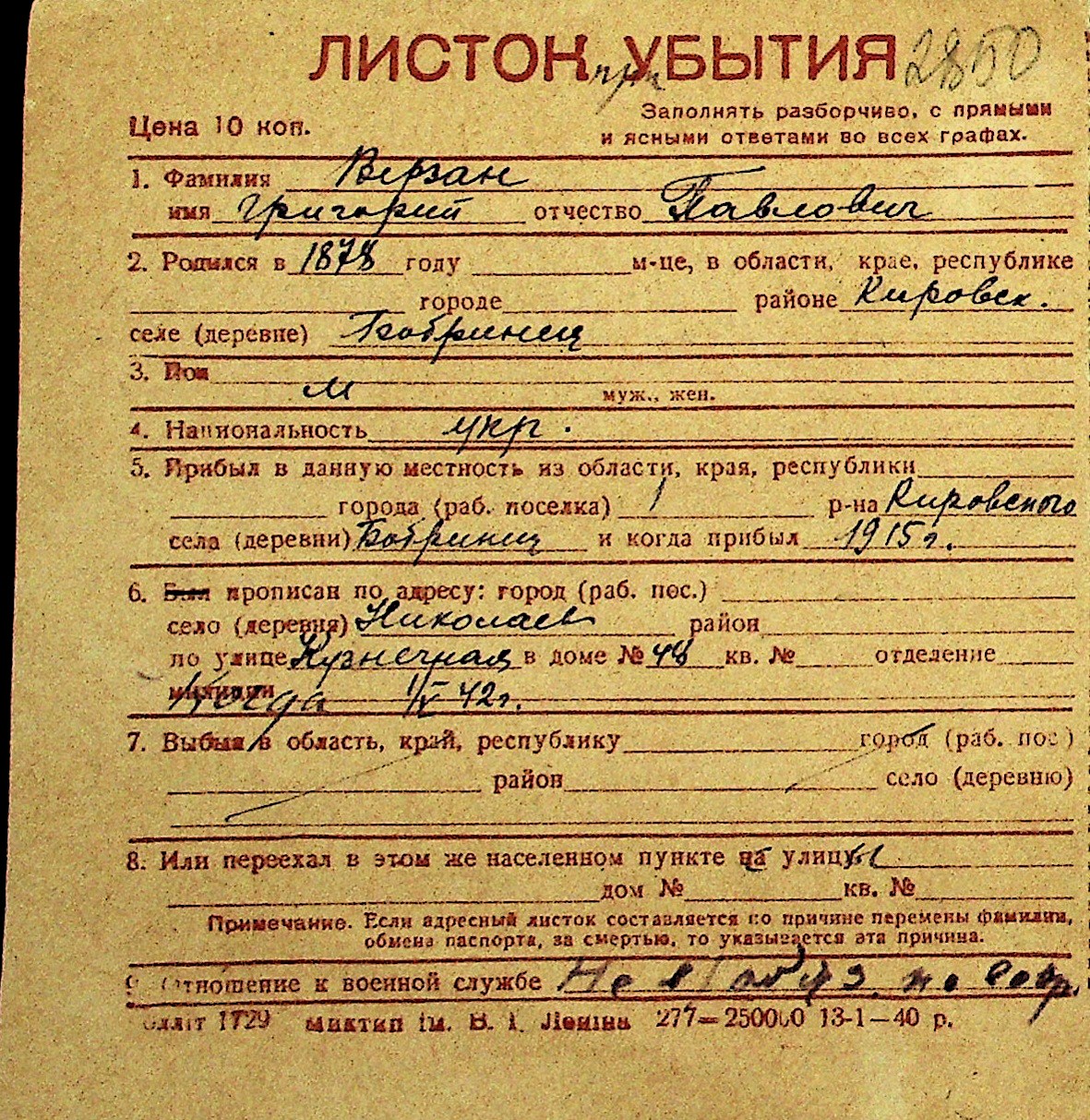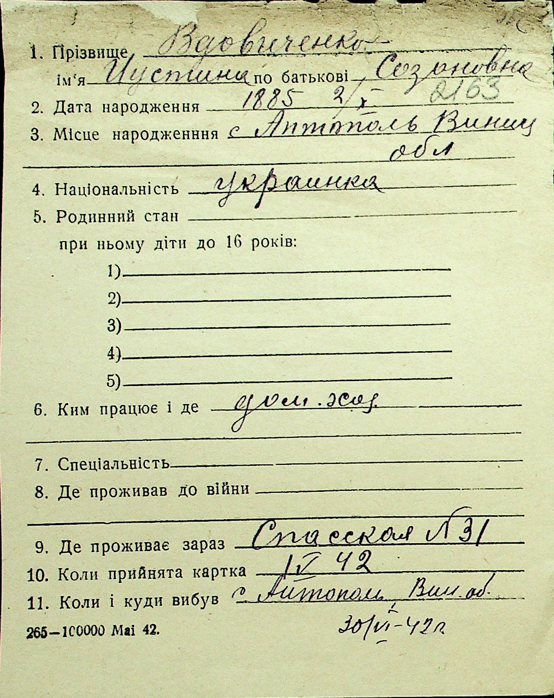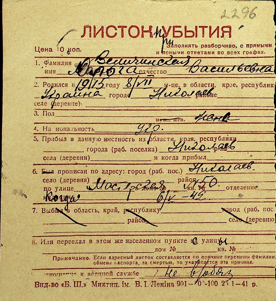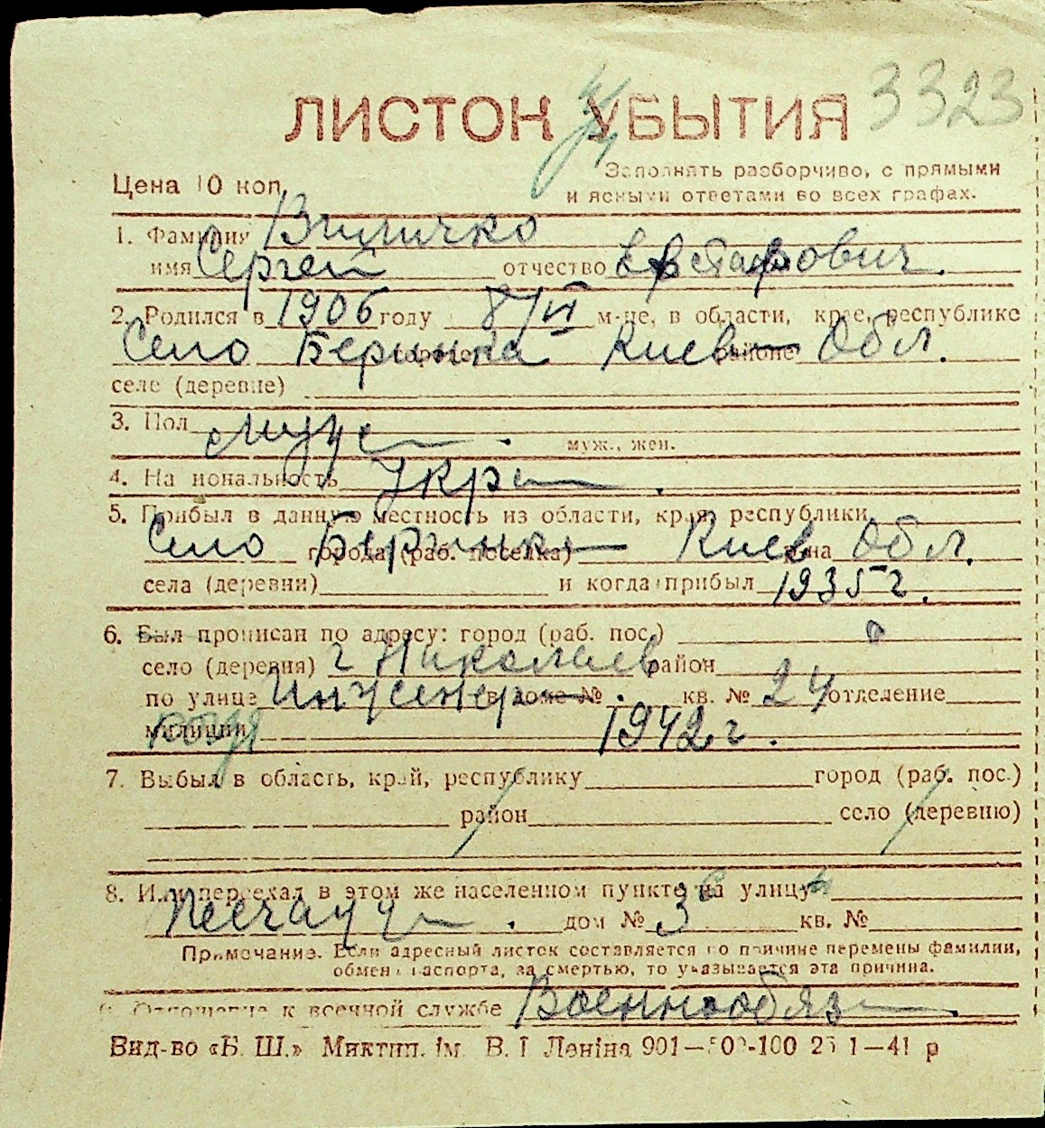 • • Перелік карток до фонду № Н-1016