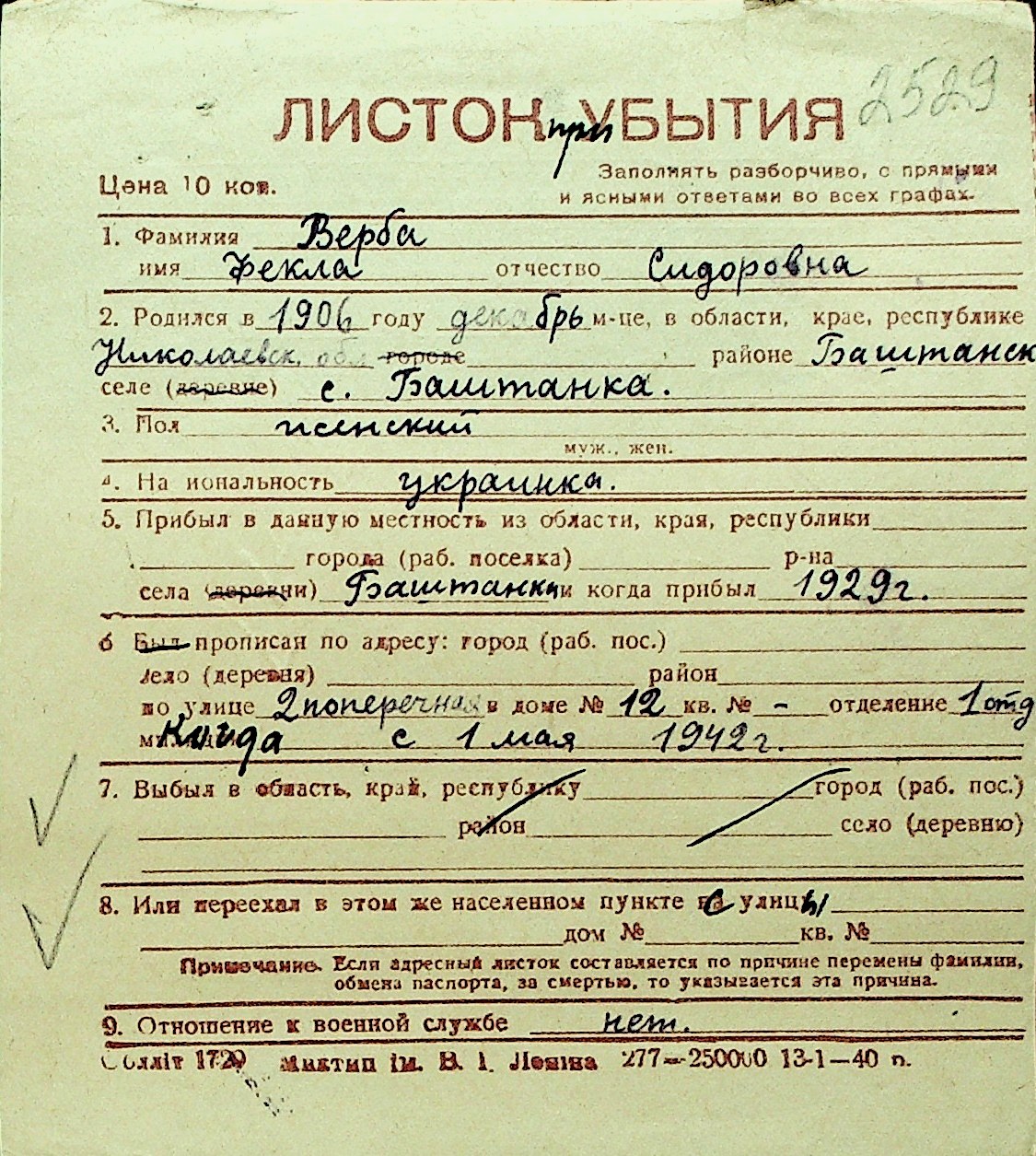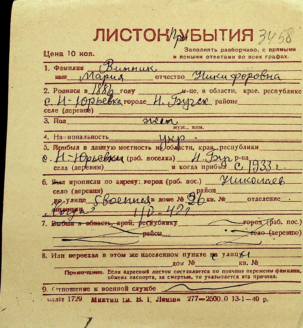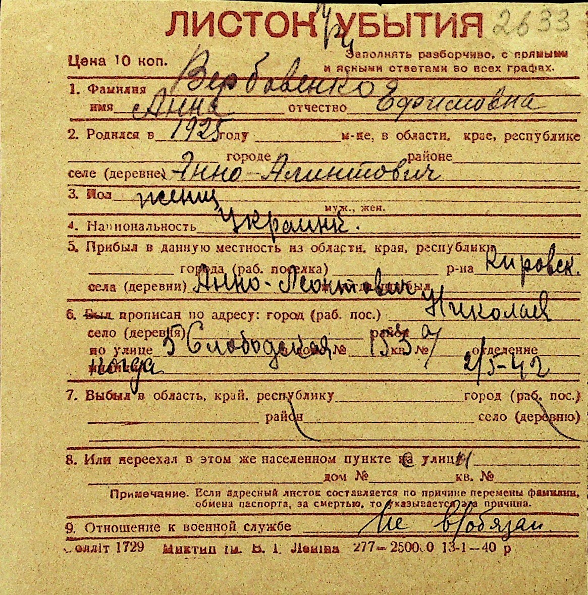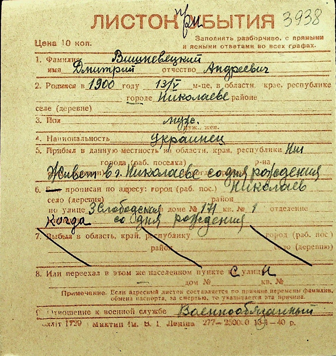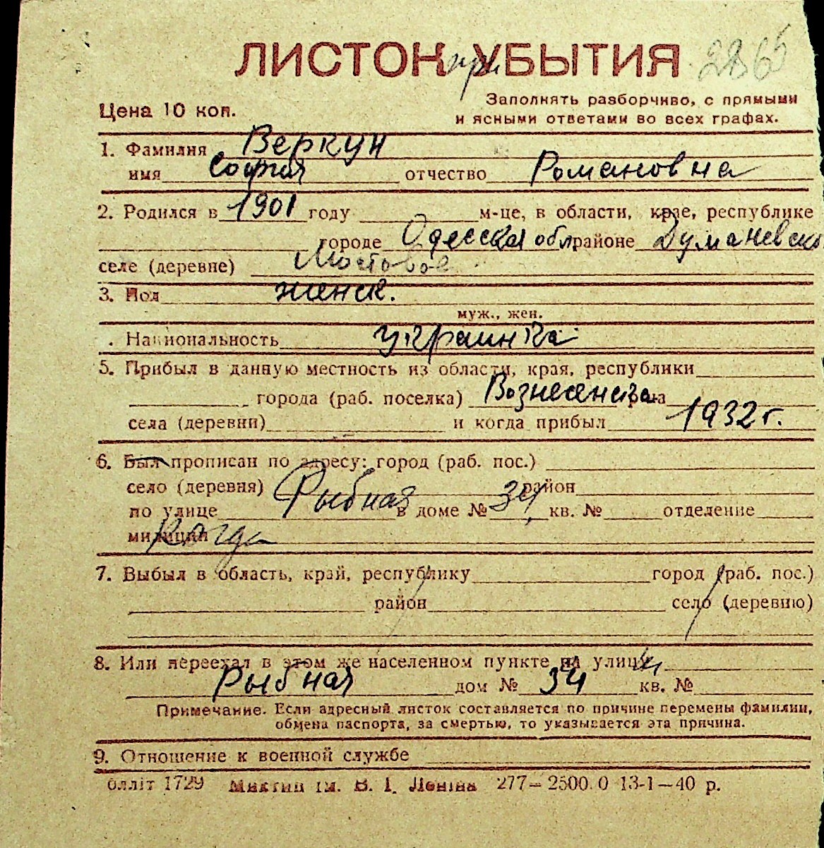 • • Перелік карток до фонду № Н-1016