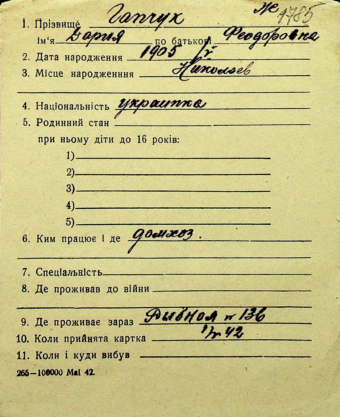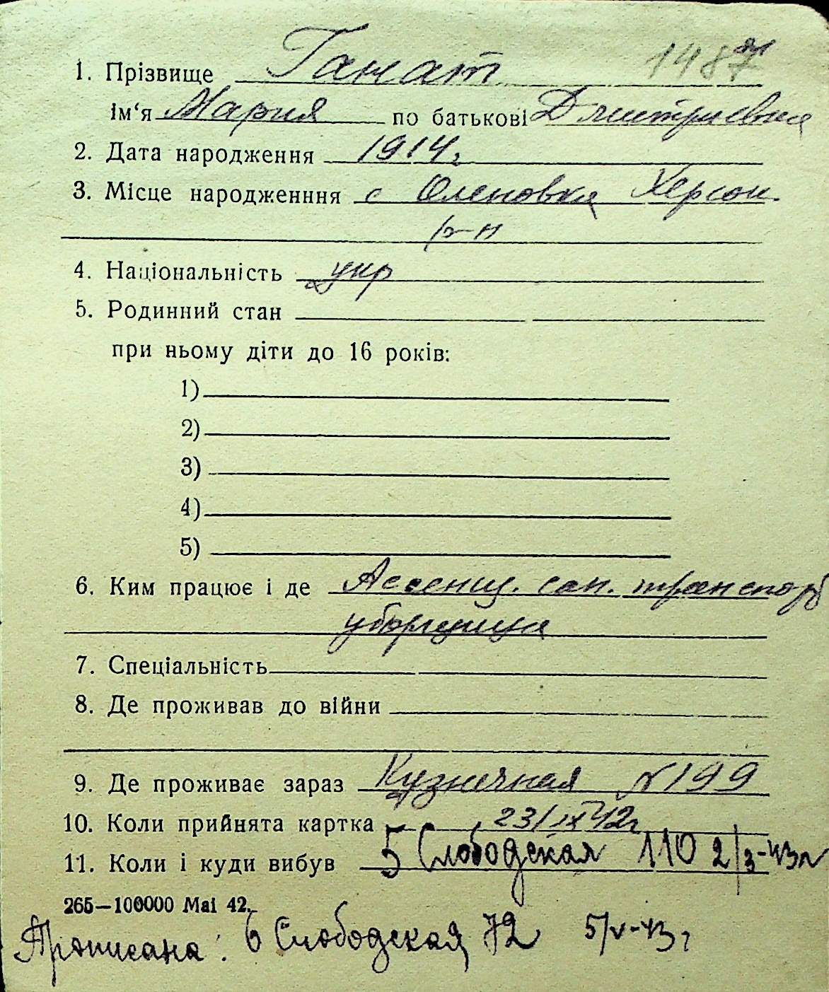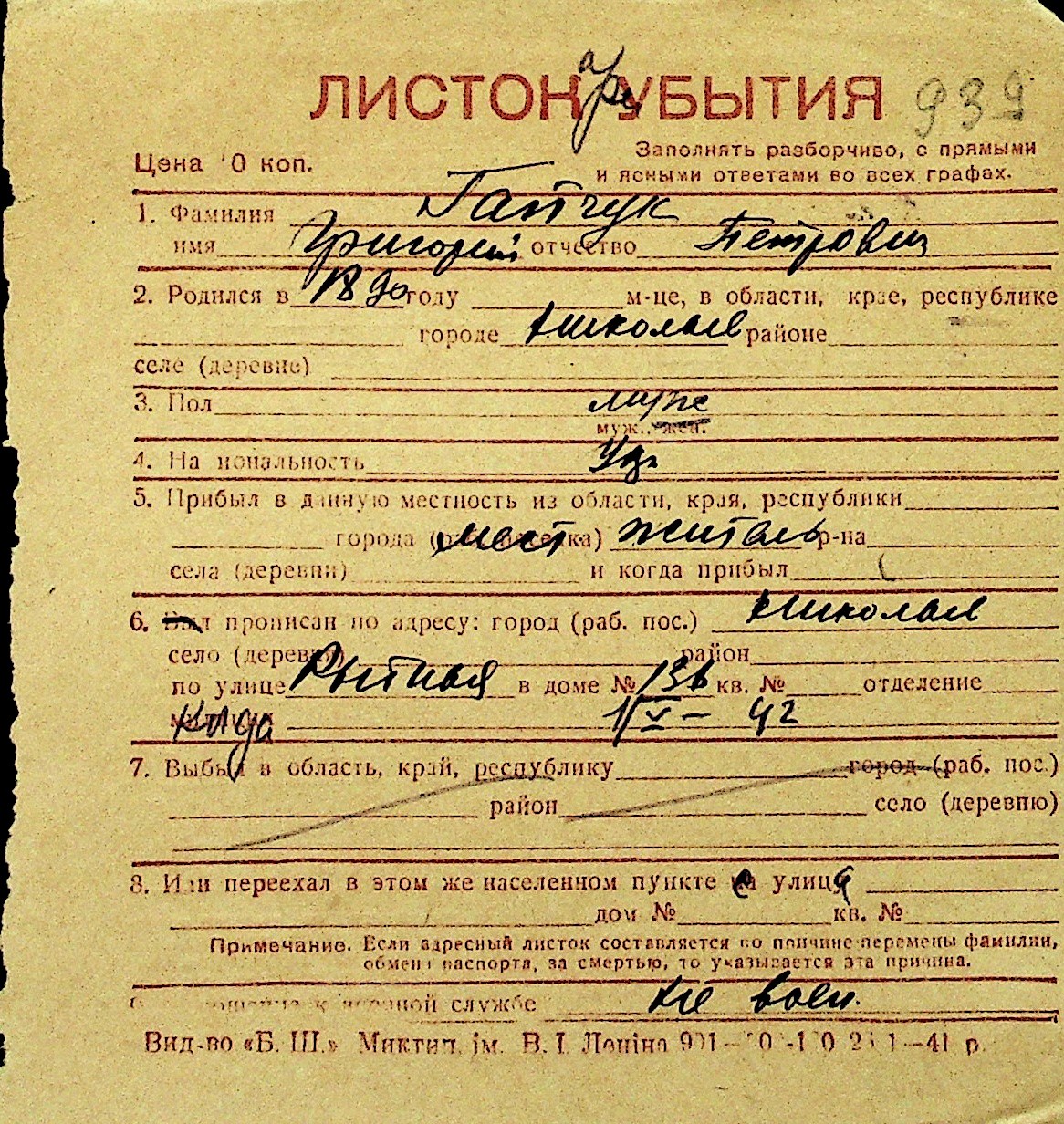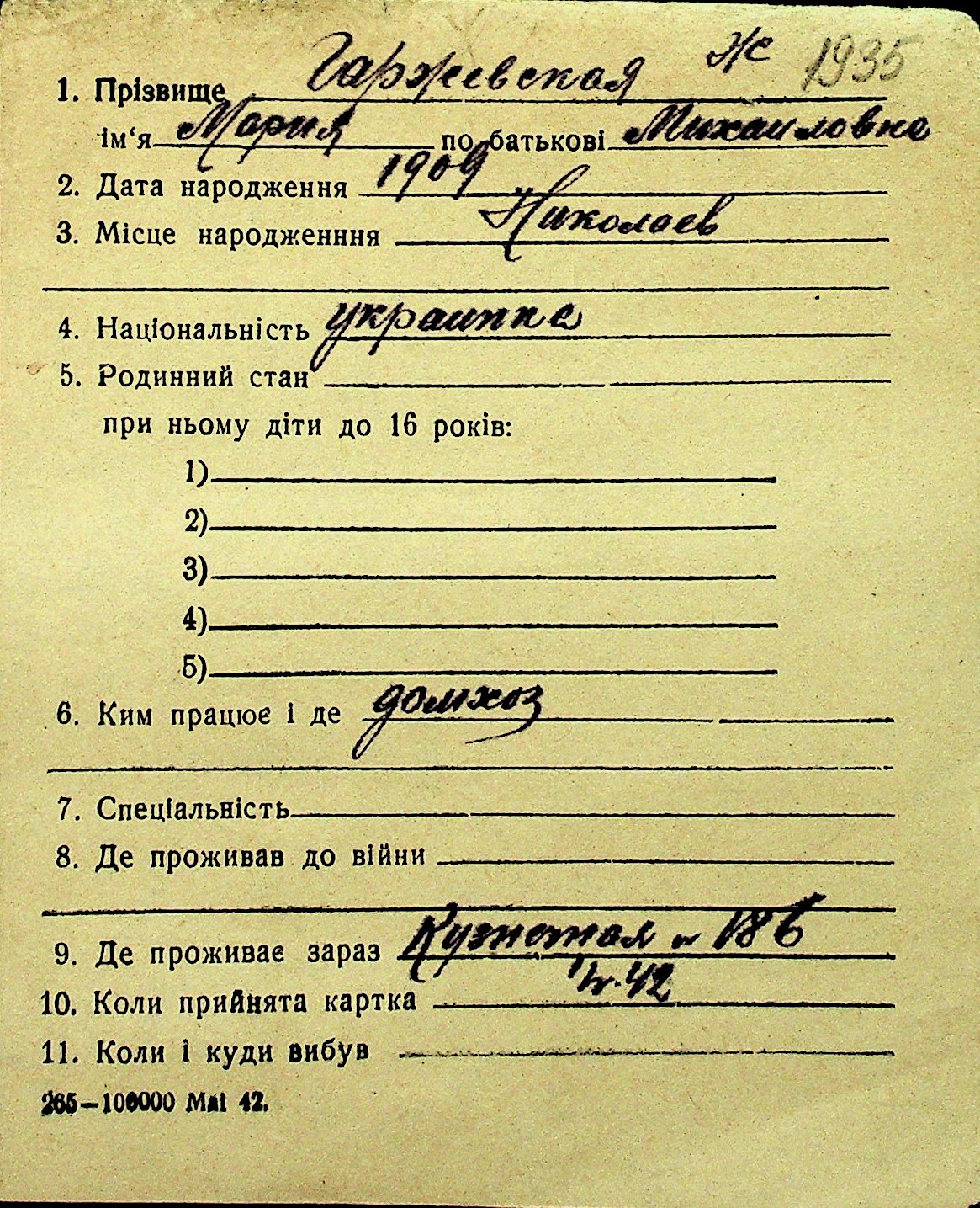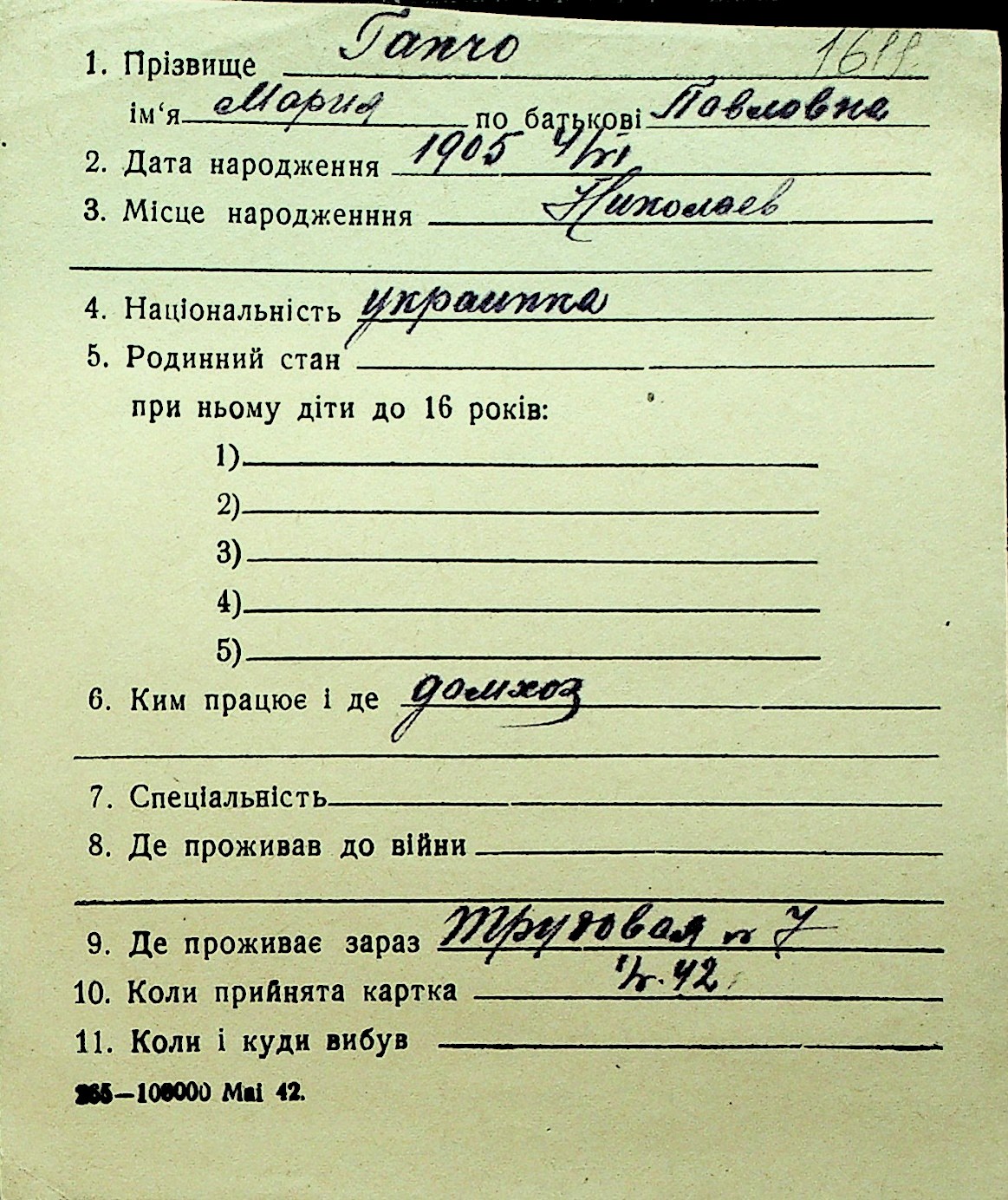 • • Перелік карток до фонду № Н-1016