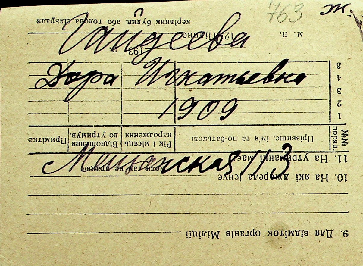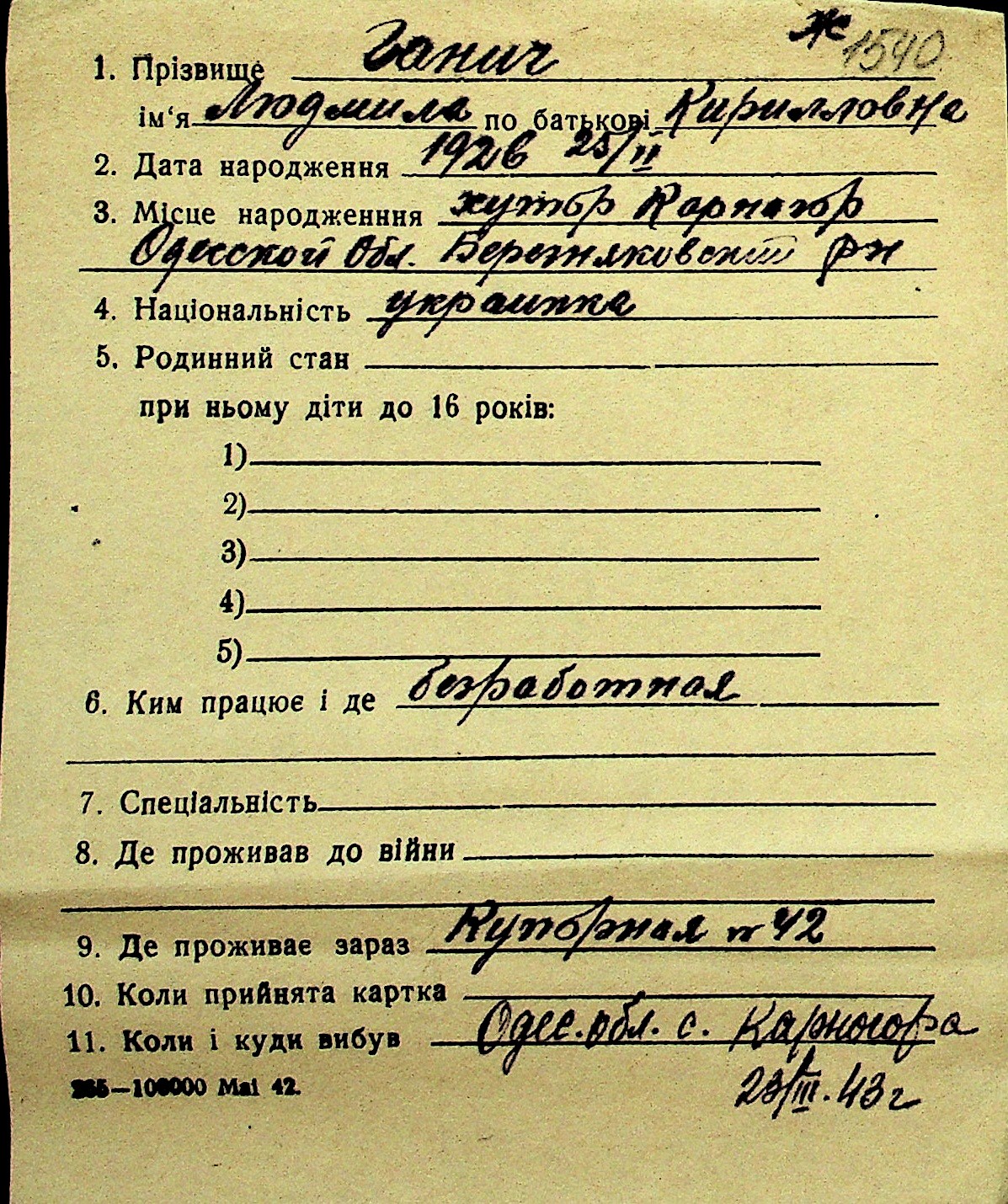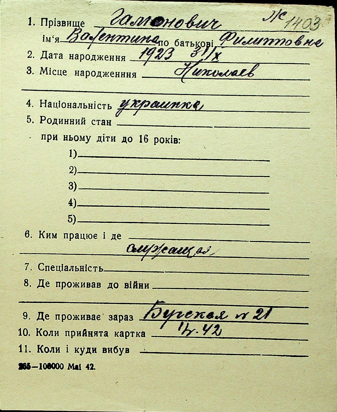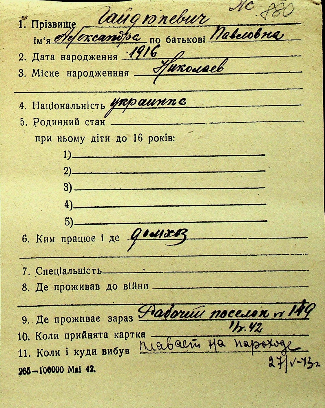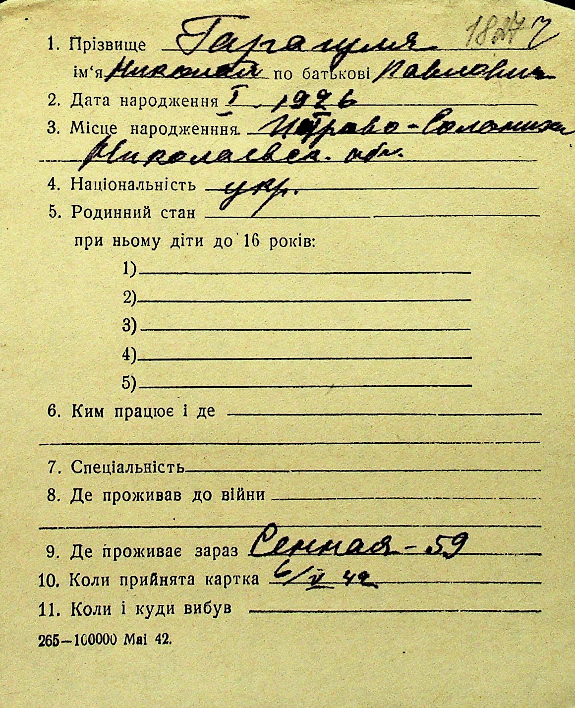 • • Перелік карток до фонду № Н-1016