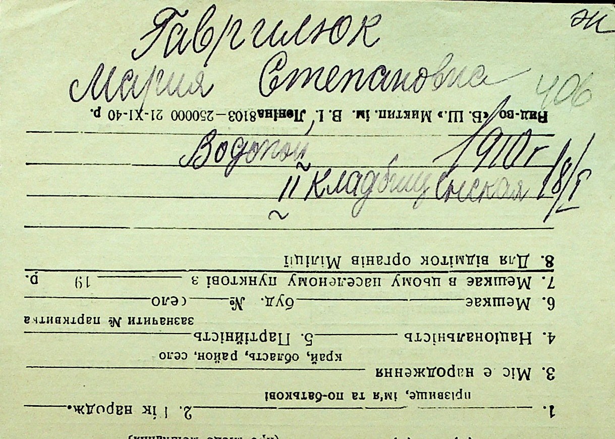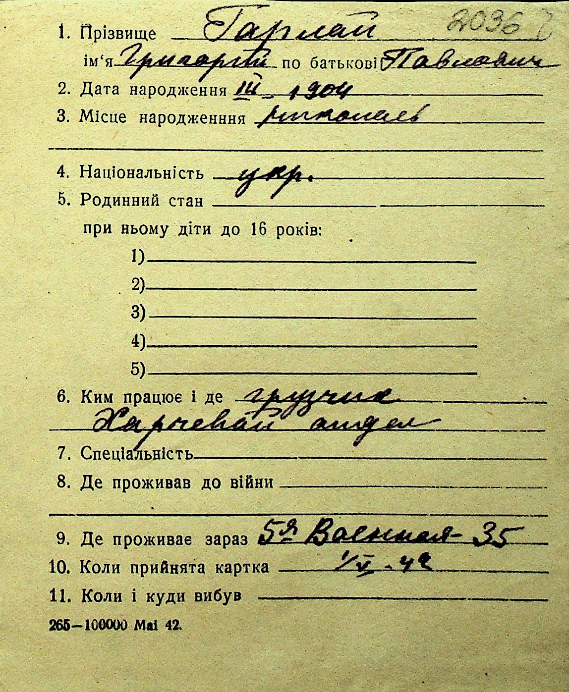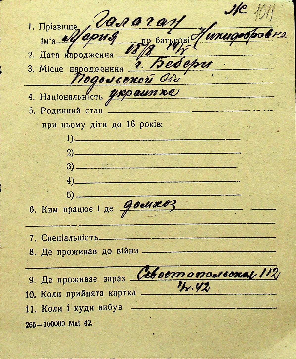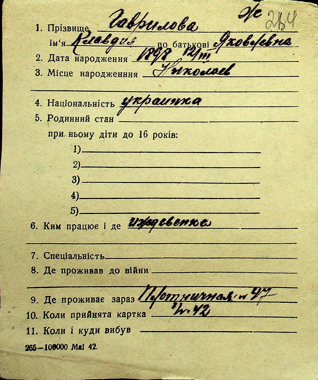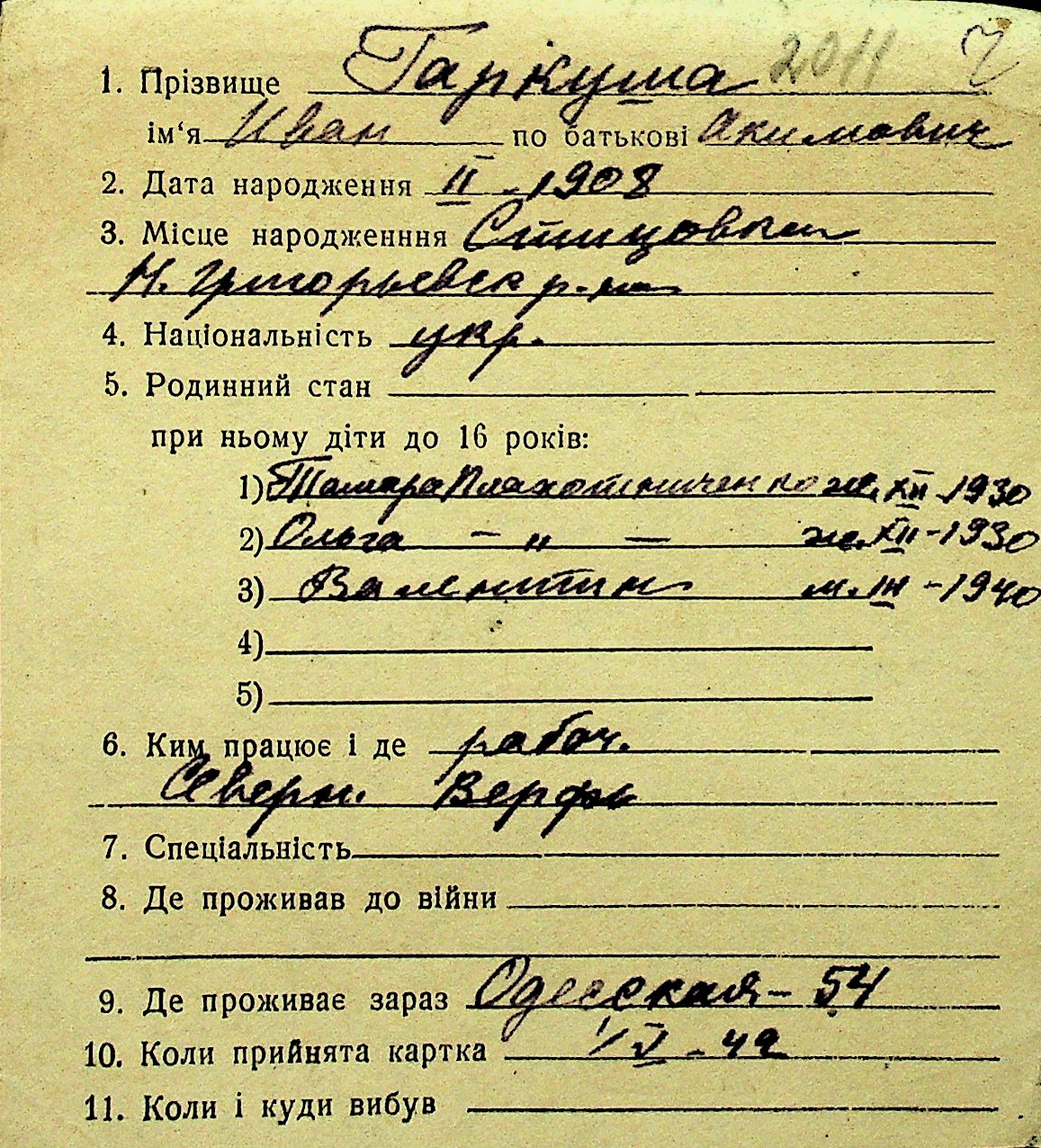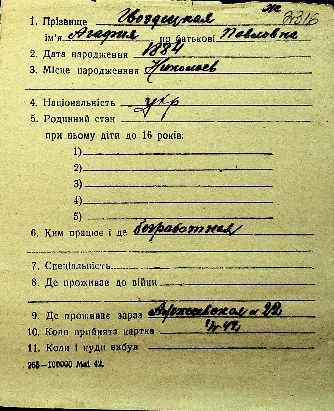• • Перелік карток до фонду № Н-1016