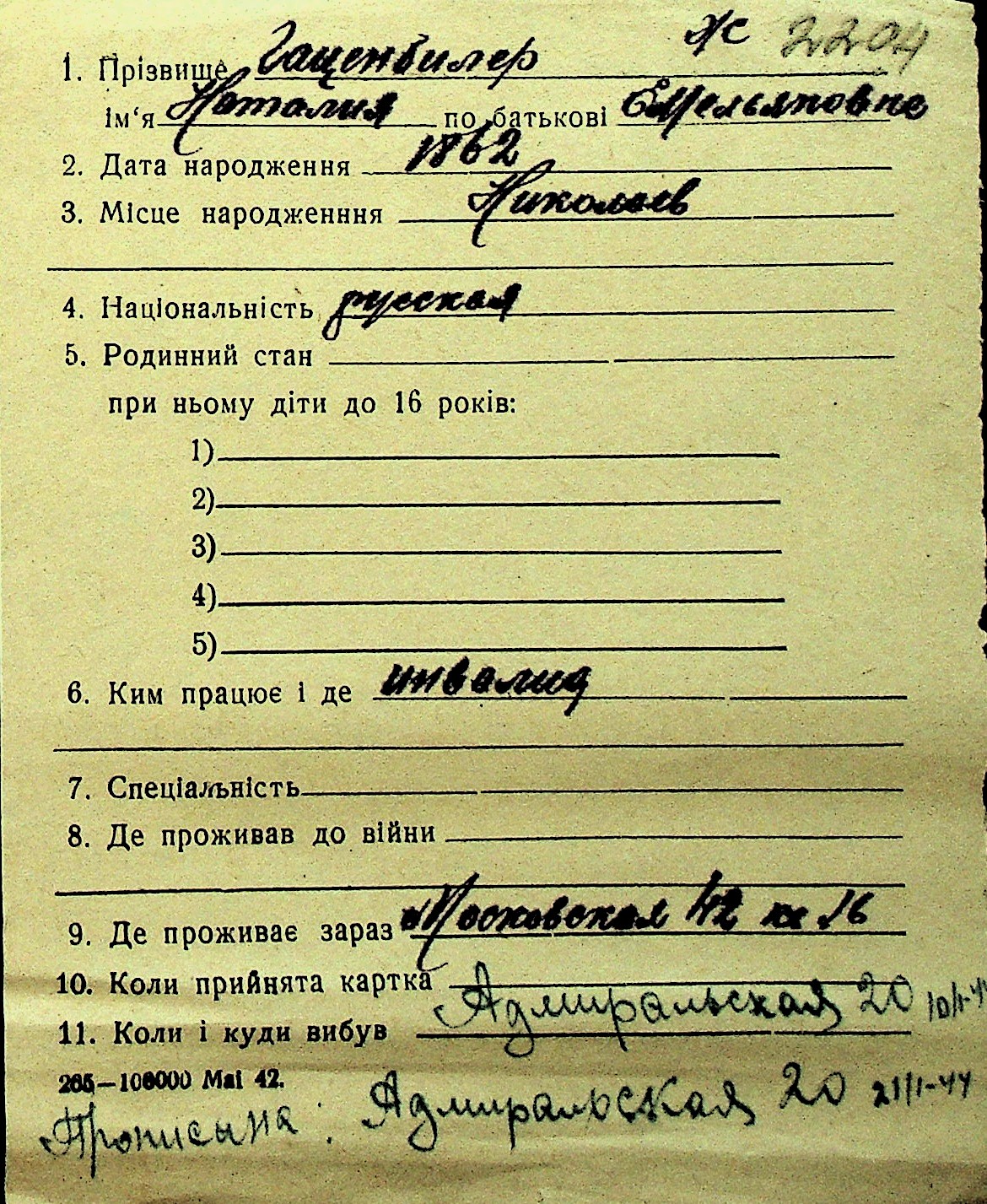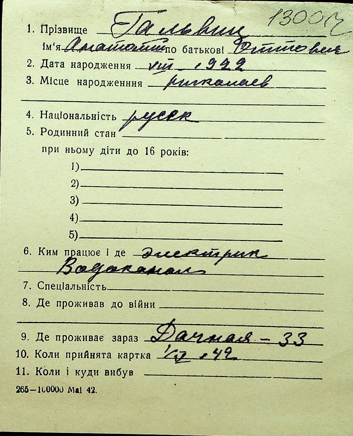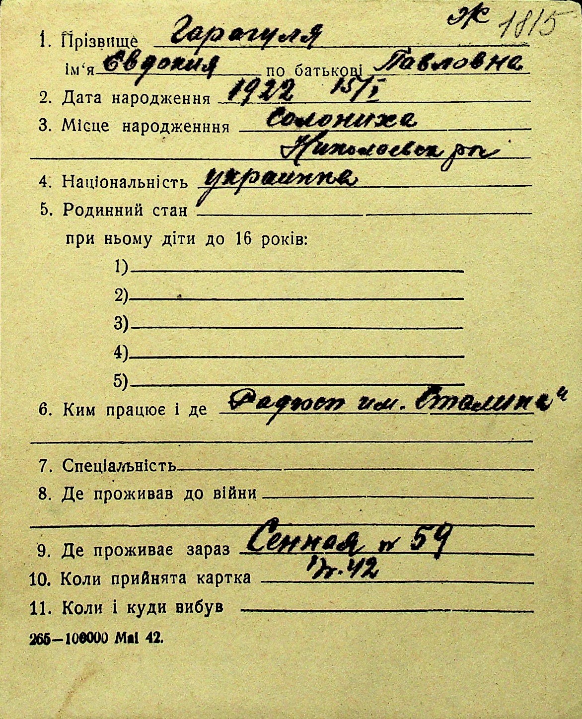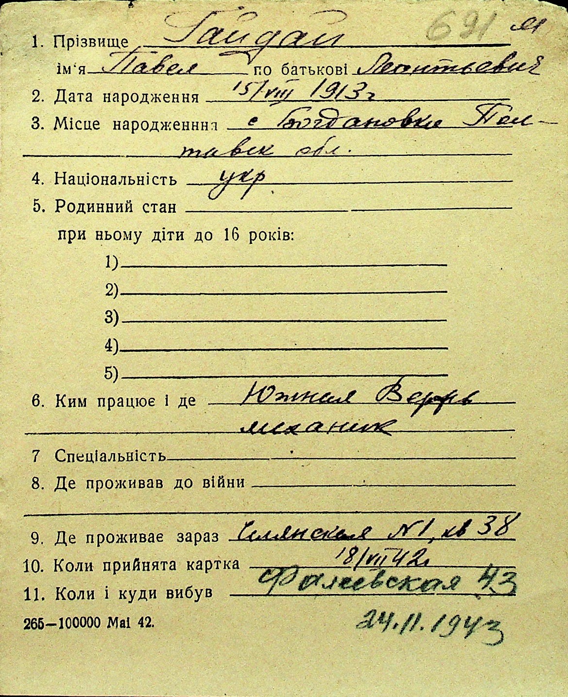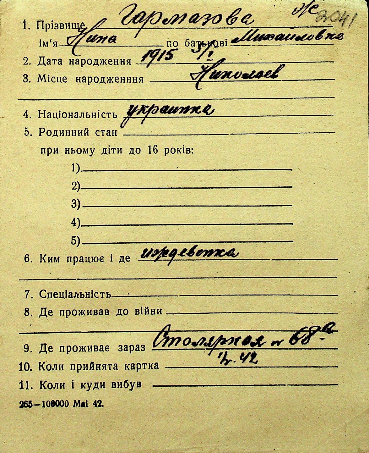 • • Перелік карток до фонду № Н-1016