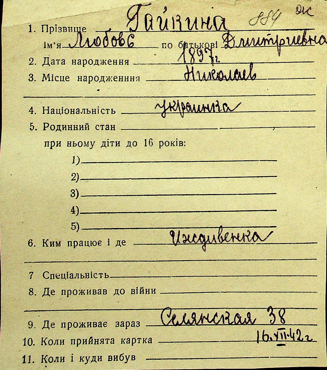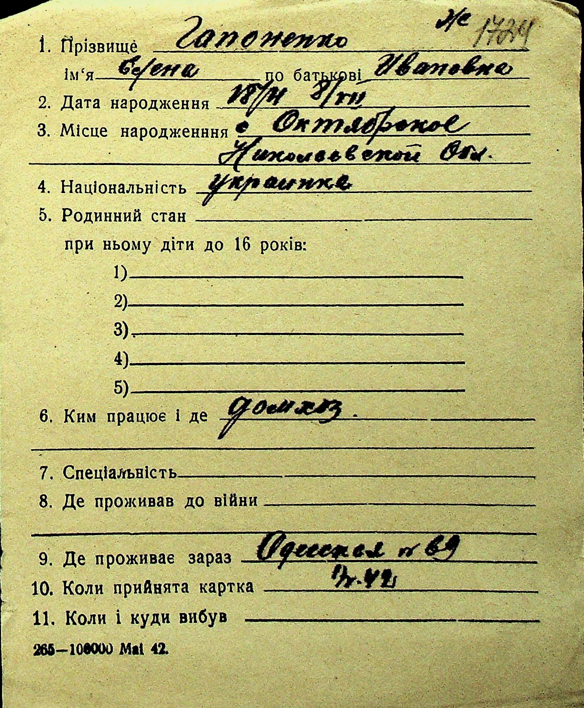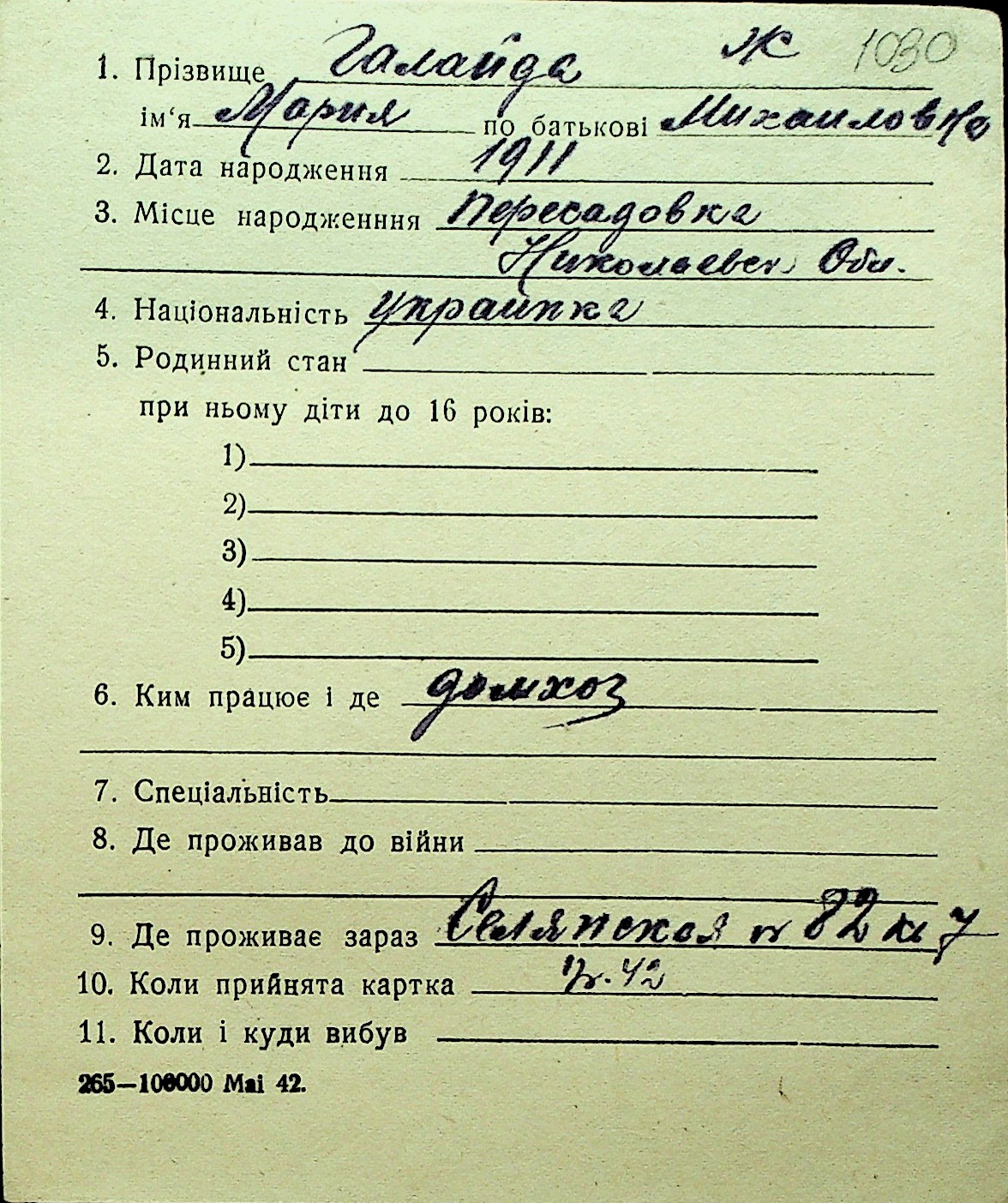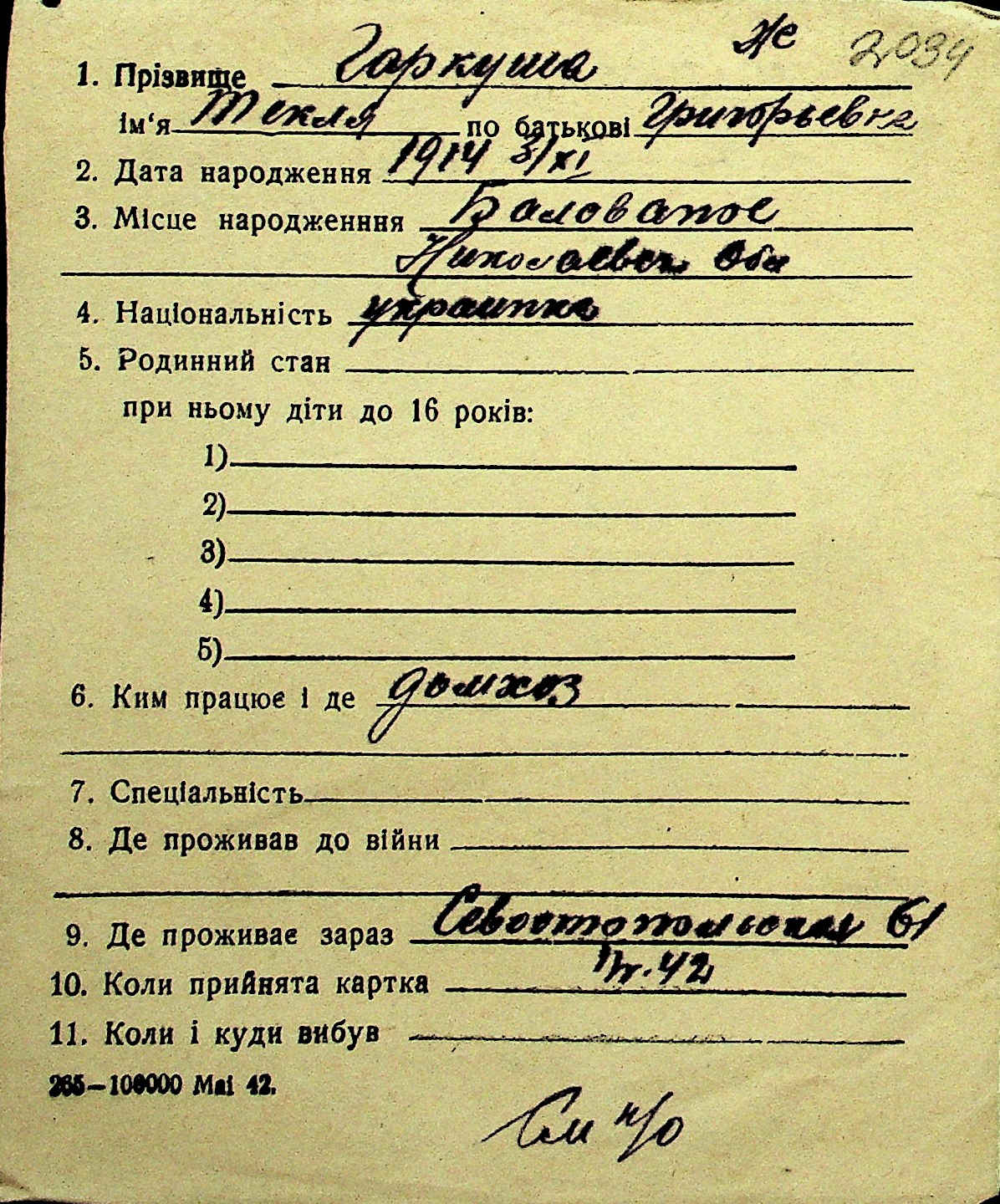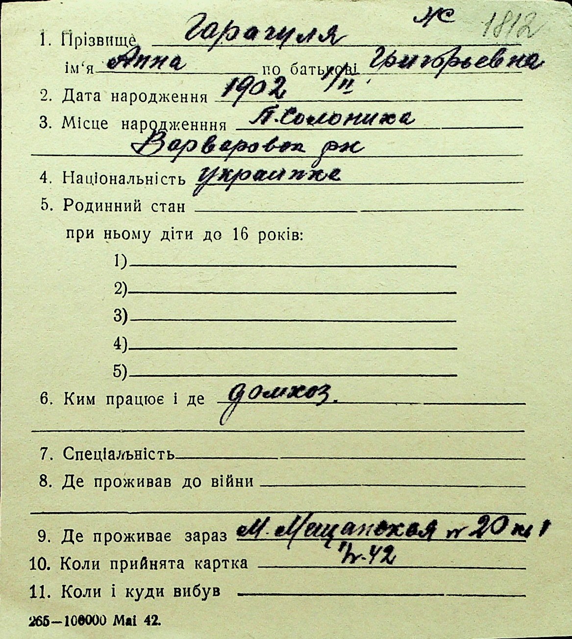 • • Перелік карток до фонду № Н-1016