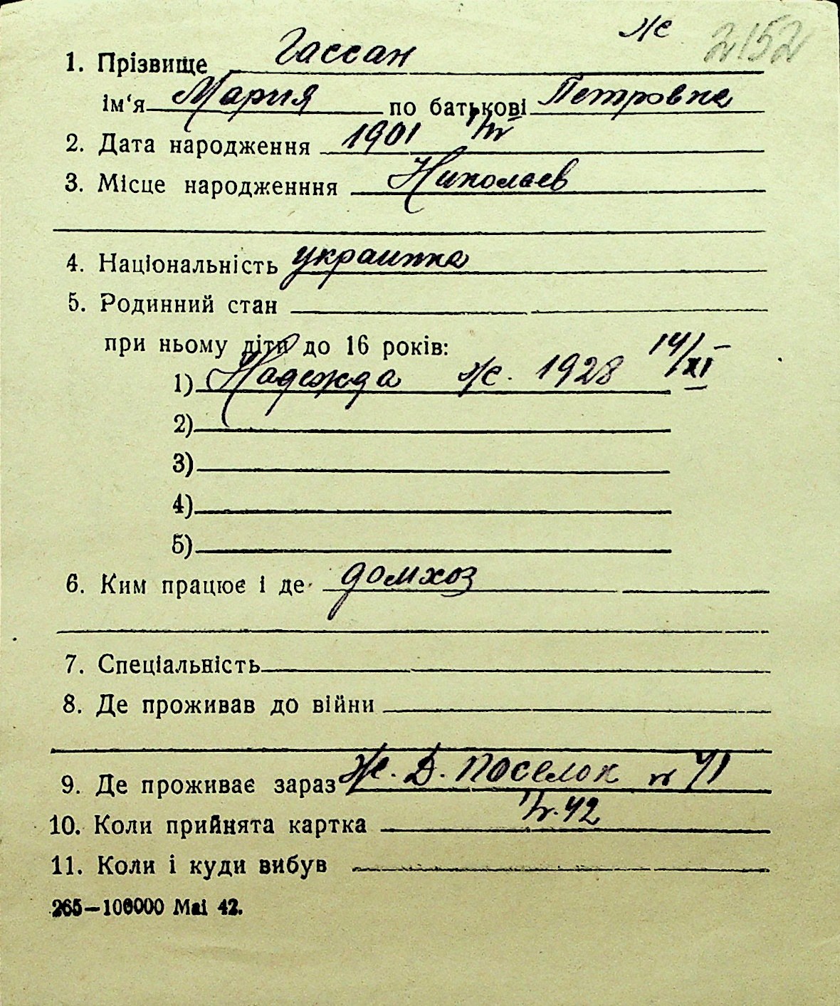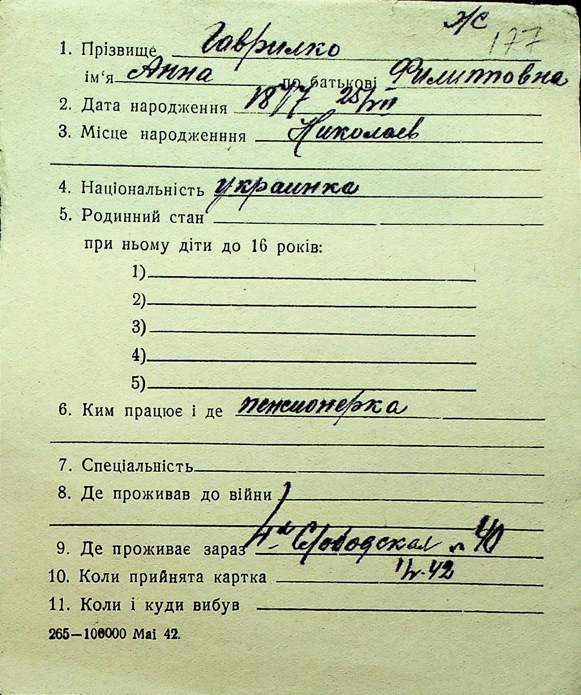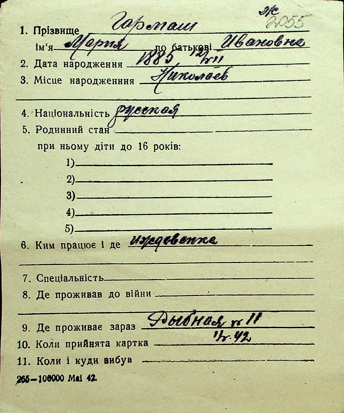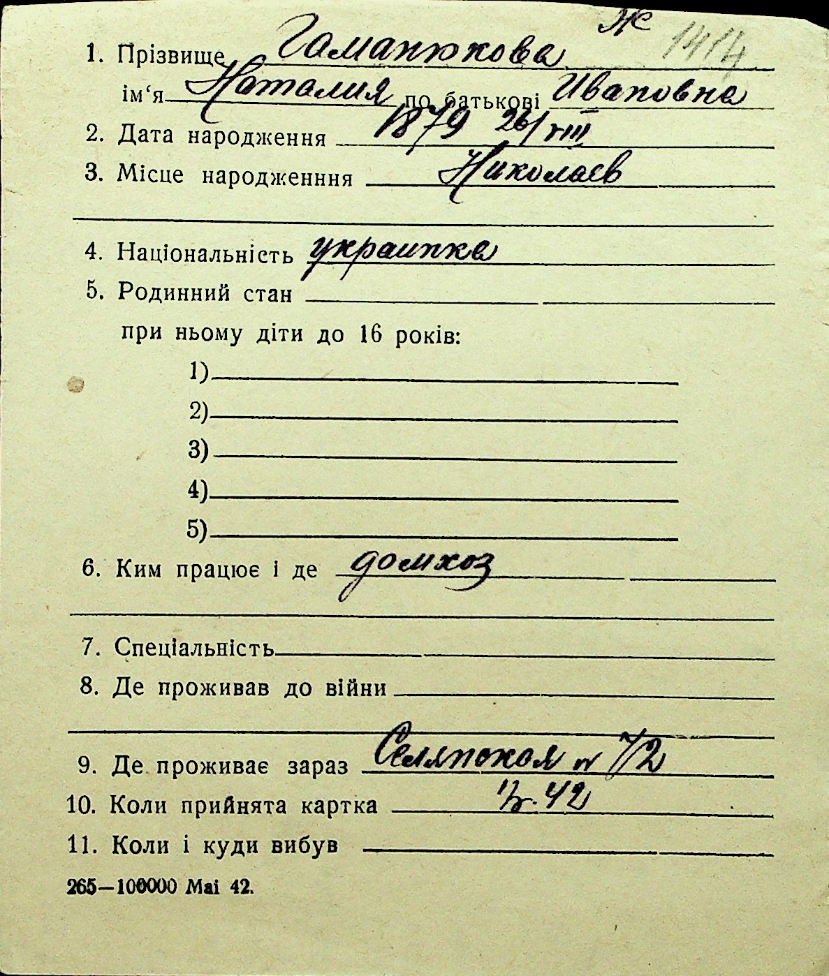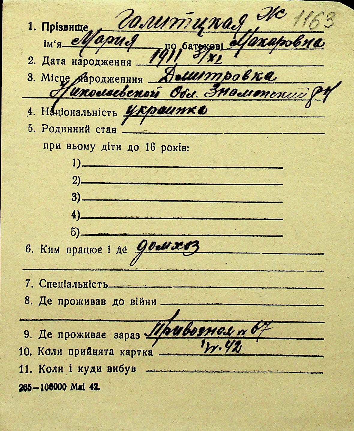 • • Перелік карток до фонду № Н-1016