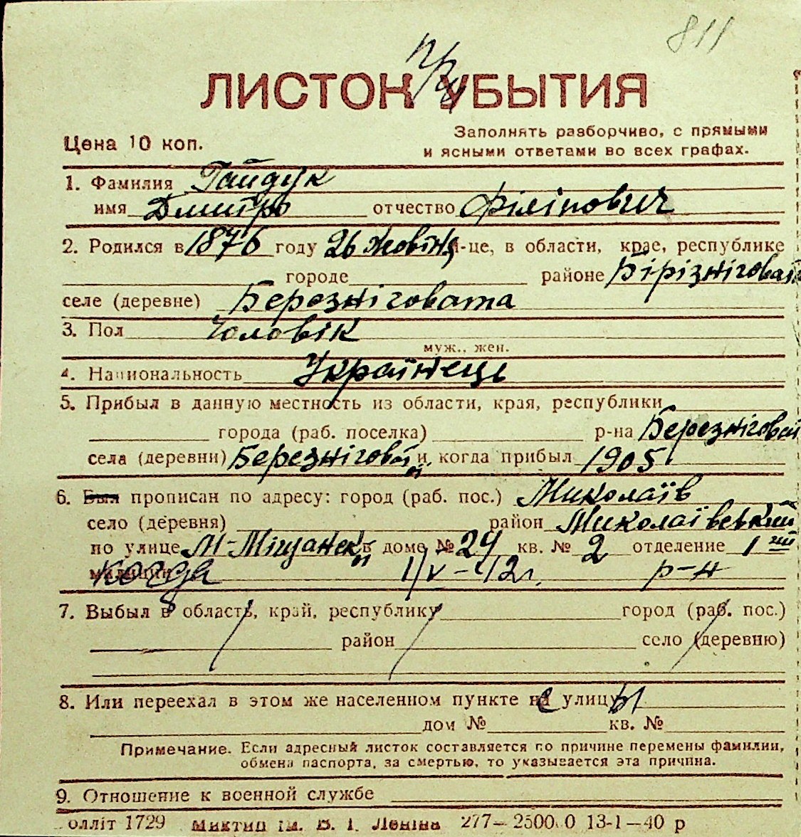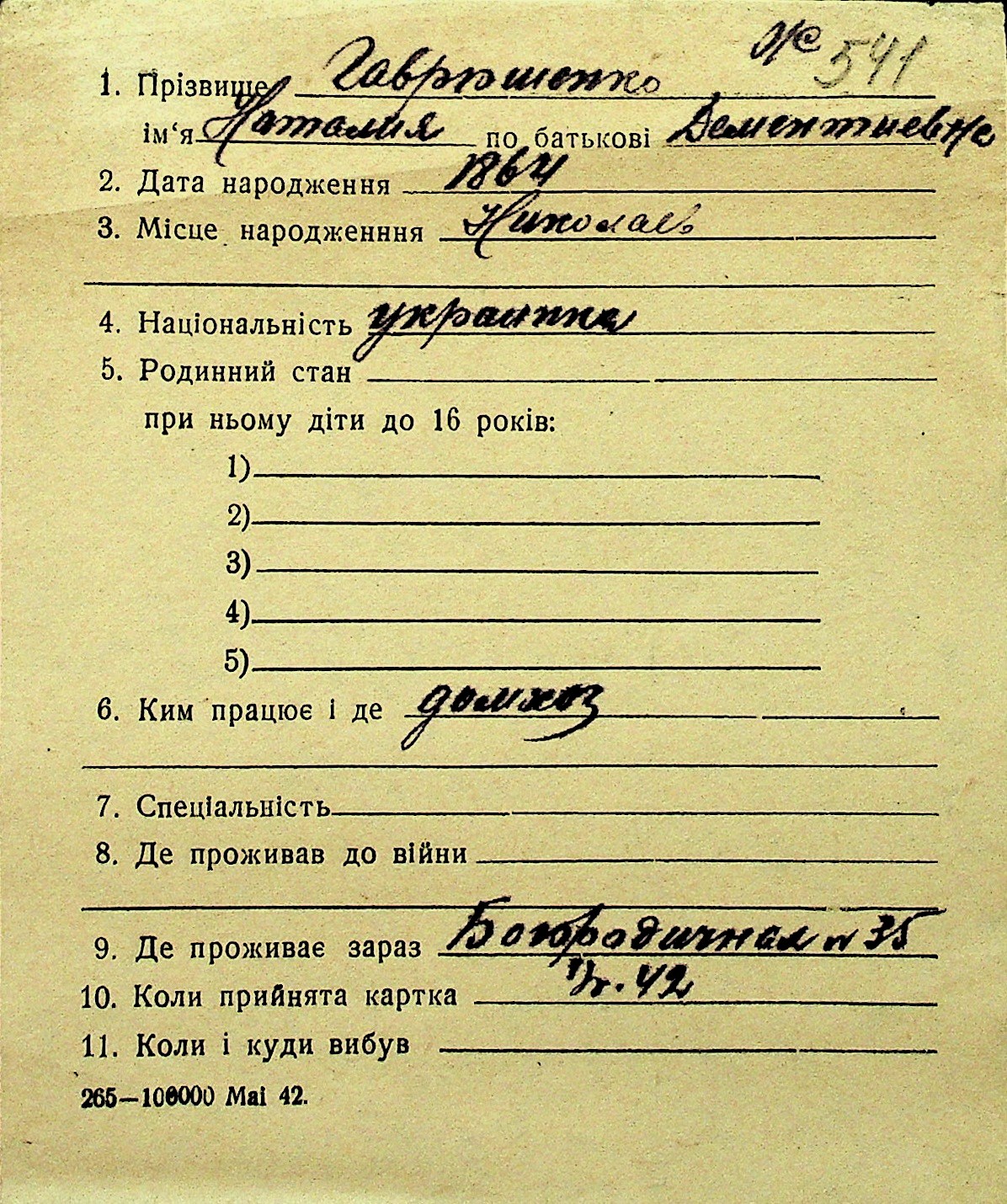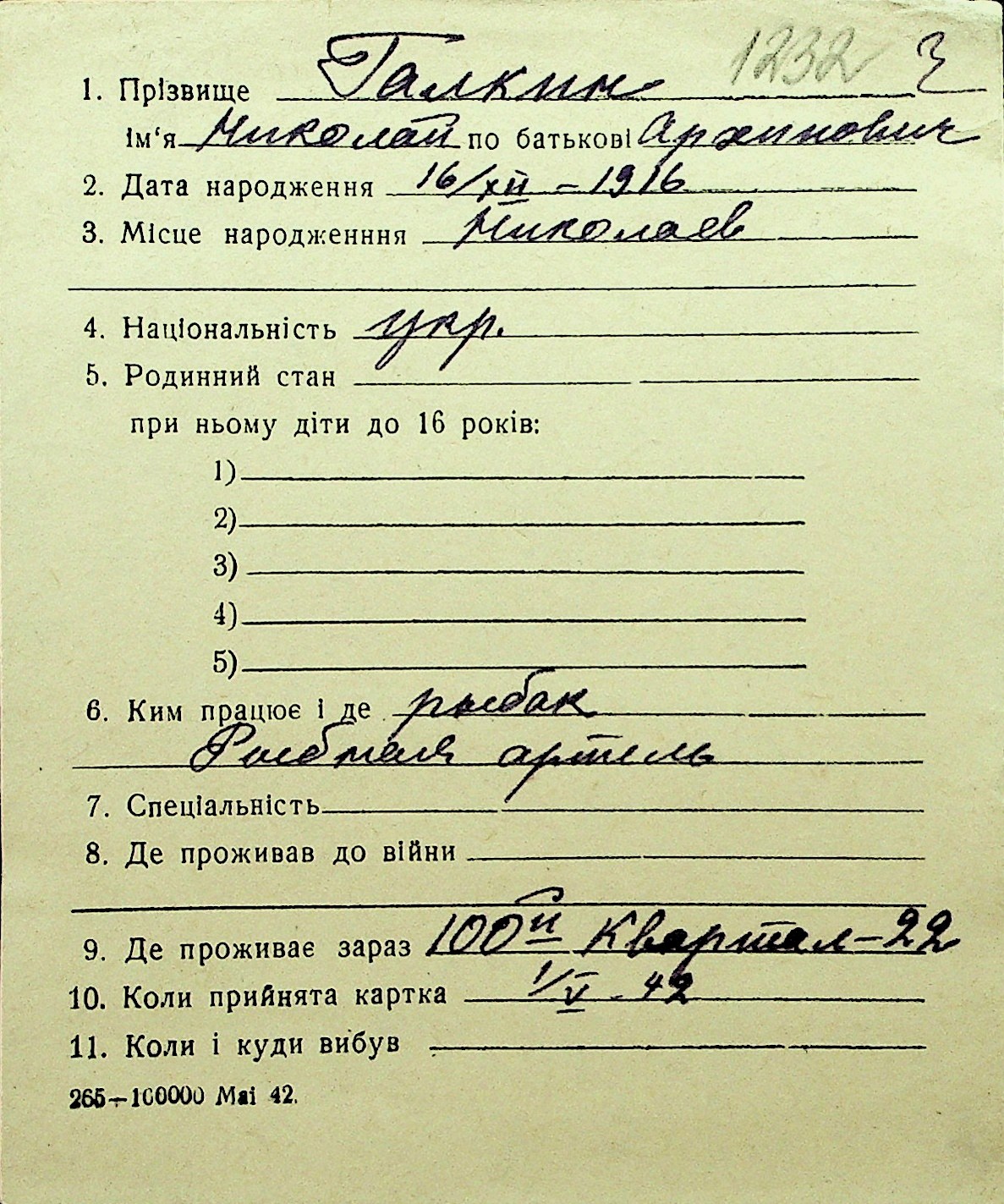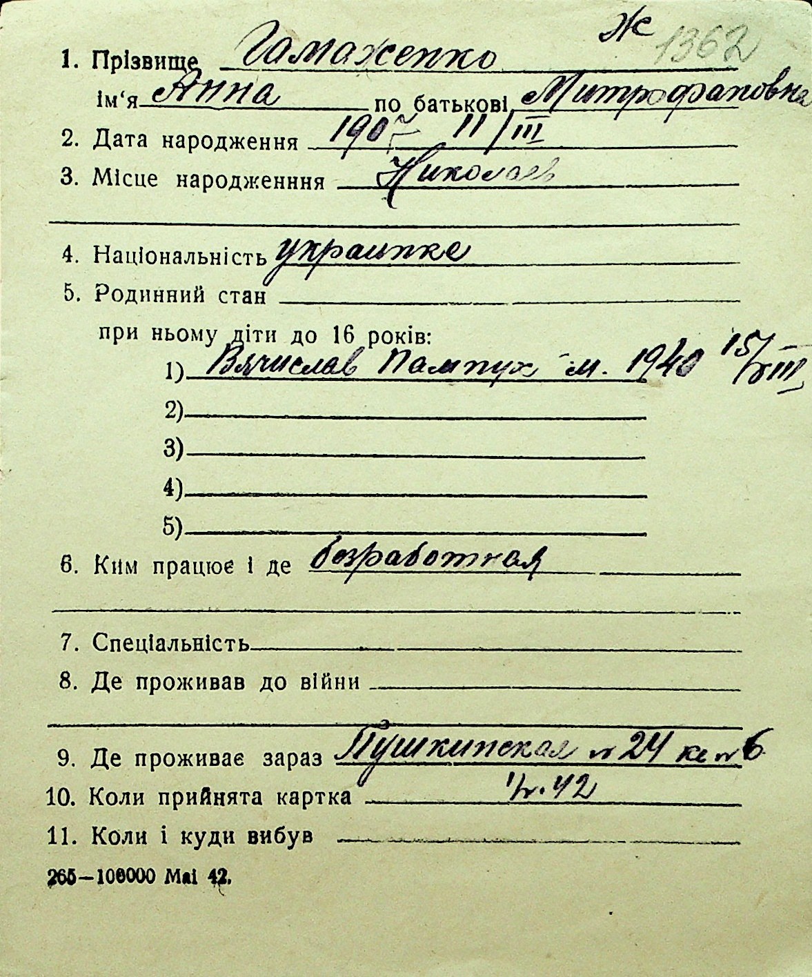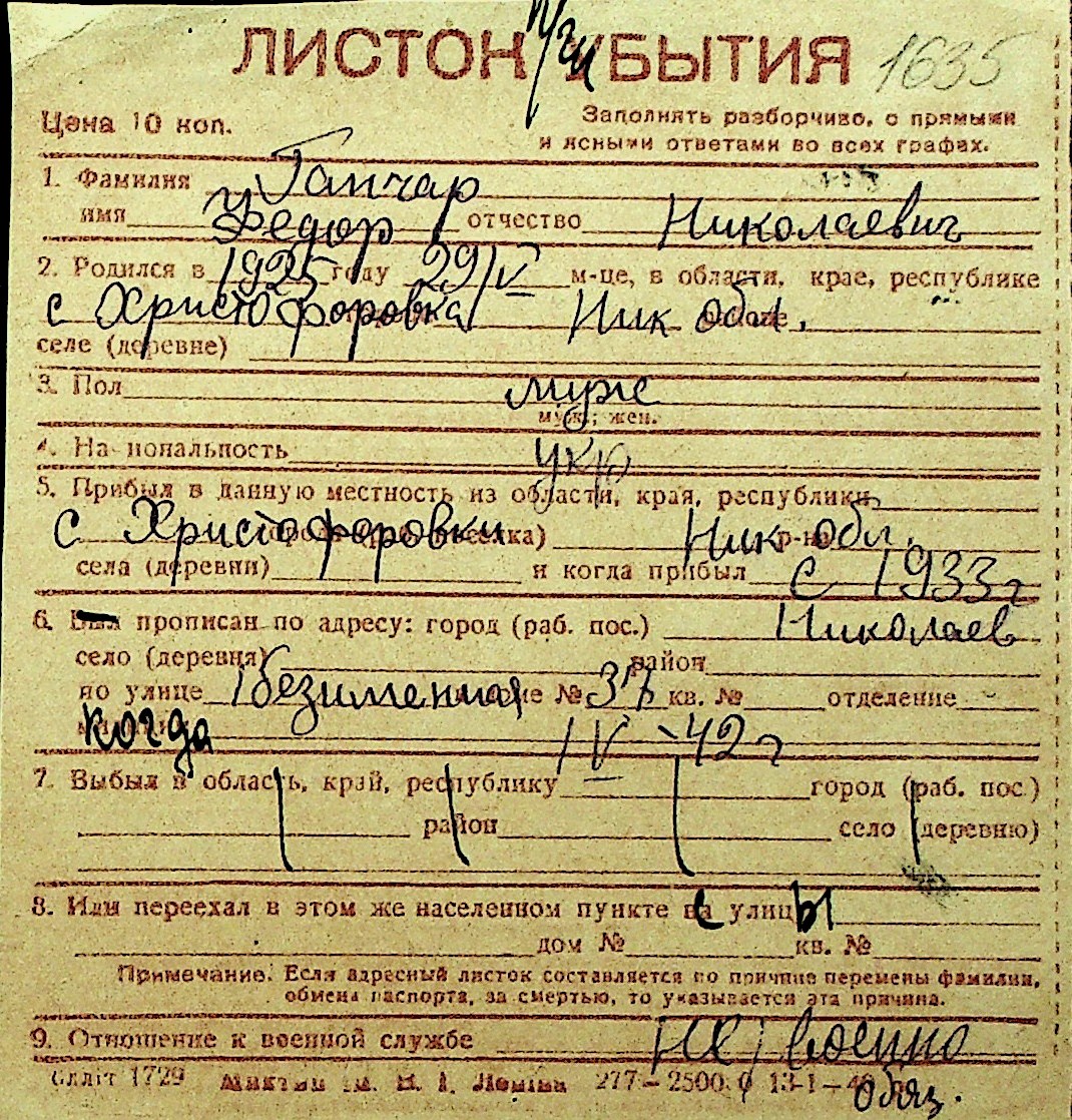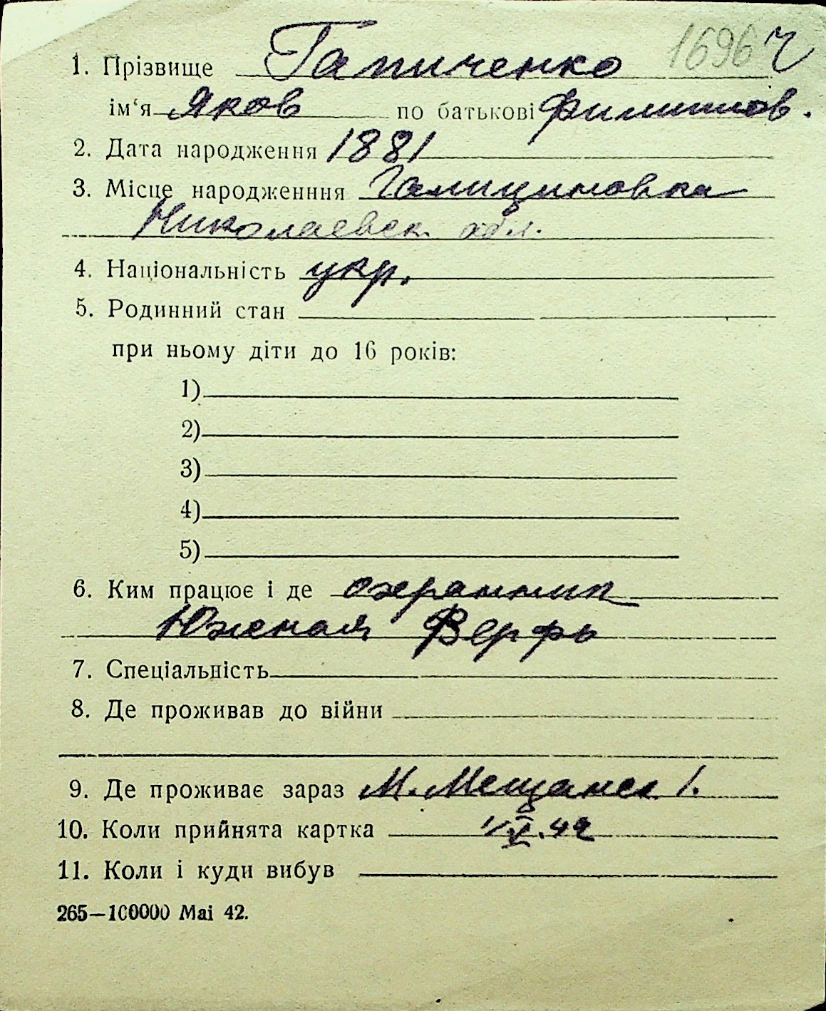 • • Перелік карток до фонду № Н-1016
