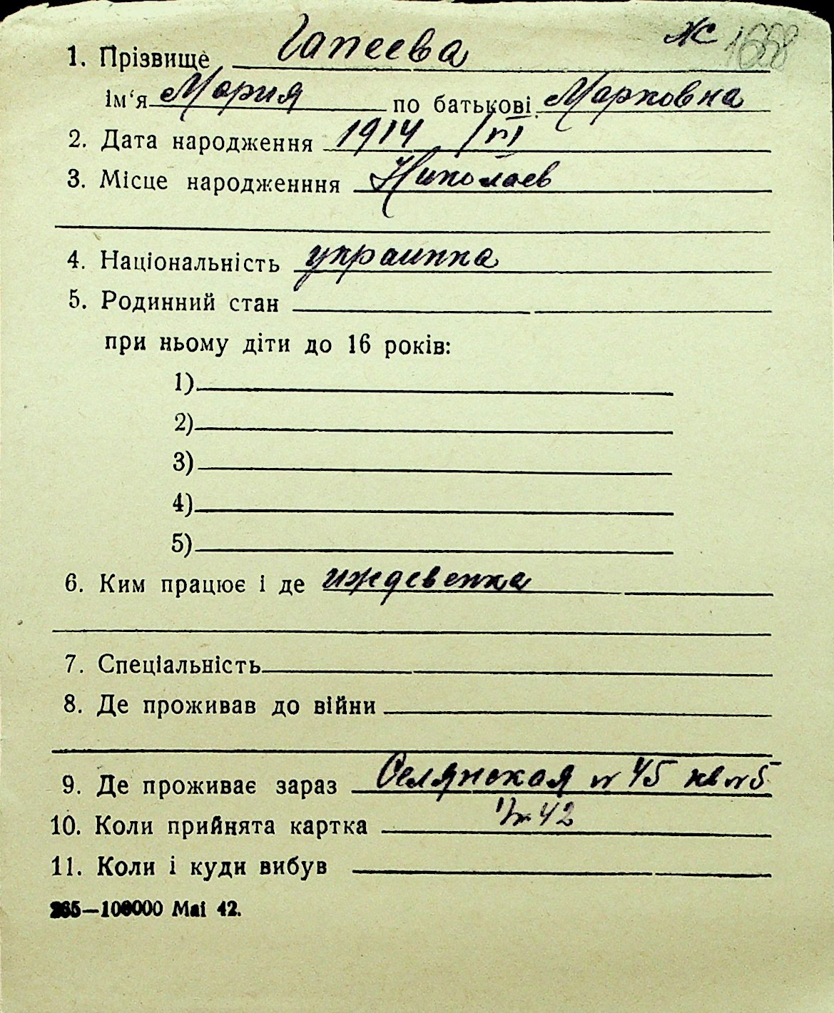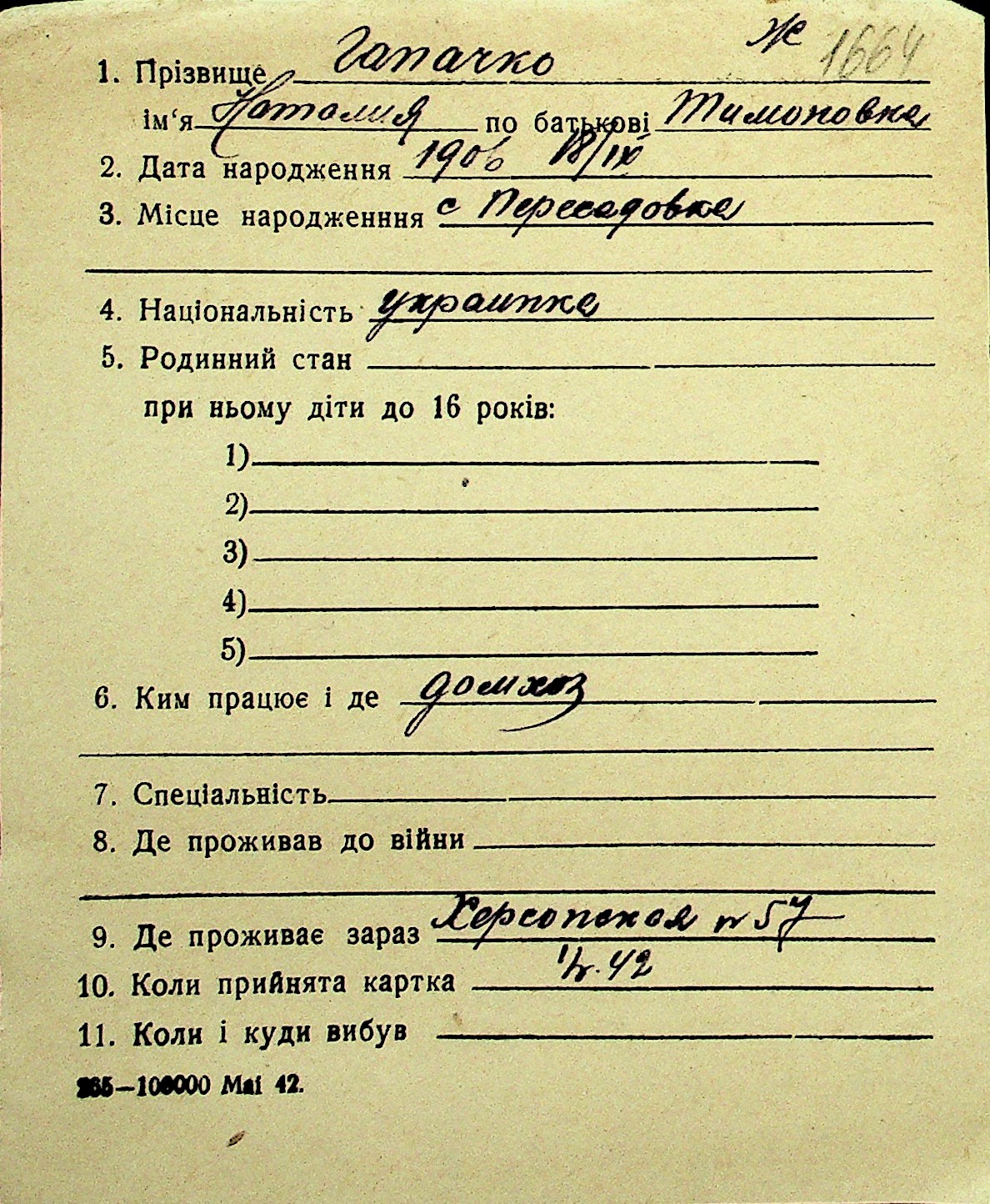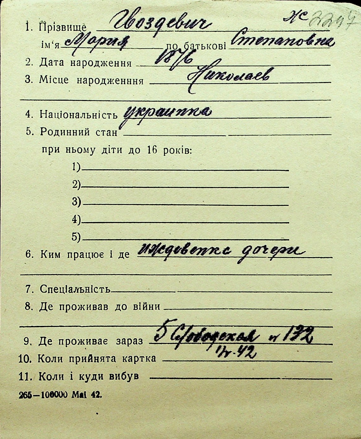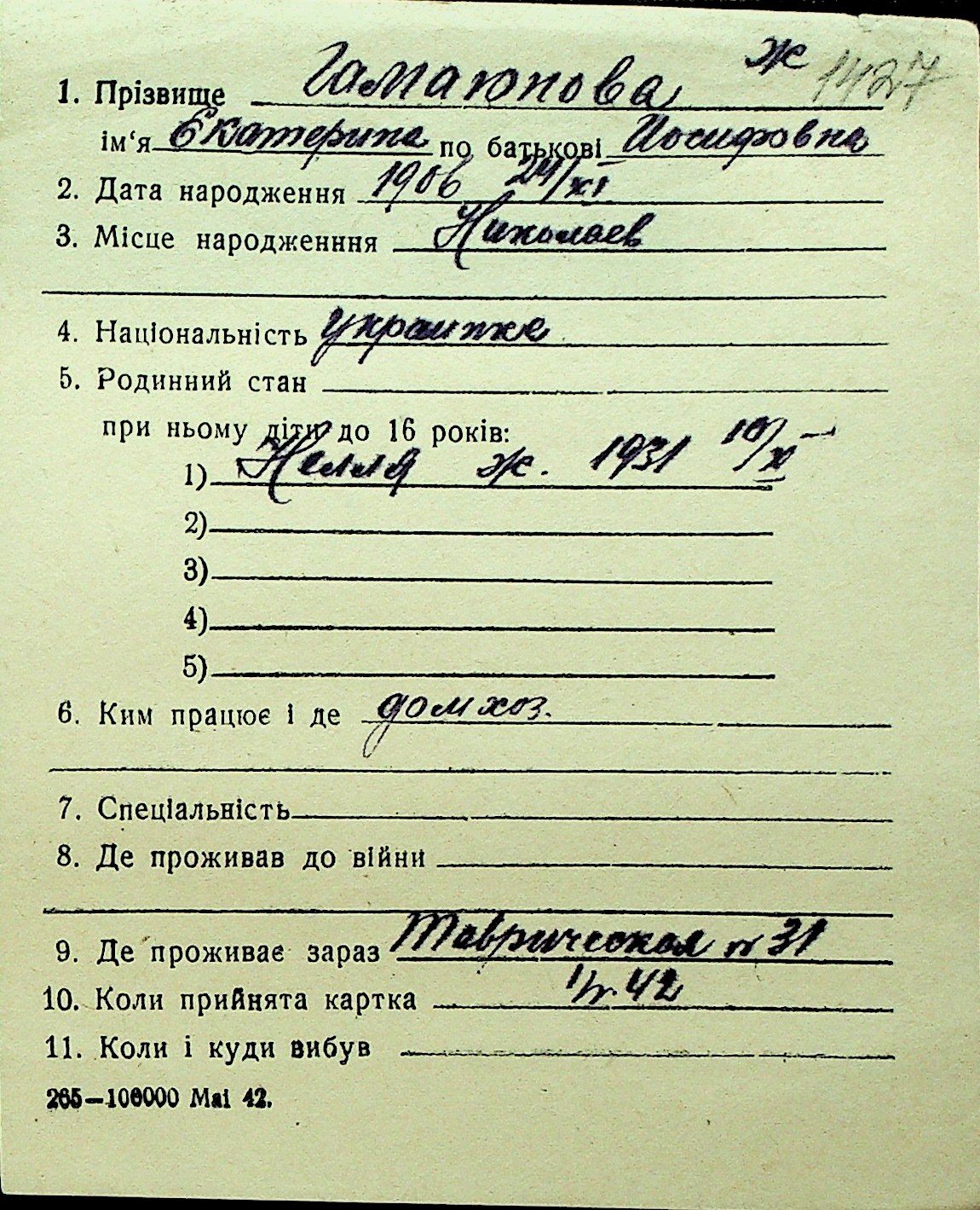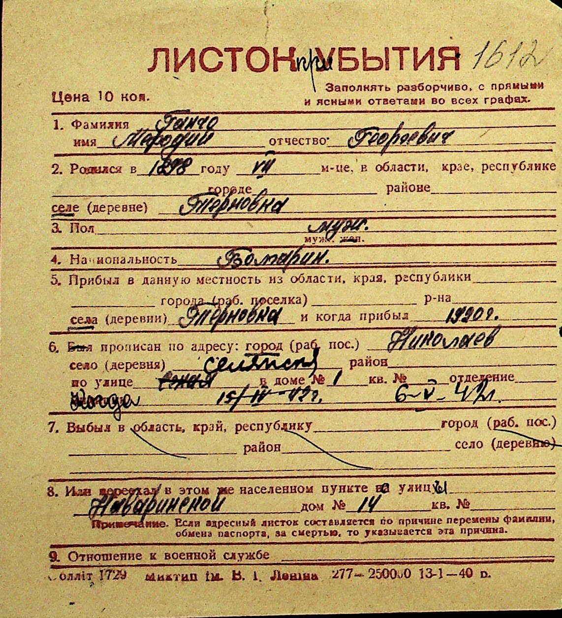 • • Перелік карток до фонду № Н-1016