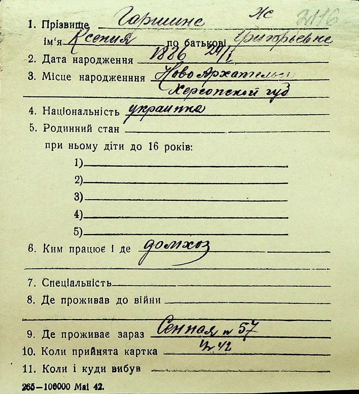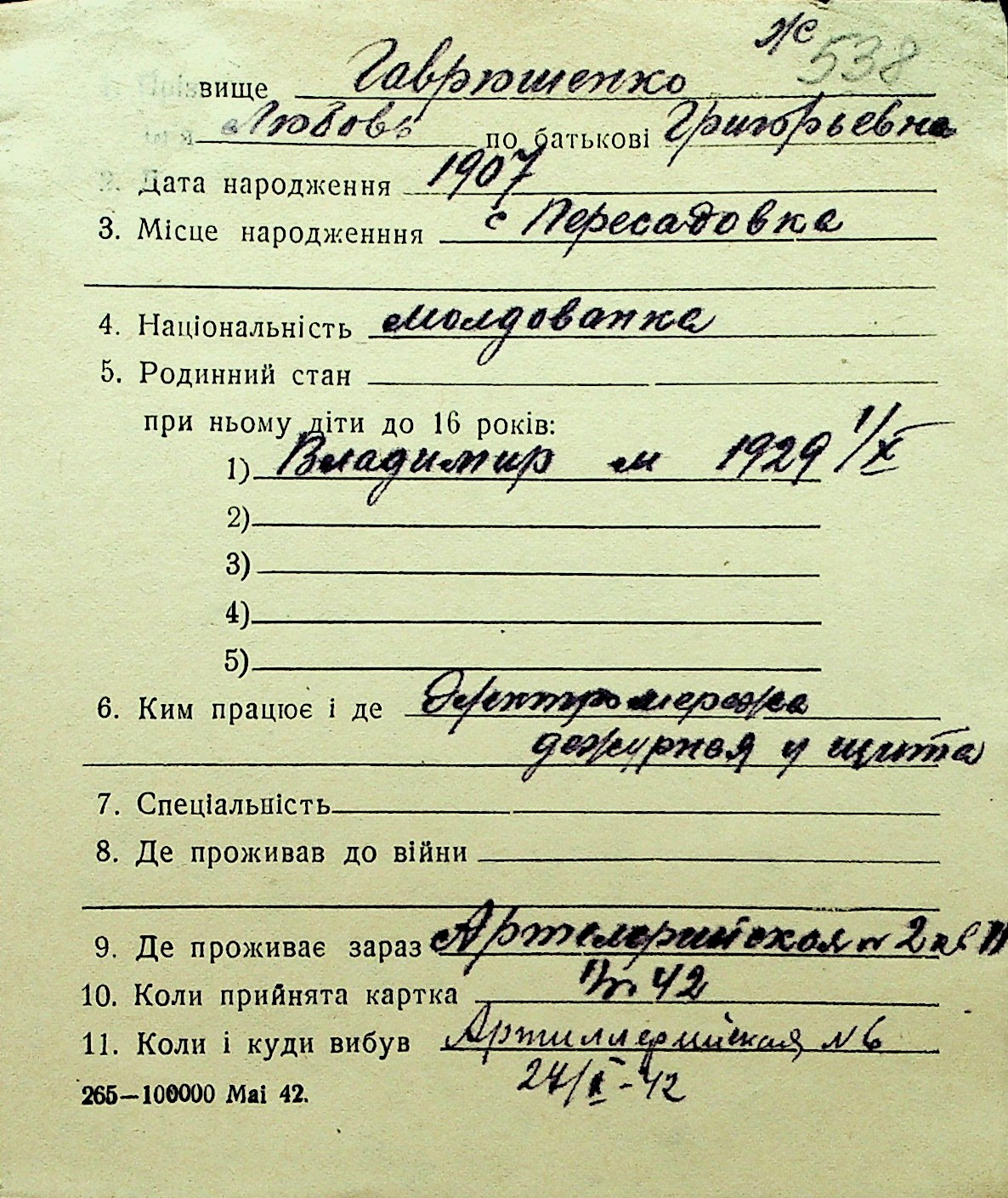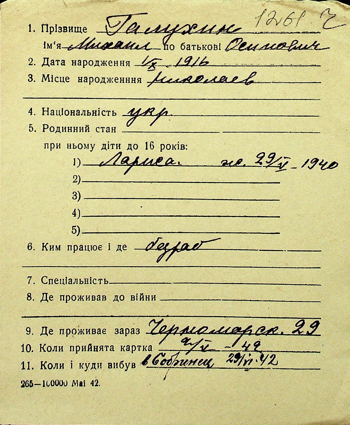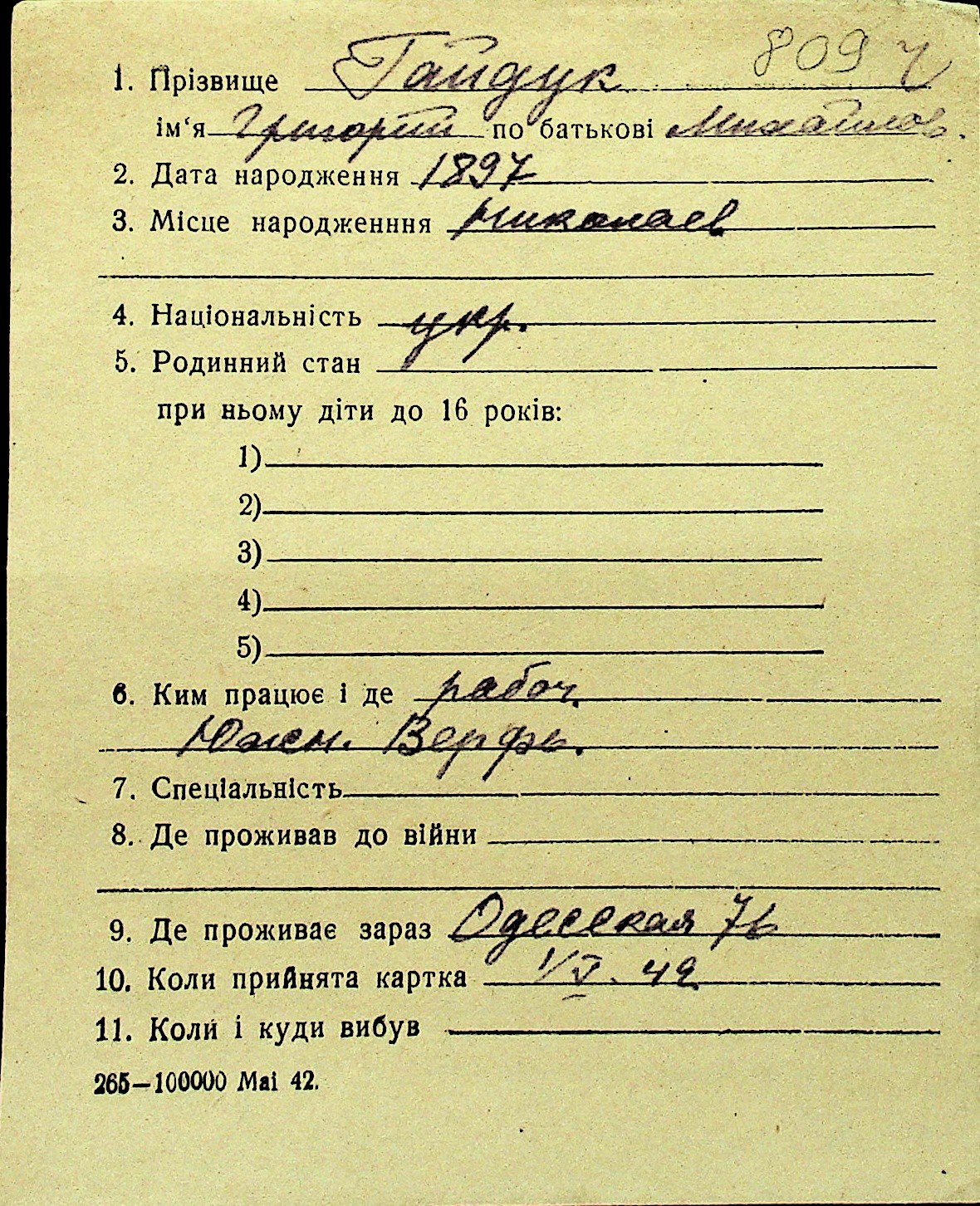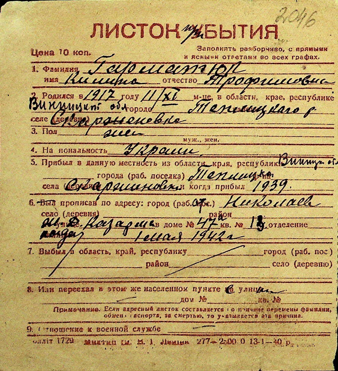 • • Перелік карток до фонду № Н-1016