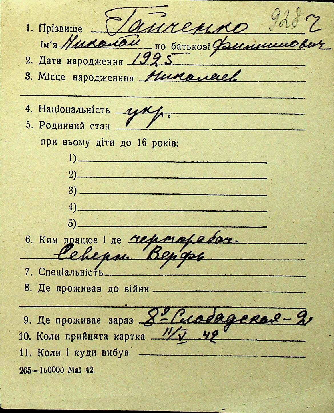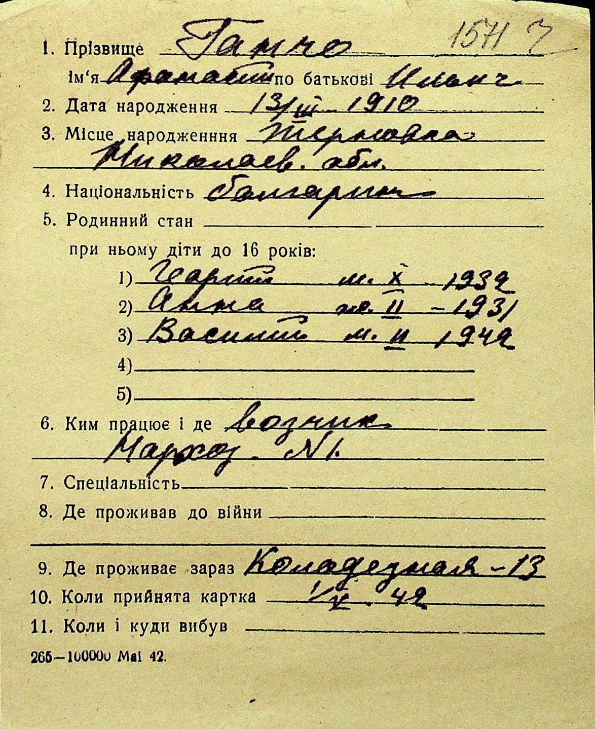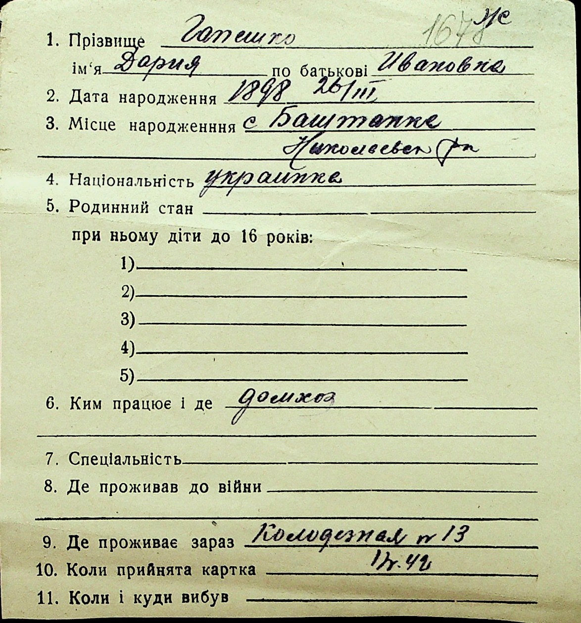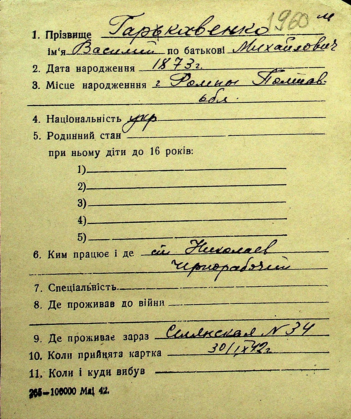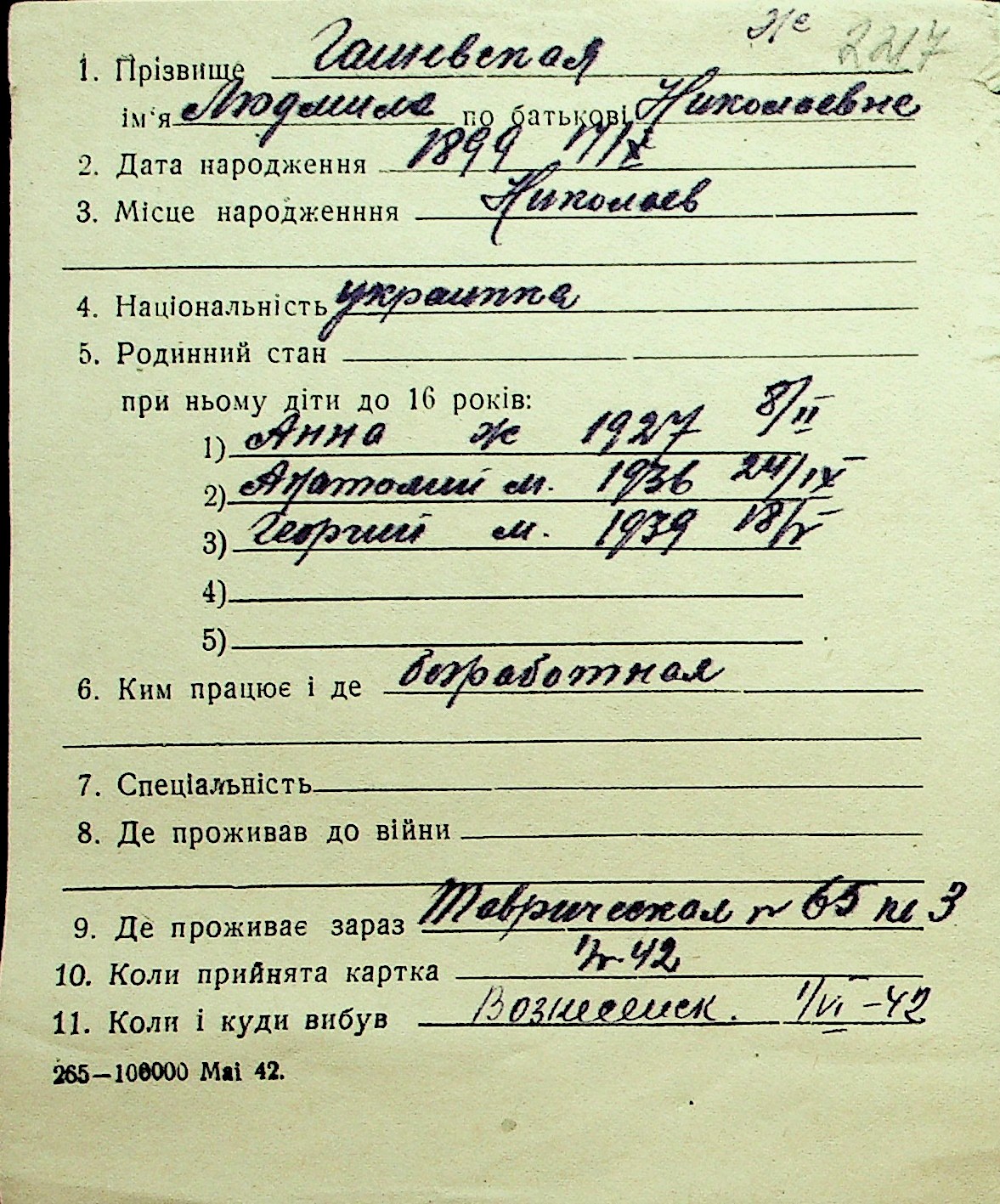 • • Перелік карток до фонду № Н-1016