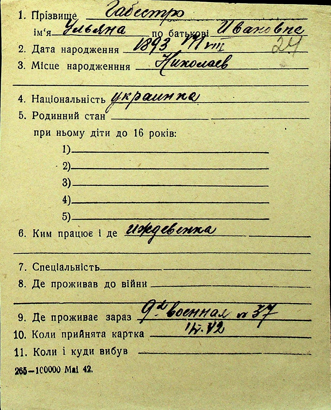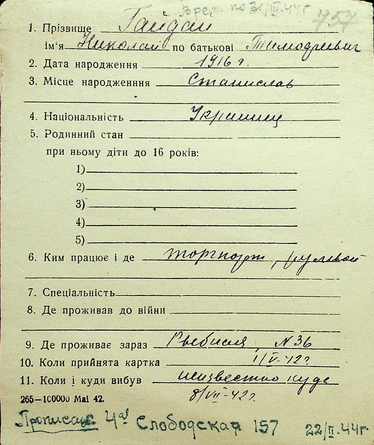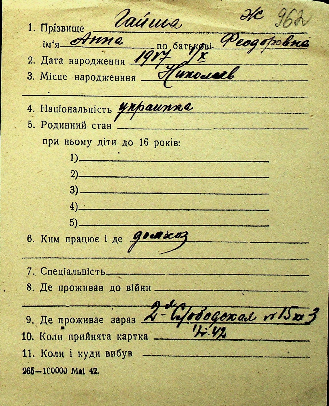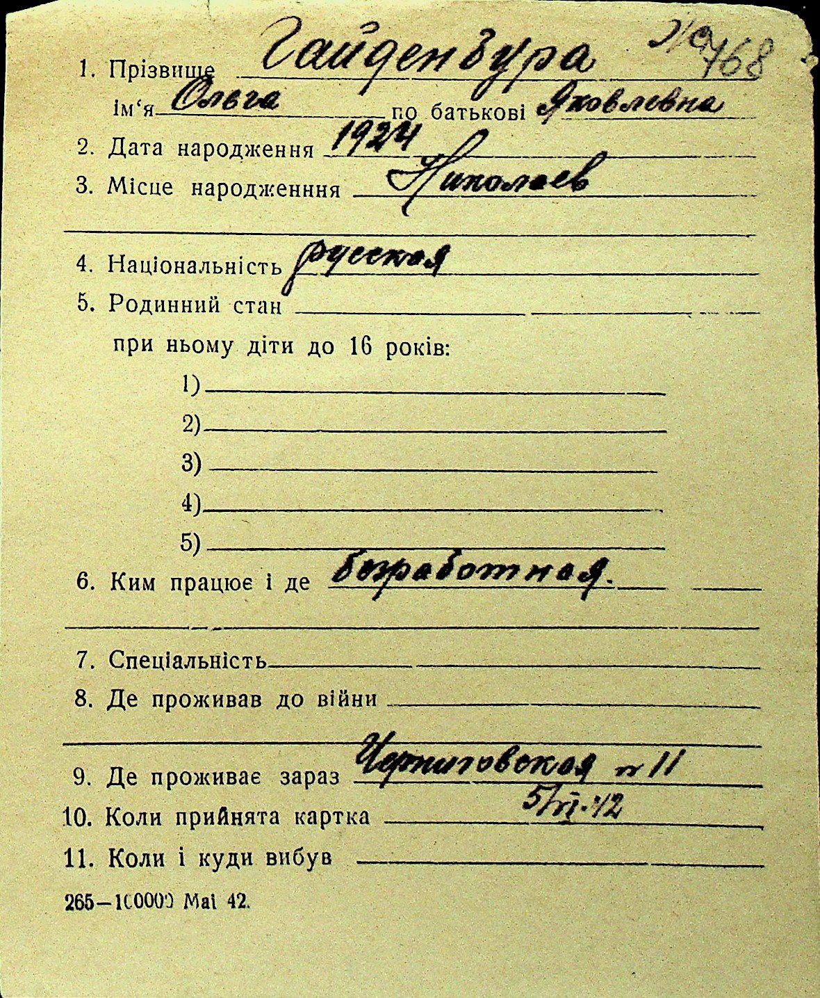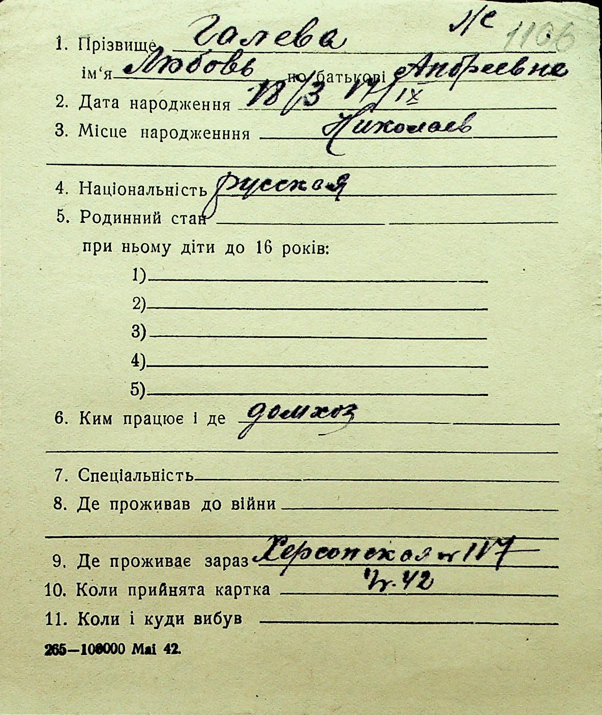 • • Перелік карток до фонду № Н-1016