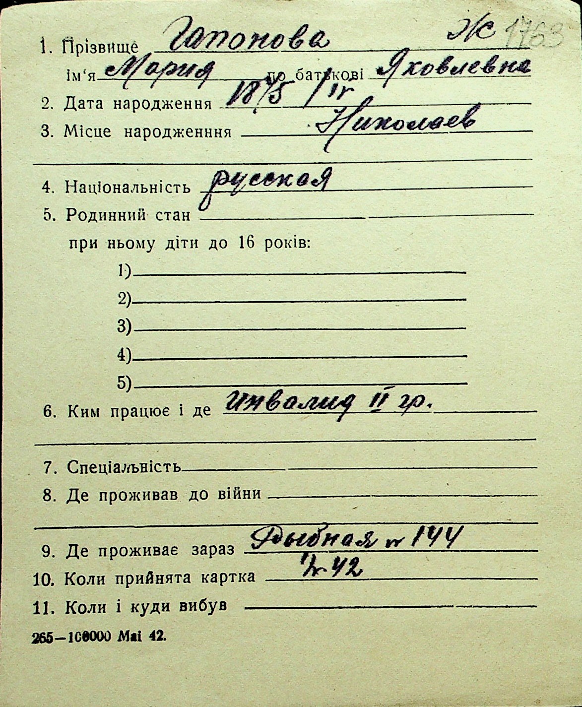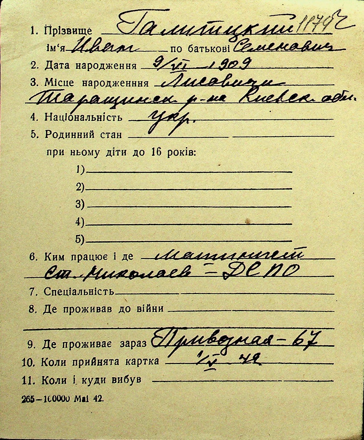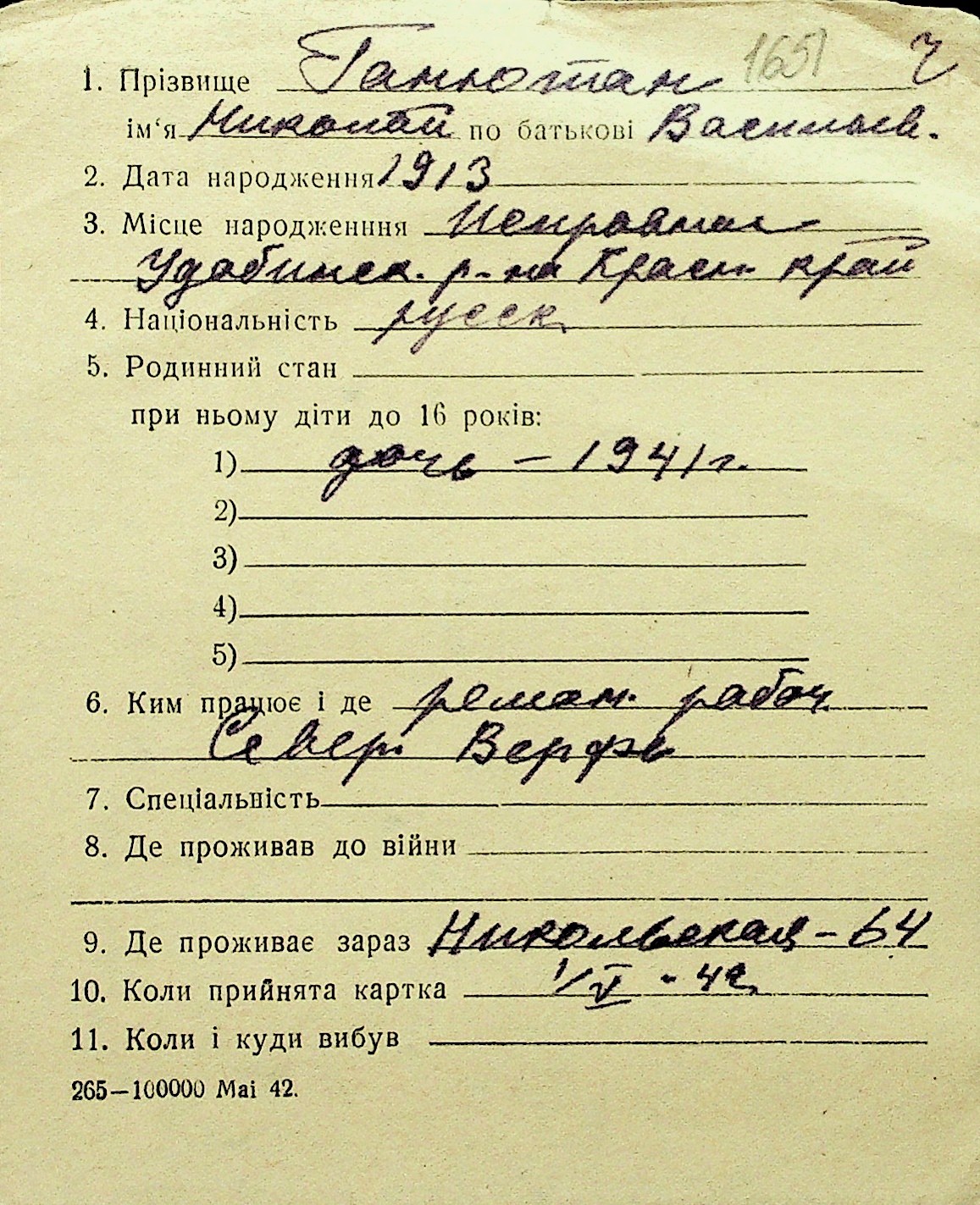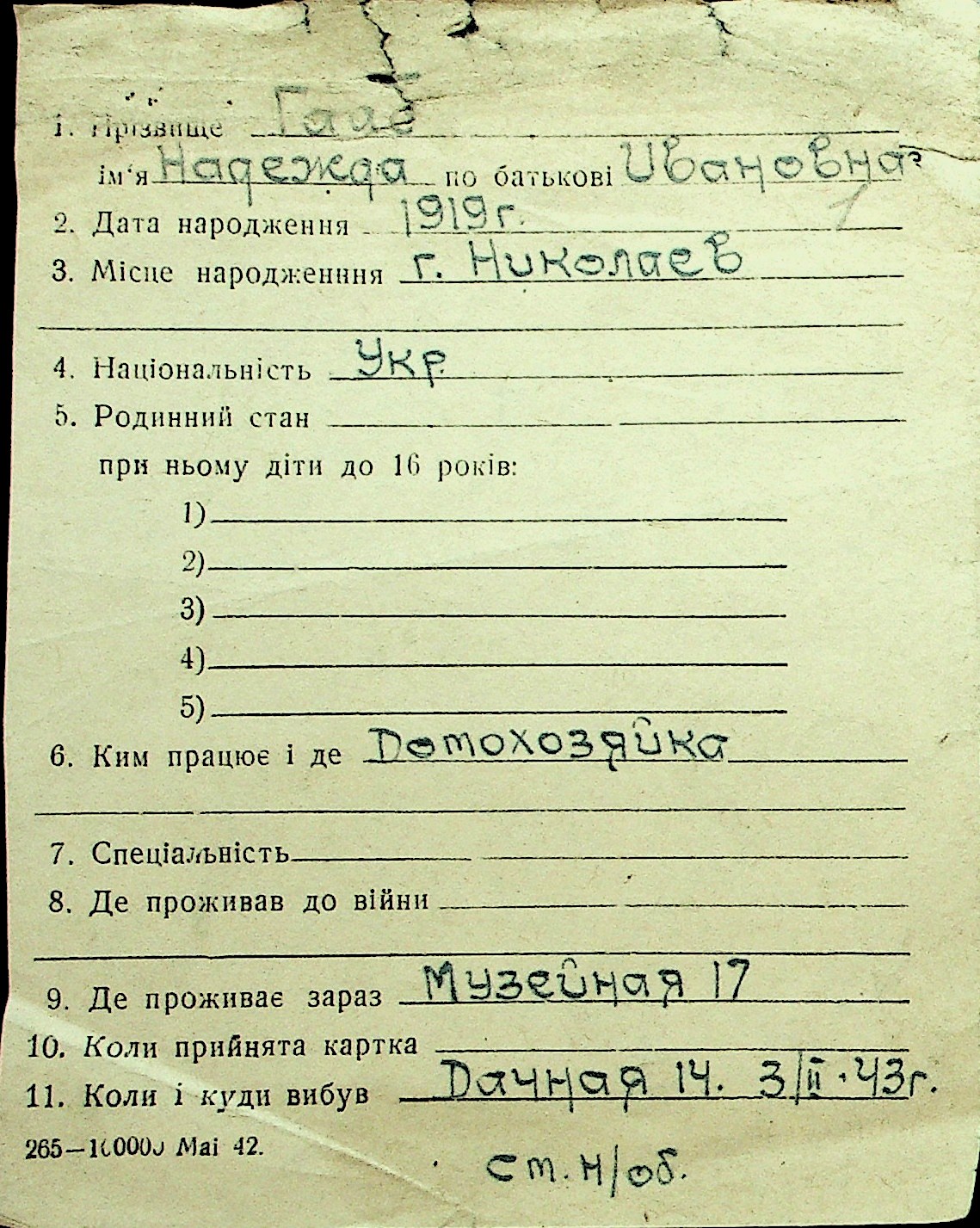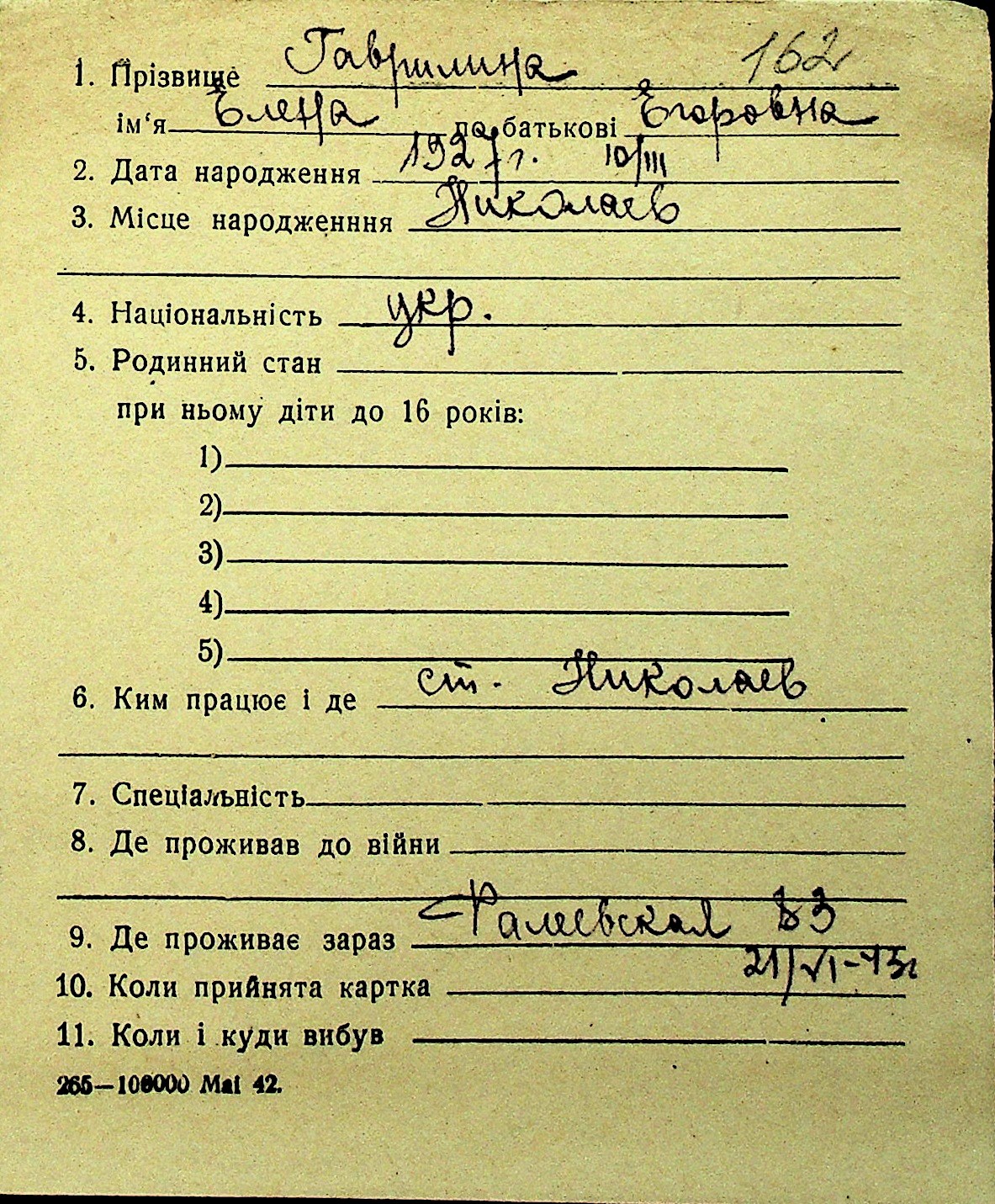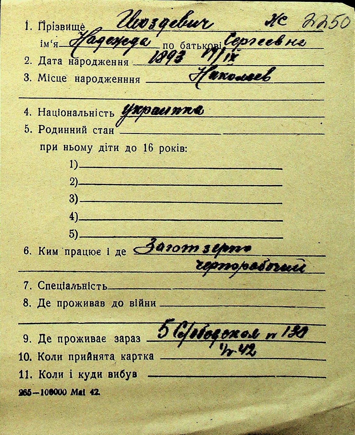 • • Перелік карток до фонду № Н-1016