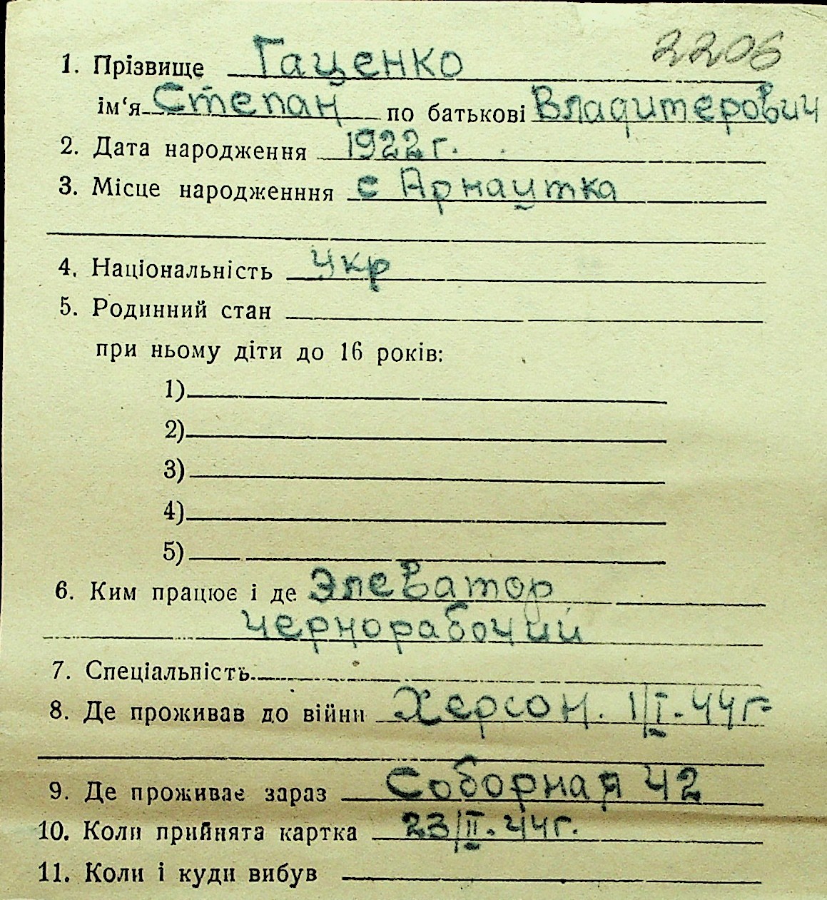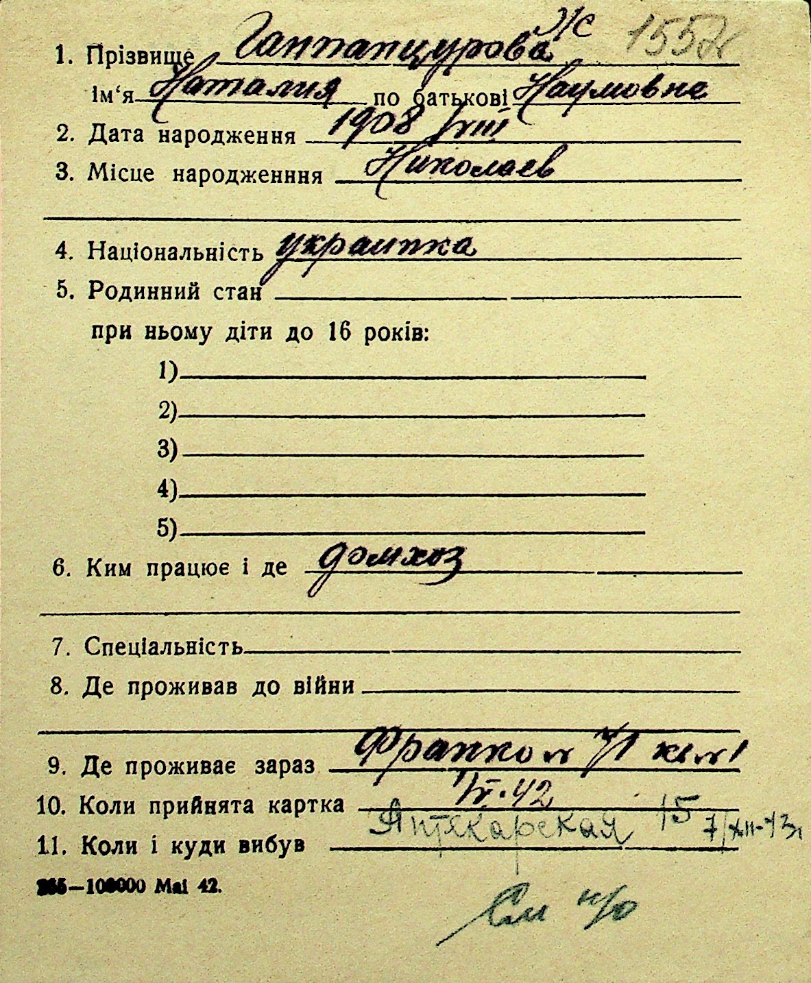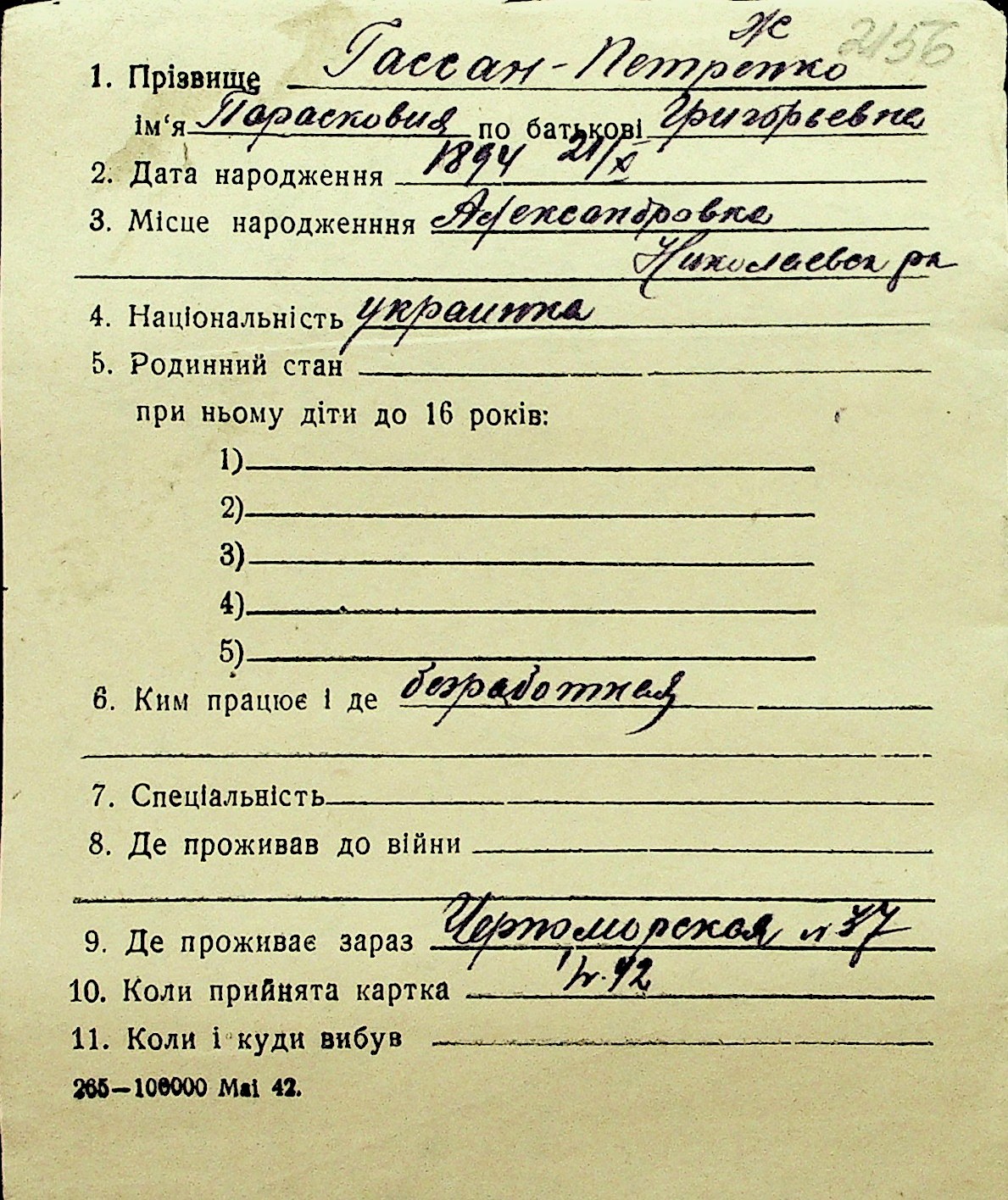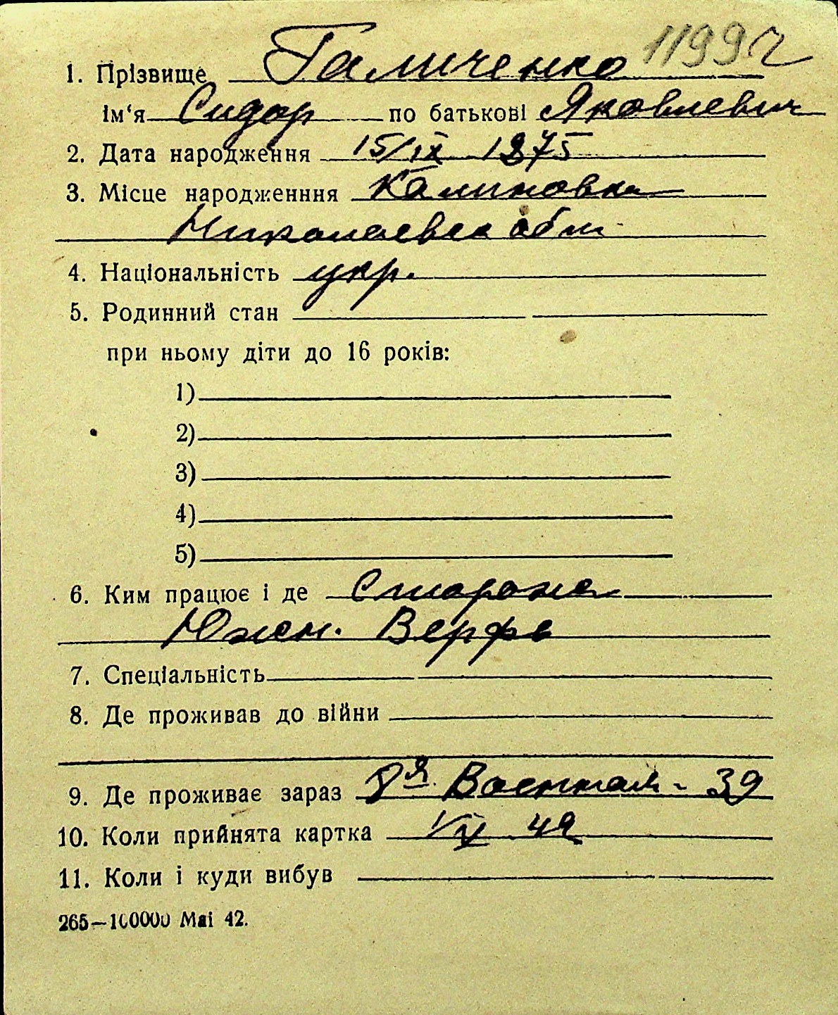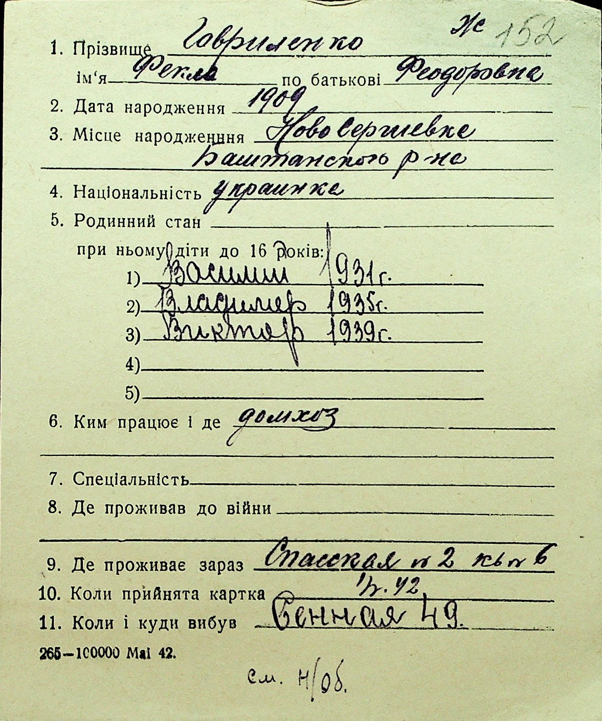 • • Перелік карток до фонду № Н-1016