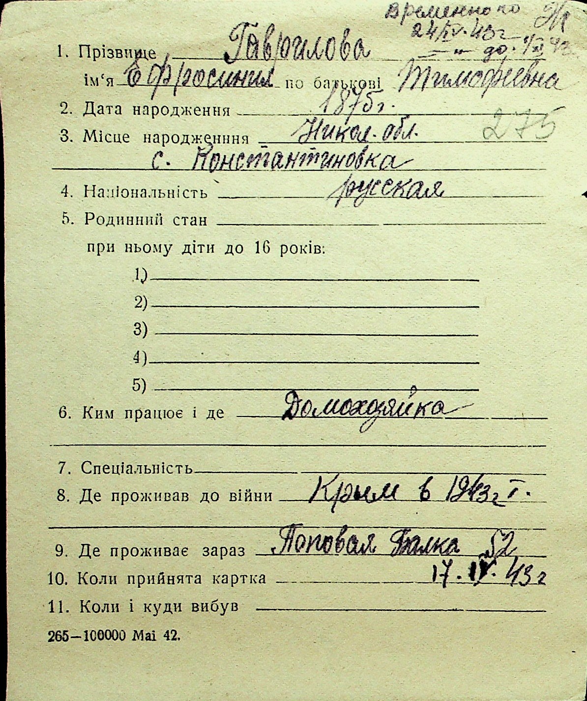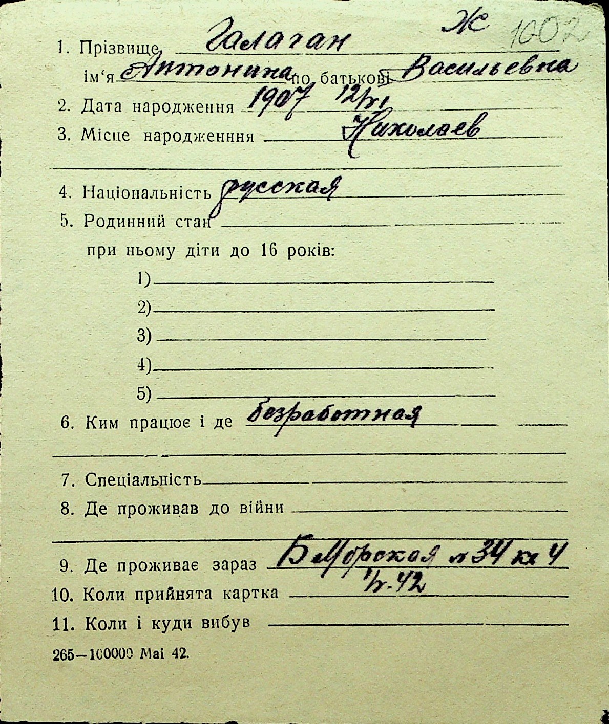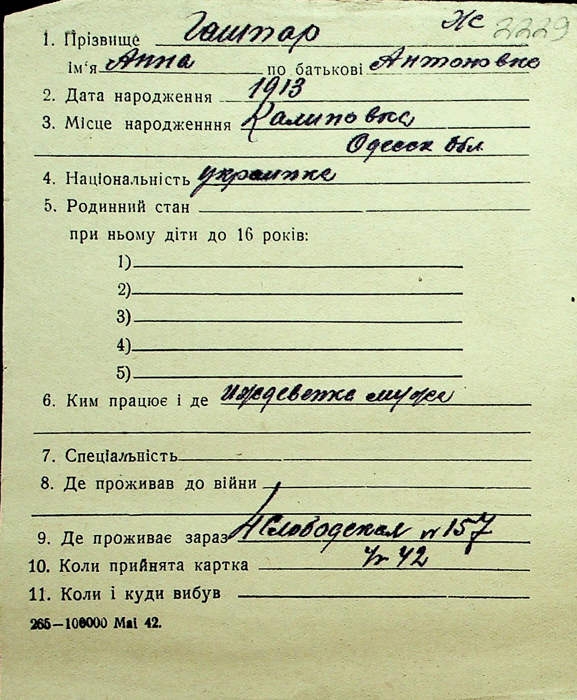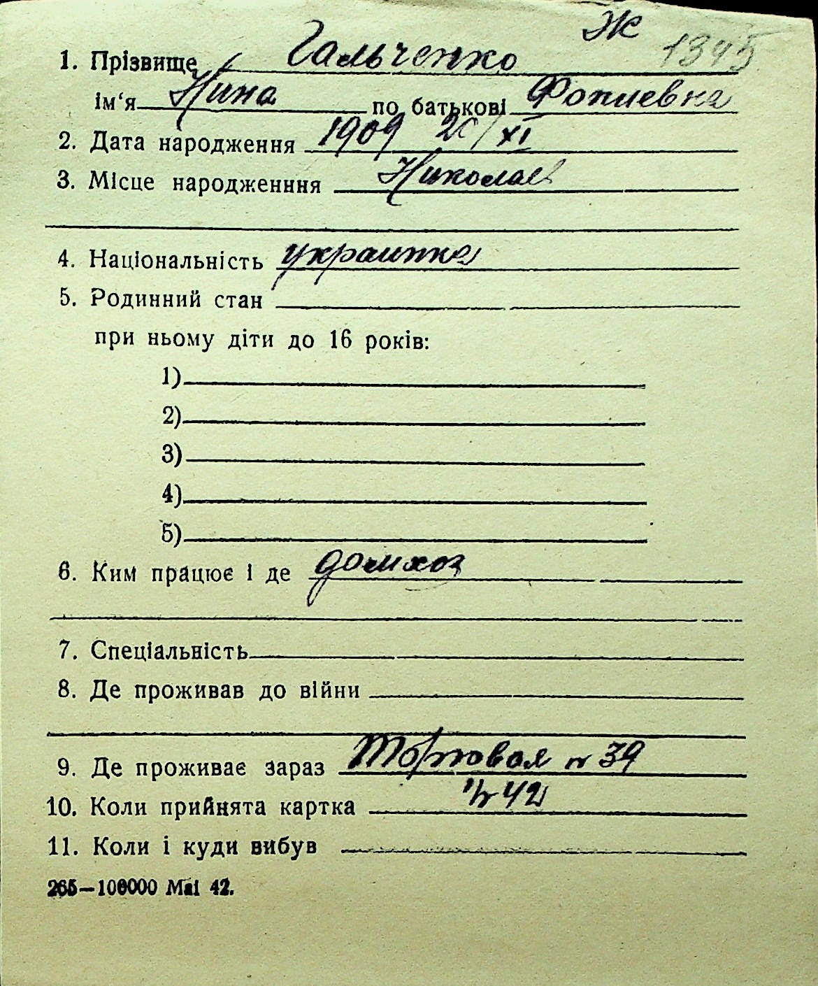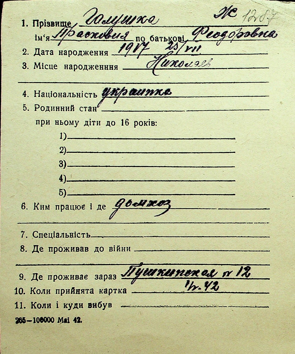 • • Перелік карток до фонду № Н-1016