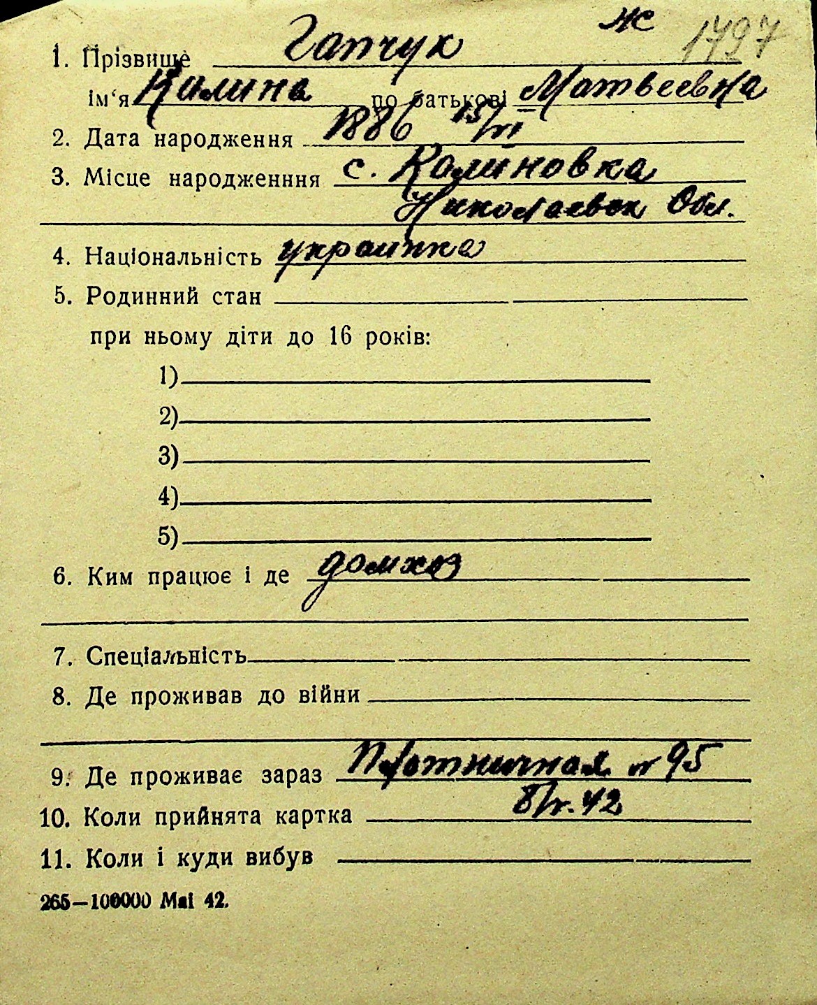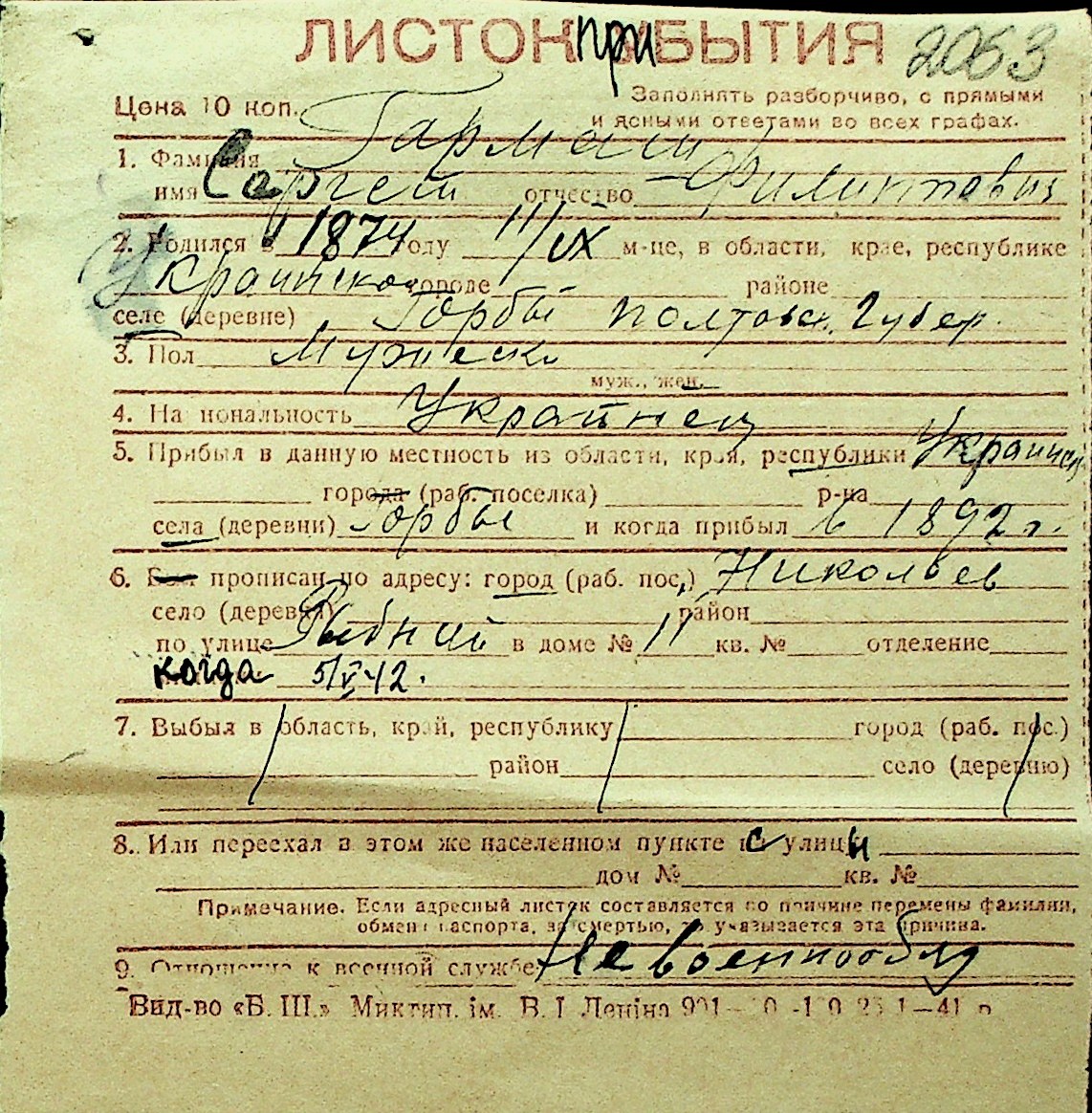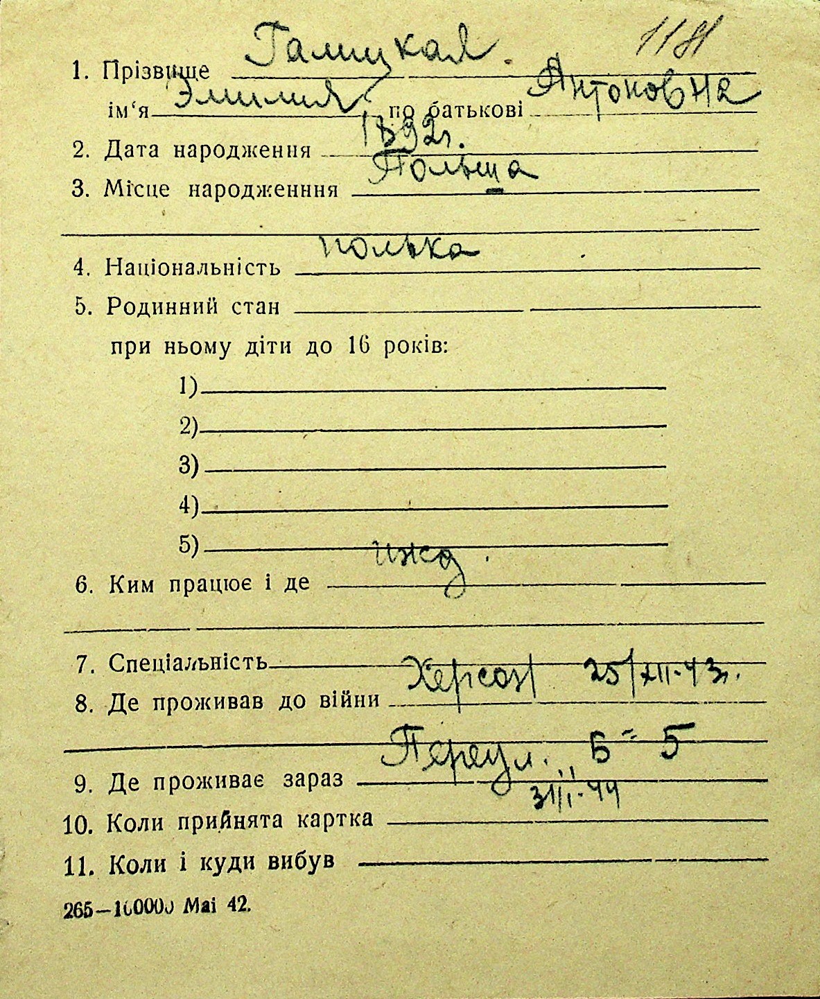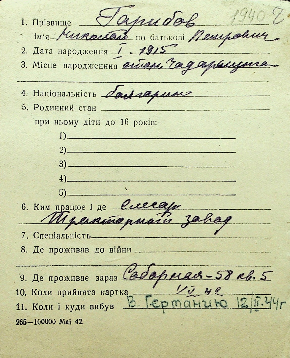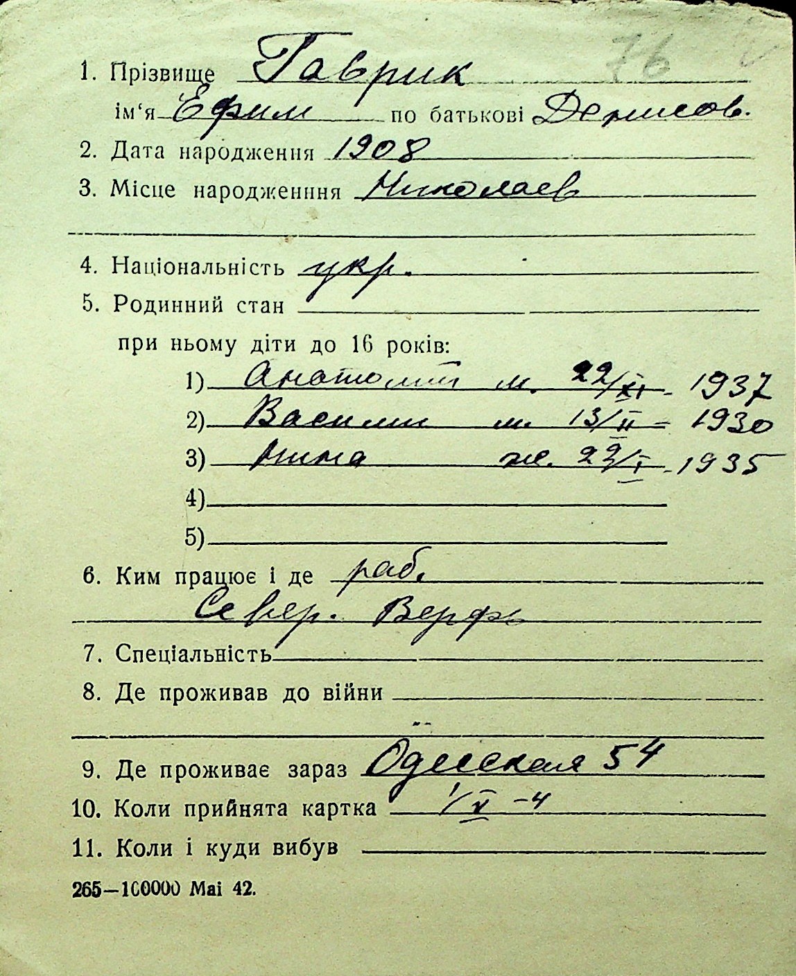 • • Перелік карток до фонду № Н-1016