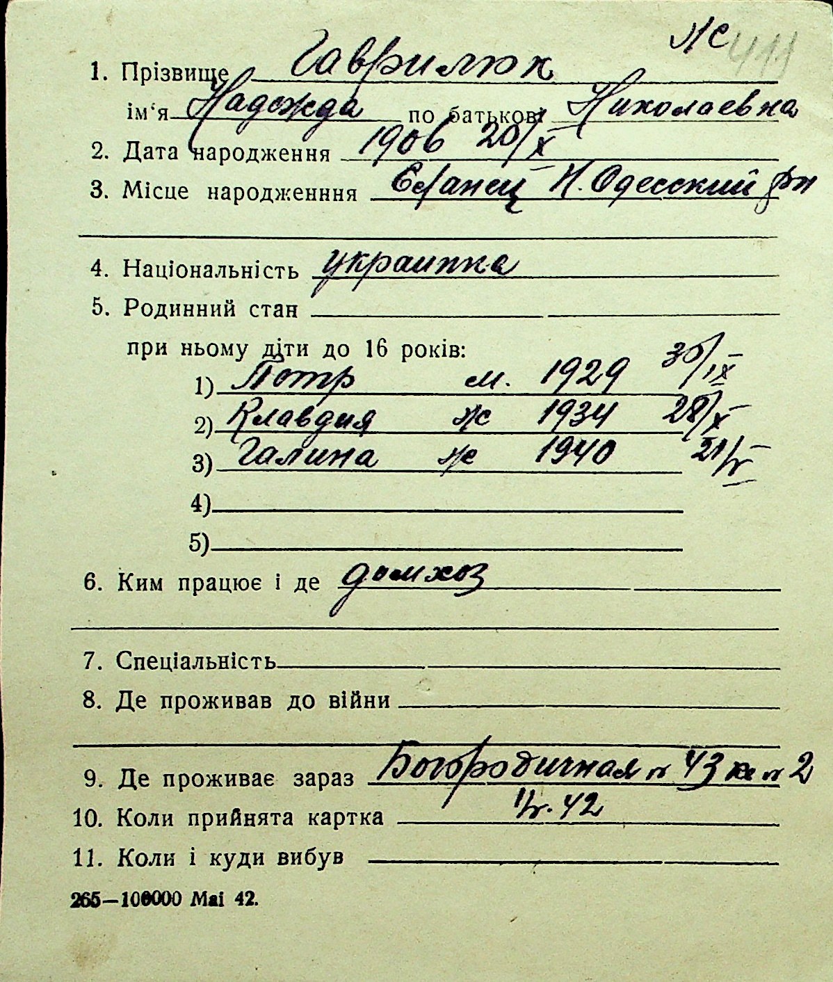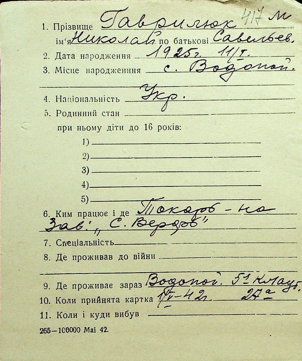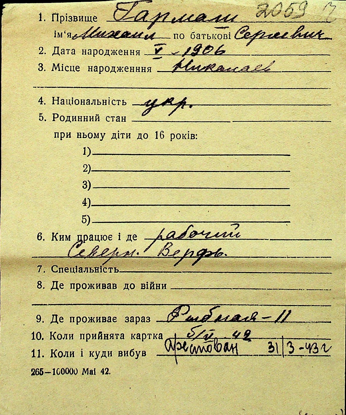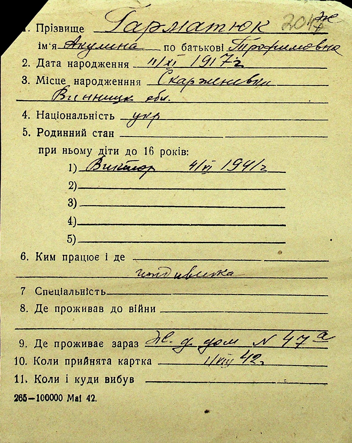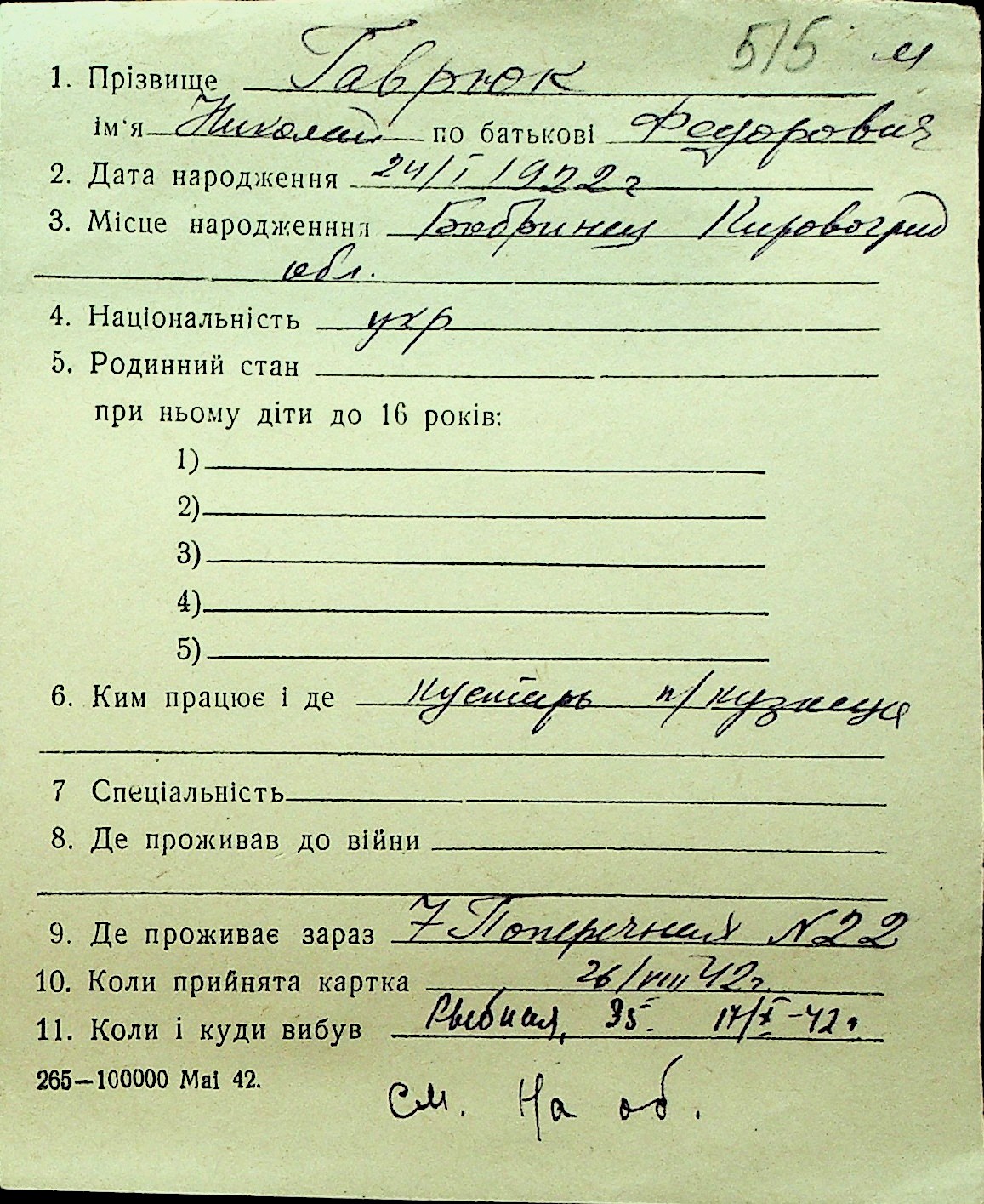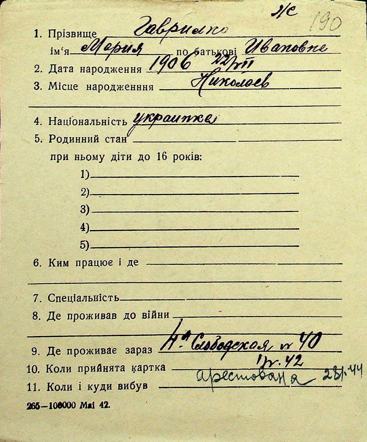 • • Перелік карток до фонду № Н-1016