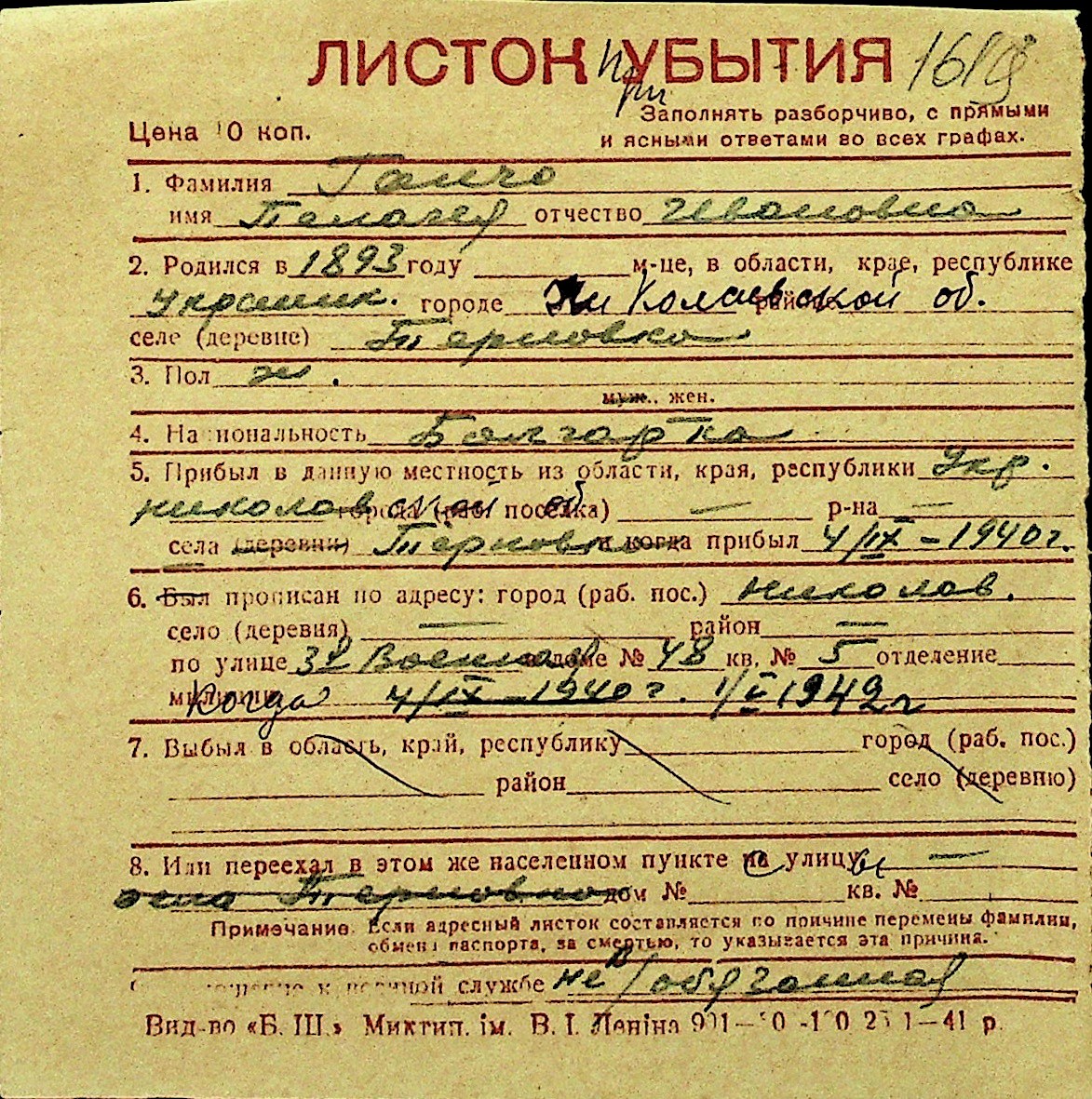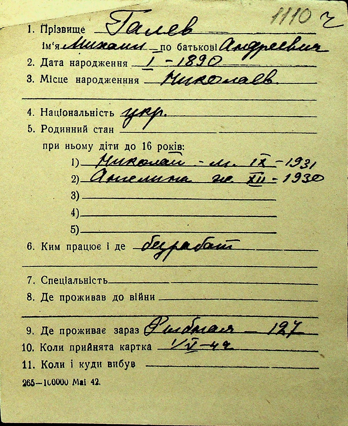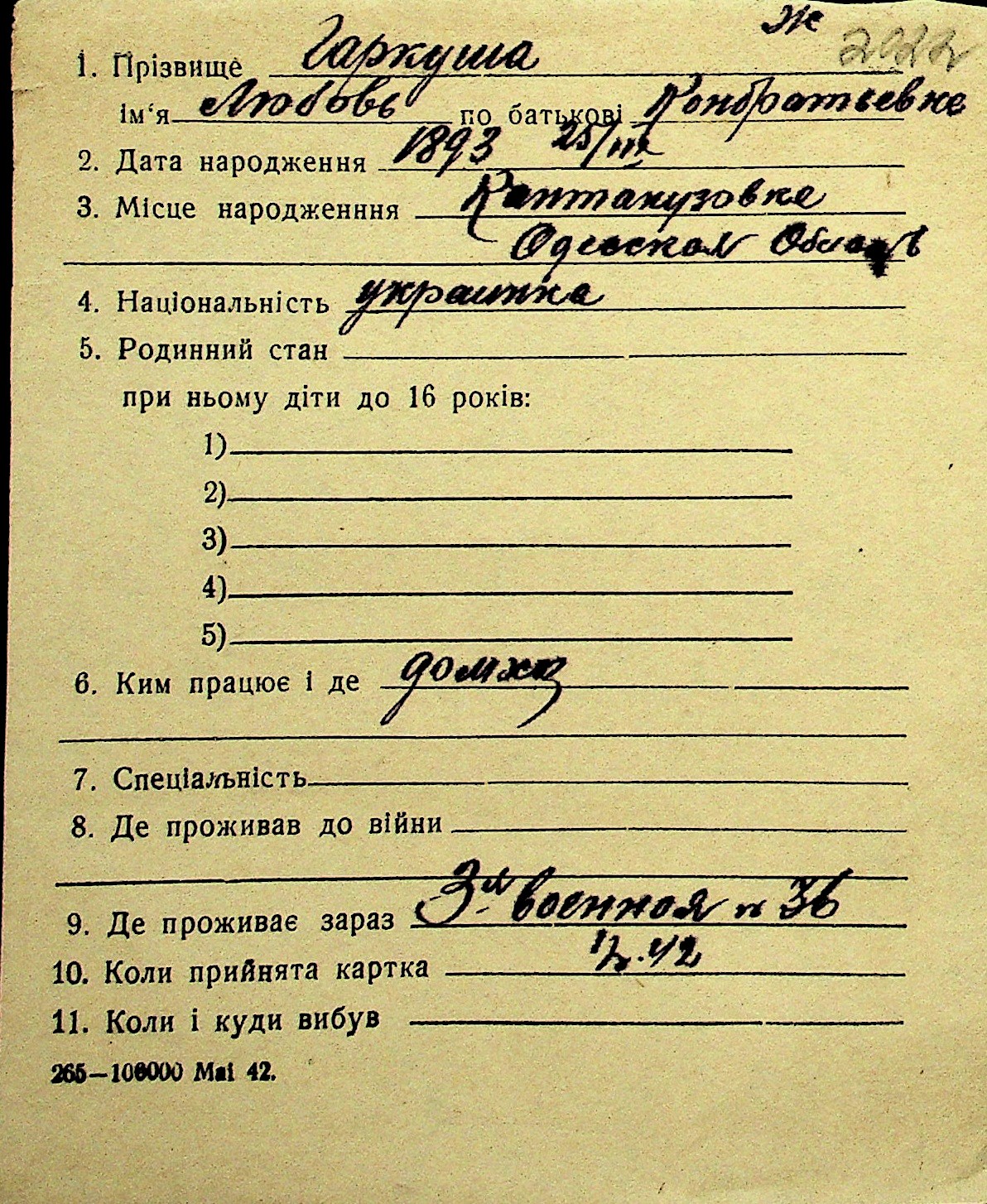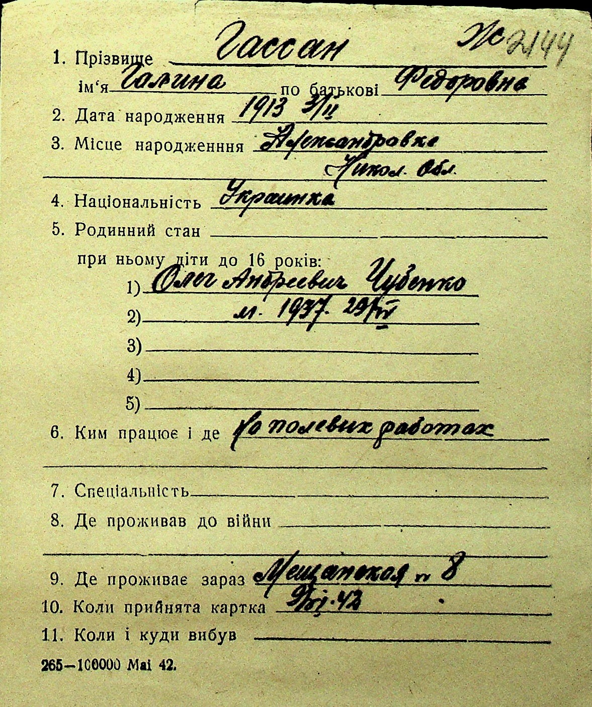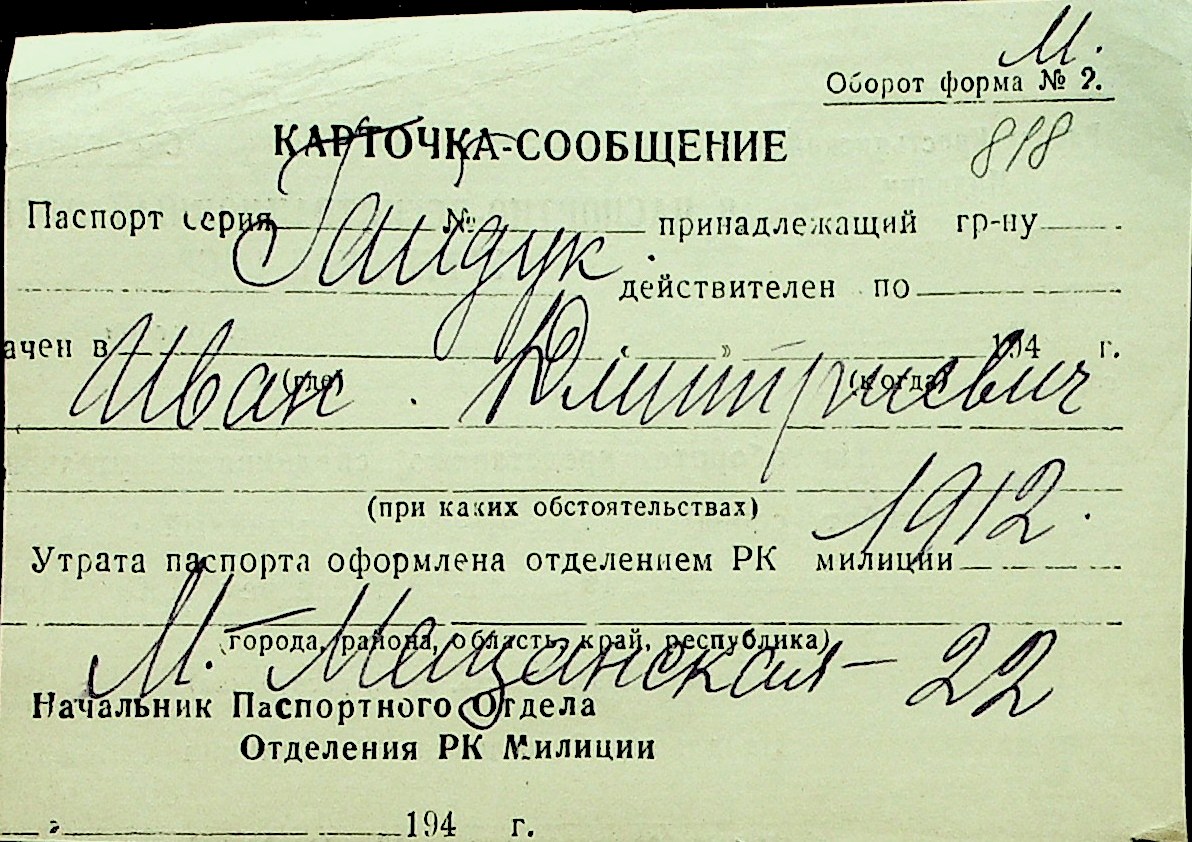 • • Перелік карток до фонду № Н-1016