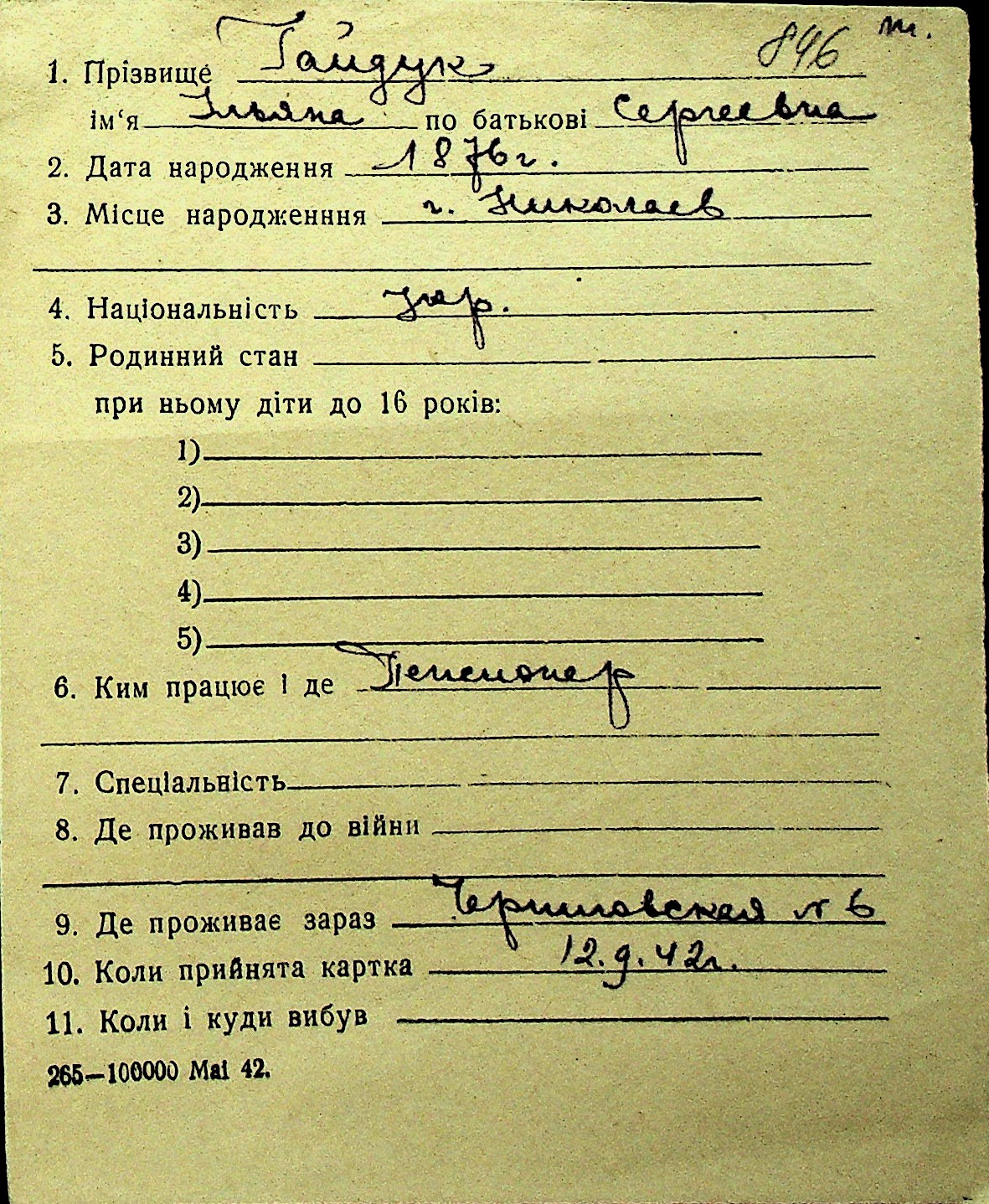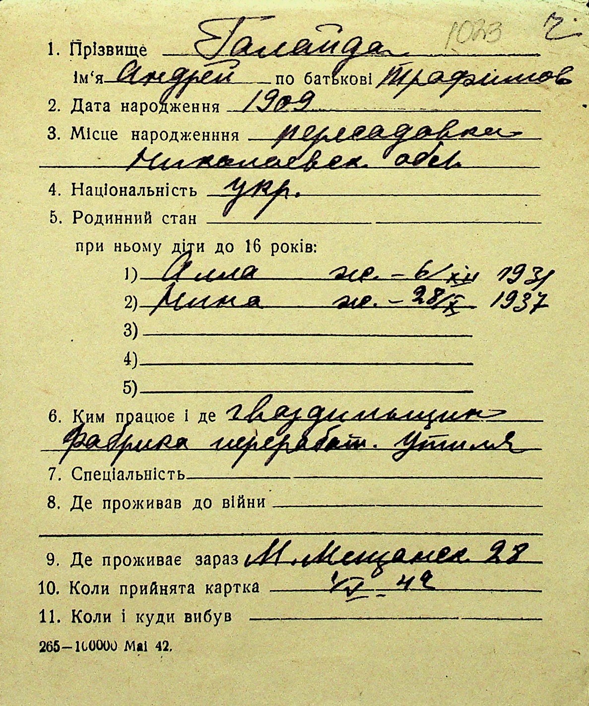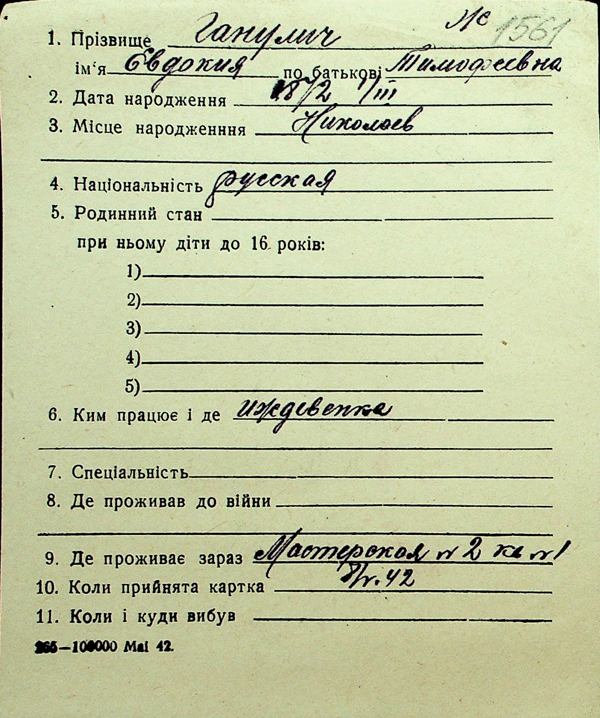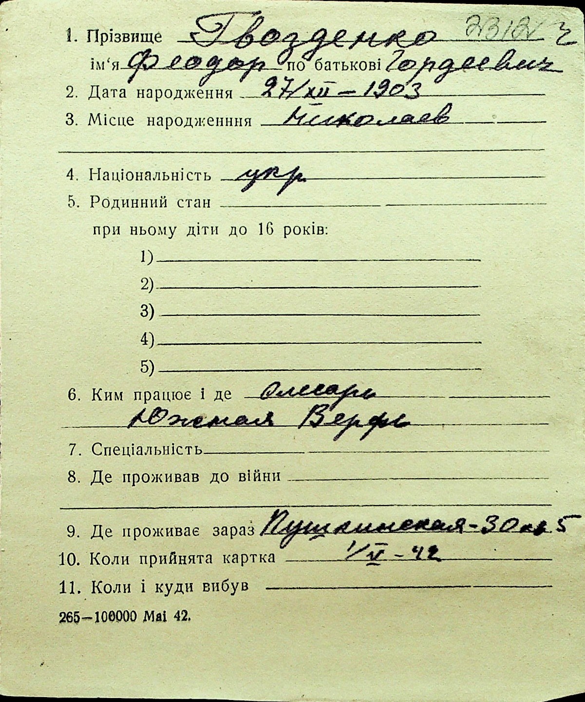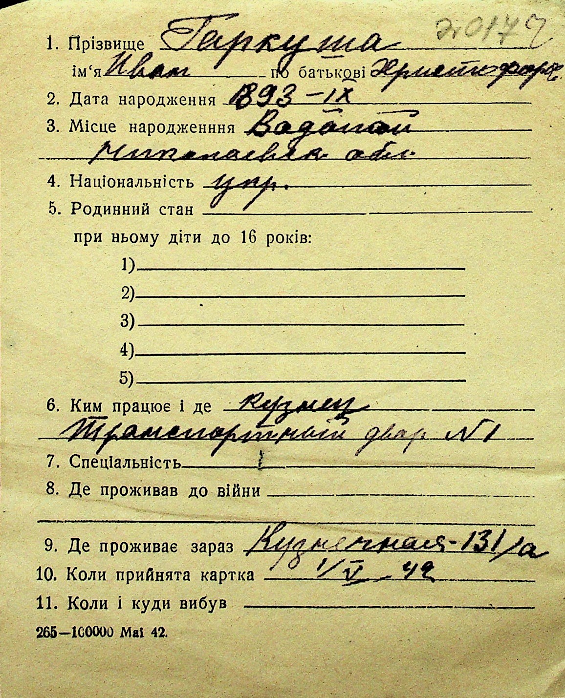 • • Перелік карток до фонду № Н-1016