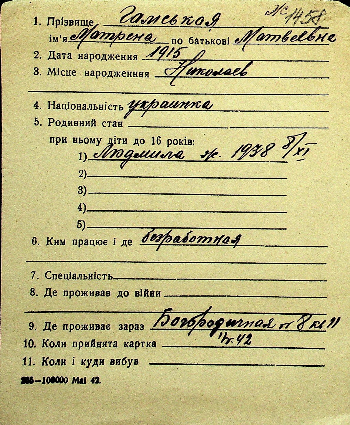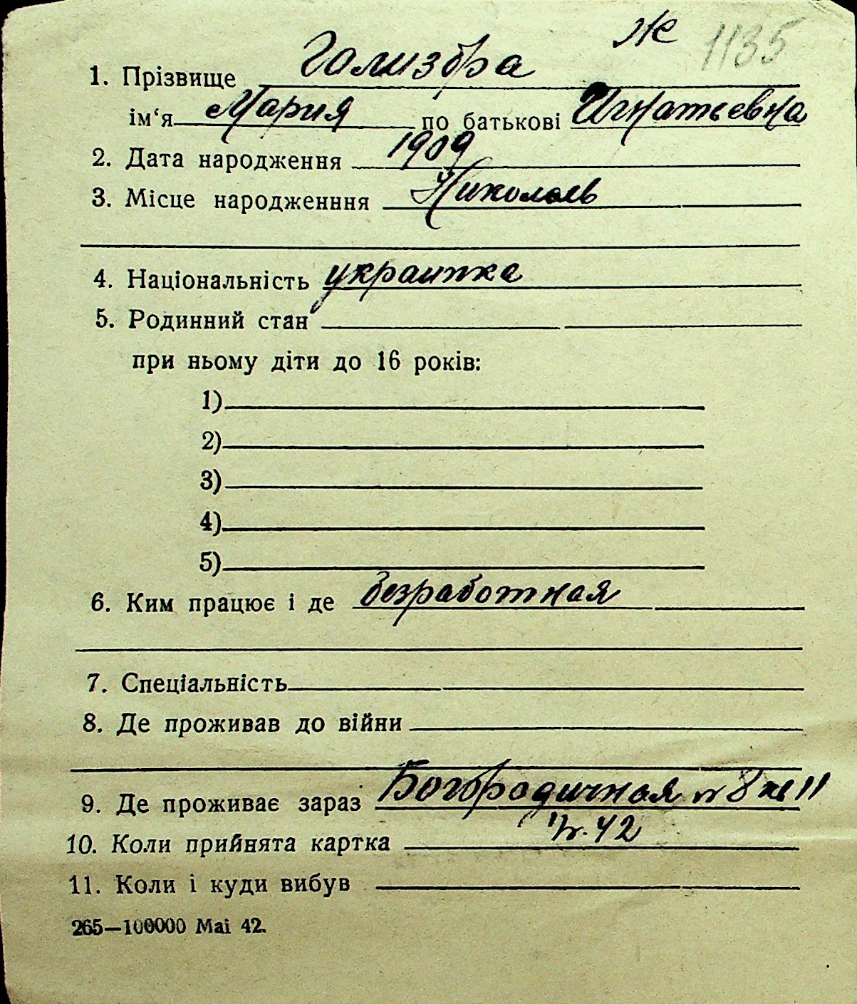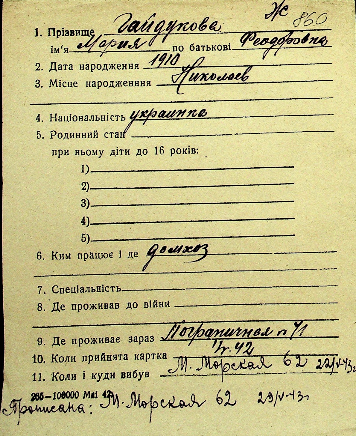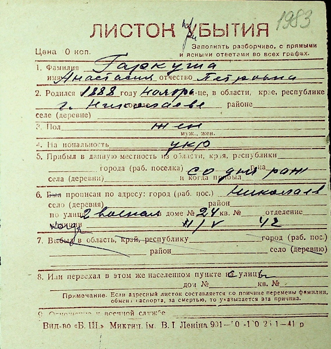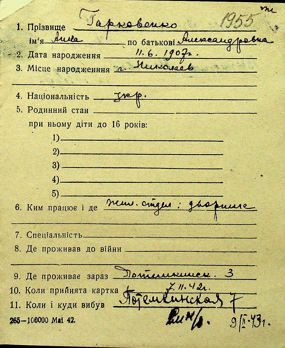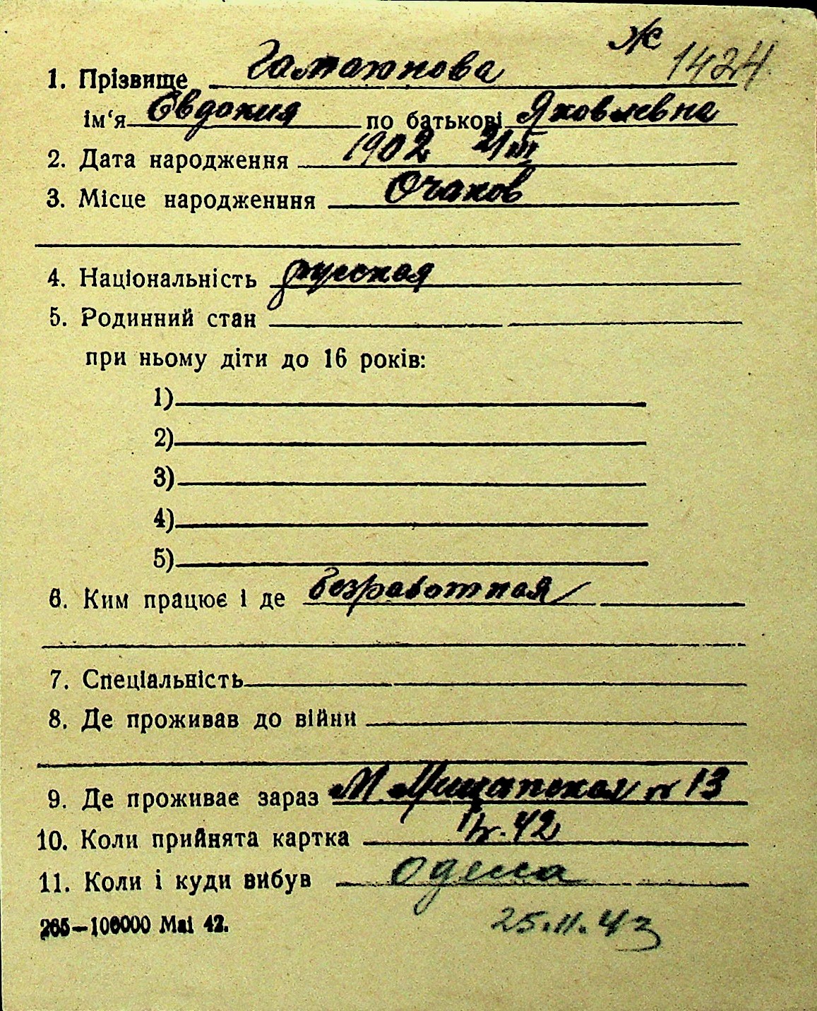 • • Перелік карток до фонду № Н-1016