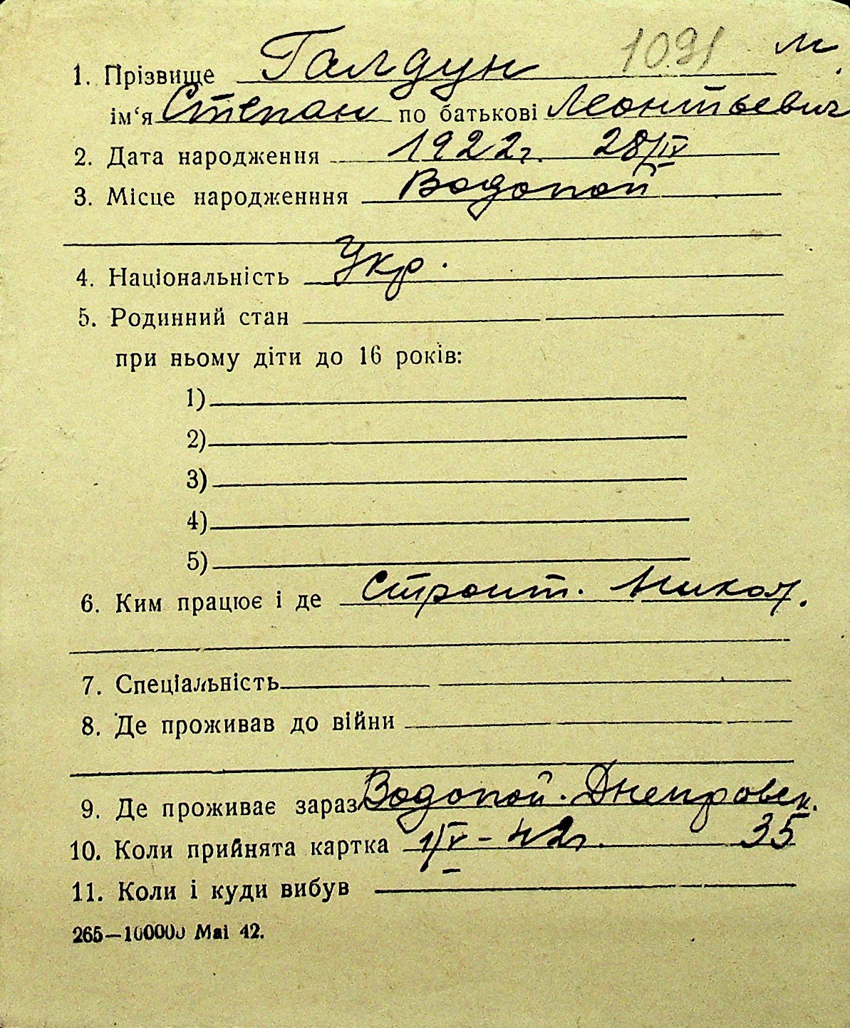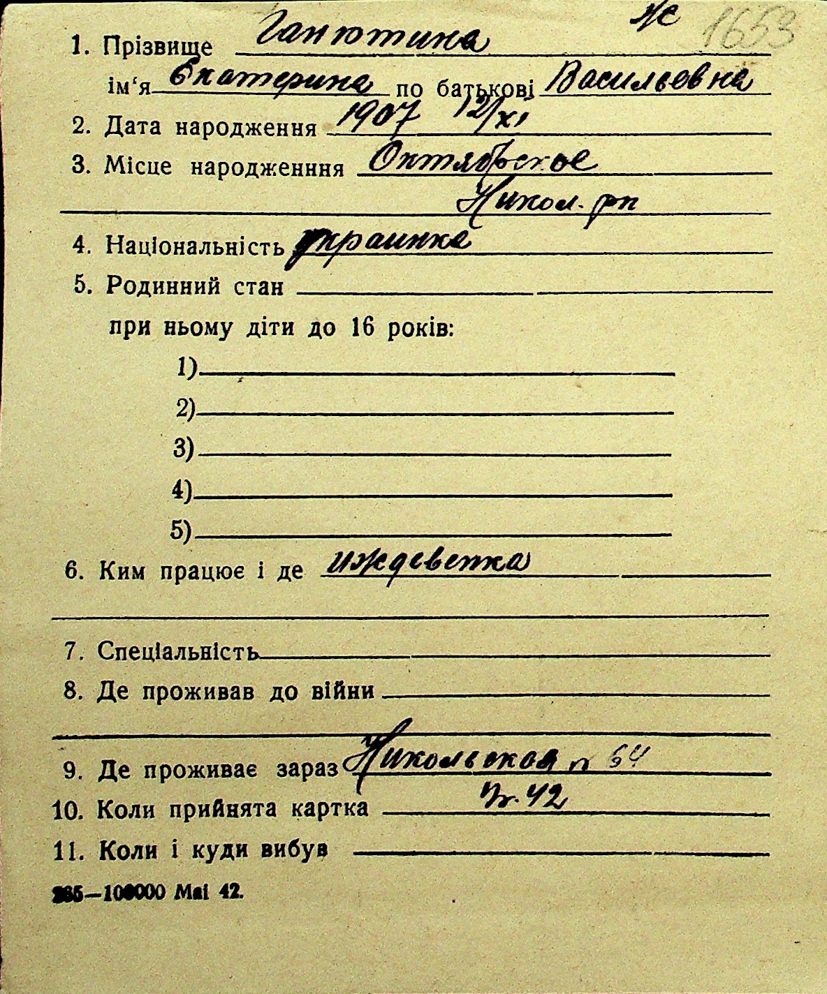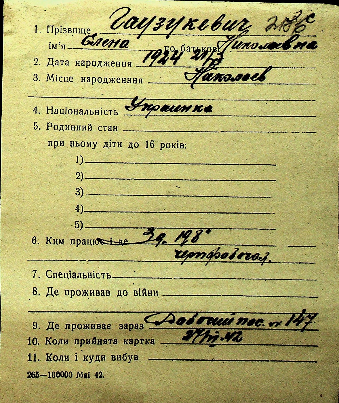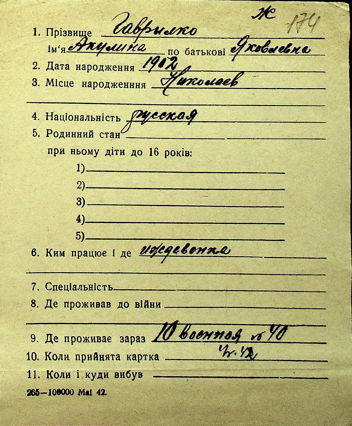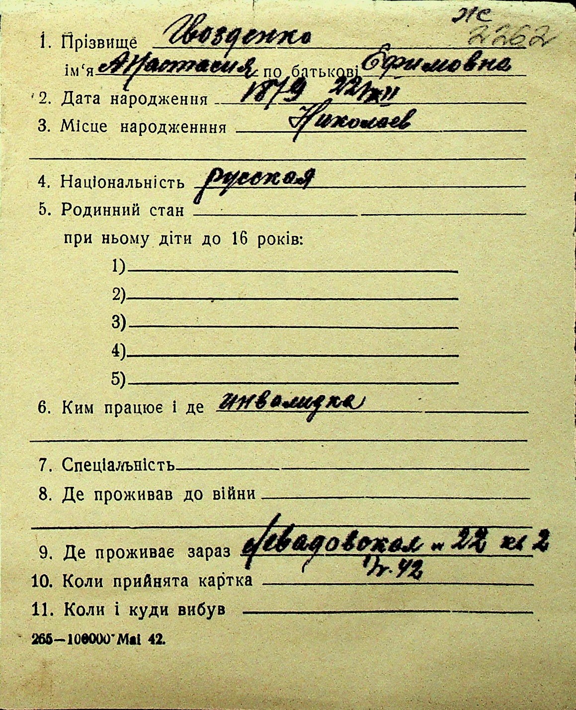 • • Перелік карток до фонду № Н-1016