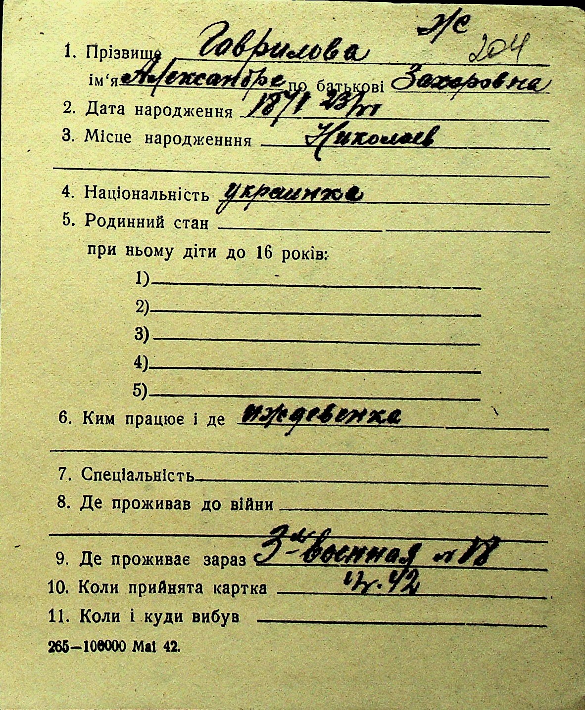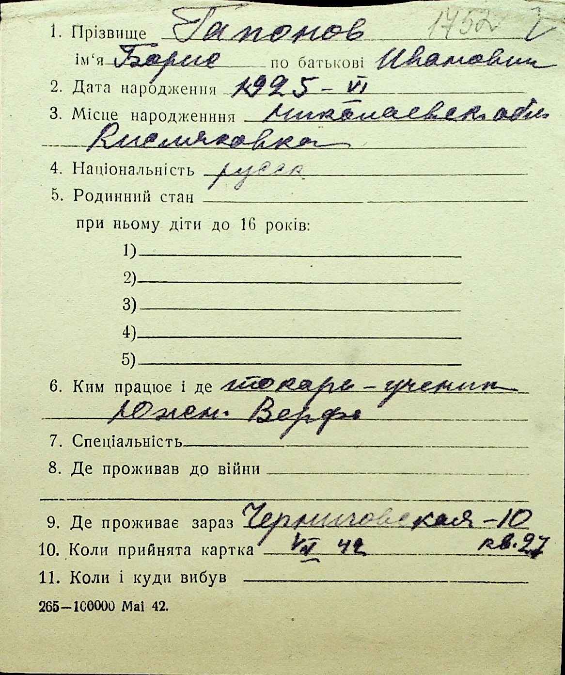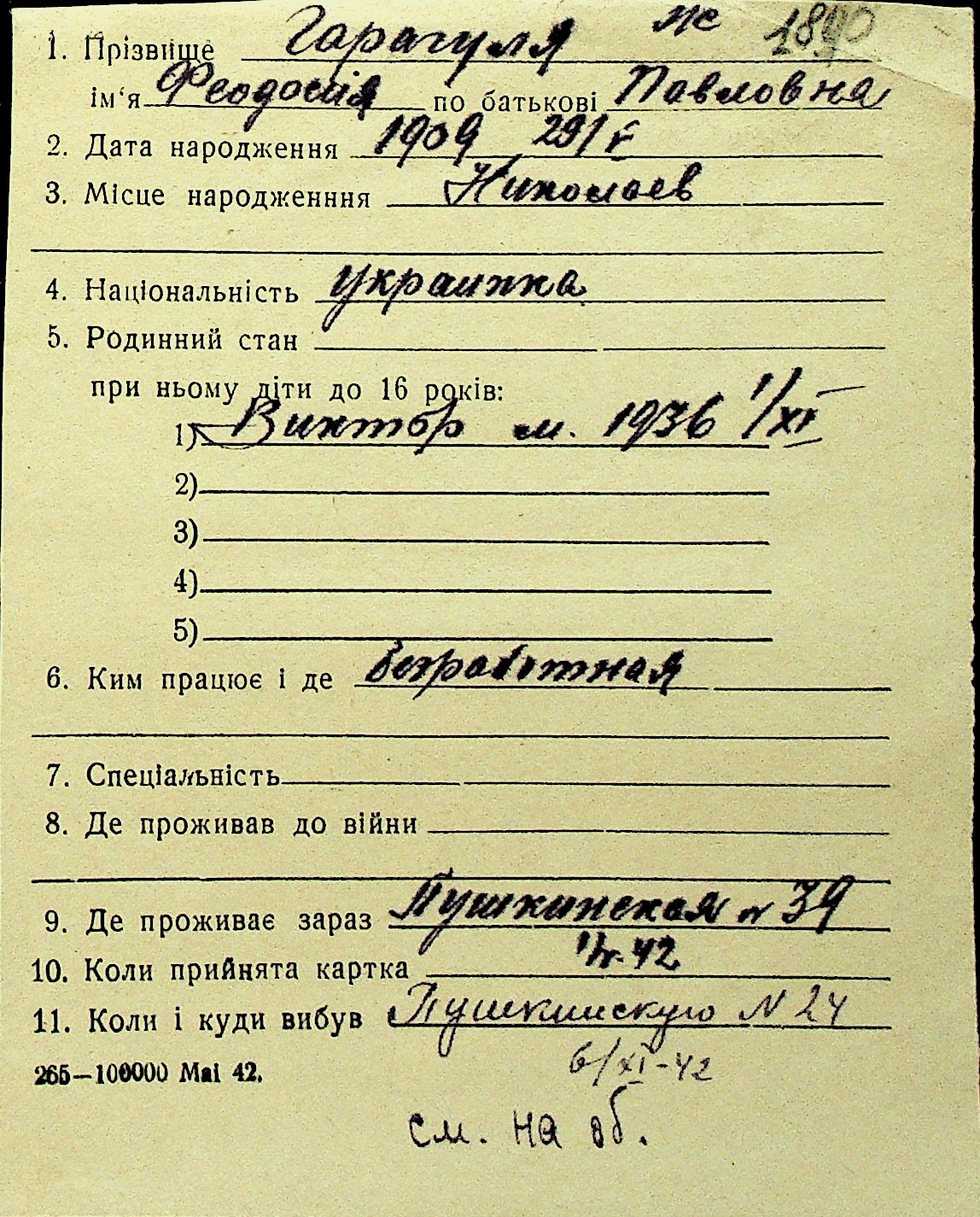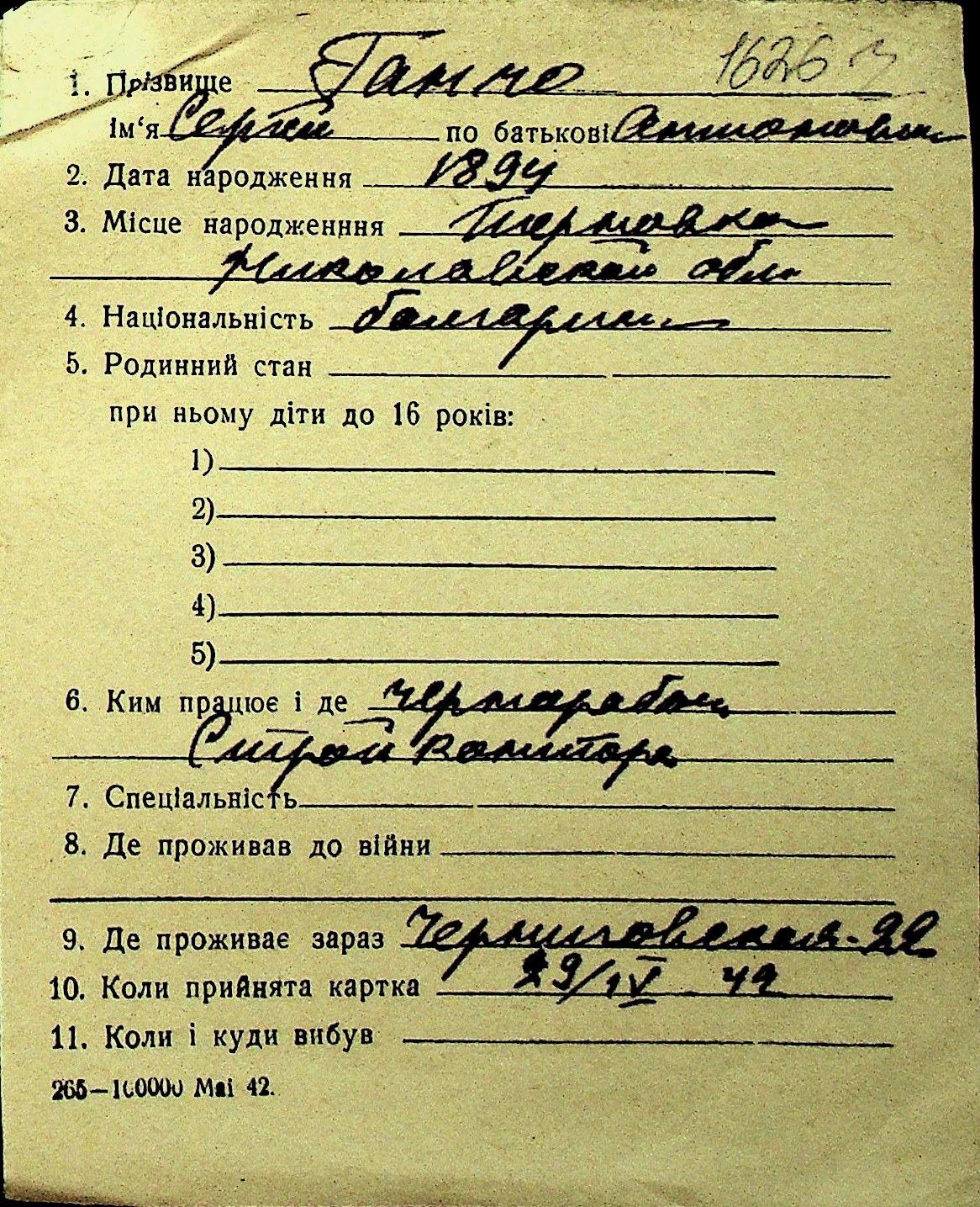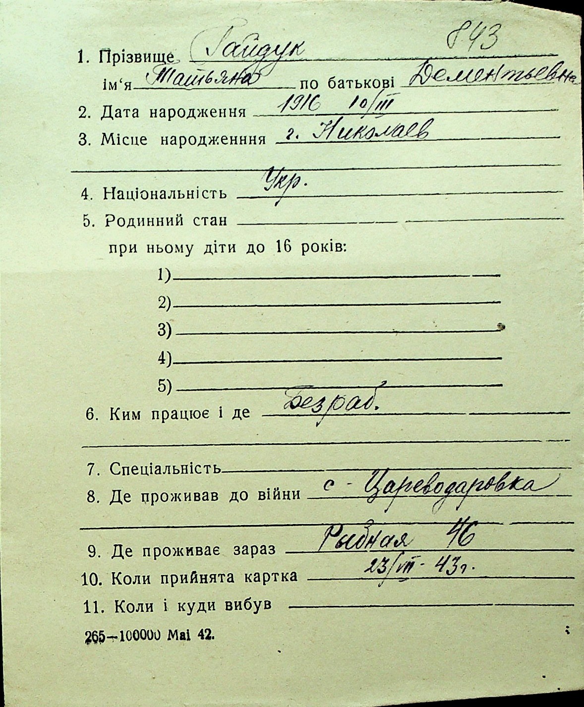 • • Перелік карток до фонду № Н-1016