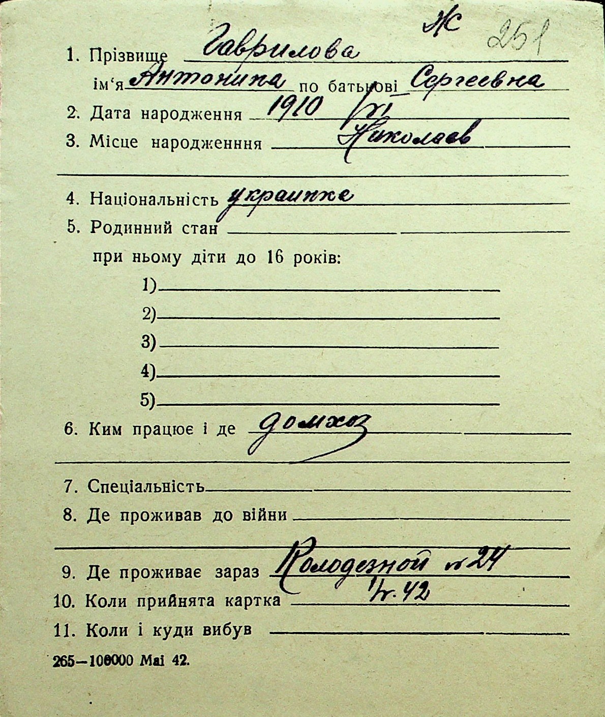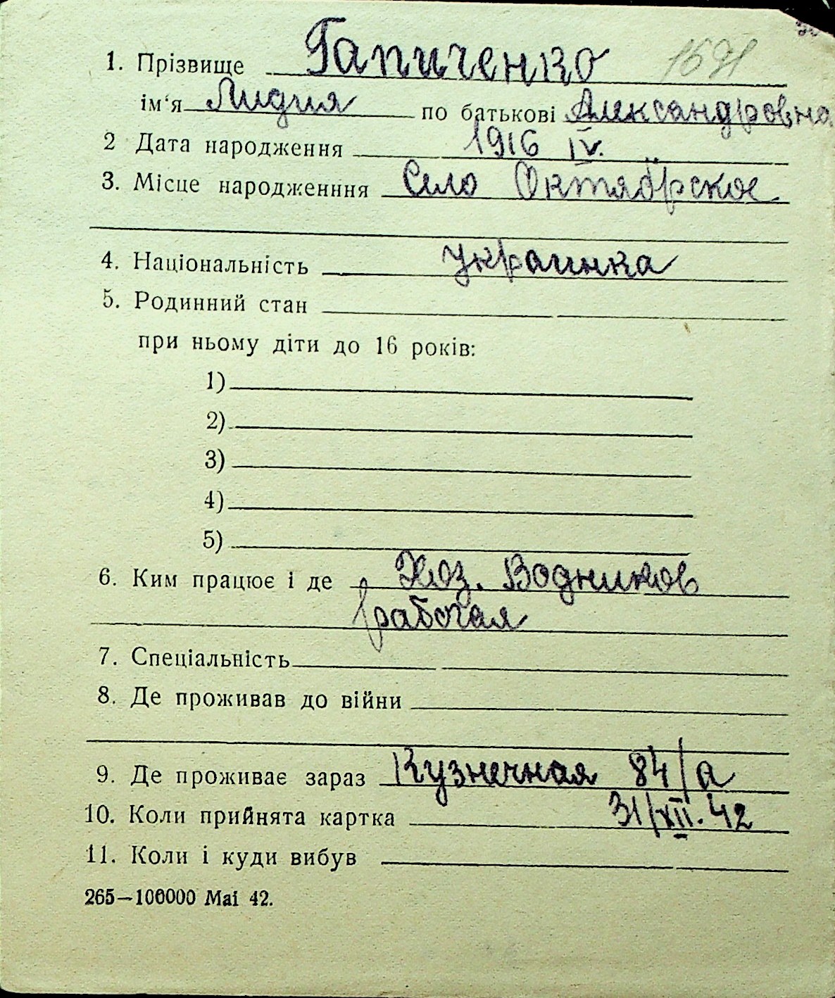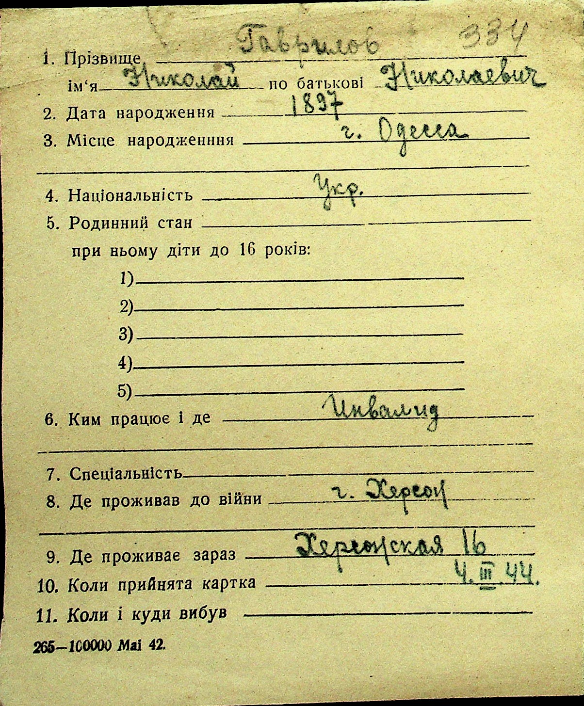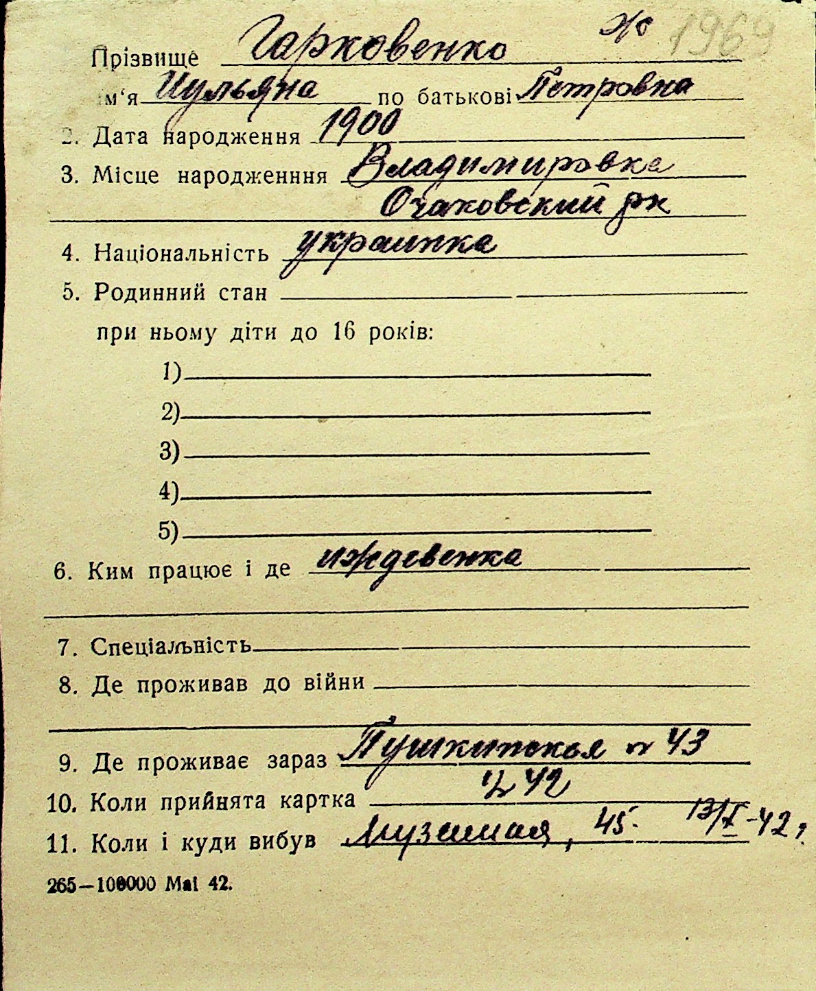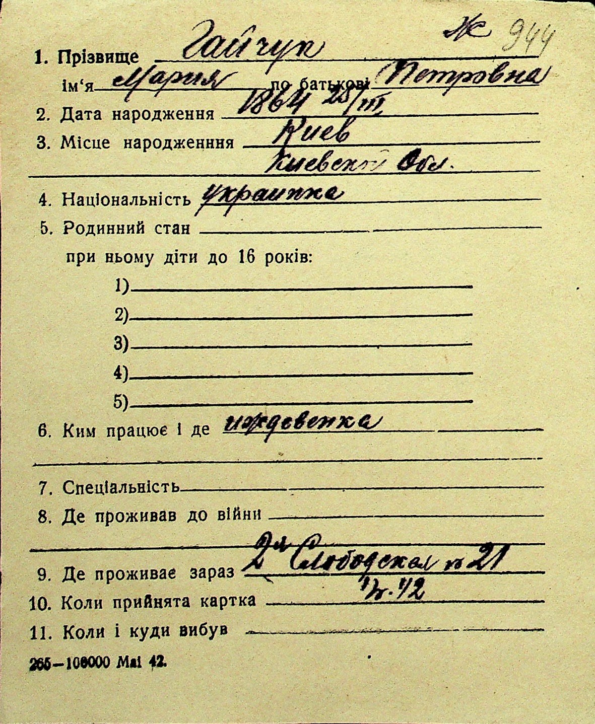 • • Перелік карток до фонду № Н-1016