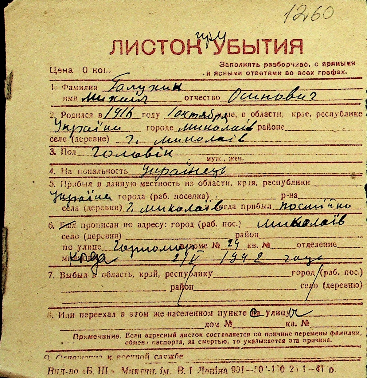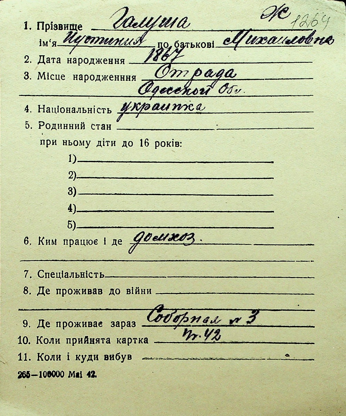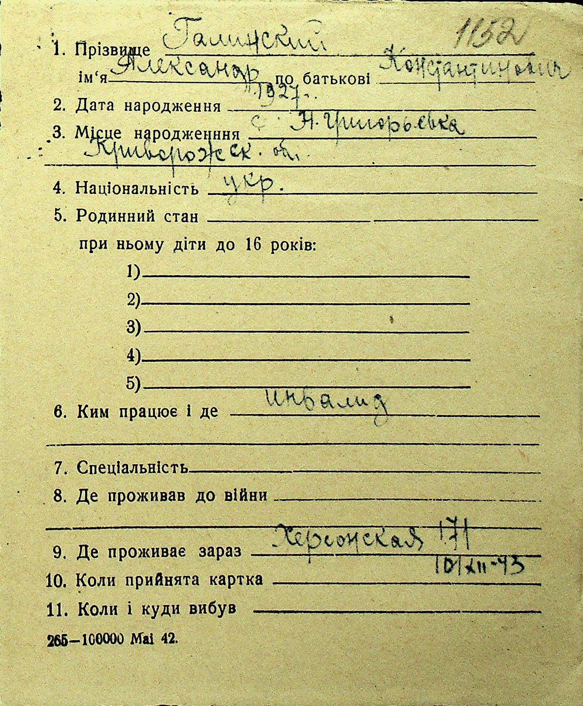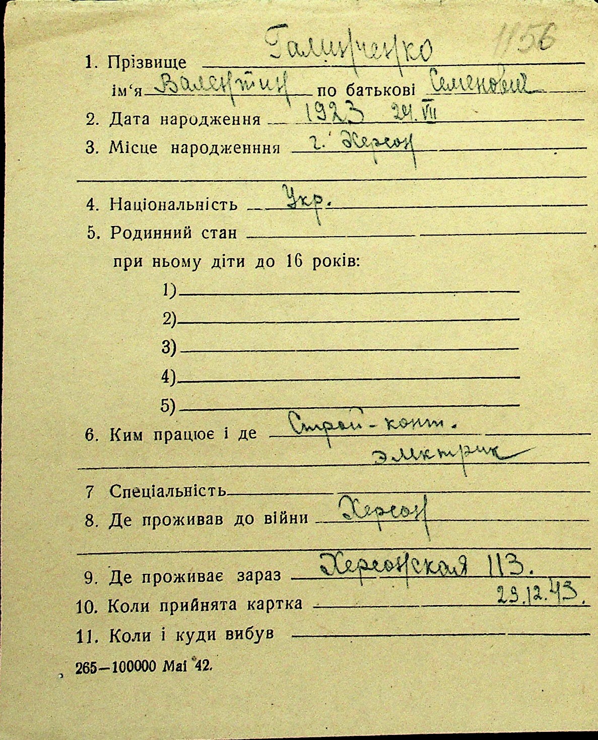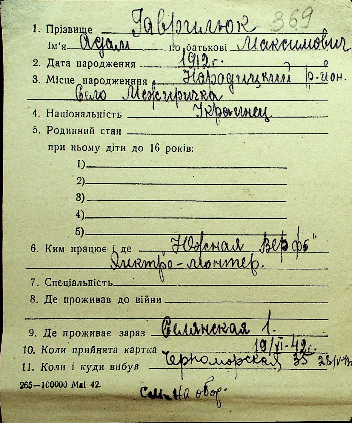 • • Перелік карток до фонду № Н-1016